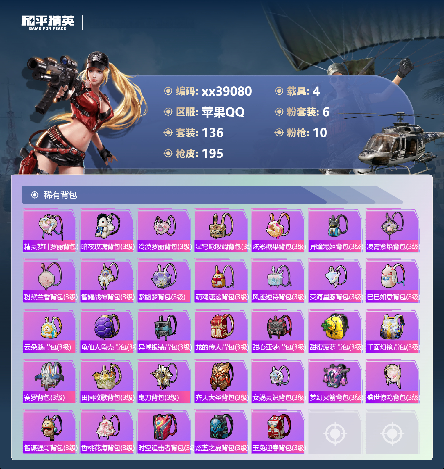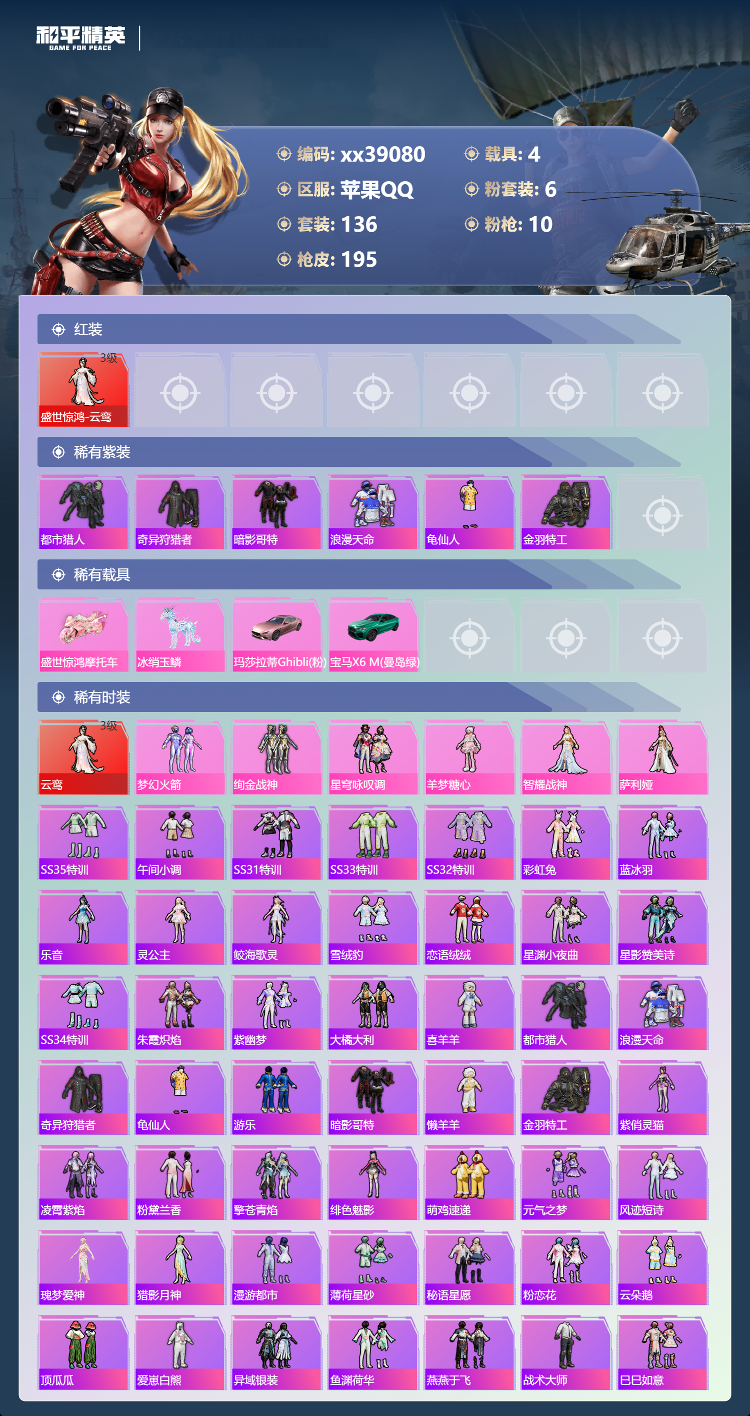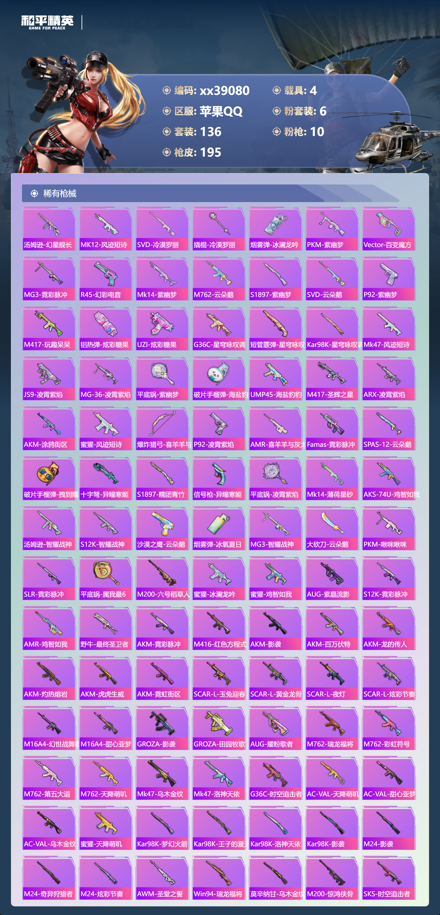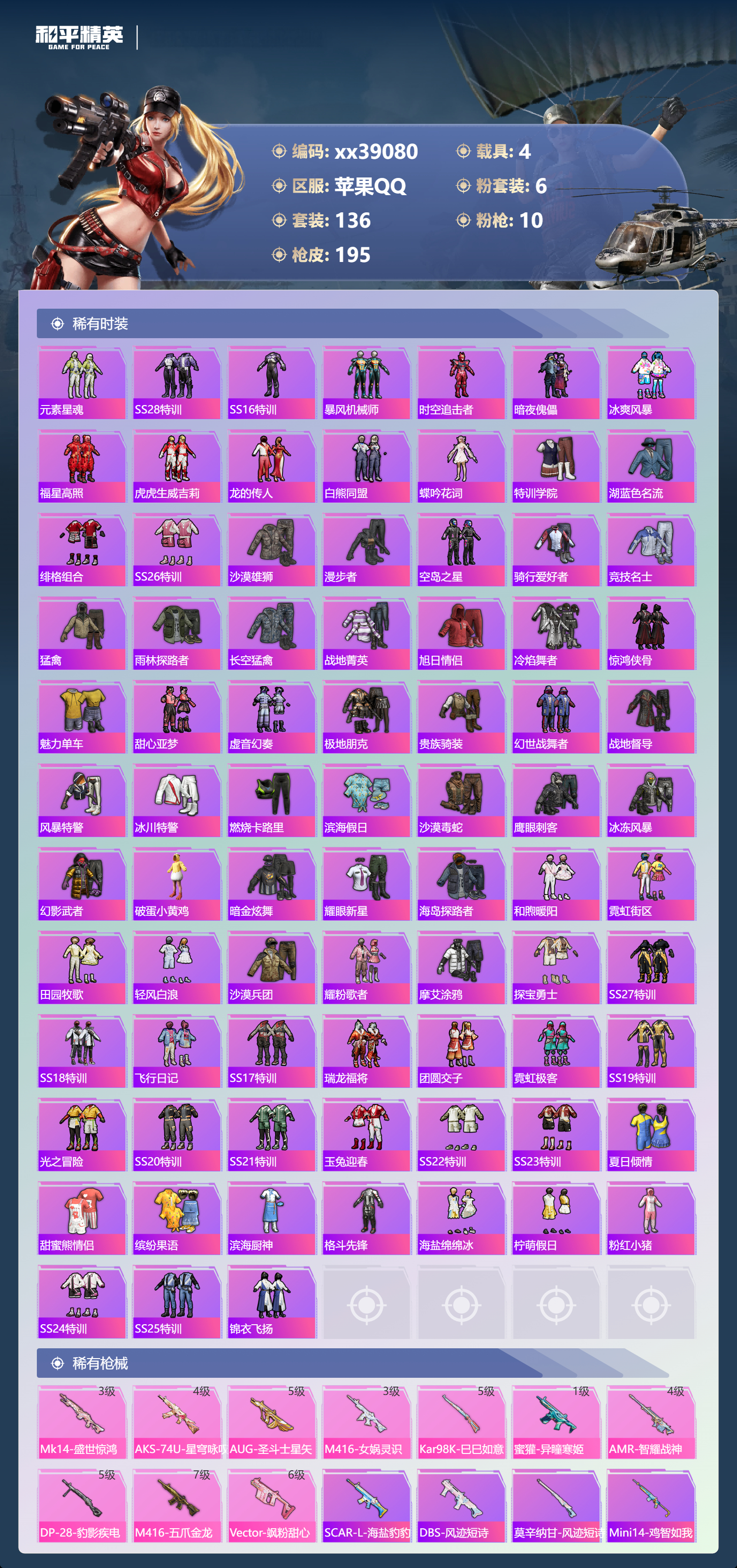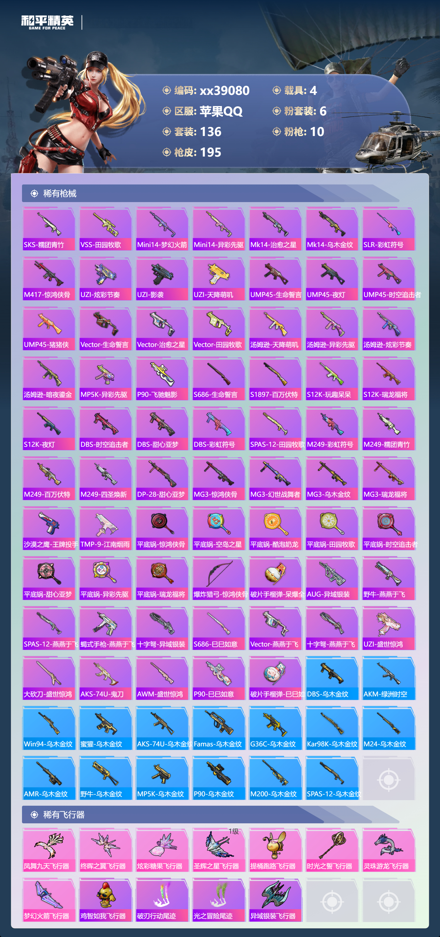_2262263-包人脸苹果手q-14王牌印记-1红装-6粉装-10特效呛-4载具-69764热力值-136套装-195呛皮-4卓越印记-2传奇印记 【1红装】盛世惊鸿-云鸾/3级 【6粉装】套装-绚金战神角色-智耀战神套装-梦幻火箭角色-萨利娅角色-羊梦糖心套装-星穹咏叹调 【10特效呛】m416-女娲灵识/3级kar98k-巳巳如意/5级m416-五爪金龙/7级vect-飒粉甜心/6级aug-圣斗士星矢/5级mk14-盛世惊鸿/3级蜜獾-异瞳寒姬/1级dp-28-豹影疾电/5级amr-智耀战神/4级aks-74u-星穹咏叹调/4级 【1红装】盛世惊鸿-云鸾/3级 【6稀有紫装】都市猎人奇异狩猎者暗影哥特浪漫天命龟仙人金羽特工 【4稀有载具】盛世惊鸿摩托车冰绡玉鳞玛莎拉蒂ghibli粉宝马x6m曼岛绿 【136稀有时装】梦幻火箭绚金战神云鸾/3级星穹咏叹调羊梦糖心智耀战神ss35特训午间小调ss31特训ss33特训ss32特训彩虹兔蓝冰羽乐音灵公主鲛海歌灵雪绒豹恋语绒绒星渊小夜曲星影赞美诗ss34特训朱霞炽焰紫幽梦大橘大利喜羊羊都市猎人浪漫天命奇异狩猎者龟仙人游乐暗影哥特懒羊羊金羽特工紫俏灵猫凌霄紫焰粉黛兰香擎苍青焰绯色魅影萌鸡速递元气之梦风迹短诗瑰梦爱神猎影月神漫游都市薄荷星砂秘语星愿粉恋花云朵鹅顶瓜瓜萨利娅爱崽白熊异域银装鱼渊荷华燕燕于飞战术大师巳巳如意元素星魂ss28特训ss16特训暴风机械师时空追击者暗夜傀儡冰爽风暴福星高照虎虎生威吉莉龙的传人白熊同盟蝶吟花词特训学院湖蓝色名流绯格组合ss26特训沙漠雄狮漫步者空岛之星骑行爱好者竞技名士猛禽雨林探路者长空猛禽战地菁英旭日情侣冷焰舞者惊鸿侠骨魅力单车甜心亚梦虚音幻奏极地朋克贵族骑装幻世战舞者战地督导风暴特警冰川特警燃烧卡路里滨海假日沙漠毒蛇鹰眼刺客冰冻风暴幻影武者破蛋小黄鸡暗金炫舞耀眼新星海岛探路者和煦暖阳霓虹街区田园牧歌轻风白浪沙漠兵团耀粉歌者摩艾涂鸦探宝勇士ss27特训ss18特训飞行日记ss17特训瑞龙福将团圆交子霓虹极客ss19特训光之冒险ss20特训ss21特训玉兔迎春ss22特训ss23特训夏日倾情甜蜜熊情侣缤纷果语滨海厨神格斗先锋海盐绵绵冰柠萌假日粉红小猪ss24特训ss25特训锦衣飞扬 【195稀有呛械】dbs-乌木金纹scar-l-海盐豹豹mk14-盛世惊鸿/3级aks-74u-星穹咏叹调/4级aug-圣斗士星矢/5级m416-女娲灵识/3级kar98k-巳巳如意/5级蜜獾-异瞳寒姬/1级amr-智耀战神/4级dp-28-豹影疾电/5级m416-五爪金龙/7级vect-飒粉甜心/6级dbs-风迹短诗莫辛纳甘-风迹短诗mini14-鸡智如我汤姆逊-幻星舰长akm-绿洲时空win94-乌木金纹mk12-风迹短诗svd-冷漠罗丽撬棍-冷漠罗丽盐雾蛋-冰澜龙吟pkm-紫幽梦vect-百变魔方mg3-霓彩脉冲r45-幻彩电音mk14-紫幽梦蜜獾-乌木金纹m762-云朵鹅s1897-紫幽梦svd-云朵鹅p92-紫幽梦m417-玩趣呆呆铝热弹-炫彩糖果uzi-炫彩糖果g36c-星穹咏叹调短管霰弹-星穹咏叹调kar98k-星穹咏叹调mk47-风迹短诗js9-凌霄紫焰mg-36-凌霄紫焰平底锅-紫幽梦破片手留单-海盐豹豹ump45-海盐豹豹m417-圣辉之星arx-凌霄紫焰aks-74u-乌木金纹akm-涂鸦街区蜜獾-风迹短诗爆炸猎弓-喜羊羊与灰太狼p92-凌霄紫焰amr-喜羊羊与灰太狼famas-乌木金纹famas-霓彩脉冲spas-12-云朵鹅破片手留单-拽到爆炸十子怒-异瞳寒姬s1897-糯团青竹信号呛-异瞳寒姬平底锅-凌霄紫焰mk14-薄荷星砂aks-74u-鸡智如我汤姆逊-智耀战神s12k-智耀战神沙墨之鹦-云朵鹅盐雾蛋-冰氧夏日mg3-智耀战神大砍刀-云朵鹅pkm-啾咪啾咪slr-霓彩脉冲平底锅-属我最6m200-六号稻草人蜜獾-冰澜龙吟蜜獾-鸡智如我aug-紫晶流影s12k-霓彩脉冲amr-鸡智如我野牛-最终圣卫者akm-霓彩脉冲m416-红色方程式akm-影袭akm-百万伏特akm-龙的传人akm-灼热熔岩akm-虎虎生威akm-霓虹街区scar-l-玉兔迎春scar-l-黄金龙骨scar-l-夜灯scar-l-炫彩节奏m16a4-幻世战舞者m16a4-甜心亚梦groza-影袭groza-田园牧歌aug-耀粉歌者m762-瑞龙福将m762-彩虹符号m762-第五大道m762-天降萌叽mk47-乌木金纹mk47-洛神天依g36c-乌木金纹g36c-时空追击者ac-val-天降萌叽ac-val-甜心亚梦ac-val-乌木金纹蜜獾-天降萌叽kar98k-乌木金纹kar98k-梦幻火箭kar98k-王子的夏天kar98k-洛神天依kar98k-影袭m24-乌木金纹m24-影袭m24-奇异狩猎者m24-炫彩节奏awm-圣堂之誓win94-瑞龙福将莫辛纳甘-乌木金纹amr-乌木金纹m200-惊鸿侠骨sks-时空追击者sks-糯团青竹vss-田园牧歌mini14-梦幻火箭mini14-异彩先驱mk14-治愈之星mk14-乌木金纹slr-彩虹符号m417-惊鸿侠骨uzi-炫彩节奏uzi-影袭uzi-天降萌叽ump45-生命誓言ump45-夜灯ump45-时空追击者ump45-猪猪侠vect-生命誓言vect-治愈之星vect-田园牧歌汤姆逊-天降萌叽汤姆逊-异彩先驱汤姆逊-炫彩节奏汤姆逊-暗夜鎏金野牛-乌木金纹mp5k-异彩先驱mp5k-乌木金纹p90-乌木金纹p90-飞驰魅影s686-生命誓言s1897-百万伏特s12k-玩趣呆呆s12k-瑞龙福将s12k-夜灯dbs-时空追击者dbs-甜心亚梦dbs-彩虹符号spas-12-田园牧歌m249-彩虹符号m249-糯团青竹m249-百万伏特m249-四圣焕新dp-28-甜心亚梦mg3-惊鸿侠骨mg3-幻世战舞者mg3-乌木金纹mg3-瑞龙福将沙墨之鹦-王牌投手tmp-9-江南烟雨平底锅-惊鸿侠骨平底锅-空岛之星平底锅-酷泡奶龙平底锅-田园牧歌平底锅-时空追击者平底锅-甜心亚梦平底锅-异彩先驱平底锅-瑞龙福将爆炸猎弓-惊鸿侠骨破片手留单-呆爆全场aug-异域银装野牛-燕燕于飞m200-乌木金纹spas-12-燕燕于飞蝎式手呛-燕燕于飞十子怒-异域银装s686-巳巳如意spas-12-乌木金纹vect-燕燕于飞十子怒-燕燕于飞uzi-盛世惊鸿大砍刀-盛世惊鸿aks-74u-鬼刀awm-盛世惊鸿p90-