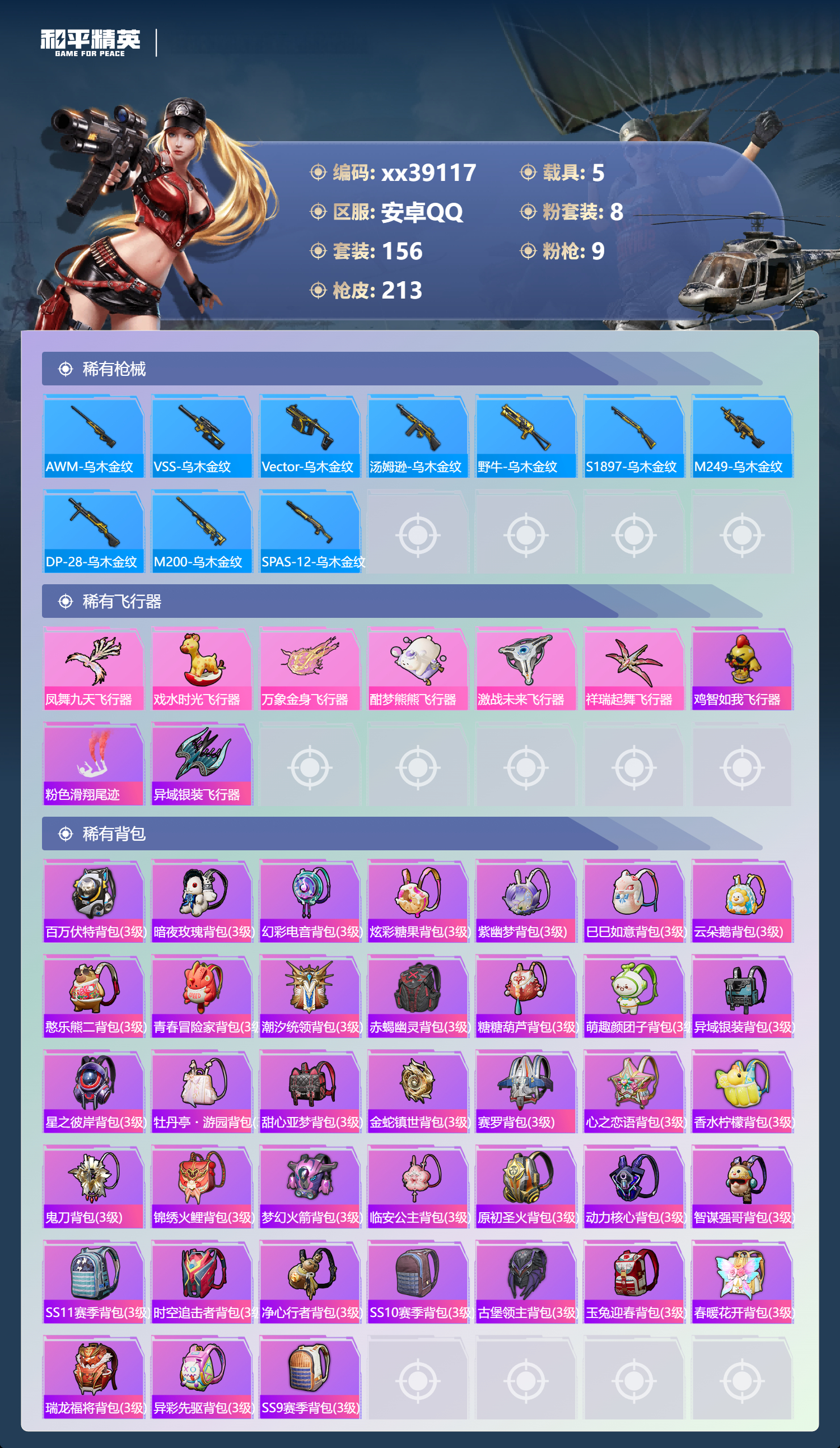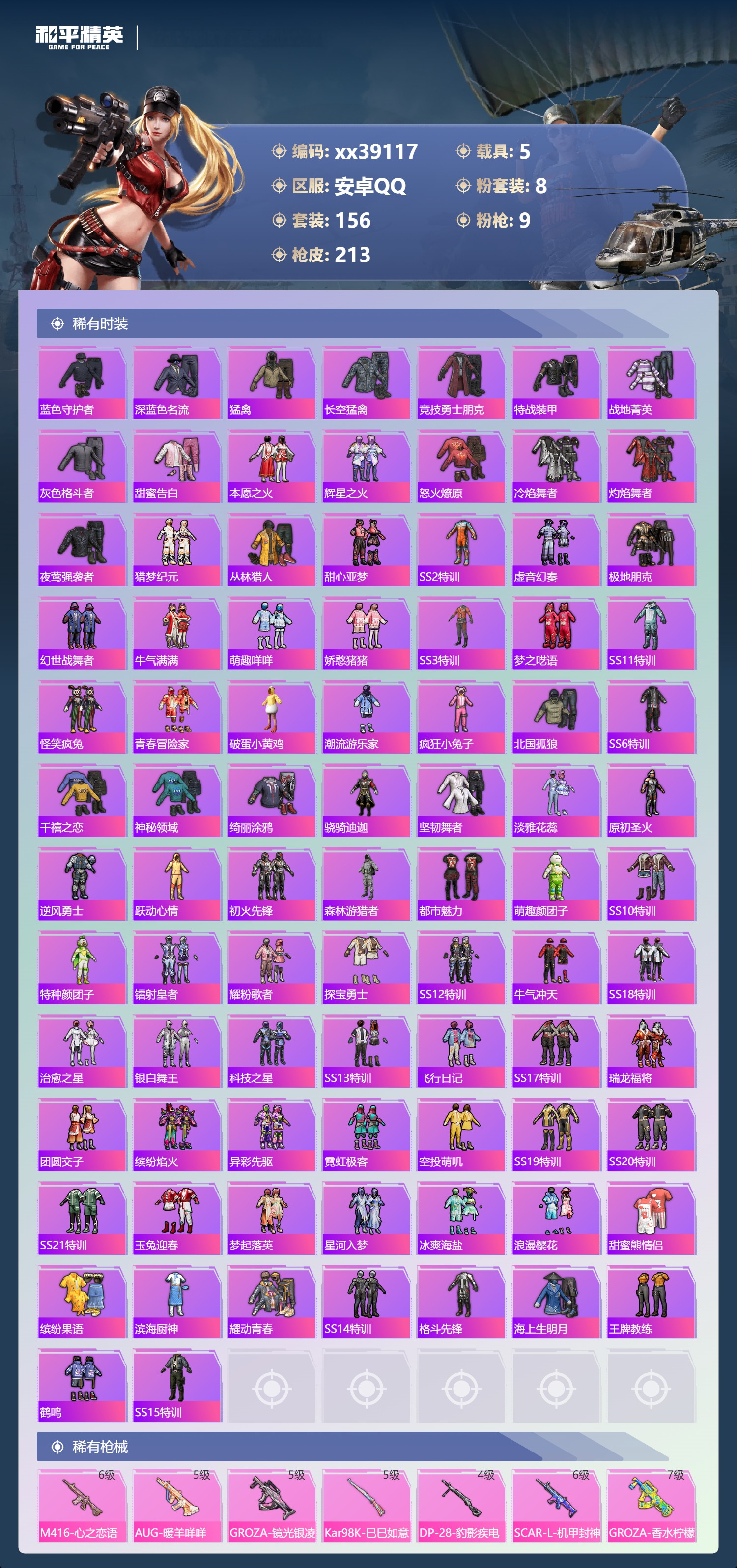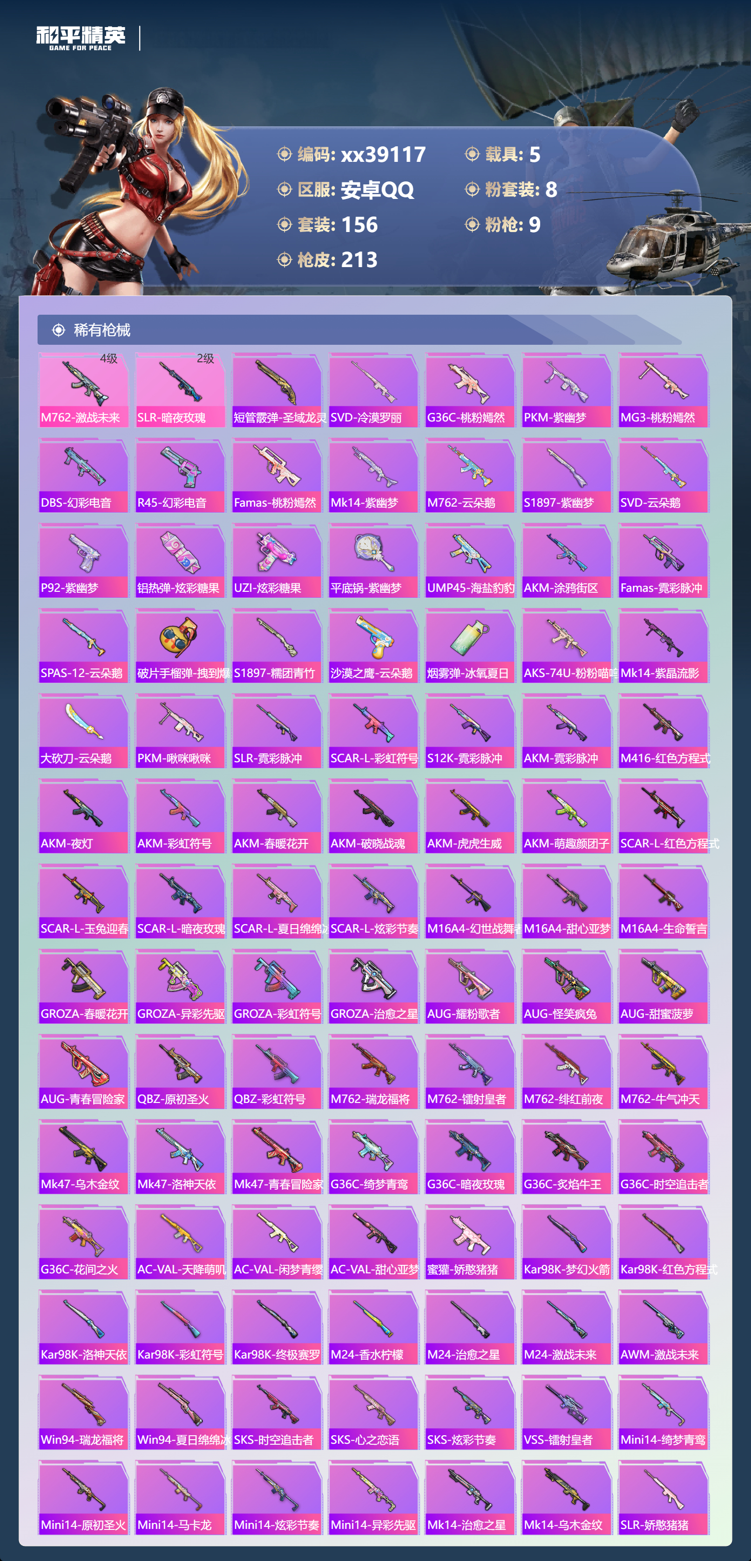 _2262254-可二次安卓手q-12王牌印记-8粉装-9特效呛-5载具-78512热力值-156套装-213呛皮-2卓越印记-1传奇印记 【8粉装】套装-梦幻火箭套装-极致幻想套装-花影阑珊套装-绮梦青鸾套装-绚金战神套装-香水柠檬套装-暗夜玫瑰角色-异瞳寒姬 【9特效呛】m762-激战未来/4级dp-28-豹影疾电/4级m416-心之恋语/6级slr-暗夜玫瑰/2级groza-香水柠檬/7级groza-镜光银凌/5级scar-l-机甲封神/6级kar98k-巳巳如意/5级aug-暖羊咩咩/5级 【5稀有紫装】派对舞王赤蝎幽灵雪山精英怀庆长公主暗夜魅影 【5稀有载具】玛莎拉蒂ghibli粉阿斯顿·马丁dbs红特斯拉roadster沁心粉阿斯顿·马丁dbx橙合金龙骨(绿) 【156稀有时装】梦幻火箭绚金战神异瞳寒姬ss35特训ss31特训ss33特训ss32特训彩虹兔蓝冰羽时希公主霓虹热舞雪绒豹恋语绒绒ss34特训紫幽梦大橘大利暗夜魅影雪山精英怀庆长公主赤蝎幽灵萌鸡速递元气之梦云朵鹅风舞幻音派对舞王顶瓜瓜极致幻想暗夜玫瑰花影阑珊绮梦青鸾香水柠檬自由猎手憨乐熊二异域银装蓝调潮影暗夜风云纯白跃动光矢逐梦鱼渊荷华ss30特训青团波波燕燕于飞战术大师智谋强哥暗械蛇影糖糖葫芦晶辉守护巳巳如意镭金极速ss5特训ss16特训暴风机械师时空追击者暗夜傀儡军械专家醒狮腾龙福星高照虎虎生威吉莉军刀雅典娜萌黄之夏海洋之心深海来使红色运动蓝色运动5.56爱好者白色伏地魔ss9特训黄色名流黎明保卫者竞技名士蓝色守护者深蓝色名流猛禽长空猛禽竞技勇士朋克特战装甲战地菁英灰色格斗者甜蜜告白本愿之火辉星之火怒火燎原冷焰舞者灼焰舞者夜莺强袭者猎梦纪元丛林猎人甜心亚梦ss2特训虚音幻奏极地朋克幻世战舞者牛气满满萌趣咩咩娇憨猪猪ss3特训梦之呓语ss11特训怪笑疯兔青春冒险家破蛋小黄鸡潮流游乐家疯狂小兔子北国孤狼ss6特训千禧之恋神秘领域绮丽涂鸦骁骑迪迦坚韧舞者淡雅花蕊原初圣火逆风勇士跃动心情初火先锋森林游猎者都市魅力萌趣颜团子ss10特训特种颜团子镭射皇者耀粉歌者探宝勇士ss12特训牛气冲天ss18特训治愈之星银白舞王科技之星ss13特训飞行日记ss17特训瑞龙福将团圆交子缤纷焰火异彩先驱霓虹极客空投萌叽ss19特训ss20特训ss21特训玉兔迎春梦起落英星河入梦冰爽海盐浪漫樱花甜蜜熊情侣缤纷果语滨海厨神耀动青春ss14特训格斗先锋海上生明月王牌教练鹤鸣ss15特训 【213稀有呛械】m416-心之恋语/6级aug-暖羊咩咩/5级groza-镜光银凌/5级kar98k-巳巳如意/5级dp-28-豹影疾电/4级scar-l-机甲封神/6级groza-香水柠檬/7级m762-激战未来/4级slr-暗夜玫瑰/2级短管霰弹-圣域龙灵win94-乌木金纹svd-冷漠罗丽g36c-桃粉嫣然pkm-紫幽梦mg3-桃粉嫣然dbs-幻彩电音r45-幻彩电音famas-桃粉嫣然mk14-紫幽梦蜜獾-乌木金纹m762-云朵鹅s1897-紫幽梦svd-云朵鹅p92-紫幽梦铝热弹-炫彩糖果uzi-炫彩糖果平底锅-紫幽梦ump45-海盐豹豹aks-74u-乌木金纹akm-涂鸦街区famas-乌木金纹famas-霓彩脉冲spas-12-云朵鹅破片手留单-拽到爆炸s1897-糯团青竹沙墨之鹦-云朵鹅盐雾蛋-冰氧夏日aks-74u-粉粉喵呜mk14-紫晶流影大砍刀-云朵鹅pkm-啾咪啾咪slr-霓彩脉冲scar-l-彩虹符号s12k-霓彩脉冲akm-霓彩脉冲m416-红色方程式akm-夜灯akm-彩虹符号akm-春暖花开akm-破晓战魂akm-虎虎生威akm-萌趣颜团子scar-l-红色方程式scar-l-玉兔迎春scar-l-暗夜玫瑰scar-l-夏日绵绵冰scar-l-炫彩节奏m16a4-幻世战舞者m16a4-甜心亚梦m16a4-生命誓言groza-春暖花开groza-异彩先驱groza-彩虹符号groza-治愈之星aug-乌木金纹aug-耀粉歌者aug-怪笑疯兔aug-甜蜜菠萝aug-青春冒险家q-原初圣火q-乌木金纹q-彩虹符号m762-瑞龙福将m762-镭射皇者m762-乌木金纹m762-绯红前夜m762-牛气冲天mk47-乌木金纹mk47-洛神天依mk47-青春冒险家g36c-乌木金纹g36c-绮梦青鸾g36c-暗夜玫瑰g36c-炙焰牛王g36c-时空追击者g36c-花间之火ac-val-天降萌叽ac-val-闲梦青缨ac-val-甜心亚梦蜜獾-娇憨猪猪kar98k-乌木金纹kar98k-梦幻火箭kar98k-红色方程式kar98k-洛神天依kar98k-彩虹符号kar98k-终极赛罗m24-乌木金纹m24-香水柠檬m24-治愈之星m24-激战未来awm-乌木金纹awm-激战未来win94-瑞龙福将win94-夏日绵绵冰sks-时空追击者sks-心之恋语sks-炫彩节奏vss-乌木金纹vss-镭射皇者mini14-绮梦青鸾mini14-原初圣火mini14-马卡龙mini14-炫彩节奏mini14-异彩先驱mk14-治愈之星mk14-乌木金纹slr-娇憨猪猪qbu-青春冒险家uzi-炫彩节奏uzi-红色方程式uzi-娇憨猪猪ump45-生命誓言ump45-春暖花开ump45-夜灯ump45-时空追击者vect-乌木金纹vect-暗夜玫瑰vect-生命誓言vect-香水柠檬vect-彩虹符号vect-治愈之星汤姆逊-天降萌叽汤姆逊-乌木金纹汤姆逊-异彩先驱汤姆逊-银刃赛罗野牛-乌木金纹野牛-青春冒险家mp5k-异彩先驱s1897-镭射皇者s1897-乌木金纹s1897-炫彩节奏s12k-玩趣呆呆s12k-幻世战舞者s12k-瑞龙福将s12k-娇憨猪猪s12k-香水柠檬s12k-夜灯dbs-时空追击者dbs-甜心亚梦m249-沙丘之主m249-乌木金纹m249-镭射皇者m249-四圣焕新dp-28-锦绣火鲤dp-28-彩虹符号dp-28-乌木金纹dp-28-原初圣火dp-28-甜心亚梦mg3-幻世战舞者mg3-瑞龙福将p18c-原初圣火平底锅-原初圣火平底锅-青春冒险家平底锅-空投萌叽平底锅-荧光虫舞平底锅-飞行日记平底锅-机甲封神平底锅-治愈之星平底锅-伏魔团平底锅-时空追击者平底锅-娇憨猪猪平底锅-激战未来平底锅-甜心亚梦平底锅-绯红前夜平底锅-异彩先驱平底锅-镭射皇者平底锅-瑞龙福将撬棍-沙丘之主权杖撬棍-幻世战舞者破片手留单-萌趣颜团子win94-晶梦幻蝶aug-异域银装aug