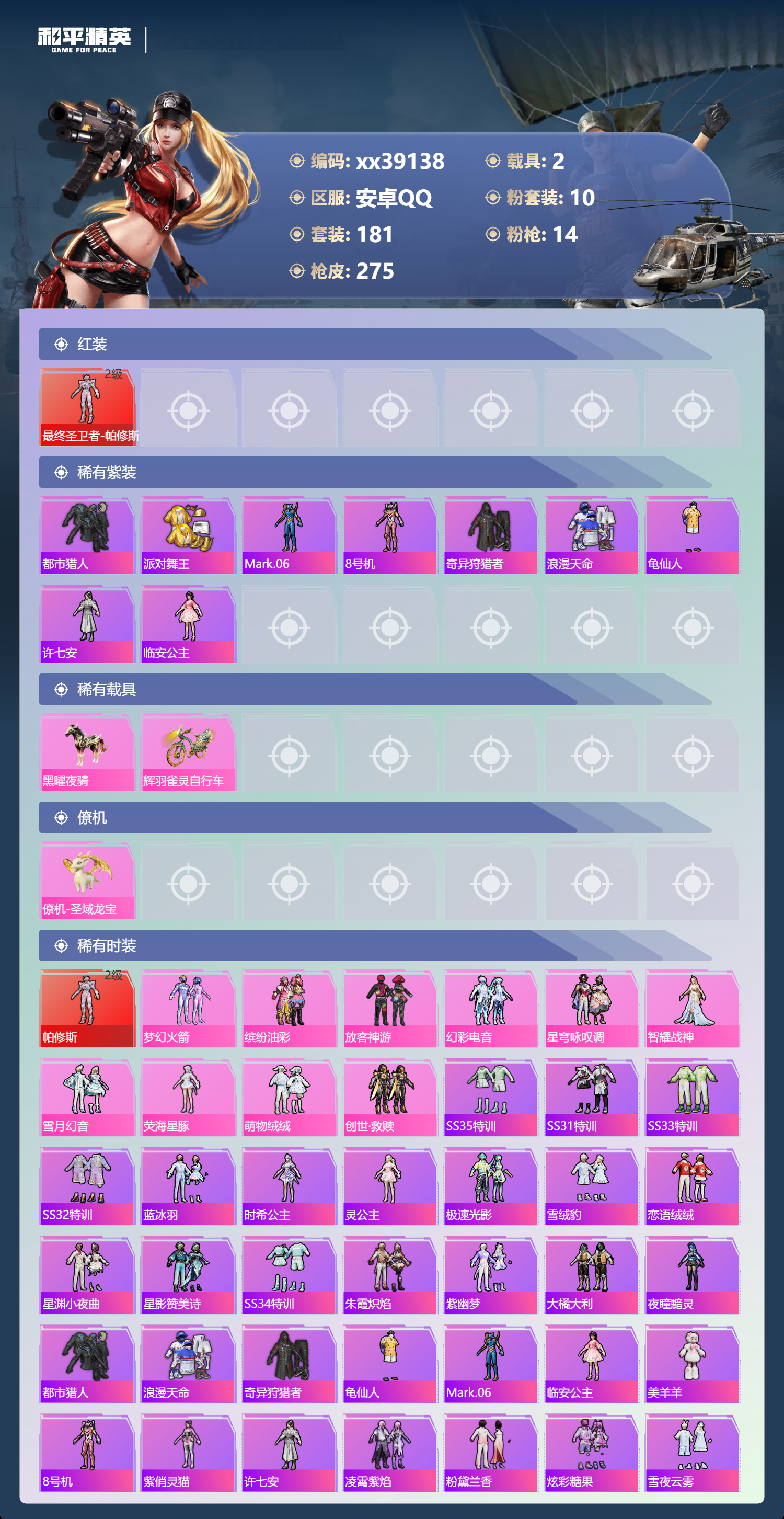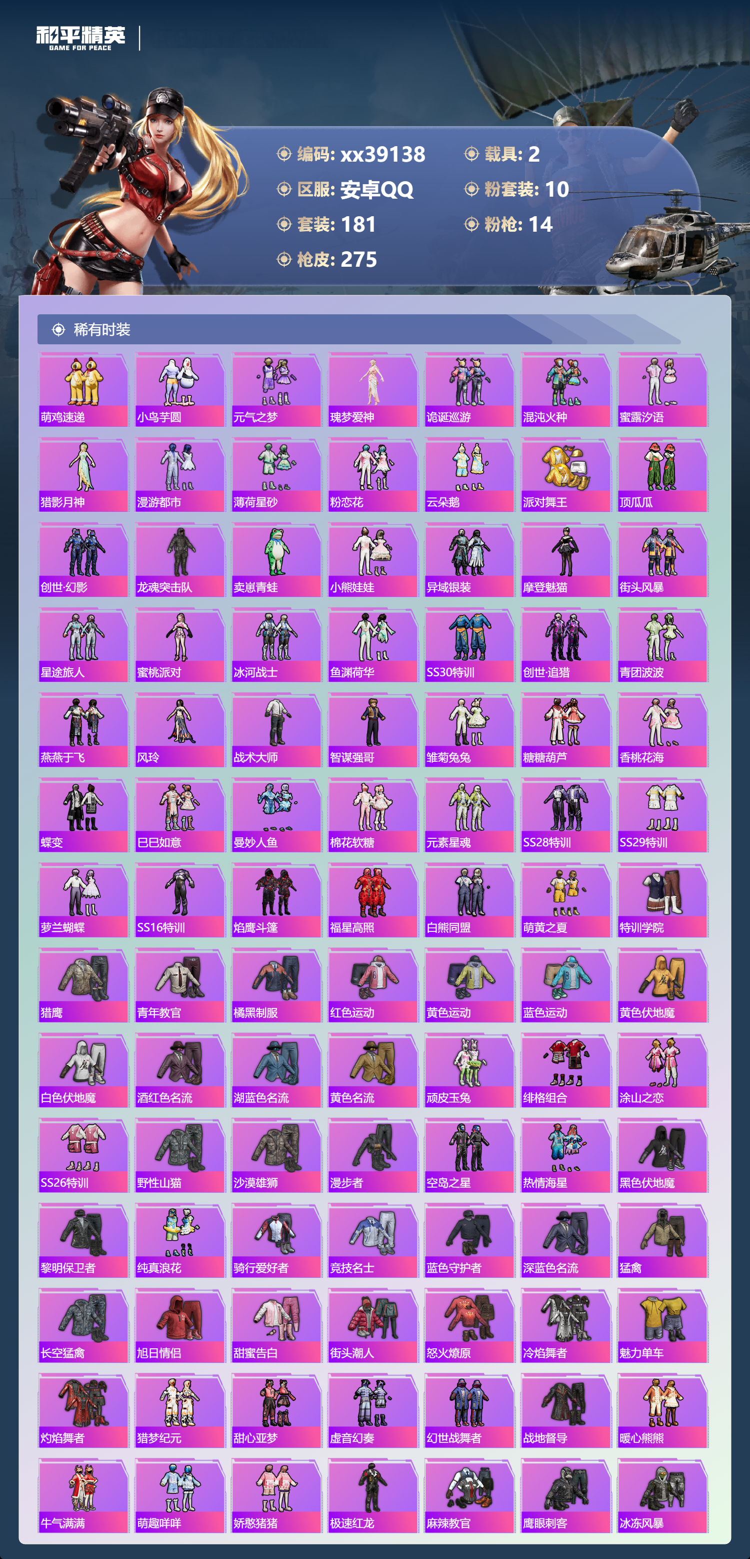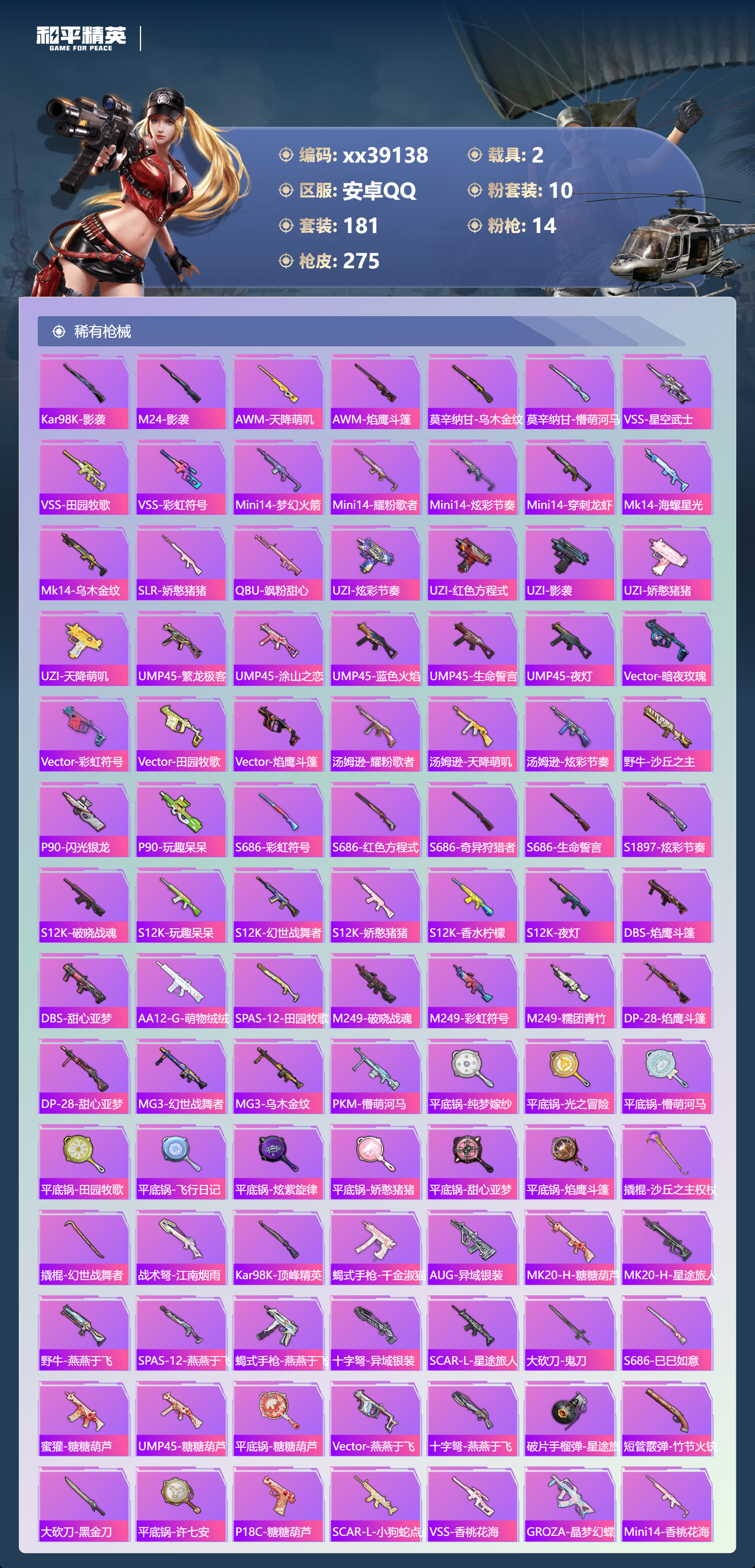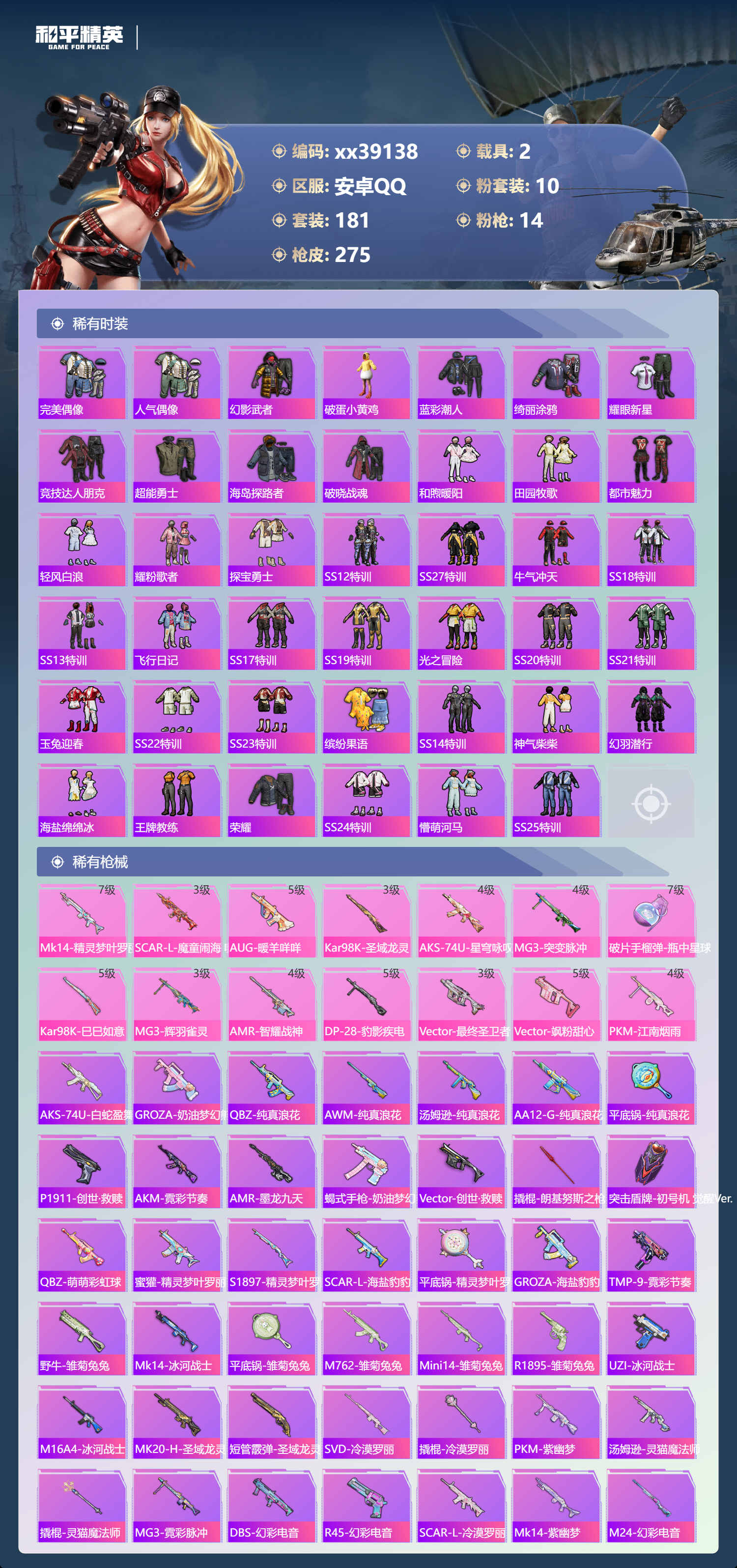 _2262250-包人脸安卓手q-12王牌印记-1红装-10粉装-14特效呛-2载具-89490热力值-181套装-275呛皮 【1红装】最终圣卫者-帕修斯/2级 【10粉装】套装-萌物绒绒套装-梦幻火箭套装-雪月幻音角色-智耀战神套装-放客神游角色-荧海星豚套装-幻彩电音套装-星穹咏叹调套装-创世·救赎套装-缤纷油彩 【14特效呛】mk14-精灵梦叶罗丽/7级mg3-突变脉冲/4级aks-74u-星穹咏叹调/4级kar98k-巳巳如意/5级kar98k-圣域龙灵/3级dp-28-豹影疾电/5级vect-飒粉甜心/5级aug-暖羊咩咩/5级破片手留单-瓶中星球/7级mg3-辉羽雀灵/3级pkm-江南烟雨/4级scar-l-魔童闹海哪吒/3级vect-最终圣卫者/3级amr-智耀战神/4级 【1红装】最终圣卫者-帕修斯/2级 【9稀有紫装】都市猎人派对舞王mark.068号机奇异狩猎者浪漫天命龟仙人许七安临安公主 【2稀有载具】黑曜夜骑辉羽雀灵自行车 【1僚机】僚机-圣域龙宝 【181稀有时装】梦幻火箭缤纷油彩放客神游帕修斯/2级幻彩电音星穹咏叹调智耀战神雪月幻音荧海星豚ss35特训ss31特训ss33特训ss32特训蓝冰羽时希公主灵公主极速光影雪绒豹恋语绒绒星渊小夜曲星影赞美诗ss34特训朱霞炽焰紫幽梦大橘大利夜瞳黯灵都市猎人浪漫天命奇异狩猎者龟仙人mark.06临安公主美羊羊8号机紫俏灵猫许七安凌霄紫焰粉黛兰香炫彩糖果雪夜云雾萌鸡速递小鸟芋圆元气之梦瑰梦爱神诡诞巡游混沌火种蜜露汐语猎影月神漫游都市薄荷星砂粉恋花云朵鹅派对舞王顶瓜瓜萌物绒绒创世·幻影创世·救赎龙魂突击队卖崽青蛙小熊娃娃异域银装摩登魅猫街头风暴星途旅人蜜桃派对冰河战士鱼渊荷华ss30特训创世·追猎青团波波燕燕于飞风玲战术大师智谋强哥雏菊兔兔糖糖葫芦香桃花海蝶变巳巳如意曼妙人鱼棉花软糖元素星魂ss28特训ss29特训萝兰蝴蝶ss16特训焰鹰斗篷福星高照白熊同盟萌黄之夏特训学院猎鹰青年教官橘黑制服红色运动黄色运动蓝色运动黄色伏地魔白色伏地魔酒红色名流湖蓝色名流黄色名流顽皮玉兔绯格组合涂山之恋ss26特训野性山猫沙漠雄狮漫步者空岛之星热情海星黑色伏地魔黎明保卫者纯真浪花骑行爱好者竞技名士蓝色守护者深蓝色名流猛禽长空猛禽旭日情侣甜蜜告白街头潮人怒火燎原冷焰舞者魅力单车灼焰舞者猎梦纪元甜心亚梦虚音幻奏幻世战舞者战地督导暖心熊熊牛气满满萌趣咩咩娇憨猪猪极速红龙麻辣教官鹰眼刺客冰冻风暴完美偶像人气偶像幻影武者破蛋小黄鸡蓝彩潮人绮丽涂鸦耀眼新星竞技达人朋克超能勇士海岛探路者破晓战魂和煦暖阳田园牧歌都市魅力轻风白浪耀粉歌者探宝勇士ss12特训ss27特训牛气冲天ss18特训ss13特训飞行日记ss17特训ss19特训光之冒险ss20特训ss21特训玉兔迎春ss22特训ss23特训缤纷果语ss14特训神气柴柴幻羽潜行海盐绵绵冰王牌教练荣耀ss24特训懵萌河马ss25特训 【275稀有呛械】aks-74u-白蛇盈舞groza-奶油梦幻熊q-纯真浪花awm-纯真浪花汤姆逊-纯真浪花dbs-乌木金纹aa12-g-纯真浪花平底锅-纯真浪花p1911-创世·救赎akm-霓彩节奏amr-墨龙九天蝎式手呛-奶油梦幻熊vect-创世·救赎撬棍-朗基努斯之呛突击盾牌-初号机觉醒ver.q-萌萌彩虹球蜜獾-精灵梦叶罗丽s1897-精灵梦叶罗丽scar-l-海盐豹豹mk14-精灵梦叶罗丽/7级平底锅-精灵梦叶罗丽groza-海盐豹豹tmp-9-霓彩节奏scar-l-魔童闹海哪吒/3级aug-暖羊咩咩/5级kar98k-圣域龙灵/3级aks-74u-星穹咏叹调/4级mg3-突变脉冲/4级破片手留单-瓶中星球/7级kar98k-巳巳如意/5级mg3-辉羽雀灵/3级amr-智耀战神/4级dp-28-豹影疾电/5级vect-最终圣卫者/3级野牛-雏菊兔兔mk14-冰河战士平底锅-雏菊兔兔m762-雏菊兔兔mini14-雏菊兔兔r1895-雏菊兔兔uzi-冰河战士m16a4-冰河战士mk20-h-乌木金纹vect-飒粉甜心/5级pkm-江南烟雨/4级mk20-h-圣域龙灵短管霰弹-圣域龙灵akm-绿洲时空win94-乌木金纹svd-冷漠罗丽撬棍-冷漠罗丽pkm-紫幽梦汤姆逊-灵猫魔法师撬棍-灵猫魔法师mg3-霓彩脉冲dbs-幻彩电音r45-幻彩电音scar-l-冷漠罗丽mk14-紫幽梦m24-幻彩电音蜜獾-乌木金纹m762-云朵鹅s1897-紫幽梦svd-云朵鹅p92-紫幽梦m249-绯穹魔姬m417-玩趣呆呆铝热弹-炫彩糖果uzi-炫彩糖果ump45-绿洲时空m416-萌萌史莱姆m249-萌萌史莱姆mini14-绯穹魔姬tmp-9-萌萌史莱姆g36c-星穹咏叹调短管霰弹-星穹咏叹调kar98k-星穹咏叹调js9-凌霄紫焰mg-36-凌霄紫焰平底锅-紫幽梦破片手留单-海盐豹豹ump45-海盐豹豹arx-凌霄紫焰aks-74u-乌木金纹akm-涂鸦街区电击呛-喜羊羊与灰太狼爆炸猎弓-喜羊羊与灰太狼p92-凌霄紫焰amr-喜羊羊与灰太狼aks-74u-辉羽雀灵famas-乌木金纹famas-霓彩脉冲spas-12-云朵鹅破片手留单-拽到爆炸平底锅-辉羽雀灵mini14-辉羽雀灵信号呛-异瞳寒姬平底锅-凌霄紫焰mk14-薄荷星砂aks-74u-鸡智如我汤姆逊-智耀战神s12k-智耀战神沙墨之鹦-云朵鹅tmp-9-雪月幻音盐雾蛋-冰氧夏日mg3-智耀战神mk14-紫晶流影大砍刀-云朵鹅pkm-啾咪啾咪m200-爆裂游戏撬棍-双重狂想slr-霓彩脉冲平底锅-属我最6scar-l-彩虹符号蝎式手呛-六号稻草人蜜獾-鸡智如我m16a4-最终圣卫者aug-紫晶流影s12k-霓彩脉冲kar98k-最终圣卫者野牛-最终圣卫者akm-霓彩脉冲撬棍-火尖呛sks-圣域龙灵m416-红色方程式m416-蓝色火焰m416-糯团青竹akm-影袭akm-夜灯akm-彩虹符号akm-破晓战魂akm-虎虎生威scar-l-红色方程式scar-l-玉兔迎春scar-l-夜灯scar-l-炫彩节奏m16a4-红色方程式m16a4-蓝色火焰m16a4-幻世战舞者m16a4-甜心亚梦groza-影袭groza-田园牧歌groza-懵萌河马aug-耀粉歌者aug-甜蜜菠萝aug-天降萌叽q-彩虹符