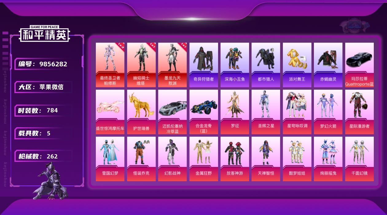 _2288718-二次-苹果v-99070热力值14王牌印记3卓越2传奇1绝世历史超级王牌16星极品身法素材号3级帕修斯1级敖渊1级维塔小丑怪诞乔克雪国幻梦梦幻火箭赤蝎都市金鞋天命发光眼罩鲨鱼裤深海小丑鱼红眼罩kone追光队服191套装262呛皮【6载具】玛莎拉蒂q蓝色迈凯伦塞纳冷萃蓝合金龙骨蓝色盛世惊鸿摩托车护世瑞兽圣域龙宝僚机【3神装】最终圣卫者-帕修斯3级幽焰骑士-维塔1级墨龙九天-敖渊1级【6稀有】奇异狩猎者赤蝎幽灵都市猎人浪漫天命派对舞王派对舞王(金靴子)【14粉装】梦幻火箭雪国幻梦星穹咏叹调怪诞乔克星际漫游者圣辉之星幻影战神金属狂野酣梦娃娃放客神游莲影清波绚丽摇曳天禅智恒千面幻镜【19特效呛】scar-l-金蛇镇世3级m416-电玩时刻5级akm-幽焰骑士3级kar98k-圣域龙灵3级kar98k-巳巳如意5级vect-最终圣卫者3级aug-暖羊咩咩5级p90-能量风暴5级m762-甜心娃娃5级mk14-甜梦熊击4级mk12-雪月幻音2级groza-圣辉之星4级groza-镜光银凌5级akm-梦之光华6级m416-风花雪月4级scar-l-青春物语5级破片手留单-粉粉猫爪6级破片手留单-热量炸弹1级盐雾蛋-猫咪绅士5级【2飞行器】龙翔九天飞行器千面幻镜飞行器【25热门】龟仙人太空漫步雪山精英潮萌小黄鸭呆萌铁蟹鹰眼刺客迅捷狂鲨深海小丑鱼金羽特工kone追光队服暗影哥特团圆交子瑞龙福将狂沙舞者漫步者冰爽海盐蓝甜马卡龙机械英豪黑色刀锋极速红龙军刀雅典娜弄潮海豚m762-瑞龙福将m249-古堡领主s686-奇异狩猎者【4头盔】梦幻火箭头盔雪国精灵头盔幻影战神头盔深海小丑鱼头盔【3背包】梦幻火箭背包雪国精灵背包古堡领主背包营地id:775349482