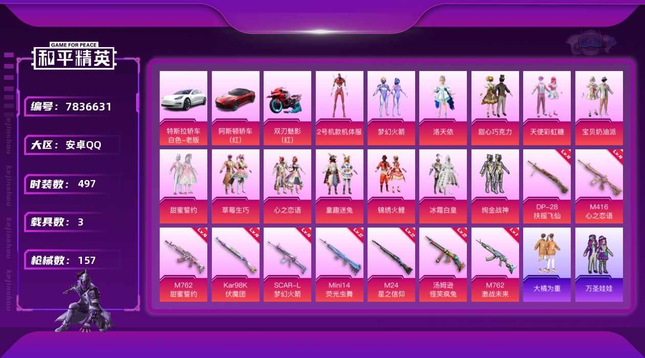 _2288722-二次安卓q-63115热力值小身法号3载13粉9呛红螳螂火箭少女巧克力三姐妹童趣迷兔小丑鱼幽冥伯爵口罩游骑兵口罩6王牌印记历史超级王牌3星126套装157呛皮【3载具】阿斯顿马丁s红色特斯拉3白色双刃魅影红色【13粉装】红螳螂梦幻火箭宝贝奶油派天使彩虹糖甜心巧克力洛天依甜蜜誓约心之恋语锦绣火鲤草莓生巧绚金战神童趣迷兔冰霜白皇【9特效呛】scar-l-梦幻火箭4级m416-心之恋语4级m24-星之信仰2级kar98k-伏魔团4级m762-甜蜜誓约4级dp-28-扶摇飞仙4级mini14-荧光虫舞2级m762-激战未来1级汤姆逊-怪笑疯兔2级【5飞行器】锦绣火鲤飞行器心之恋语飞行翼夏日绵绵冰飞行器梦幻火箭飞行器齐天大圣飞行器【25热门】雪山精英爱崽白熊梦魇先生万圣娃娃好奇恐龙大橘为重童话森林山经魅狐暗夜契约团圆交子瑞龙福将纯白誓言梦之呓语韶华初心薄荷蓝莓抹茶蜜豆白虎圣者玄武圣者青龙圣者静谧青瓷机械英豪风华少年志极速红龙m762-瑞龙福将akm-山经魅狐【5头盔】梦幻火箭头盔甜心宝贝头盔甜蜜誓约头盔心之恋语头盔夏日绵绵冰头盔【5背包】梦幻火箭背包甜心宝贝背包甜蜜誓约背包心之恋语背包夏日绵绵冰背包营地id:561440627