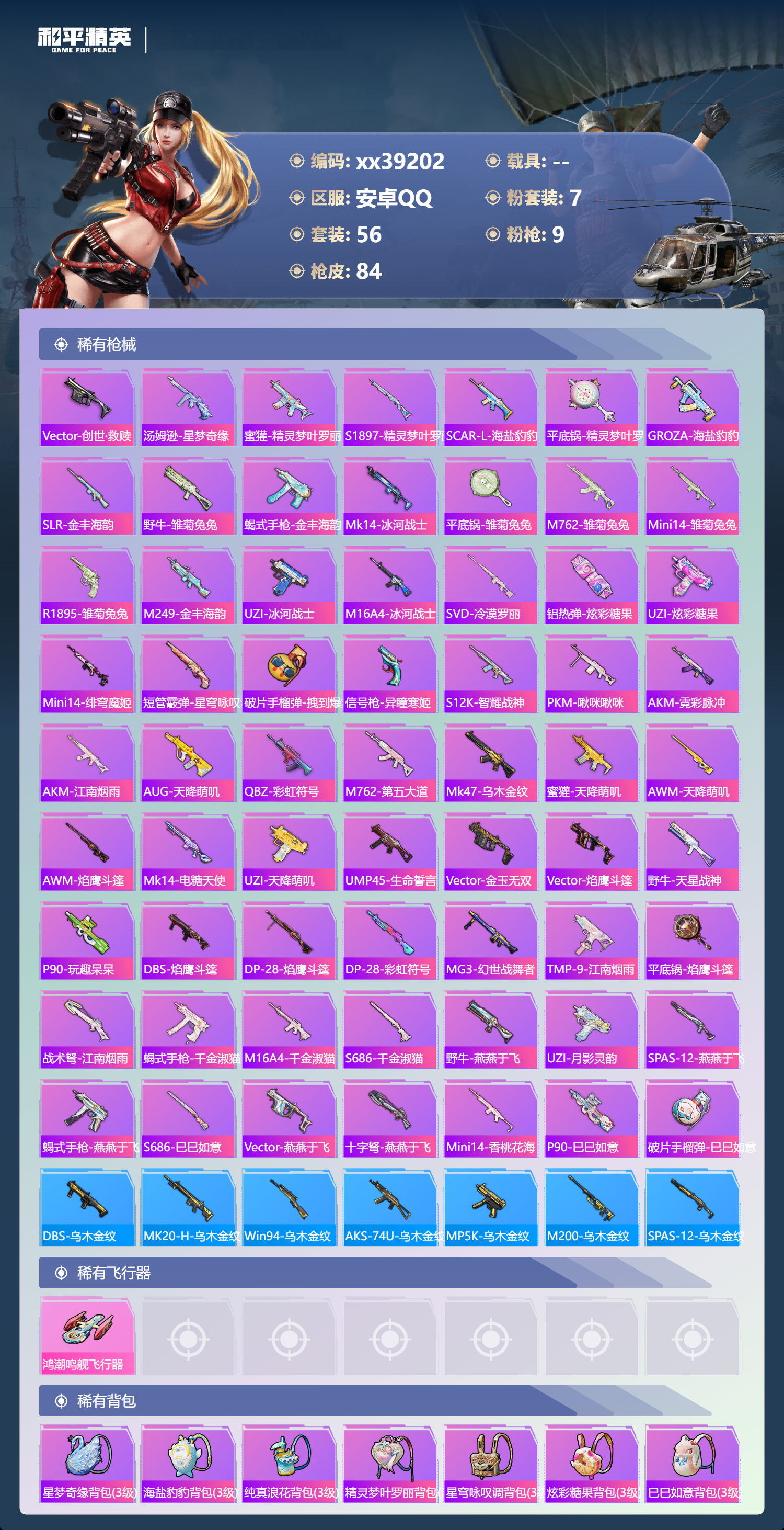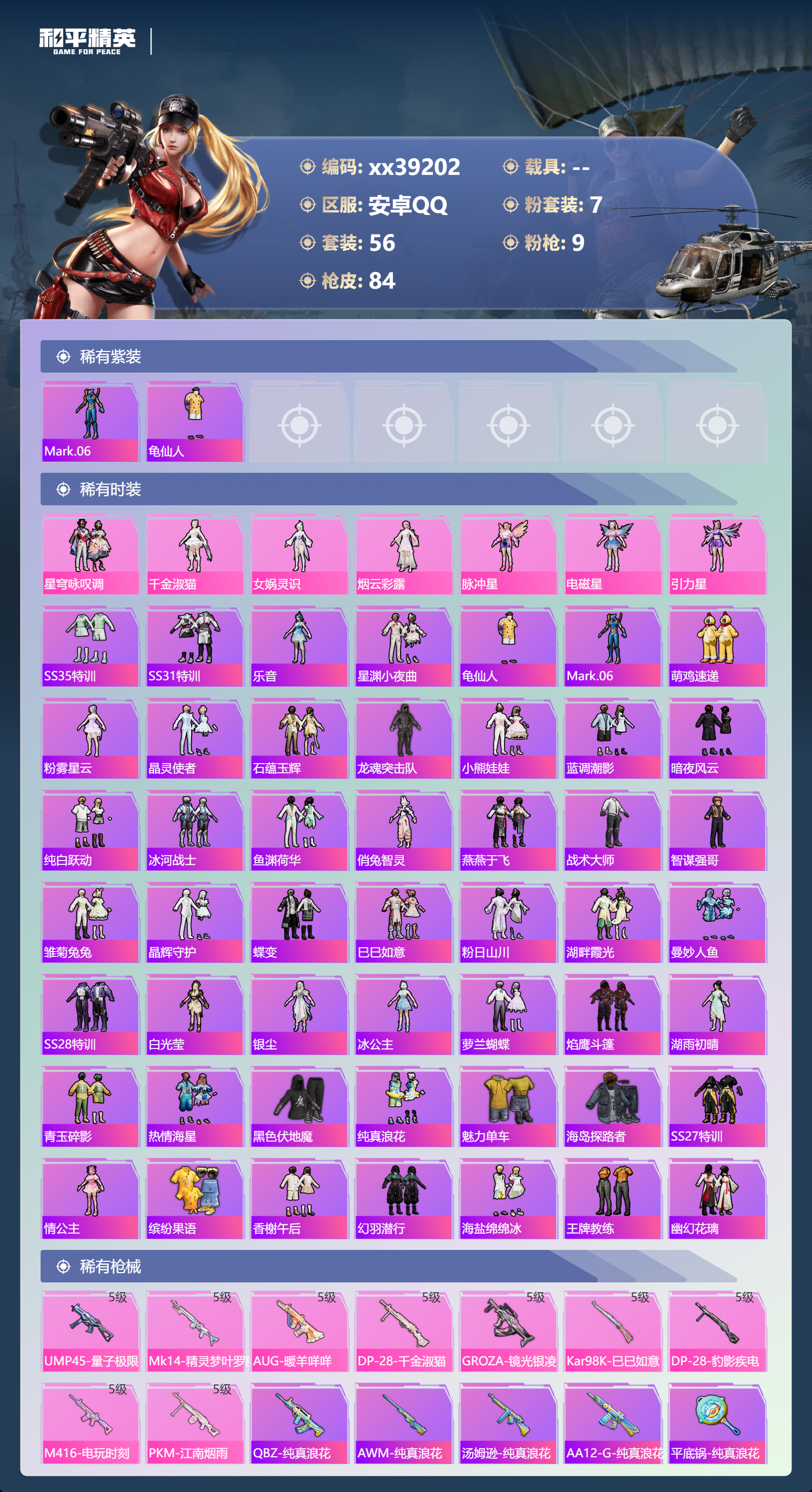 _2263898-可二次安卓手q-2王牌印记-7粉装-9特效呛-29849热力值-56套装-84呛皮-1卓越印记 【7粉装】角色-烟云彩露角色-脉冲星角色-女娲灵识角色-引力星套装-星穹咏叹调角色-千金淑猫角色-电磁星 【9特效呛】kar98k-巳巳如意/5级ump45-量子极限/5级groza-镜光银凌/5级pkm-江南烟雨/5级mk14-精灵梦叶罗丽/5级aug-暖羊咩咩/5级m416-电玩时刻/5级dp-28-豹影疾电/5级dp-28-千金淑猫/5级 【2稀有紫装】mark.06龟仙人 【56稀有时装】星穹咏叹调ss35特训ss31特训乐音星渊小夜曲龟仙人mark.06萌鸡速递千金淑猫女娲灵识烟云彩露脉冲星电磁星引力星粉雾星云晶灵使者石蕴玉辉龙魂突击队小熊娃娃蓝调潮影暗夜风云纯白跃动冰河战士鱼渊荷华俏兔智灵燕燕于飞战术大师智谋强哥雏菊兔兔晶辉守护蝶变巳巳如意粉日山川湖畔霞光曼妙人鱼ss28特训白光莹银尘冰公主萝兰蝴蝶焰鹰斗篷湖雨初晴青玉碎影热情海星黑色伏地魔纯真浪花魅力单车海岛探路者ss27特训情公主缤纷果语香榭午后幻羽潜行海盐绵绵冰王牌教练幽幻花璃 【84稀有呛械】ump45-量子极限/5级q-纯真浪花awm-纯真浪花汤姆逊-纯真浪花dbs-乌木金纹aa12-g-纯真浪花平底锅-纯真浪花vect-创世·救赎汤姆逊-星梦奇缘蜜獾-精灵梦叶罗丽s1897-精灵梦叶罗丽scar-l-海盐豹豹mk14-精灵梦叶罗丽/5级平底锅-精灵梦叶罗丽groza-海盐豹豹aug-暖羊咩咩/5级dp-28-千金淑猫/5级groza-镜光银凌/5级kar98k-巳巳如意/5级dp-28-豹影疾电/5级slr-金丰海韵野牛-雏菊兔兔蝎式手呛-金丰海韵mk14-冰河战士平底锅-雏菊兔兔m762-雏菊兔兔mini14-雏菊兔兔r1895-雏菊兔兔m249-金丰海韵uzi-冰河战士m16a4-冰河战士mk20-h-乌木金纹m416-电玩时刻/5级pkm-江南烟雨/5级win94-乌木金纹svd-冷漠罗丽铝热弹-炫彩糖果uzi-炫彩糖果mini14-绯穹魔姬短管霰弹-星穹咏叹调aks-74u-乌木金纹破片手留单-拽到爆炸信号呛-异瞳寒姬s12k-智耀战神pkm-啾咪啾咪akm-霓彩脉冲akm-江南烟雨aug-天降萌叽q-彩虹符号m762-第五大道mk47-乌木金纹蜜獾-天降萌叽awm-天降萌叽awm-焰鹰斗篷mk14-电糖天使uzi-天降萌叽ump45-生命誓言vect-金玉无双vect-焰鹰斗篷野牛-天星战神mp5k-乌木金纹p90-玩趣呆呆dbs-焰鹰斗篷dp-28-焰鹰斗篷dp-28-彩虹符号mg3-幻世战舞者tmp-9-江南烟雨平底锅-焰鹰斗篷战术弩-江南烟雨蝎式手呛-千金淑猫m16a4-千金淑猫s686-千金淑猫野牛-燕燕于飞uzi-月影灵韵m200-乌木金纹spas-12-燕燕于飞蝎式手呛-燕燕于飞s686-巳巳如意spas-12-乌木金纹vect-燕燕于飞十子怒-燕燕于飞mini14-香桃花海p90-巳巳如意破片手留单-巳巳如意 【1稀有飞行器】鸿潮鸣舰飞行器 【18稀有背包】星梦奇缘背包3级海盐豹豹背包3级纯真浪花背包3级精灵梦叶罗丽背包3级星穹咏叹调背包3级炫彩糖果背包3级巳巳如意背包3级金丰海韵背包3级龟仙人龟壳背包3级晶梦幻蝶背包3级焰鹰斗篷背包3级千金淑猫背包3级异域银装背包3级江南烟雨背包3级燕燕于飞背包3级雏菊兔兔背包3级智谋强哥背包3级冰河战士背包3级