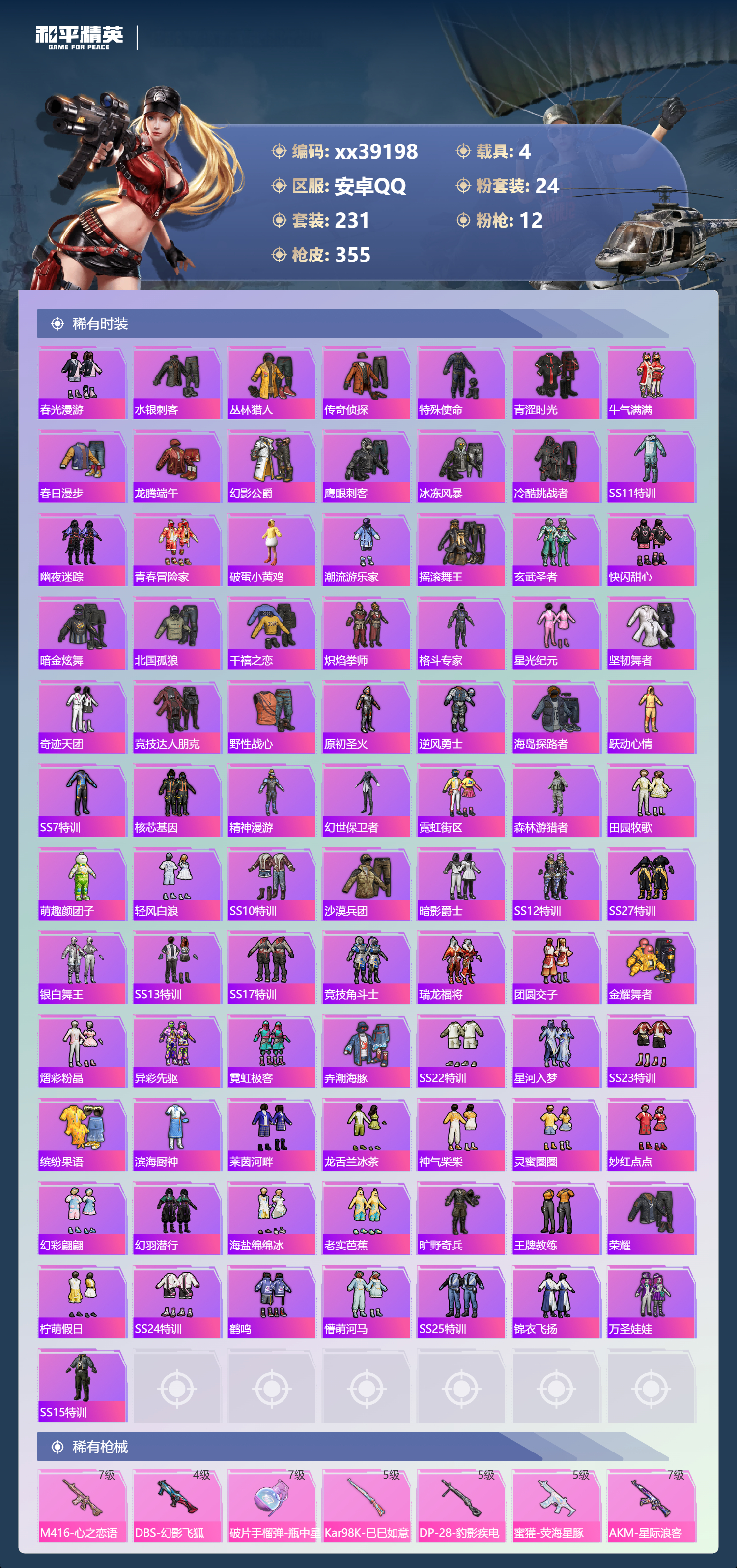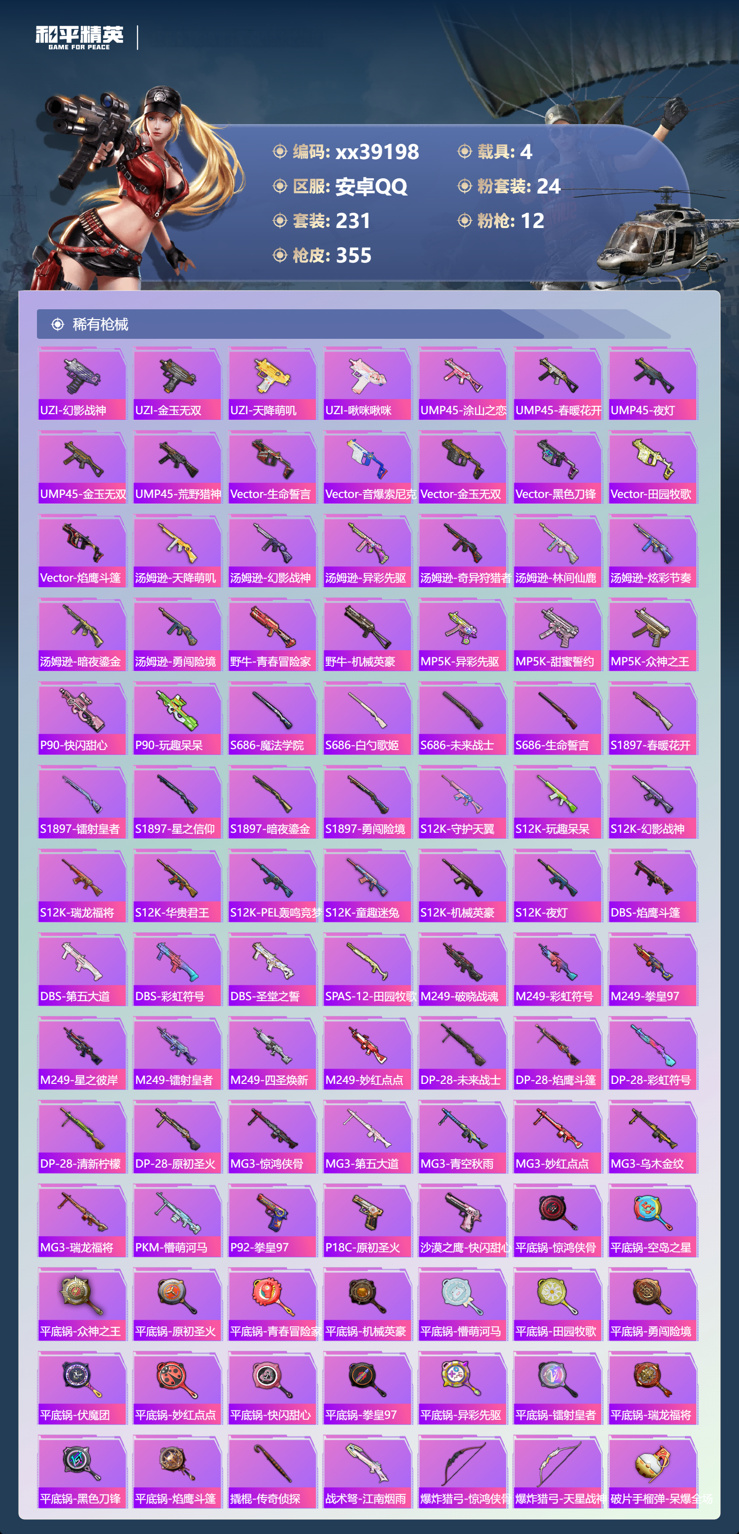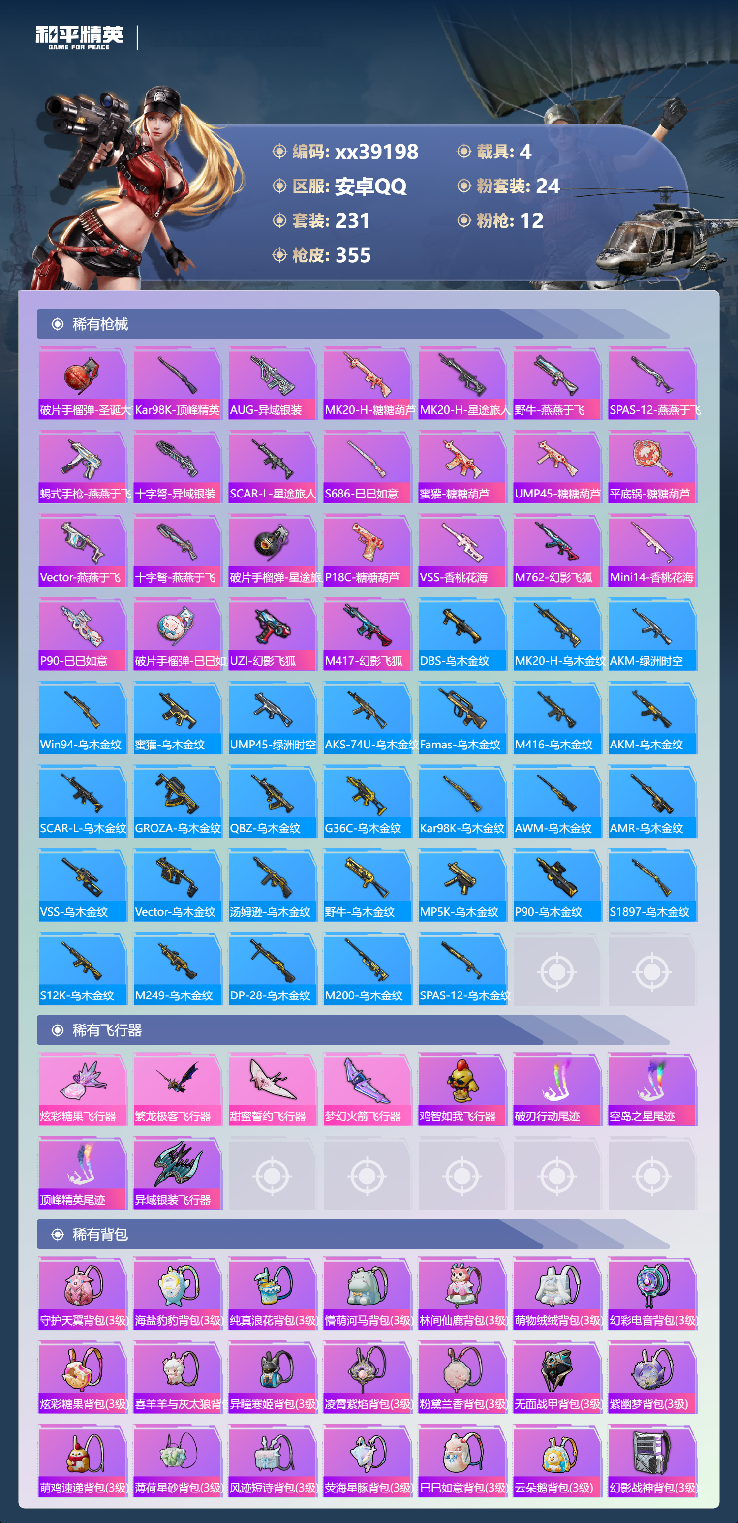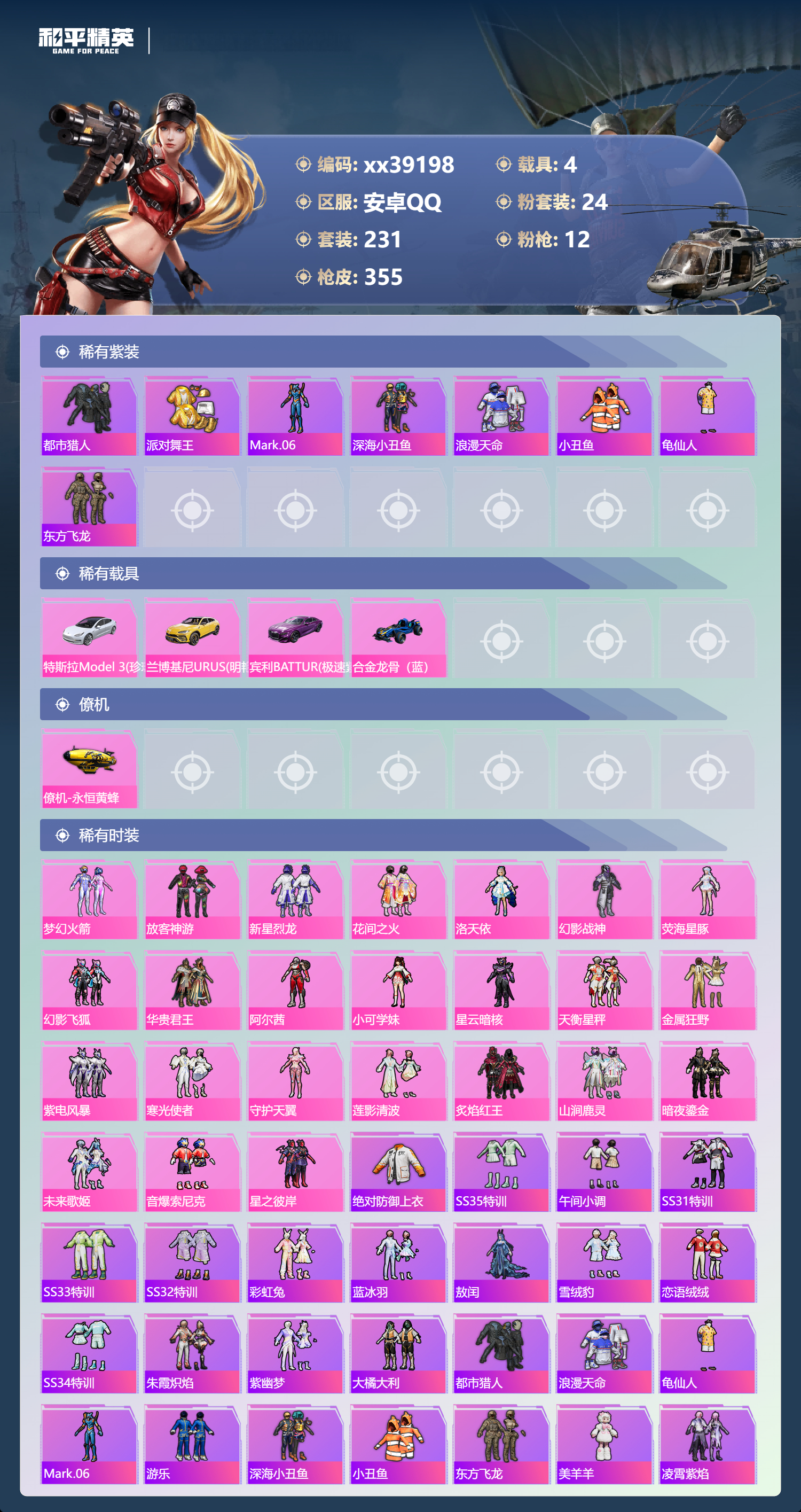 _2263891-可二次安卓手q-15王牌印记-24粉装-12特效呛-4载具-热力值-231套装-355呛皮-13卓越印记-8传奇印记 【24粉装】角色-荧海星豚套装-星之彼岸套装-暗夜鎏金套装-华贵君王套装-山涧鹿灵角色-洛天依套装-花间之火套装-炙焰红王套装-幻影战神套装-寒光使者角色-小可学妹套装-天衡星秤套装-未来歌姬套装-金属狂野套装-音爆索尼克角色-守护天翼套装-放客神游套装-莲影清波角色-星云暗核套装-紫电风暴套装-幻影飞狐角色-阿尔茜套装-新星烈龙套装-梦幻火箭 【12特效呛】m762-甜蜜誓约/5级dbs-幻影飞狐/4级akm-星际浪客/7级dp-28-豹影疾电/5级破片手留单-瓶中星球/7级kar98k-巳巳如意/5级scar-l-纯梦嫁纱/5级平底锅-林间仙鹿/7级蜜獾-荧海星豚/5级p90-粉樱探戈/7级m416-心之恋语/7级m417-第五大道/4级 【9稀有紫装】都市猎人派对舞王mark.06巡查衣深海小丑鱼浪漫天命小丑鱼龟仙人东方飞龙 【4稀有载具】特斯拉model3珍珠白兰博基尼urus明艳黄宾利battur极速紫)合金龙骨(蓝) 【1僚机】僚机-永恒黄蜂 【231稀有时装】梦幻火箭绝对防御上衣放客神游新星烈龙花间之火洛天依幻影战神荧海星豚ss35特训午间小调ss31特训ss33特训ss32特训彩虹兔蓝冰羽敖闰雪绒豹恋语绒绒ss34特训朱霞炽焰紫幽梦大橘大利都市猎人浪漫天命龟仙人mark.06游乐深海小丑鱼小丑鱼东方飞龙美羊羊凌霄紫焰粉黛兰香无面战甲擎苍青焰绯色魅影萌鸡速递元气之梦风迹短诗墨青刃影蜜露汐语漫游都市薄荷星砂秘语星愿粉恋花蓝海鲸歌云朵鹅派对舞王顶瓜瓜幻影飞狐华贵君王阿尔茜小可学妹星云暗核天衡星秤金属狂野紫电风暴寒光使者守护天翼莲影清波炙焰红王山涧鹿灵暗夜鎏金未来歌姬音爆索尼克星之彼岸龙宫之主龙魂突击队小熊娃娃异域银装摩登魅猫街头风暴星途旅人冰河战士鱼渊荷华ss30特训创世·追猎青团波波燕燕于飞战术大师智谋强哥雏菊兔兔糖糖葫芦晶辉守护香桃花海蝶变旋风灵鼠巳巳如意曼妙人鱼棉花软糖闪电轻猫ss28特训冰公主迷域探索者机械征服者ss29特训萝兰蝴蝶ss16特训华灯初上明鸳圣池星际旅行贝斯之夜沙丘之歌焰鹰斗篷圣殿骑士冰爽风暴诡夜天鹅源星混沌银河圣歌暗夜契约纯白誓言龙的传人花园小羊咩五号元素甜梦熊熊智慧之神白熊同盟萌黄之夏隐空刺pel摇滚竞梦者白色伏地魔爆竹金鼠活力之心ss9特训绯格组合涂山之恋ss26特训漫步者空岛之星霸义无双热情海星黑色伏地魔黎明保卫者元气发射纯真浪花竞技名士猛禽长空猛禽竞技勇士朋克时尚圣诞特战装甲西部风情旭日情侣粉团憨憨惊鸿侠骨魅力单车春光漫游水银刺客丛林猎人传奇侦探特殊使命青涩时光牛气满满春日漫步龙腾端午幻影公爵鹰眼刺客冰冻风暴冷酷挑战者ss11特训幽夜迷踪青春冒险家破蛋小黄鸡潮流游乐家摇滚舞王玄武圣者快闪甜心暗金炫舞北国孤狼千禧之恋炽焰拳师格斗专家星光纪元坚韧舞者奇迹天团竞技达人朋克野性战心原初圣火逆风勇士海岛探路者跃动心情ss7特训核芯基因精神漫游幻世保卫者霓虹街区森林游猎者田园牧歌萌趣颜团子轻风白浪ss10特训沙漠兵团暗影爵士ss12特训ss27特训银白舞王ss13特训ss17特训竞技角斗士瑞龙福将团圆交子金耀舞者熠彩粉晶异彩先驱霓虹极客弄潮海豚ss22特训星河入梦ss23特训缤纷果语滨海厨神莱茵河畔龙舌兰冰茶神气柴柴灵蜜圈圈妙红点点幻彩翩翩幻羽潜行海盐绵绵冰老实芭蕉旷野奇兵王牌教练荣耀柠萌假日ss24特训鹤鸣懵萌河马ss25特训锦衣飞扬万圣娃娃ss15特训 【355稀有呛械】m416-心之恋语/7级q-纯真浪花awm-纯真浪花汤姆逊-纯真浪花dbs-乌木金纹aa12-g-纯真浪花平底锅-纯真浪花蜜獾-精灵梦叶罗丽r1895-绊爱scar-l-海盐豹豹groza-海盐豹豹tmp-9-霓彩节奏dbs-幻影飞狐/4级破片手留单-瓶中星球/7级kar98k-巳巳如意/5级dp-28-豹影疾电/5级蜜獾-荧海星豚/5级野牛-雏菊兔兔mk14-冰河战士aks-74u-尼罗河传说dp-28-尼罗河传说平底锅-雏菊兔兔m762-雏菊兔兔mini14-雏菊兔兔r1895-雏菊兔兔撬棍-突变脉冲uzi-冰河战士ump45-涂鸦旋风m16a4-冰河战士mk20-h-乌木金纹akm-星际浪客/7级scar-l-纯梦嫁纱/5级m762-甜蜜誓约/5级m417-第五大道/4级p90-粉樱探戈/7级平底锅-林间仙鹿/7级dbs-风迹短诗莫辛纳甘-风迹短诗akm-绿洲时空groza-无面战甲win94-乌木金纹mk12-风迹短诗野牛-魔童闹海敖闰f57-魔童闹海敖闰盐雾蛋-冰澜龙吟pkm-紫幽梦mg3-霓彩脉冲mk14-紫幽梦蜜獾-乌木金纹m762-云朵鹅s1897-紫幽梦svd-云朵鹅p92-紫幽梦m417-玩趣呆呆铝热弹-炫彩糖果uzi-炫彩糖果ump45-绿洲时空m416-萌萌史莱姆短管霰弹-星穹咏叹调mk47-风迹短诗js9-凌霄紫焰mg-36-凌霄紫焰平底锅-紫幽梦燃烧瓶-甜梦桃焰破片手留单-海盐豹豹ump45-海盐豹豹arx-凌霄紫焰aks-74u-乌木金纹akm-涂鸦街区电击呛-喜羊羊与灰太狼蜜獾-风迹短诗爆炸猎弓-喜羊羊与灰太狼p92-凌霄紫焰amr-喜羊羊与灰太狼aks-74u-辉羽雀灵famas-乌木金纹famas-霓彩脉冲spas-12-云朵鹅m249-无面战甲破片手留单-拽到爆炸十子怒-异瞳寒姬s1897-糯团青竹信号呛-异瞳寒姬平底锅-凌霄紫焰mk14-薄荷星砂aks-74u-鸡智如我r45-雨林猎影沙墨之鹦-云朵鹅盐雾蛋-冰氧夏日mk14-紫晶流影大砍刀-云朵鹅pkm-啾咪啾咪groza-荧海星豚s1897-荧海星豚dbs-荧海星豚svd-霓彩脉冲slr-霓彩脉冲平底锅-属我最6scar-l-彩虹符号p1911-无面战甲燃点复合弓-火尖莲影蜜獾-鸡智如我aug-紫晶流影s12k-霓彩脉冲m416-魔童闹海敖闰amr-鸡智如