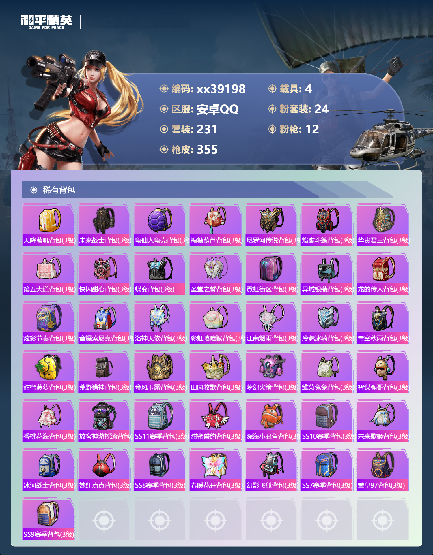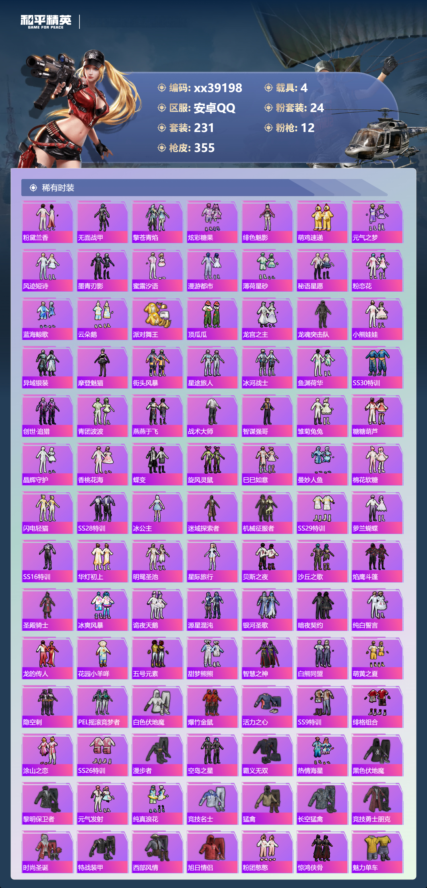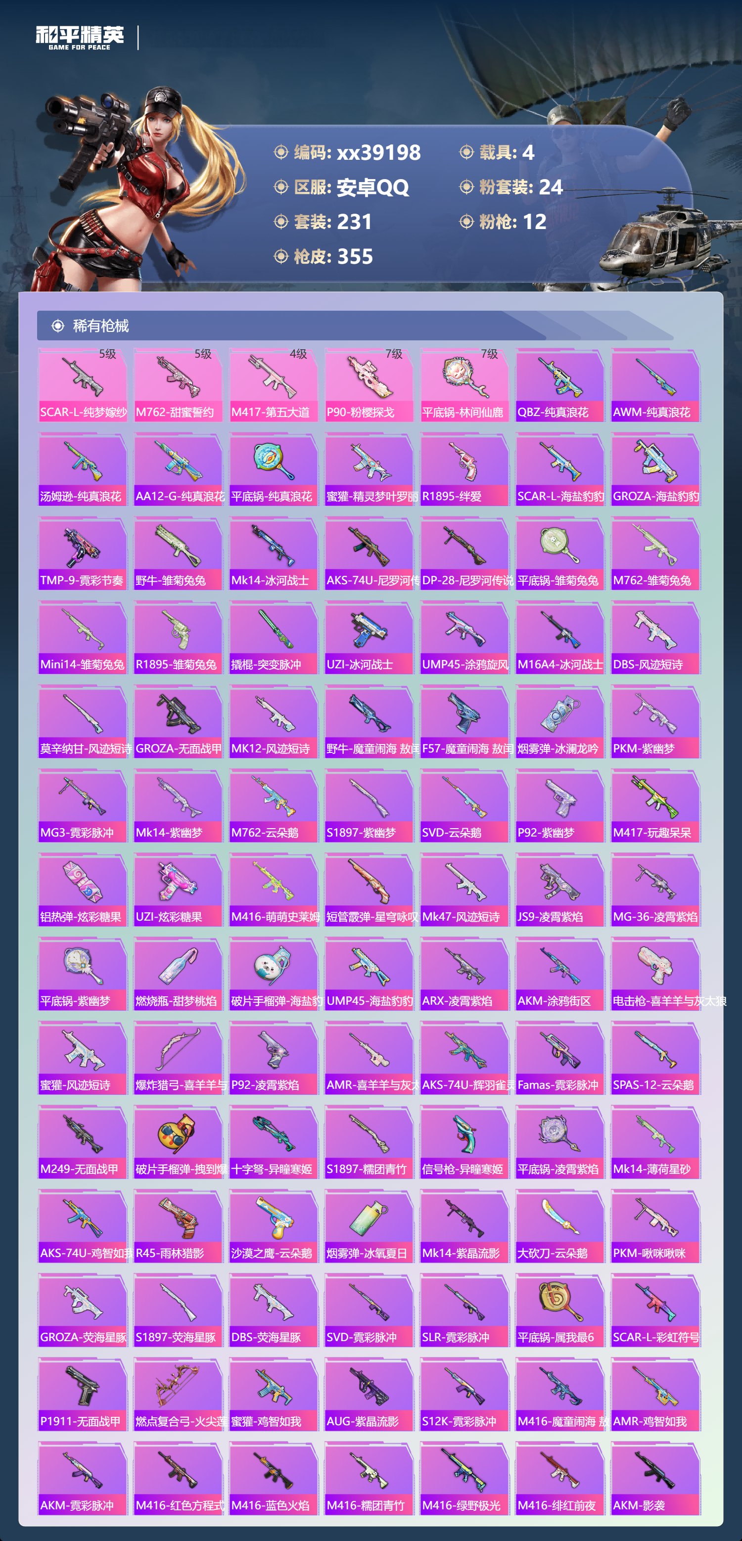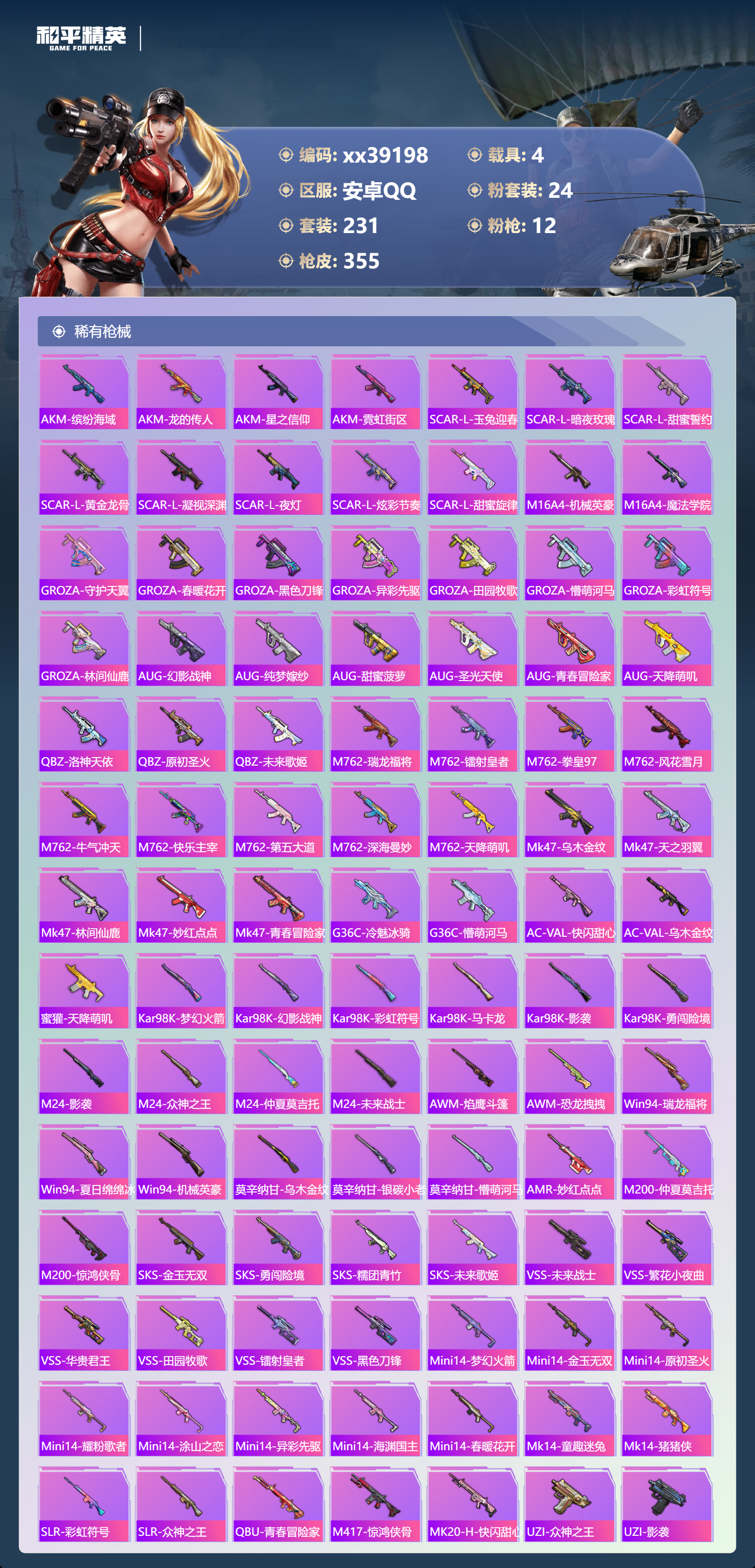_2263891-可二次安卓手q-15王牌印记-24粉装-12特效呛-4载具-热力值-231套装-355呛皮-13卓越印记-8传奇印记 【24粉装】角色-荧海星豚套装-星之彼岸套装-暗夜鎏金套装-华贵君王套装-山涧鹿灵角色-洛天依套装-花间之火套装-炙焰红王套装-幻影战神套装-寒光使者角色-小可学妹套装-天衡星秤套装-未来歌姬套装-金属狂野套装-音爆索尼克角色-守护天翼套装-放客神游套装-莲影清波角色-星云暗核套装-紫电风暴套装-幻影飞狐角色-阿尔茜套装-新星烈龙套装-梦幻火箭 【12特效呛】m762-甜蜜誓约/5级dbs-幻影飞狐/4级akm-星际浪客/7级dp-28-豹影疾电/5级破片手留单-瓶中星球/7级kar98k-巳巳如意/5级scar-l-纯梦嫁纱/5级平底锅-林间仙鹿/7级蜜獾-荧海星豚/5级p90-粉樱探戈/7级m416-心之恋语/7级m417-第五大道/4级 【9稀有紫装】都市猎人派对舞王mark.06巡查衣深海小丑鱼浪漫天命小丑鱼龟仙人东方飞龙 【4稀有载具】特斯拉model3珍珠白兰博基尼urus明艳黄宾利battur极速紫)合金龙骨(蓝) 【1僚机】僚机-永恒黄蜂 【231稀有时装】梦幻火箭绝对防御上衣放客神游新星烈龙花间之火洛天依幻影战神荧海星豚ss35特训午间小调ss31特训ss33特训ss32特训彩虹兔蓝冰羽敖闰雪绒豹恋语绒绒ss34特训朱霞炽焰紫幽梦大橘大利都市猎人浪漫天命龟仙人mark.06游乐深海小丑鱼小丑鱼东方飞龙美羊羊凌霄紫焰粉黛兰香无面战甲擎苍青焰绯色魅影萌鸡速递元气之梦风迹短诗墨青刃影蜜露汐语漫游都市薄荷星砂秘语星愿粉恋花蓝海鲸歌云朵鹅派对舞王顶瓜瓜幻影飞狐华贵君王阿尔茜小可学妹星云暗核天衡星秤金属狂野紫电风暴寒光使者守护天翼莲影清波炙焰红王山涧鹿灵暗夜鎏金未来歌姬音爆索尼克星之彼岸龙宫之主龙魂突击队小熊娃娃异域银装摩登魅猫街头风暴星途旅人冰河战士鱼渊荷华ss30特训创世·追猎青团波波燕燕于飞战术大师智谋强哥雏菊兔兔糖糖葫芦晶辉守护香桃花海蝶变旋风灵鼠巳巳如意曼妙人鱼棉花软糖闪电轻猫ss28特训冰公主迷域探索者机械征服者ss29特训萝兰蝴蝶ss16特训华灯初上明鸳圣池星际旅行贝斯之夜沙丘之歌焰鹰斗篷圣殿骑士冰爽风暴诡夜天鹅源星混沌银河圣歌暗夜契约纯白誓言龙的传人花园小羊咩五号元素甜梦熊熊智慧之神白熊同盟萌黄之夏隐空刺pel摇滚竞梦者白色伏地魔爆竹金鼠活力之心ss9特训绯格组合涂山之恋ss26特训漫步者空岛之星霸义无双热情海星黑色伏地魔黎明保卫者元气发射纯真浪花竞技名士猛禽长空猛禽竞技勇士朋克时尚圣诞特战装甲西部风情旭日情侣粉团憨憨惊鸿侠骨魅力单车春光漫游水银刺客丛林猎人传奇侦探特殊使命青涩时光牛气满满春日漫步龙腾端午幻影公爵鹰眼刺客冰冻风暴冷酷挑战者ss11特训幽夜迷踪青春冒险家破蛋小黄鸡潮流游乐家摇滚舞王玄武圣者快闪甜心暗金炫舞北国孤狼千禧之恋炽焰拳师格斗专家星光纪元坚韧舞者奇迹天团竞技达人朋克野性战心原初圣火逆风勇士海岛探路者跃动心情ss7特训核芯基因精神漫游幻世保卫者霓虹街区森林游猎者田园牧歌萌趣颜团子轻风白浪ss10特训沙漠兵团暗影爵士ss12特训ss27特训银白舞王ss13特训ss17特训竞技角斗士瑞龙福将团圆交子金耀舞者熠彩粉晶异彩先驱霓虹极客弄潮海豚ss22特训星河入梦ss23特训缤纷果语滨海厨神莱茵河畔龙舌兰冰茶神气柴柴灵蜜圈圈妙红点点幻彩翩翩幻羽潜行海盐绵绵冰老实芭蕉旷野奇兵王牌教练荣耀柠萌假日ss24特训鹤鸣懵萌河马ss25特训锦衣飞扬万圣娃娃ss15特训 【355稀有呛械】m416-心之恋语/7级q-纯真浪花awm-纯真浪花汤姆逊-纯真浪花dbs-乌木金纹aa12-g-纯真浪花平底锅-纯真浪花蜜獾-精灵梦叶罗丽r1895-绊爱scar-l-海盐豹豹groza-海盐豹豹tmp-9-霓彩节奏dbs-幻影飞狐/4级破片手留单-瓶中星球/7级kar98k-巳巳如意/5级dp-28-豹影疾电/5级蜜獾-荧海星豚/5级野牛-雏菊兔兔mk14-冰河战士aks-74u-尼罗河传说dp-28-尼罗河传说平底锅-雏菊兔兔m762-雏菊兔兔mini14-雏菊兔兔r1895-雏菊兔兔撬棍-突变脉冲uzi-冰河战士ump45-涂鸦旋风m16a4-冰河战士mk20-h-乌木金纹akm-星际浪客/7级scar-l-纯梦嫁纱/5级m762-甜蜜誓约/5级m417-第五大道/4级p90-粉樱探戈/7级平底锅-林间仙鹿/7级dbs-风迹短诗莫辛纳甘-风迹短诗akm-绿洲时空groza-无面战甲win94-乌木金纹mk12-风迹短诗野牛-魔童闹海敖闰f57-魔童闹海敖闰盐雾蛋-冰澜龙吟pkm-紫幽梦mg3-霓彩脉冲mk14-紫幽梦蜜獾-乌木金纹m762-云朵鹅s1897-紫幽梦svd-云朵鹅p92-紫幽梦m417-玩趣呆呆铝热弹-炫彩糖果uzi-炫彩糖果ump45-绿洲时空m416-萌萌史莱姆短管霰弹-星穹咏叹调mk47-风迹短诗js9-凌霄紫焰mg-36-凌霄紫焰平底锅-紫幽梦燃烧瓶-甜梦桃焰破片手留单-海盐豹豹ump45-海盐豹豹arx-凌霄紫焰aks-74u-乌木金纹akm-涂鸦街区电击呛-喜羊羊与灰太狼蜜獾-风迹短诗爆炸猎弓-喜羊羊与灰太狼p92-凌霄紫焰amr-喜羊羊与灰太狼aks-74u-辉羽雀灵famas-乌木金纹famas-霓彩脉冲spas-12-云朵鹅m249-无面战甲破片手留单-拽到爆炸十子怒-异瞳寒姬s1897-糯团青竹信号呛-异瞳寒姬平底锅-凌霄紫焰mk14-薄荷星砂aks-74u-鸡智如我r45-雨林猎影沙墨之鹦-云朵鹅盐雾蛋-冰氧夏日mk14-紫晶流影大砍刀-云朵鹅pkm-啾咪啾咪groza-荧海星豚s1897-荧海星豚dbs-荧海星豚svd-霓彩脉冲slr-霓彩脉冲平底锅-属我最6scar-l-彩虹符号p1911-无面战甲燃点复合弓-火尖莲影蜜獾-鸡智如我aug-紫晶流影s12k-霓彩脉冲m416-魔童闹海敖闰amr-鸡智如