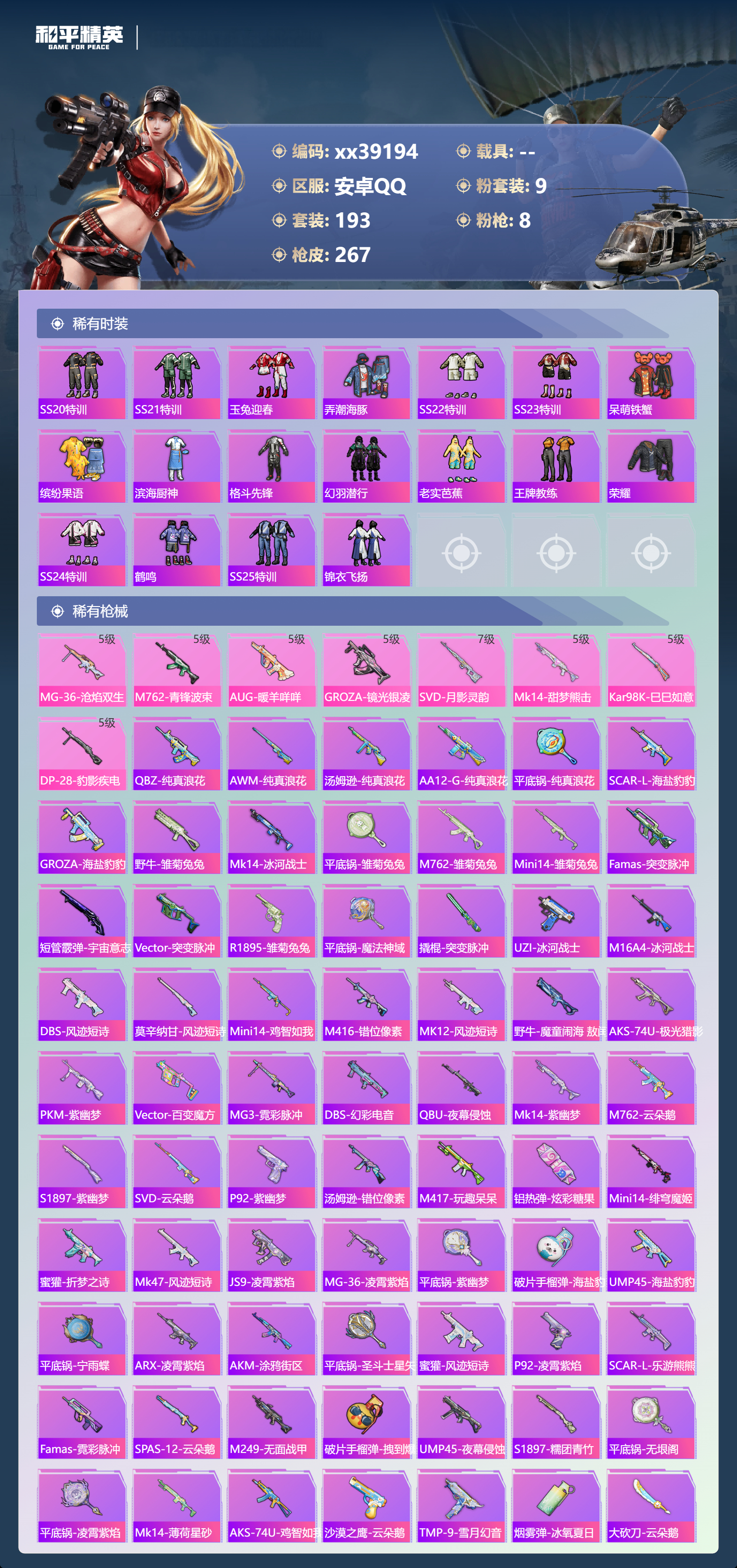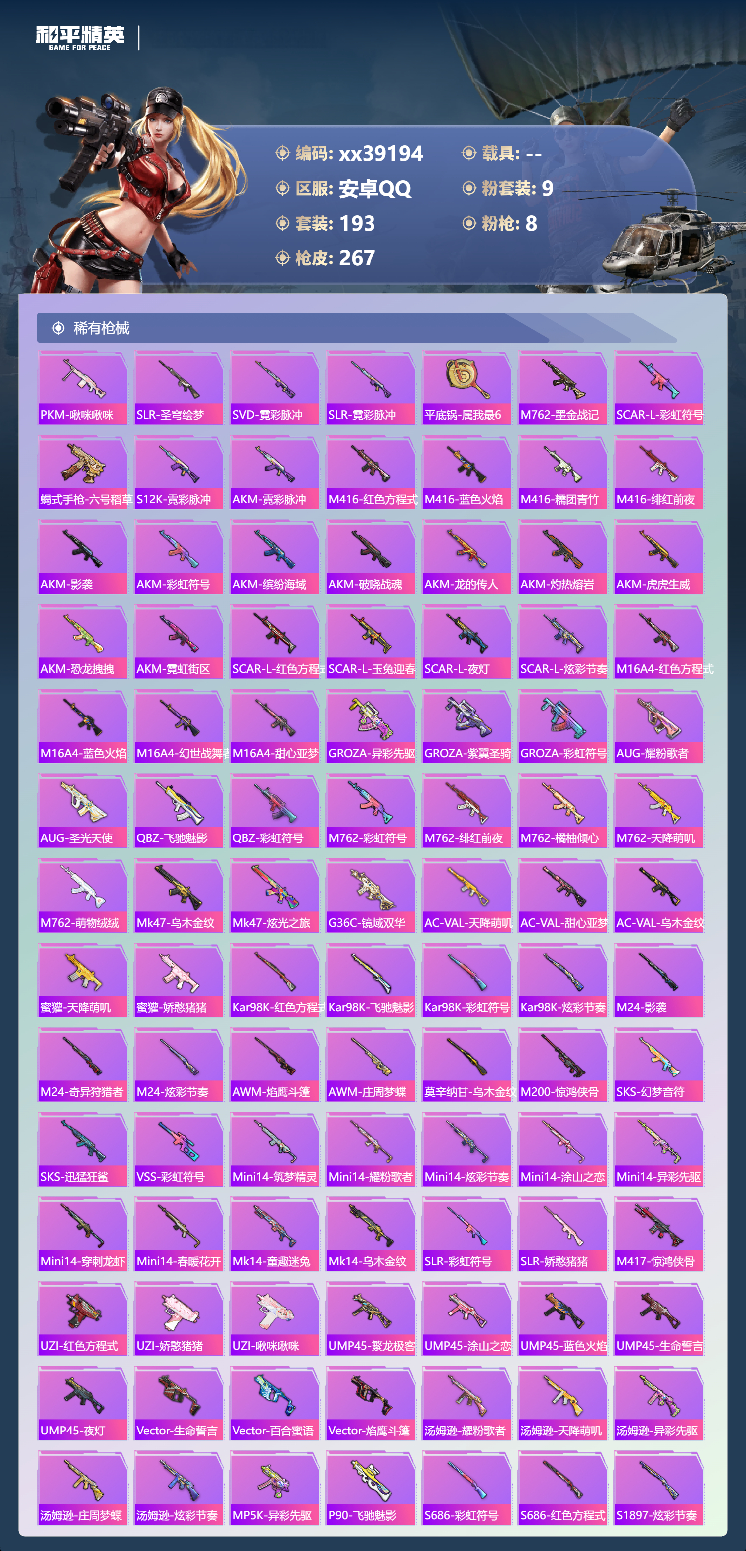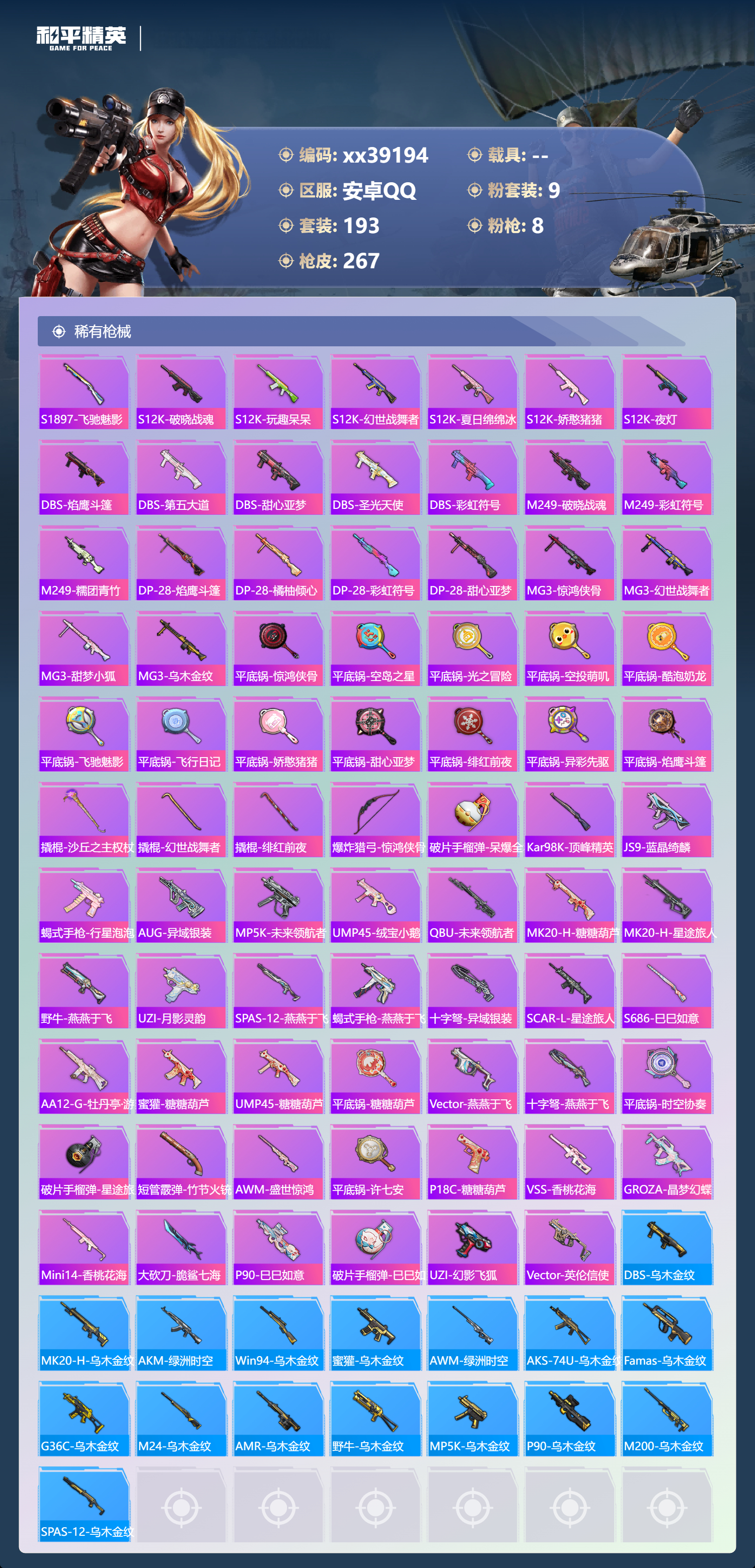 _2263890-不包人脸安卓手q-15王牌印记-9粉装-8特效呛-83669热力值-193套装-267呛皮-4卓越印记-1传奇印记 【9粉装】套装-赤焰黑爵角色-宁雨蝶角色-羊梦糖心套装-星穹咏叹调套装-炙焰牛王套装-寒光使者角色-复仇流浪者套装-英伦信使角色-千金淑猫 【8特效呛】svd-月影灵韵/7级groza-镜光银凌/5级mk14-甜梦熊击/5级kar98k-巳巳如意/5级m762-青锋波束/5级mg-36-沧焰双生/5级dp-28-豹影疾电/5级aug-暖羊咩咩/5级 【4稀有紫装】浪漫天命迅捷狂鲨龟仙人怀庆长公主 【193稀有时装】星穹咏叹调宁雨蝶羊梦糖心ss35特训午间小调ss31特训ss33特训ss32特训白辉玉蕊彩虹兔蓝冰羽灵公主夜幕侵蚀雪绒豹恋语绒绒星影赞美诗ss34特训朱霞炽焰紫幽梦大橘大利喜羊羊浪漫天命龟仙人游乐迅捷狂鲨怀庆长公主紫俏灵猫凌霄紫焰粉黛兰香云魄琉璃擎苍青焰绯色魅影萌鸡速递小鸟芋圆元气之梦风迹短诗漫游都市薄荷星砂粉恋花云朵鹅顶瓜瓜千金淑猫复仇流浪者赤焰黑爵炙焰牛王寒光使者英伦信使石蕴玉辉龙魂突击队憨乐熊二小熊娃娃异域银装先驱飞行员都市丽猫白糯汤圆绒宝小鹅街头风暴星途旅人冰河战士鱼渊荷华裁决天象ss30特训青团波波燕燕于飞海琴烟梦域神使战术大师智谋强哥雏菊兔兔糖糖葫芦香桃花海蝶变巳巳如意粉日山川棉花软糖元素星魂ss28特训ss29特训萝兰蝴蝶焰鹰斗篷水晶王族雪兔飞飞夏日音浪龙的传人果汁能量青玉碎影萌黄之夏蝶吟花词特训学院猎鹰青年教官橘黑制服红色运动黄色运动蓝色运动极速竞梦黄色伏地魔飞驰魅影白色伏地魔音速流光热血青春冰川格斗者酒红色名流湖蓝色名流黄色名流酷潮明星绯格组合涂山之恋ss26特训空岛之星热情海星黑色伏地魔黎明保卫者炫蓝之夏纯真浪花竞技名士深蓝色名流覆海蛟龙猛禽雨林探路者长空猛禽特战装甲旭日情侣街头潮人冷焰舞者惊鸿侠骨魅力单车灼焰舞者奶芙汪汪猎梦纪元甜心亚梦虚音幻奏极地朋克贵族骑装幻世战舞者战地督导牛气满满萌趣咩咩娇憨猪猪冰川特警极速红龙麻辣教官冰冻风暴完美偶像人气偶像幻影武者破蛋小黄鸡暗金炫舞蓝彩潮人绮丽涂鸦耀眼新星坚韧舞者竞技达人朋克海岛探路者破晓战魂幻世保卫者霓虹街区森林游猎者都市魅力沙漠兵团耀粉歌者探宝勇士ss27特训牛气冲天ss18特训飞行日记ss17特训竞技角斗士金耀舞者蓝调潮人异彩先驱霓虹极客空投萌叽ss19特训光之冒险ss20特训ss21特训玉兔迎春弄潮海豚ss22特训ss23特训呆萌铁蟹缤纷果语滨海厨神格斗先锋幻羽潜行老实芭蕉王牌教练荣耀ss24特训鹤鸣ss25特训锦衣飞扬 【267稀有呛械】q-纯真浪花awm-纯真浪花汤姆逊-纯真浪花dbs-乌木金纹aa12-g-纯真浪花平底锅-纯真浪花scar-l-海盐豹豹groza-海盐豹豹mg-36-沧焰双生/5级m762-青锋波束/5级aug-暖羊咩咩/5级groza-镜光银凌/5级svd-月影灵韵/7级mk14-甜梦熊击/5级kar98k-巳巳如意/5级dp-28-豹影疾电/5级野牛-雏菊兔兔mk14-冰河战士平底锅-雏菊兔兔m762-雏菊兔兔mini14-雏菊兔兔famas-突变脉冲短管霰弹-宇宙意志vect-突变脉冲r1895-雏菊兔兔平底锅-魔法神域撬棍-突变脉冲uzi-冰河战士m16a4-冰河战士mk20-h-乌木金纹dbs-风迹短诗莫辛纳甘-风迹短诗mini14-鸡智如我m416-错位像素akm-绿洲时空win94-乌木金纹mk12-风迹短诗野牛-魔童闹海敖闰aks-74u-极光猎影pkm-紫幽梦vect-百变魔方mg3-霓彩脉冲dbs-幻彩电音qbu-夜幕侵蚀mk14-紫幽梦蜜獾-乌木金纹m762-云朵鹅s1897-紫幽梦svd-云朵鹅p92-紫幽梦awm-绿洲时空汤姆逊-错位像素m417-玩趣呆呆铝热弹-炫彩糖果mini14-绯穹魔姬蜜獾-折梦之诗mk47-风迹短诗js9-凌霄紫焰mg-36-凌霄紫焰平底锅-紫幽梦破片手留单-海盐豹豹ump45-海盐豹豹平底锅-宁雨蝶arx-凌霄紫焰aks-74u-乌木金纹akm-涂鸦街区平底锅-圣斗士星矢蜜獾-风迹短诗p92-凌霄紫焰scar-l-乐游熊熊famas-乌木金纹famas-霓彩脉冲spas-12-云朵鹅m249-无面战甲破片手留单-拽到爆炸ump45-夜幕侵蚀s1897-糯团青竹平底锅-无垠阁平底锅-凌霄紫焰mk14-薄荷星砂aks-74u-鸡智如我沙墨之鹦-云朵鹅tmp-9-雪月幻音盐雾蛋-冰氧夏日大砍刀-云朵鹅pkm-啾咪啾咪slr-圣穹绘梦svd-霓彩脉冲slr-霓彩脉冲平底锅-属我最6m762-墨金战记scar-l-彩虹符号蝎式手呛-六号稻草人s12k-霓彩脉冲akm-霓彩脉冲m416-红色方程式m416-蓝色火焰m416-糯团青竹m416-绯红前夜akm-影袭akm-彩虹符号akm-缤纷海域akm-破晓战魂akm-龙的传人akm-灼热熔岩akm-虎虎生威akm-恐龙拽拽akm-霓虹街区scar-l-红色方程式scar-l-玉兔迎春scar-l-夜灯scar-l-炫彩节奏m16a4-红色方程式m16a4-蓝色火焰m16a4-幻世战舞者m16a4-甜心亚梦groza-异彩先驱groza-紫翼圣骑groza-彩虹符号aug-耀粉歌者aug-圣光天使q-飞驰魅影q-彩虹符号m762-彩虹符号m762-绯红前夜m762-橘柚倾心m762-天降萌叽m762-萌物绒绒mk47-乌木金纹mk47-炫光之旅g36c-镜域双华g36c-乌木金纹ac-val-天降萌叽ac-val-甜心亚梦ac-val-乌木金纹蜜獾-天降萌叽蜜獾-娇憨猪猪kar98k-红色方程式kar98k-飞驰魅影kar98k-彩虹符号kar98k-炫彩节奏m24-乌木金纹m24-影袭m24-奇异狩猎者m24-炫彩节奏awm-焰鹰斗篷awm-庄周梦蝶莫辛纳甘-乌木金纹amr-乌木金纹m200-惊鸿侠骨sks-幻梦音符sks-迅猛狂鲨vss-彩虹符号mini14-筑梦精灵mini14-耀粉歌者mini14-炫彩节奏mini14-涂山之恋mini14-异彩先驱mini14-穿刺龙虾mini14-春暖花开mk14-童趣迷兔mk14-乌木金纹slr-彩虹符号slr-娇憨猪猪m417-惊鸿侠骨uzi-红色方程式uzi-娇憨猪猪uzi-啾咪啾咪ump45-繁龙极客ump45-涂山之恋ump45-蓝色