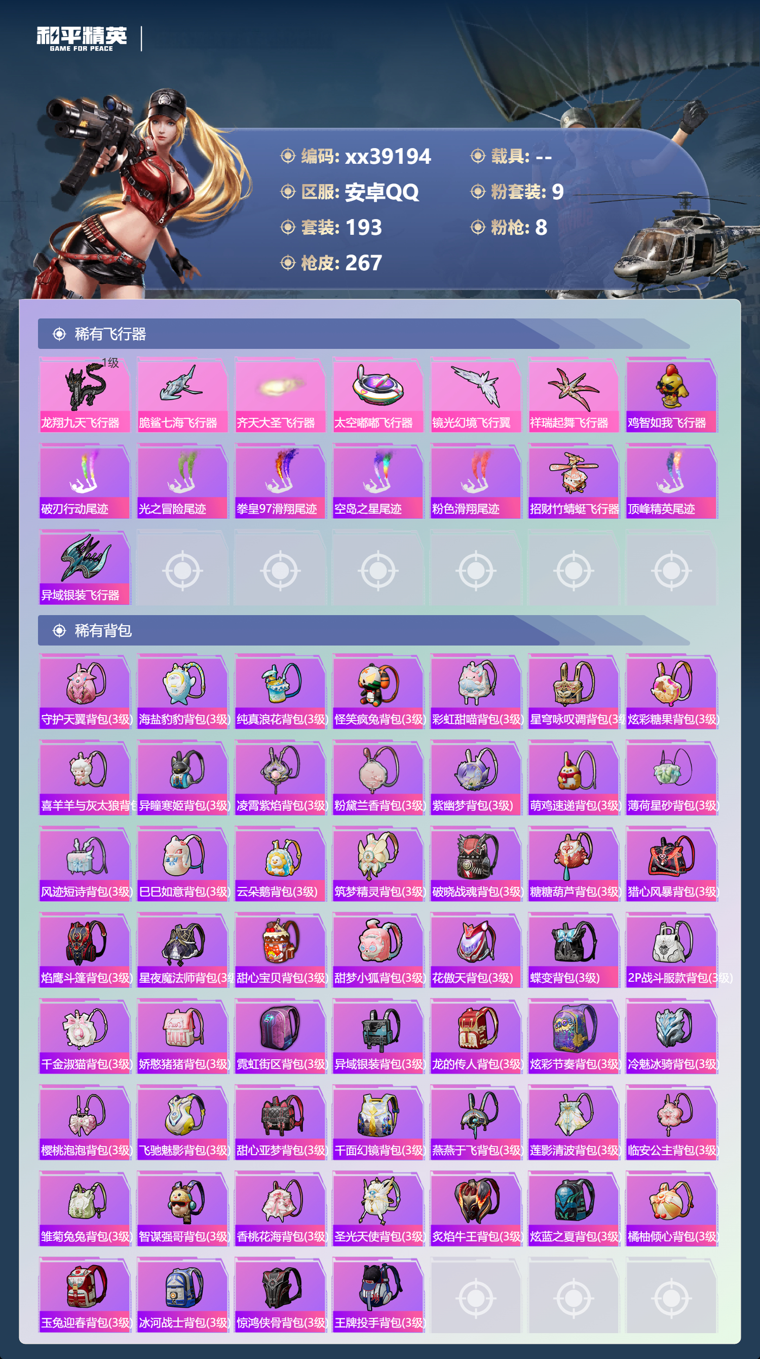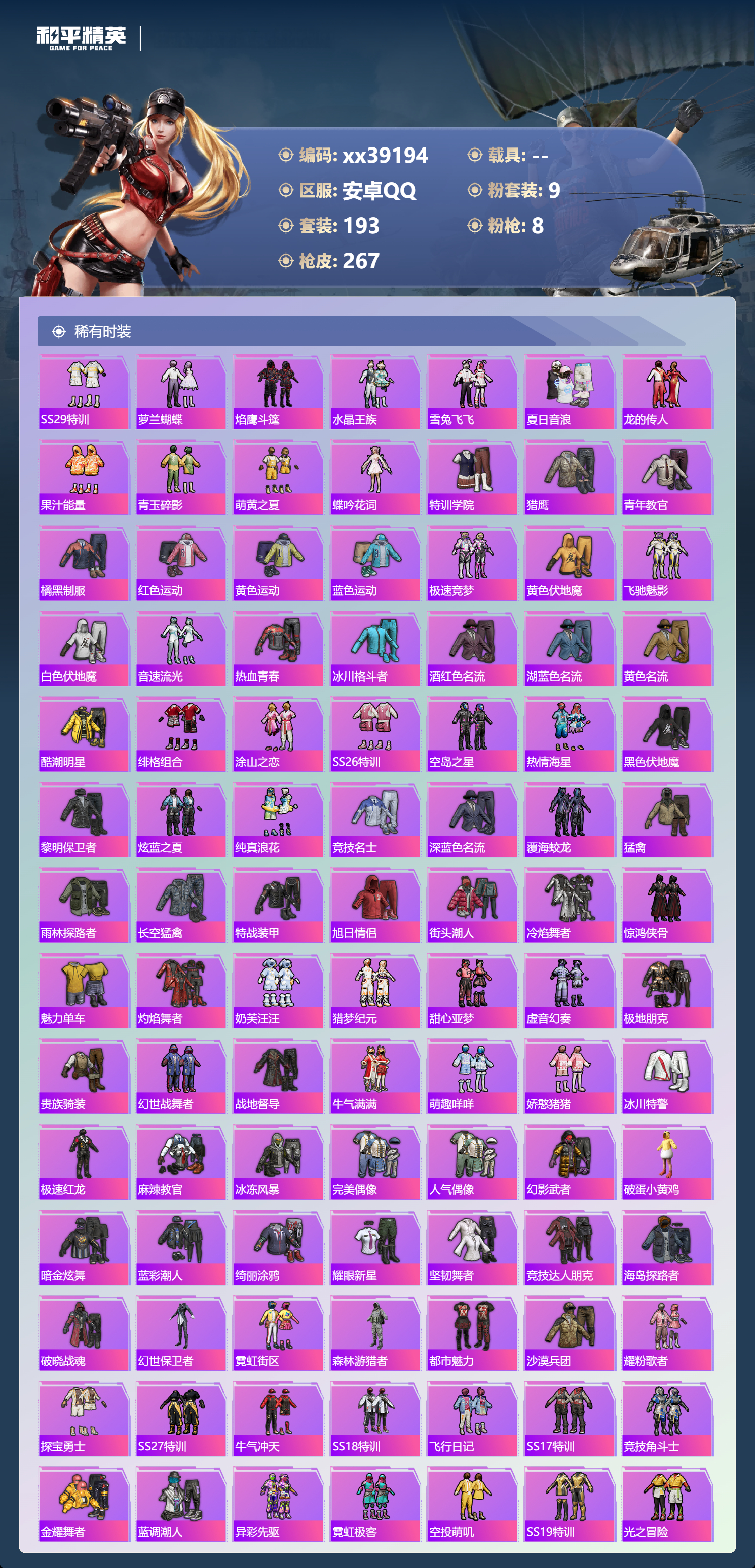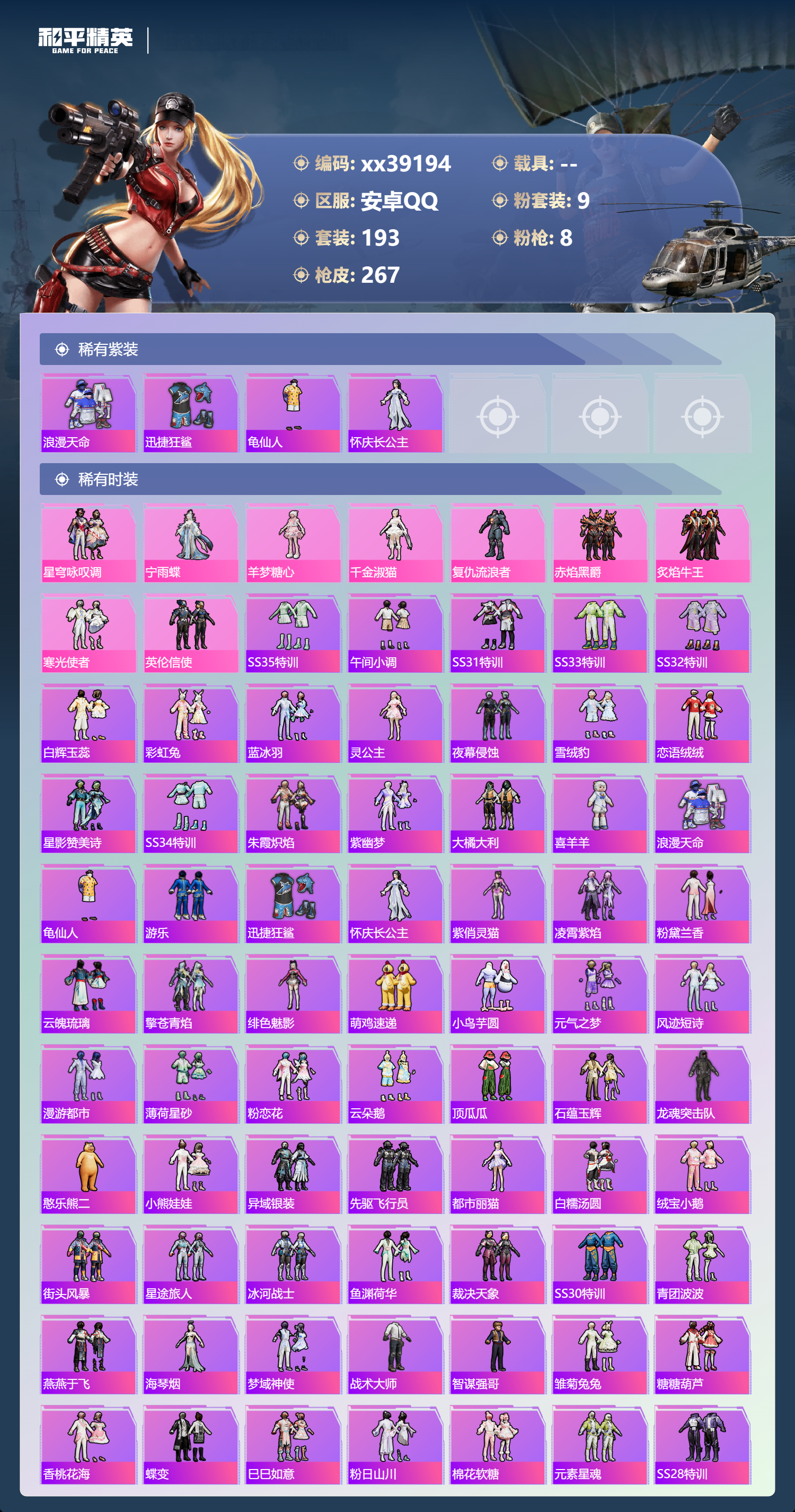 _2263890-不包人脸安卓手q-15王牌印记-9粉装-8特效呛-83669热力值-193套装-267呛皮-4卓越印记-1传奇印记 【9粉装】套装-赤焰黑爵角色-宁雨蝶角色-羊梦糖心套装-星穹咏叹调套装-炙焰牛王套装-寒光使者角色-复仇流浪者套装-英伦信使角色-千金淑猫 【8特效呛】svd-月影灵韵/7级groza-镜光银凌/5级mk14-甜梦熊击/5级kar98k-巳巳如意/5级m762-青锋波束/5级mg-36-沧焰双生/5级dp-28-豹影疾电/5级aug-暖羊咩咩/5级 【4稀有紫装】浪漫天命迅捷狂鲨龟仙人怀庆长公主 【193稀有时装】星穹咏叹调宁雨蝶羊梦糖心ss35特训午间小调ss31特训ss33特训ss32特训白辉玉蕊彩虹兔蓝冰羽灵公主夜幕侵蚀雪绒豹恋语绒绒星影赞美诗ss34特训朱霞炽焰紫幽梦大橘大利喜羊羊浪漫天命龟仙人游乐迅捷狂鲨怀庆长公主紫俏灵猫凌霄紫焰粉黛兰香云魄琉璃擎苍青焰绯色魅影萌鸡速递小鸟芋圆元气之梦风迹短诗漫游都市薄荷星砂粉恋花云朵鹅顶瓜瓜千金淑猫复仇流浪者赤焰黑爵炙焰牛王寒光使者英伦信使石蕴玉辉龙魂突击队憨乐熊二小熊娃娃异域银装先驱飞行员都市丽猫白糯汤圆绒宝小鹅街头风暴星途旅人冰河战士鱼渊荷华裁决天象ss30特训青团波波燕燕于飞海琴烟梦域神使战术大师智谋强哥雏菊兔兔糖糖葫芦香桃花海蝶变巳巳如意粉日山川棉花软糖元素星魂ss28特训ss29特训萝兰蝴蝶焰鹰斗篷水晶王族雪兔飞飞夏日音浪龙的传人果汁能量青玉碎影萌黄之夏蝶吟花词特训学院猎鹰青年教官橘黑制服红色运动黄色运动蓝色运动极速竞梦黄色伏地魔飞驰魅影白色伏地魔音速流光热血青春冰川格斗者酒红色名流湖蓝色名流黄色名流酷潮明星绯格组合涂山之恋ss26特训空岛之星热情海星黑色伏地魔黎明保卫者炫蓝之夏纯真浪花竞技名士深蓝色名流覆海蛟龙猛禽雨林探路者长空猛禽特战装甲旭日情侣街头潮人冷焰舞者惊鸿侠骨魅力单车灼焰舞者奶芙汪汪猎梦纪元甜心亚梦虚音幻奏极地朋克贵族骑装幻世战舞者战地督导牛气满满萌趣咩咩娇憨猪猪冰川特警极速红龙麻辣教官冰冻风暴完美偶像人气偶像幻影武者破蛋小黄鸡暗金炫舞蓝彩潮人绮丽涂鸦耀眼新星坚韧舞者竞技达人朋克海岛探路者破晓战魂幻世保卫者霓虹街区森林游猎者都市魅力沙漠兵团耀粉歌者探宝勇士ss27特训牛气冲天ss18特训飞行日记ss17特训竞技角斗士金耀舞者蓝调潮人异彩先驱霓虹极客空投萌叽ss19特训光之冒险ss20特训ss21特训玉兔迎春弄潮海豚ss22特训ss23特训呆萌铁蟹缤纷果语滨海厨神格斗先锋幻羽潜行老实芭蕉王牌教练荣耀ss24特训鹤鸣ss25特训锦衣飞扬 【267稀有呛械】q-纯真浪花awm-纯真浪花汤姆逊-纯真浪花dbs-乌木金纹aa12-g-纯真浪花平底锅-纯真浪花scar-l-海盐豹豹groza-海盐豹豹mg-36-沧焰双生/5级m762-青锋波束/5级aug-暖羊咩咩/5级groza-镜光银凌/5级svd-月影灵韵/7级mk14-甜梦熊击/5级kar98k-巳巳如意/5级dp-28-豹影疾电/5级野牛-雏菊兔兔mk14-冰河战士平底锅-雏菊兔兔m762-雏菊兔兔mini14-雏菊兔兔famas-突变脉冲短管霰弹-宇宙意志vect-突变脉冲r1895-雏菊兔兔平底锅-魔法神域撬棍-突变脉冲uzi-冰河战士m16a4-冰河战士mk20-h-乌木金纹dbs-风迹短诗莫辛纳甘-风迹短诗mini14-鸡智如我m416-错位像素akm-绿洲时空win94-乌木金纹mk12-风迹短诗野牛-魔童闹海敖闰aks-74u-极光猎影pkm-紫幽梦vect-百变魔方mg3-霓彩脉冲dbs-幻彩电音qbu-夜幕侵蚀mk14-紫幽梦蜜獾-乌木金纹m762-云朵鹅s1897-紫幽梦svd-云朵鹅p92-紫幽梦awm-绿洲时空汤姆逊-错位像素m417-玩趣呆呆铝热弹-炫彩糖果mini14-绯穹魔姬蜜獾-折梦之诗mk47-风迹短诗js9-凌霄紫焰mg-36-凌霄紫焰平底锅-紫幽梦破片手留单-海盐豹豹ump45-海盐豹豹平底锅-宁雨蝶arx-凌霄紫焰aks-74u-乌木金纹akm-涂鸦街区平底锅-圣斗士星矢蜜獾-风迹短诗p92-凌霄紫焰scar-l-乐游熊熊famas-乌木金纹famas-霓彩脉冲spas-12-云朵鹅m249-无面战甲破片手留单-拽到爆炸ump45-夜幕侵蚀s1897-糯团青竹平底锅-无垠阁平底锅-凌霄紫焰mk14-薄荷星砂aks-74u-鸡智如我沙墨之鹦-云朵鹅tmp-9-雪月幻音盐雾蛋-冰氧夏日大砍刀-云朵鹅pkm-啾咪啾咪slr-圣穹绘梦svd-霓彩脉冲slr-霓彩脉冲平底锅-属我最6m762-墨金战记scar-l-彩虹符号蝎式手呛-六号稻草人s12k-霓彩脉冲akm-霓彩脉冲m416-红色方程式m416-蓝色火焰m416-糯团青竹m416-绯红前夜akm-影袭akm-彩虹符号akm-缤纷海域akm-破晓战魂akm-龙的传人akm-灼热熔岩akm-虎虎生威akm-恐龙拽拽akm-霓虹街区scar-l-红色方程式scar-l-玉兔迎春scar-l-夜灯scar-l-炫彩节奏m16a4-红色方程式m16a4-蓝色火焰m16a4-幻世战舞者m16a4-甜心亚梦groza-异彩先驱groza-紫翼圣骑groza-彩虹符号aug-耀粉歌者aug-圣光天使q-飞驰魅影q-彩虹符号m762-彩虹符号m762-绯红前夜m762-橘柚倾心m762-天降萌叽m762-萌物绒绒mk47-乌木金纹mk47-炫光之旅g36c-镜域双华g36c-乌木金纹ac-val-天降萌叽ac-val-甜心亚梦ac-val-乌木金纹蜜獾-天降萌叽蜜獾-娇憨猪猪kar98k-红色方程式kar98k-飞驰魅影kar98k-彩虹符号kar98k-炫彩节奏m24-乌木金纹m24-影袭m24-奇异狩猎者m24-炫彩节奏awm-焰鹰斗篷awm-庄周梦蝶莫辛纳甘-乌木金纹amr-乌木金纹m200-惊鸿侠骨sks-幻梦音符sks-迅猛狂鲨vss-彩虹符号mini14-筑梦精灵mini14-耀粉歌者mini14-炫彩节奏mini14-涂山之恋mini14-异彩先驱mini14-穿刺龙虾mini14-春暖花开mk14-童趣迷兔mk14-乌木金纹slr-彩虹符号slr-娇憨猪猪m417-惊鸿侠骨uzi-红色方程式uzi-娇憨猪猪uzi-啾咪啾咪ump45-繁龙极客ump45-涂山之恋ump45-蓝色