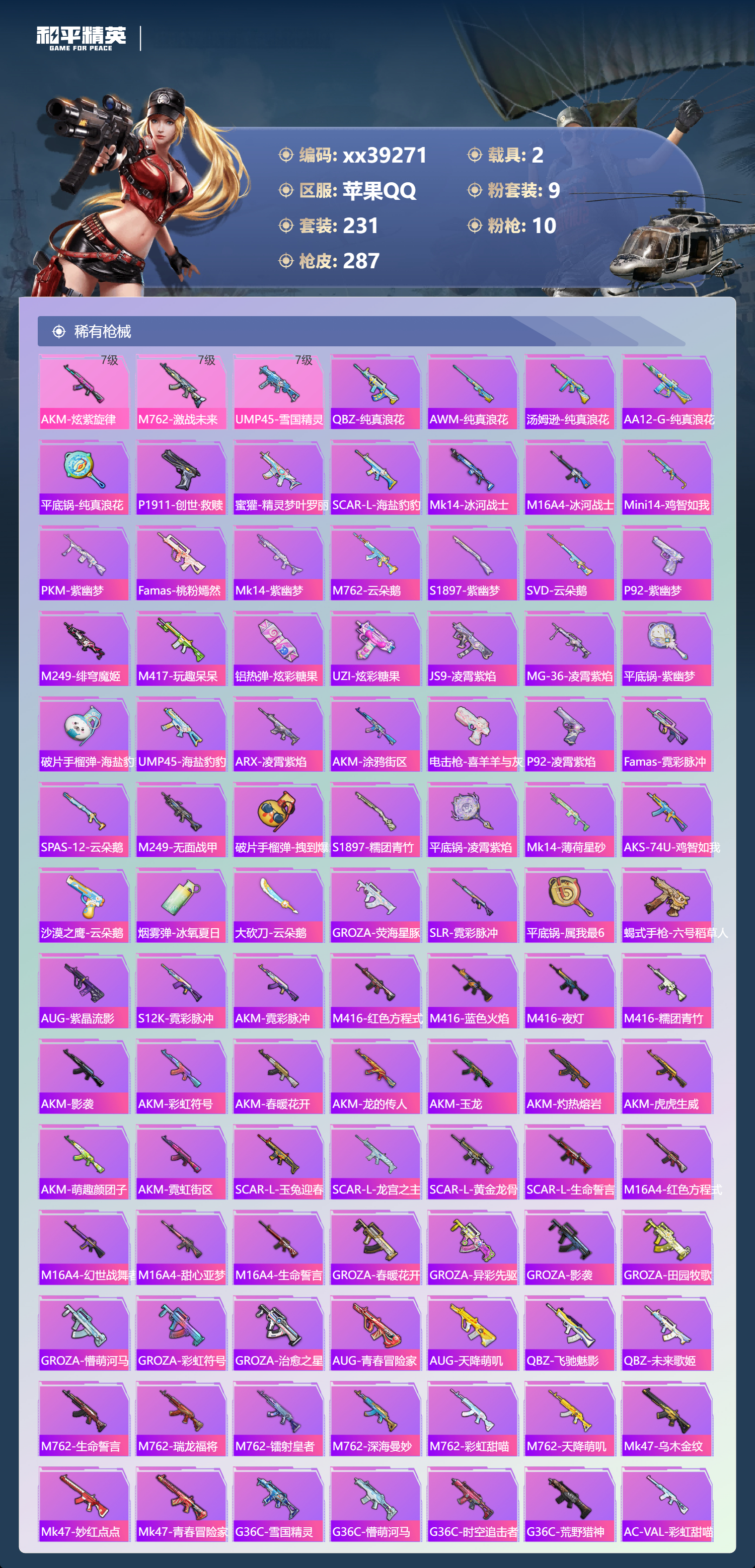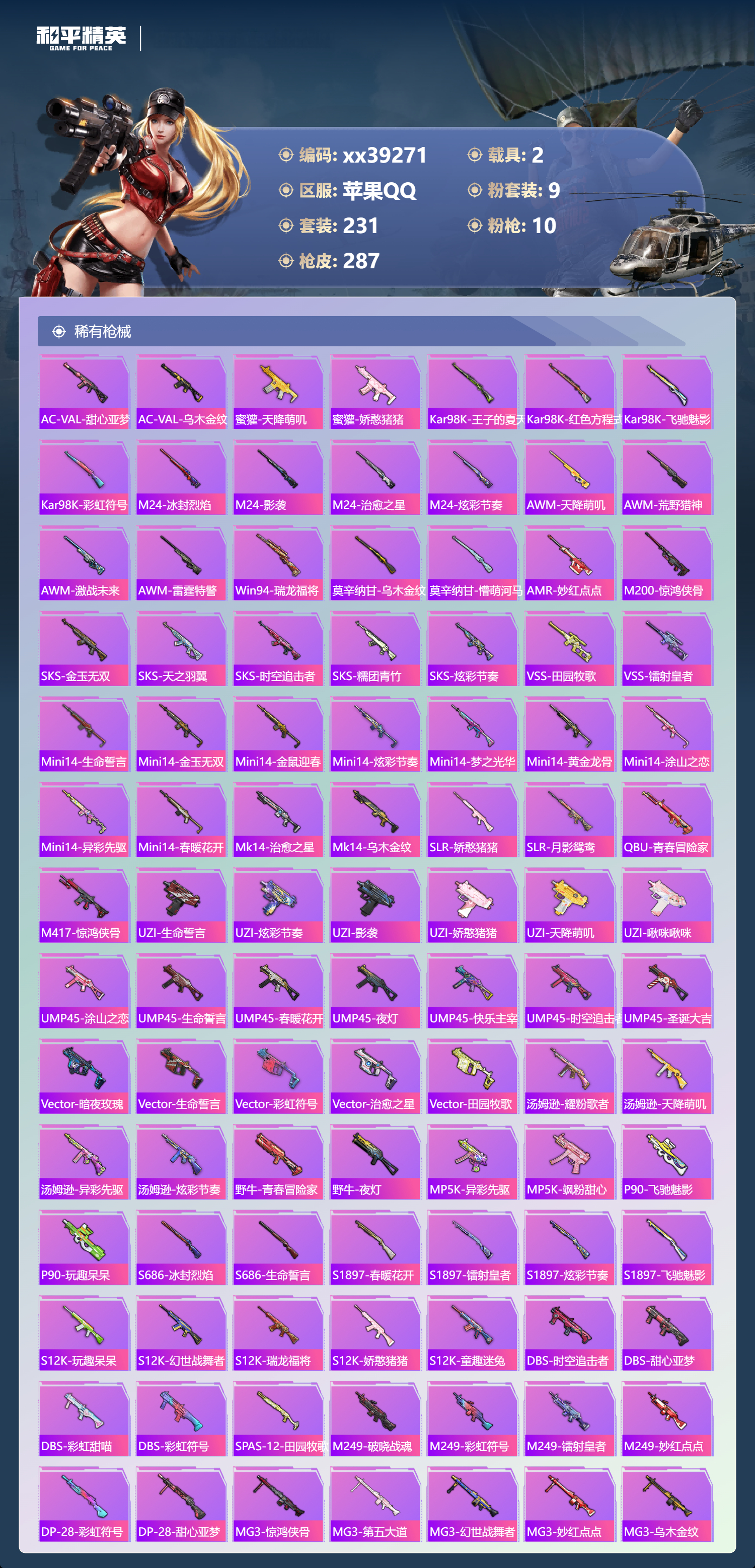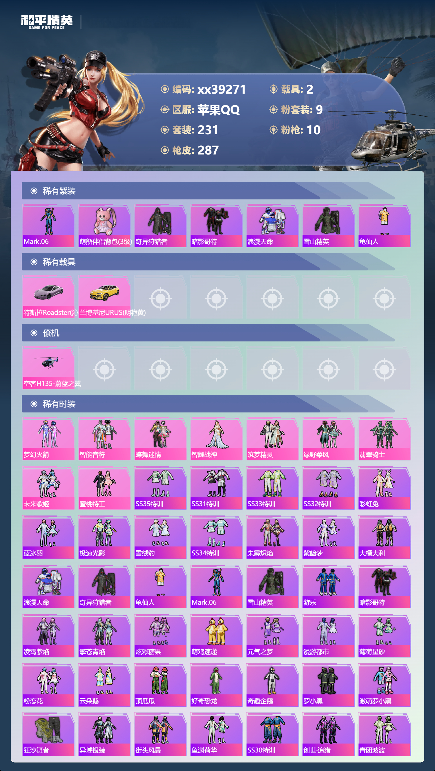 _2264962-可二次苹果手q-20王牌印记-9粉装-10特效呛-2载具-97036热力值-231套装-287呛皮-4卓越印记-1传奇印记 【9粉装】套装-梦幻火箭套装-未来歌姬套装-蜜桃特工套装-智能音符套装-绿野柔风套装-筑梦精灵角色-智耀战神套装-蝶舞迷情套装-翡翠骑士 【10特效呛】m762-激战未来/7级kar98k-巳巳如意/5级aug-暖羊咩咩/5级dp-28-豹影疾电/5级mk14-甜梦熊击/5级groza-镜光银凌/5级m416-心之恋语/7级akm-炫紫旋律/7级m416-五爪金龙/1级ump45-雪国精灵/7级 【7稀有紫装】mark.06萌熊伴侣背包3级奇异狩猎者暗影哥特浪漫天命雪山精英龟仙人 【2稀有载具】特斯拉roadster沁心粉兰博基尼urus明艳黄 【1僚机】空客h135-蔚蓝之翼 【230稀有时装】梦幻火箭智能音符蝶舞迷情智耀战神ss35特训ss31特训ss33特训ss32特训彩虹兔蓝冰羽极速光影雪绒豹ss34特训朱霞炽焰紫幽梦大橘大利浪漫天命奇异狩猎者龟仙人mark.06雪山精英游乐暗影哥特凌霄紫焰擎苍青焰萌鸡速递元气之梦漫游都市薄荷星砂粉恋花云朵鹅顶瓜瓜筑梦精灵绿野柔风翡翠骑士未来歌姬蜜桃特工好奇恐龙奇趣企鹅罗小黑激萌罗小黑狂沙舞者异域银装街头风暴鱼渊荷华ss30特训创世·追猎青团波波燕燕于飞海琴烟战术大师智谋强哥糖糖葫芦蝶变巳巳如意曼妙人鱼棉花软糖ss28特训ss29特训ss5特训ss16特训华灯初上暴风机械师时空追击者暗夜傀儡红酒骑士智慧隐士醒狮腾龙福星高照虎虎生威吉莉夏日音浪龙的传人ss8特训白熊同盟青玉碎影萌黄之夏隐空刺恶魔宝贝黄色运动飞驰魅影白色伏地魔音速流光活力之心ss9特训酒红色名流湖蓝色名流黄色名流绯格组合涂山之恋抹茶蜜豆ss26特训野性山猫沙漠雄狮漫步者空岛之星热情海星黎明保卫者炫蓝之夏纯真浪花骑行爱好者竞技名士深蓝色名流长空猛禽竞技勇士朋克特战装甲战地菁英旭日情侣灰色格斗者甜蜜告白冷焰舞者惊鸿侠骨魅力单车灼焰舞者雪山征服者夜莺强袭者水银刺客丛林猎人甜心亚梦ss2特训虚音幻奏战地英姿幻世战舞者半糖蓝莓青涩时光青春校园牛气满满萌趣咩咩娇憨猪猪春日漫步龙腾端午滨海假日沙漠毒蛇麻辣教官鹰眼刺客苍穹猎鹰ss3特训冰冻风暴冷酷挑战者完美偶像ss11特训人气偶像ss4特训幻影武者俏皮奶喵青春冒险家潮流游乐家疯狂小兔子摇滚舞王圣诞大吉特战英豪熔岩使者凛冬战士暗金炫舞北国孤狼ss6特训绮丽涂鸦坚韧舞者竞技达人朋克淡雅花蕊野性战心玲珑飞花跃动心情ss7特训霓虹街区森林游猎者田园牧歌都市魅力萌趣颜团子轻风白浪ss10特训特种颜团子沙漠兵团镭射皇者耀粉歌者探宝勇士ss27特训牛气冲天ss18特训治愈之星银白舞王科技之星ss13特训飞行日记ss17特训瑞龙福将团圆交子缤纷焰火异彩先驱霓虹极客向日葵先生空投萌叽ss19特训光之冒险ss20特训血色贵族ss21特训玉兔迎春ss22特训ss23特训夏日倾情飞狐塔尔斯甜蜜熊情侣缤纷果语滨海厨神闪银刀客莱茵河畔ss14特训天籁歌者星河浪客神气柴柴灵蜜圈圈欧布奥特曼妙红点点幻彩翩翩格斗先锋海盐绵绵冰老实芭蕉吉莉礼服刚毅裁决者ss1特训王牌教练荣耀暗夜之虎柠萌假日ss24特训懵萌河马ss25特训快乐星愿锦衣飞扬ss15特训 【287稀有呛械】m416-心之恋语/7级q-纯真浪花awm-纯真浪花汤姆逊-纯真浪花dbs-乌木金纹aa12-g-纯真浪花平底锅-纯真浪花p1911-创世·救赎蜜獾-精灵梦叶罗丽scar-l-海盐豹豹aug-暖羊咩咩/5级groza-镜光银凌/5级mk14-甜梦熊击/5级kar98k-巳巳如意/5级dp-28-豹影疾电/5级mk14-冰河战士m16a4-冰河战士mk20-h-乌木金纹m416-五爪金龙/1级akm-炫紫旋律/7级m762-激战未来/7级ump45-雪国精灵/7级mini14-鸡智如我win94-乌木金纹pkm-紫幽梦famas-桃粉嫣然mk14-紫幽梦蜜獾-乌木金纹m762-云朵鹅s1897-紫幽梦svd-云朵鹅p92-紫幽梦m249-绯穹魔姬m417-玩趣呆呆铝热弹-炫彩糖果uzi-炫彩糖果js9-凌霄紫焰mg-36-凌霄紫焰平底锅-紫幽梦破片手留单-海盐豹豹ump45-海盐豹豹arx-凌霄紫焰aks-74u-乌木金纹akm-涂鸦街区电击呛-喜羊羊与灰太狼p92-凌霄紫焰famas-乌木金纹famas-霓彩脉冲spas-12-云朵鹅m249-无面战甲破片手留单-拽到爆炸s1897-糯团青竹平底锅-凌霄紫焰mk14-薄荷星砂aks-74u-鸡智如我沙墨之鹦-云朵鹅盐雾蛋-冰氧夏日大砍刀-云朵鹅groza-荧海星豚slr-霓彩脉冲平底锅-属我最6蝎式手呛-六号稻草人aug-紫晶流影s12k-霓彩脉冲akm-霓彩脉冲m416-红色方程式m416-乌木金纹m416-蓝色火焰m416-夜灯m416-糯团青竹akm-影袭akm-乌木金纹akm-彩虹符号akm-春暖花开akm-龙的传人akm-玉龙akm-灼热熔岩akm-虎虎生威akm-萌趣颜团子akm-霓虹街区scar-l-玉兔迎春scar-l-乌木金纹scar-l-龙宫之主scar-l-黄金龙骨scar-l-生命誓言m16a4-红色方程式m16a4-幻世战舞者m16a4-甜心亚梦m16a4-乌木金纹m16a4-生命誓言groza-乌木金纹groza-春暖花开groza-异彩先驱groza-影袭groza-田园牧歌groza-懵萌河马groza-彩虹符号groza-治愈之星aug-乌木金纹aug-青春冒险家aug-天降萌叽q-飞驰魅影q-乌木金纹q-未来歌姬m762-生命誓言m762-瑞龙福将m762-镭射皇者m762-乌木金纹m762-深海曼妙m762-彩虹甜喵m762-天降萌叽mk47-乌木金纹mk47-妙红点点mk47-青春冒险家g36c-乌木金纹g36c-雪国精灵g36c-懵萌河马g36c-时空追击者g36c-荒野猎神ac-val-彩虹甜喵ac-val-甜心亚梦ac-val-乌木金纹蜜獾-天降萌叽蜜獾-娇憨猪猪kar98k-乌木金纹kar98k-王子的夏天kar98k-红色方程式kar98k-飞驰魅影kar98k-彩虹符号m24-冰封烈焰m24-乌木金纹m24-影袭m24-治愈之星m24-炫彩节奏awm-天降萌叽awm-乌