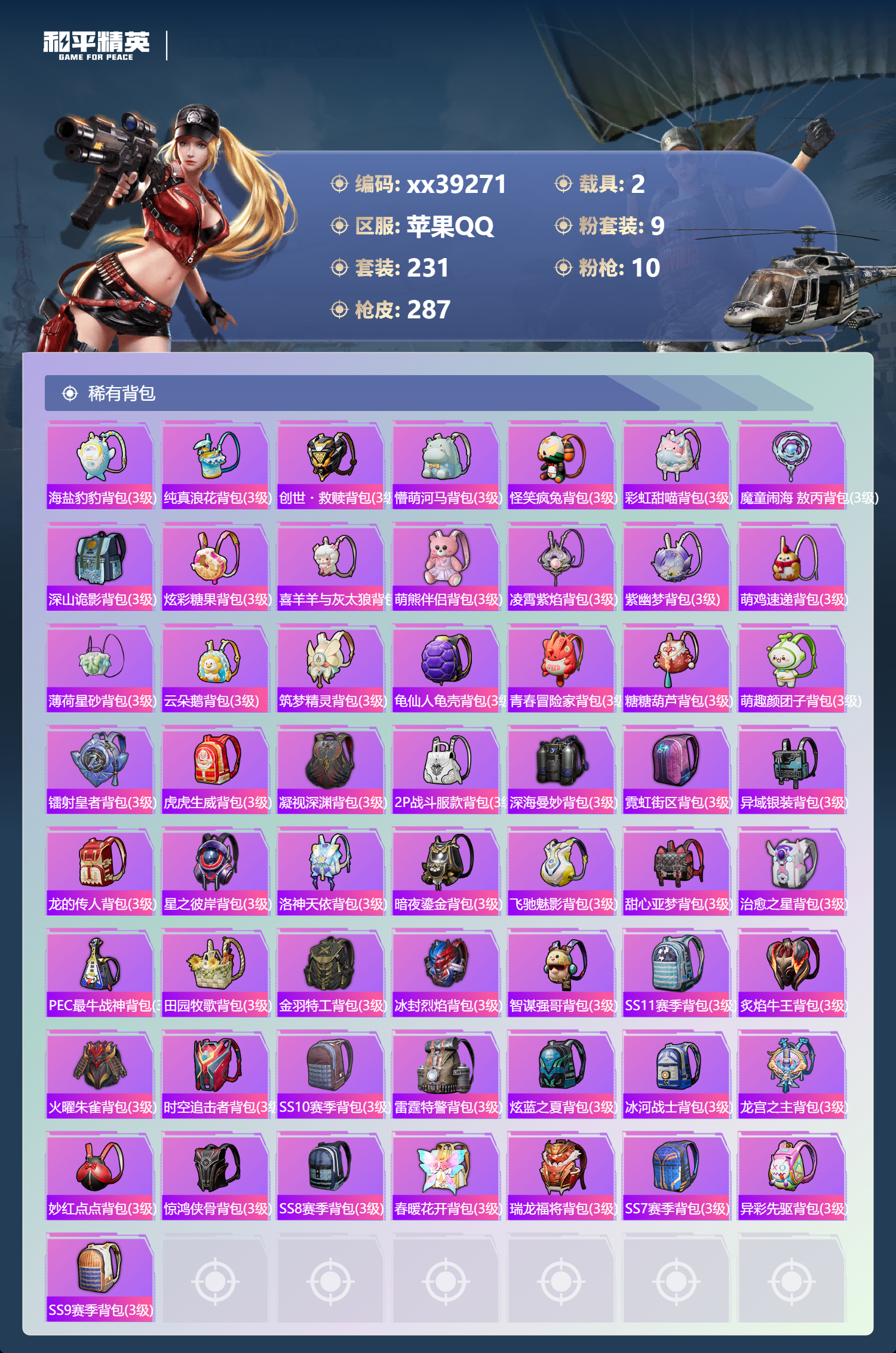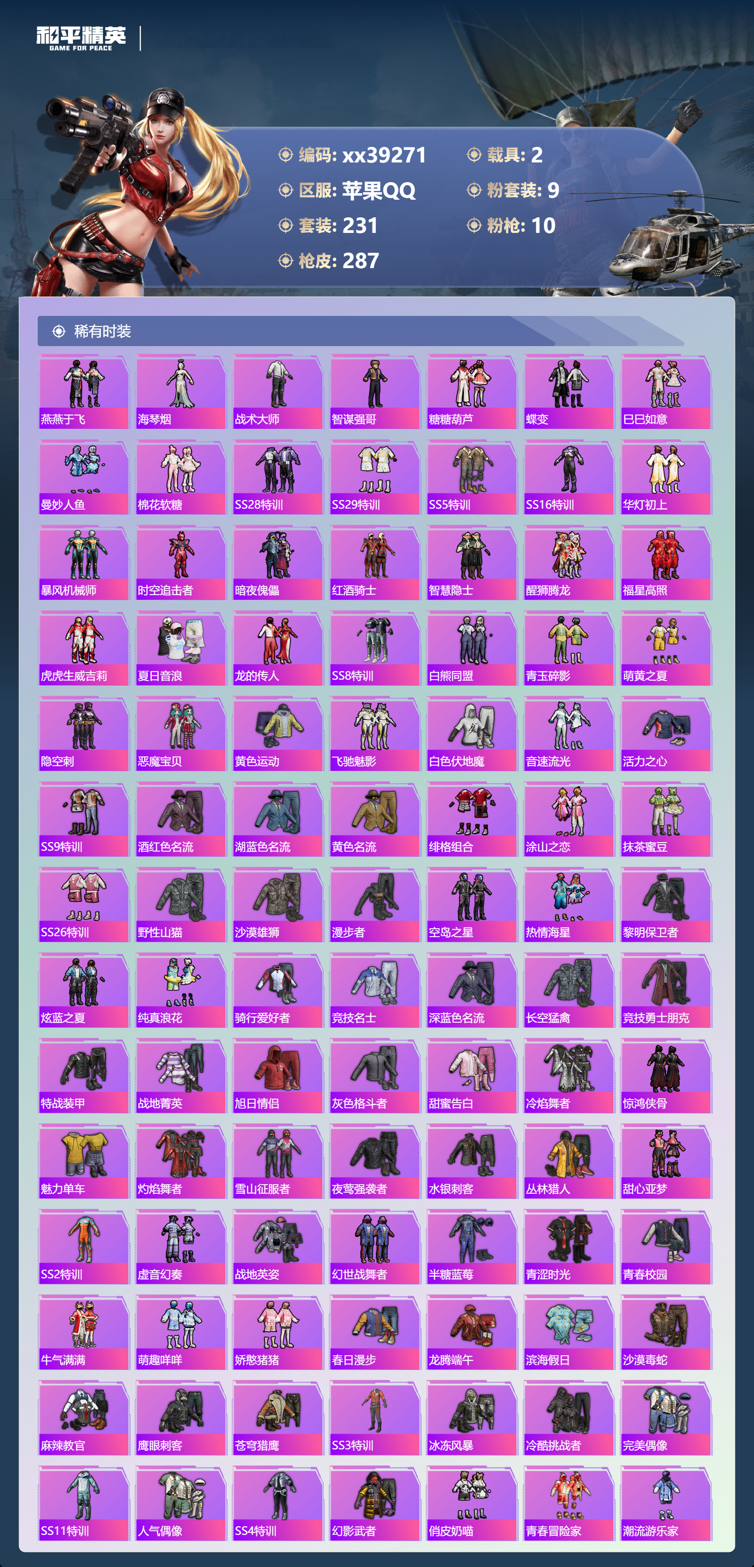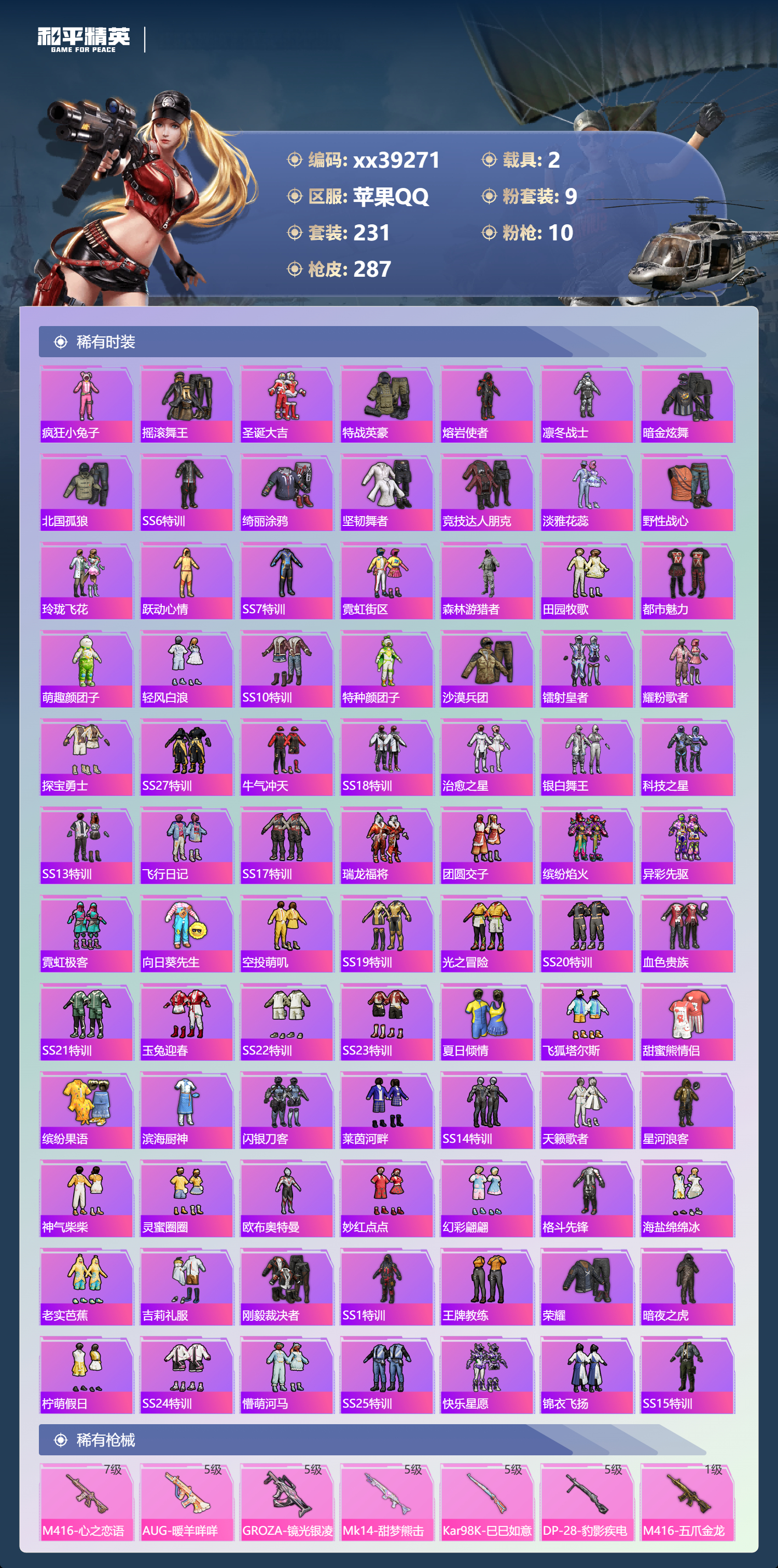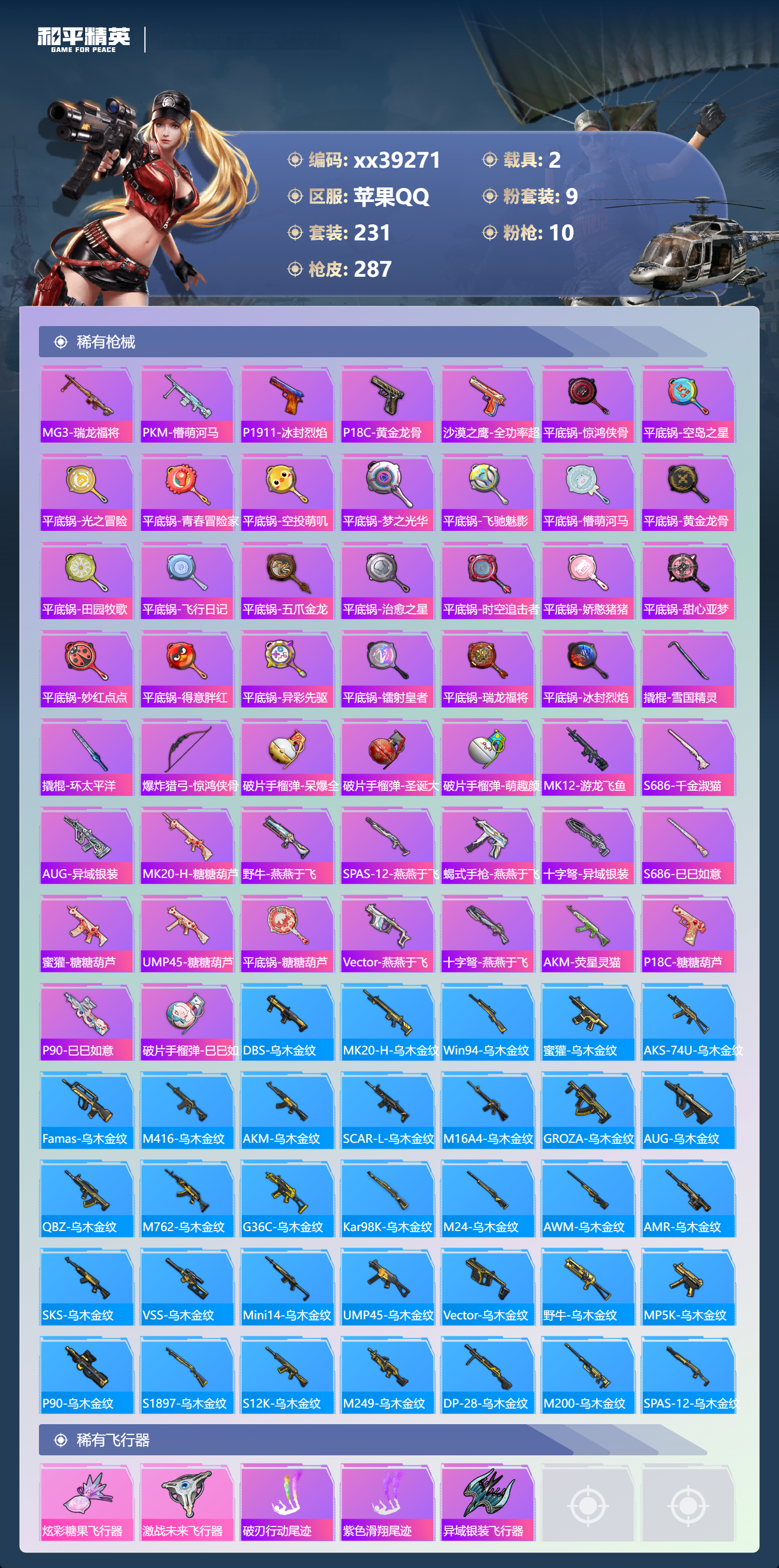 _2264962-可二次苹果手q-20王牌印记-9粉装-10特效呛-2载具-97036热力值-231套装-287呛皮-4卓越印记-1传奇印记 【9粉装】套装-梦幻火箭套装-未来歌姬套装-蜜桃特工套装-智能音符套装-绿野柔风套装-筑梦精灵角色-智耀战神套装-蝶舞迷情套装-翡翠骑士 【10特效呛】m762-激战未来/7级kar98k-巳巳如意/5级aug-暖羊咩咩/5级dp-28-豹影疾电/5级mk14-甜梦熊击/5级groza-镜光银凌/5级m416-心之恋语/7级akm-炫紫旋律/7级m416-五爪金龙/1级ump45-雪国精灵/7级 【7稀有紫装】mark.06萌熊伴侣背包3级奇异狩猎者暗影哥特浪漫天命雪山精英龟仙人 【2稀有载具】特斯拉roadster沁心粉兰博基尼urus明艳黄 【1僚机】空客h135-蔚蓝之翼 【230稀有时装】梦幻火箭智能音符蝶舞迷情智耀战神ss35特训ss31特训ss33特训ss32特训彩虹兔蓝冰羽极速光影雪绒豹ss34特训朱霞炽焰紫幽梦大橘大利浪漫天命奇异狩猎者龟仙人mark.06雪山精英游乐暗影哥特凌霄紫焰擎苍青焰萌鸡速递元气之梦漫游都市薄荷星砂粉恋花云朵鹅顶瓜瓜筑梦精灵绿野柔风翡翠骑士未来歌姬蜜桃特工好奇恐龙奇趣企鹅罗小黑激萌罗小黑狂沙舞者异域银装街头风暴鱼渊荷华ss30特训创世·追猎青团波波燕燕于飞海琴烟战术大师智谋强哥糖糖葫芦蝶变巳巳如意曼妙人鱼棉花软糖ss28特训ss29特训ss5特训ss16特训华灯初上暴风机械师时空追击者暗夜傀儡红酒骑士智慧隐士醒狮腾龙福星高照虎虎生威吉莉夏日音浪龙的传人ss8特训白熊同盟青玉碎影萌黄之夏隐空刺恶魔宝贝黄色运动飞驰魅影白色伏地魔音速流光活力之心ss9特训酒红色名流湖蓝色名流黄色名流绯格组合涂山之恋抹茶蜜豆ss26特训野性山猫沙漠雄狮漫步者空岛之星热情海星黎明保卫者炫蓝之夏纯真浪花骑行爱好者竞技名士深蓝色名流长空猛禽竞技勇士朋克特战装甲战地菁英旭日情侣灰色格斗者甜蜜告白冷焰舞者惊鸿侠骨魅力单车灼焰舞者雪山征服者夜莺强袭者水银刺客丛林猎人甜心亚梦ss2特训虚音幻奏战地英姿幻世战舞者半糖蓝莓青涩时光青春校园牛气满满萌趣咩咩娇憨猪猪春日漫步龙腾端午滨海假日沙漠毒蛇麻辣教官鹰眼刺客苍穹猎鹰ss3特训冰冻风暴冷酷挑战者完美偶像ss11特训人气偶像ss4特训幻影武者俏皮奶喵青春冒险家潮流游乐家疯狂小兔子摇滚舞王圣诞大吉特战英豪熔岩使者凛冬战士暗金炫舞北国孤狼ss6特训绮丽涂鸦坚韧舞者竞技达人朋克淡雅花蕊野性战心玲珑飞花跃动心情ss7特训霓虹街区森林游猎者田园牧歌都市魅力萌趣颜团子轻风白浪ss10特训特种颜团子沙漠兵团镭射皇者耀粉歌者探宝勇士ss27特训牛气冲天ss18特训治愈之星银白舞王科技之星ss13特训飞行日记ss17特训瑞龙福将团圆交子缤纷焰火异彩先驱霓虹极客向日葵先生空投萌叽ss19特训光之冒险ss20特训血色贵族ss21特训玉兔迎春ss22特训ss23特训夏日倾情飞狐塔尔斯甜蜜熊情侣缤纷果语滨海厨神闪银刀客莱茵河畔ss14特训天籁歌者星河浪客神气柴柴灵蜜圈圈欧布奥特曼妙红点点幻彩翩翩格斗先锋海盐绵绵冰老实芭蕉吉莉礼服刚毅裁决者ss1特训王牌教练荣耀暗夜之虎柠萌假日ss24特训懵萌河马ss25特训快乐星愿锦衣飞扬ss15特训 【287稀有呛械】m416-心之恋语/7级q-纯真浪花awm-纯真浪花汤姆逊-纯真浪花dbs-乌木金纹aa12-g-纯真浪花平底锅-纯真浪花p1911-创世·救赎蜜獾-精灵梦叶罗丽scar-l-海盐豹豹aug-暖羊咩咩/5级groza-镜光银凌/5级mk14-甜梦熊击/5级kar98k-巳巳如意/5级dp-28-豹影疾电/5级mk14-冰河战士m16a4-冰河战士mk20-h-乌木金纹m416-五爪金龙/1级akm-炫紫旋律/7级m762-激战未来/7级ump45-雪国精灵/7级mini14-鸡智如我win94-乌木金纹pkm-紫幽梦famas-桃粉嫣然mk14-紫幽梦蜜獾-乌木金纹m762-云朵鹅s1897-紫幽梦svd-云朵鹅p92-紫幽梦m249-绯穹魔姬m417-玩趣呆呆铝热弹-炫彩糖果uzi-炫彩糖果js9-凌霄紫焰mg-36-凌霄紫焰平底锅-紫幽梦破片手留单-海盐豹豹ump45-海盐豹豹arx-凌霄紫焰aks-74u-乌木金纹akm-涂鸦街区电击呛-喜羊羊与灰太狼p92-凌霄紫焰famas-乌木金纹famas-霓彩脉冲spas-12-云朵鹅m249-无面战甲破片手留单-拽到爆炸s1897-糯团青竹平底锅-凌霄紫焰mk14-薄荷星砂aks-74u-鸡智如我沙墨之鹦-云朵鹅盐雾蛋-冰氧夏日大砍刀-云朵鹅groza-荧海星豚slr-霓彩脉冲平底锅-属我最6蝎式手呛-六号稻草人aug-紫晶流影s12k-霓彩脉冲akm-霓彩脉冲m416-红色方程式m416-乌木金纹m416-蓝色火焰m416-夜灯m416-糯团青竹akm-影袭akm-乌木金纹akm-彩虹符号akm-春暖花开akm-龙的传人akm-玉龙akm-灼热熔岩akm-虎虎生威akm-萌趣颜团子akm-霓虹街区scar-l-玉兔迎春scar-l-乌木金纹scar-l-龙宫之主scar-l-黄金龙骨scar-l-生命誓言m16a4-红色方程式m16a4-幻世战舞者m16a4-甜心亚梦m16a4-乌木金纹m16a4-生命誓言groza-乌木金纹groza-春暖花开groza-异彩先驱groza-影袭groza-田园牧歌groza-懵萌河马groza-彩虹符号groza-治愈之星aug-乌木金纹aug-青春冒险家aug-天降萌叽q-飞驰魅影q-乌木金纹q-未来歌姬m762-生命誓言m762-瑞龙福将m762-镭射皇者m762-乌木金纹m762-深海曼妙m762-彩虹甜喵m762-天降萌叽mk47-乌木金纹mk47-妙红点点mk47-青春冒险家g36c-乌木金纹g36c-雪国精灵g36c-懵萌河马g36c-时空追击者g36c-荒野猎神ac-val-彩虹甜喵ac-val-甜心亚梦ac-val-乌木金纹蜜獾-天降萌叽蜜獾-娇憨猪猪kar98k-乌木金纹kar98k-王子的夏天kar98k-红色方程式kar98k-飞驰魅影kar98k-彩虹符号m24-冰封烈焰m24-乌木金纹m24-影袭m24-治愈之星m24-炫彩节奏awm-天降萌叽awm-乌