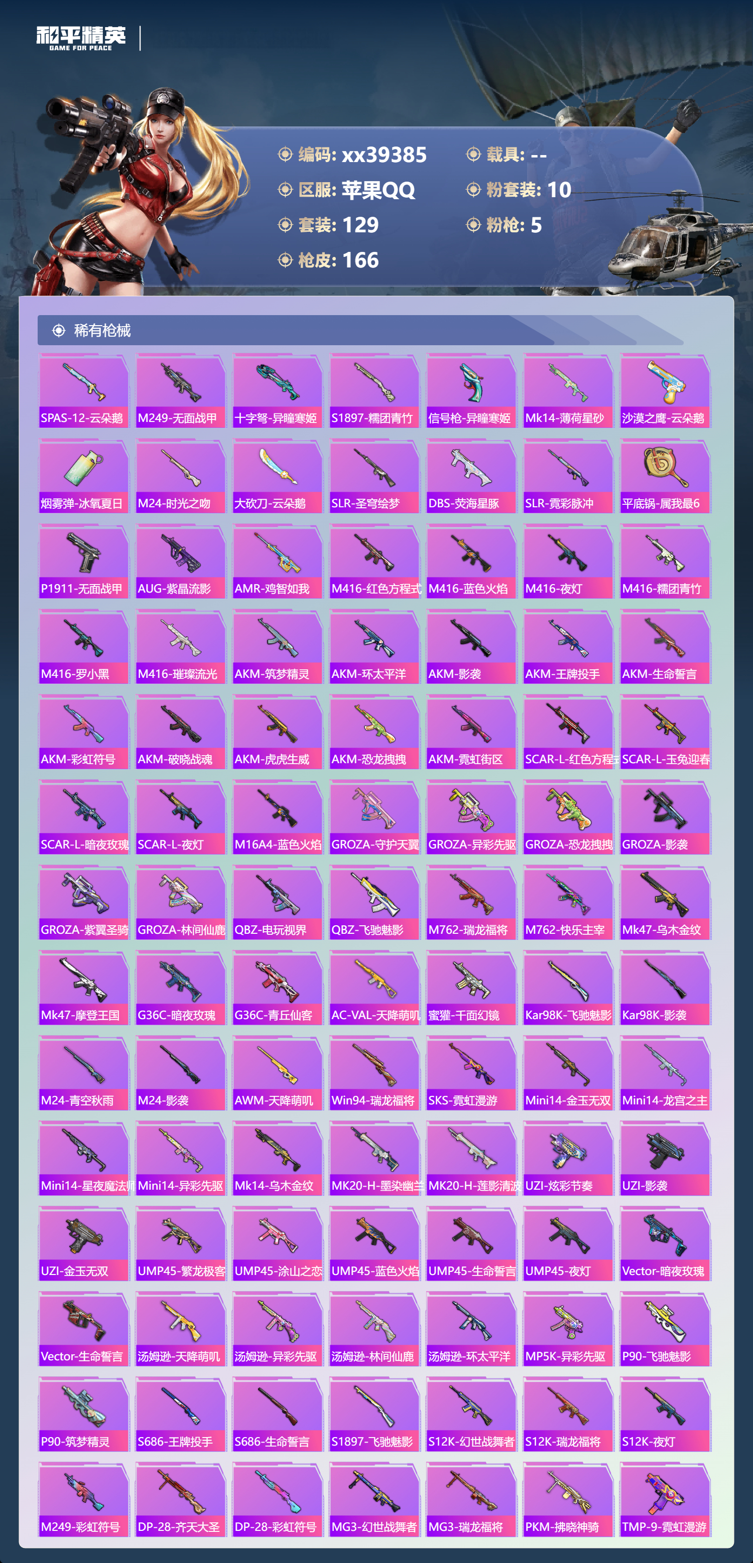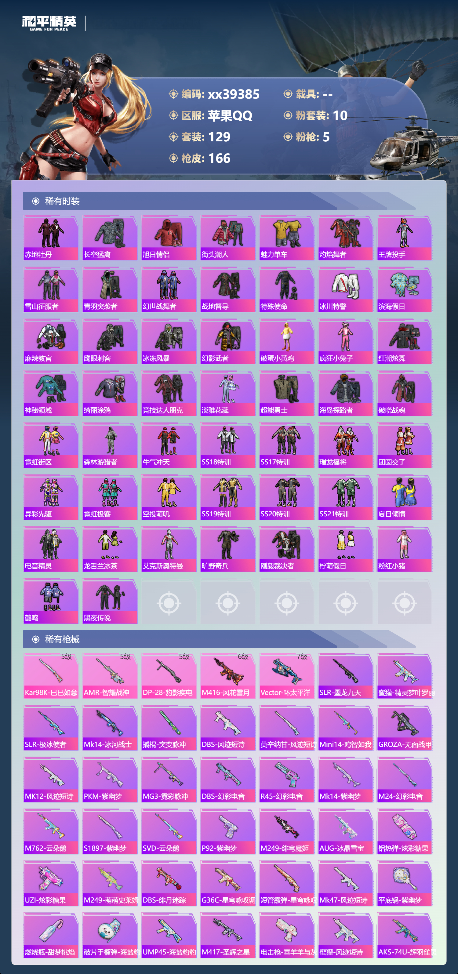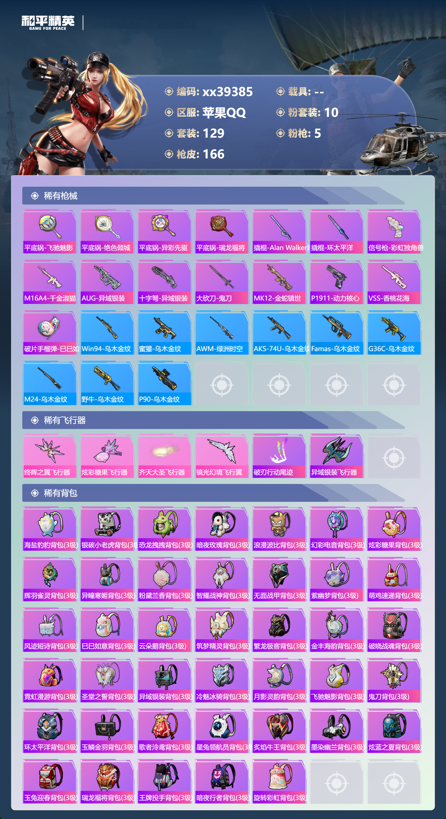 _2267678-不包人脸苹果手q-4王牌印记-10粉装-5特效呛-53248热力值-129套装-166呛皮 【10粉装】角色-冰炎战车套装-繁龙极客角色-复仇流浪者套装-紫电风暴套装-深渊皇后套装-蓝莓炮弹角色-异瞳寒姬套装-绚金战神角色-智耀战神套装-星穹咏叹调 【5特效呛】amr-智耀战神/5级kar98k-巳巳如意/5级dp-28-豹影疾电/5级m416-风花雪月/6级vect-环太平洋/7级 【6稀有紫装】都市猎人暗影哥特浪漫天命迅捷狂鲨真理款战斗服东方飞龙 【128稀有时装】繁龙极客绚金战神星穹咏叹调异瞳寒姬智耀战神ss35特训午间小调ss33特训ss32特训彩虹兔蓝冰羽极速光影霓虹热舞雪绒豹星渊小夜曲玫纹锢梦黯羽织刑星影赞美诗ss34特训紫幽梦大橘大利都市猎人浪漫天命游乐暗影哥特东方飞龙迅捷狂鲨真理款战斗服紫俏灵猫粉黛兰香冷霜之星无面战甲炫彩糖果绯色魅影萌鸡速递风迹短诗圣穹绘梦猎影月神薄荷星砂秘语星愿粉恋花云朵鹅虚空漩涡引力深渊顶瓜瓜z.i.b特工深渊皇后蓝莓炮弹复仇流浪者冰炎战车紫电风暴动感兔斯基人偶服狂战萌兔狂沙舞者净心行者异域银装风玲战术大师白光莹浴火魔神英勇保护者军械专家福星高照虎虎生威吉莉夏日音浪军刀雅典娜黄色运动浓情蜜辣飞驰魅影白色伏地魔音速流光酒红色名流黄色名流涂山之恋漫步者竞技名士覆海蛟龙赤地牡丹长空猛禽旭日情侣街头潮人魅力单车灼焰舞者王牌投手雪山征服者青羽突袭者幻世战舞者战地督导特殊使命冰川特警滨海假日麻辣教官鹰眼刺客冰冻风暴幻影武者破蛋小黄鸡疯狂小兔子红潮炫舞神秘领域绮丽涂鸦竞技达人朋克淡雅花蕊超能勇士海岛探路者破晓战魂霓虹街区森林游猎者牛气冲天ss18特训ss17特训瑞龙福将团圆交子异彩先驱霓虹极客空投萌叽ss19特训ss20特训ss21特训夏日倾情电音精灵龙舌兰冰茶艾克斯奥特曼旷野奇兵刚毅裁决者柠萌假日粉红小猪鹤鸣黑夜传说 【164稀有呛械】slr-墨龙九天蜜獾-精灵梦叶罗丽kar98k-巳巳如意/5级amr-智耀战神/5级dp-28-豹影疾电/5级slr-极冰使者mk14-冰河战士撬棍-突变脉冲m416-风花雪月/6级vect-环太平洋/7级dbs-风迹短诗莫辛纳甘-风迹短诗mini14-鸡智如我groza-无面战甲win94-乌木金纹mk12-风迹短诗pkm-紫幽梦mg3-霓彩脉冲dbs-幻彩电音r45-幻彩电音mk14-紫幽梦m24-幻彩电音蜜獾-乌木金纹m762-云朵鹅s1897-紫幽梦svd-云朵鹅p92-紫幽梦awm-绿洲时空m249-绯穹魔姬aug-冰晶雪宝铝热弹-炫彩糖果uzi-炫彩糖果m249-萌萌史莱姆dbs-绯月迷踪g36c-星穹咏叹调短管霰弹-星穹咏叹调mk47-风迹短诗平底锅-紫幽梦燃烧瓶-甜梦桃焰破片手留单-海盐豹豹ump45-海盐豹豹m417-圣辉之星aks-74u-乌木金纹电击呛-喜羊羊与灰太狼蜜獾-风迹短诗aks-74u-辉羽雀灵famas-乌木金纹spas-12-云朵鹅m249-无面战甲十子怒-异瞳寒姬s1897-糯团青竹信号呛-异瞳寒姬mk14-薄荷星砂沙墨之鹦-云朵鹅盐雾蛋-冰氧夏日m24-时光之吻大砍刀-云朵鹅slr-圣穹绘梦dbs-荧海星豚slr-霓彩脉冲平底锅-属我最6p1911-无面战甲aug-紫晶流影amr-鸡智如我m416-红色方程式m416-蓝色火焰m416-夜灯m416-糯团青竹m416-罗小黑m416-璀璨流光akm-筑梦精灵akm-环太平洋akm-影袭akm-王牌投手akm-生命誓言akm-彩虹符号akm-破晓战魂akm-虎虎生威akm-恐龙拽拽akm-霓虹街区scar-l-红色方程式scar-l-玉兔迎春scar-l-暗夜玫瑰scar-l-夜灯m16a4-蓝色火焰groza-守护天翼groza-异彩先驱groza-恐龙拽拽groza-影袭groza-紫翼圣骑groza-林间仙鹿q-电玩视界q-飞驰魅影m762-瑞龙福将m762-快乐主宰mk47-乌木金纹mk47-摩登王国g36c-乌木金纹g36c-暗夜玫瑰g36c-青丘仙客ac-val-天降萌叽蜜獾-千面幻镜kar98k-飞驰魅影kar98k-影袭m24-乌木金纹m24-青空秋雨m24-影袭awm-天降萌叽win94-瑞龙福将sks-霓虹漫游mini14-金玉无双mini14-龙宫之主mini14-星夜魔法师mini14-异彩先驱mk14-乌木金纹mk20-h-墨染幽兰mk20-h-莲影清波uzi-炫彩节奏uzi-影袭uzi-金玉无双ump45-繁龙极客ump45-涂山之恋ump45-蓝色火焰ump45-生命誓言ump45-夜灯vect-暗夜玫瑰vect-生命誓言汤姆逊-天降萌叽汤姆逊-异彩先驱汤姆逊-林间仙鹿汤姆逊-环太平洋野牛-乌木金纹mp5k-异彩先驱p90-乌木金纹p90-飞驰魅影p90-筑梦精灵s686-王牌投手s686-生命誓言s1897-飞驰魅影s12k-幻世战舞者s12k-瑞龙福将s12k-夜灯m249-彩虹符号dp-28-齐天大圣dp-28-彩虹符号mg3-幻世战舞者mg3-瑞龙福将pkm-拂晓神骑tmp-9-霓虹漫游平底锅-飞驰魅影平底锅-绝色倾城平底锅-异彩先驱平底锅-瑞龙福将撬棍-alanwalker潮音版撬棍-环太平洋信号呛-彩虹独角兽m16a4-千金淑猫aug-异域银装十子怒-异域银装大砍刀-鬼刀mk12-金蛇镇世p1911-动力核心vss-香桃花海破片手留单-巳巳如意 【6稀有飞行器】终晖之翼飞行器炫彩糖果飞行器破刃行动尾迹齐天大圣飞行器异域银装飞行器镜光幻境飞行翼 【40稀有背包】海盐豹豹背包3级银碳小老虎背包3级恐龙拽拽背包3级暗夜玫瑰背包3级浪漫波比背包3级幻彩电音背包3级炫彩糖果背包3级辉羽雀灵背包3级异瞳寒姬背包3级粉黛兰香背包3级智耀战神背包3级无面战甲背包3级紫幽梦背包3级萌鸡速递背包3级风迹短诗背包3级巳巳如意背包3级云朵鹅背包3级筑梦精灵背包3级繁龙极客背包3级金丰海韵背包3级破晓战魂背包3级霓虹漫游背包3级圣堂之誓背包3级异域银装背包3级冷魅冰骑背包3级月影灵韵背包3级飞驰魅影背包3级鬼刀背包3级环太平洋背包3级玉鳞金羽背包3级歌者泠鸢背包3级星兔领航员背包3级炙焰牛王背包3级墨染幽兰背包3级炫蓝