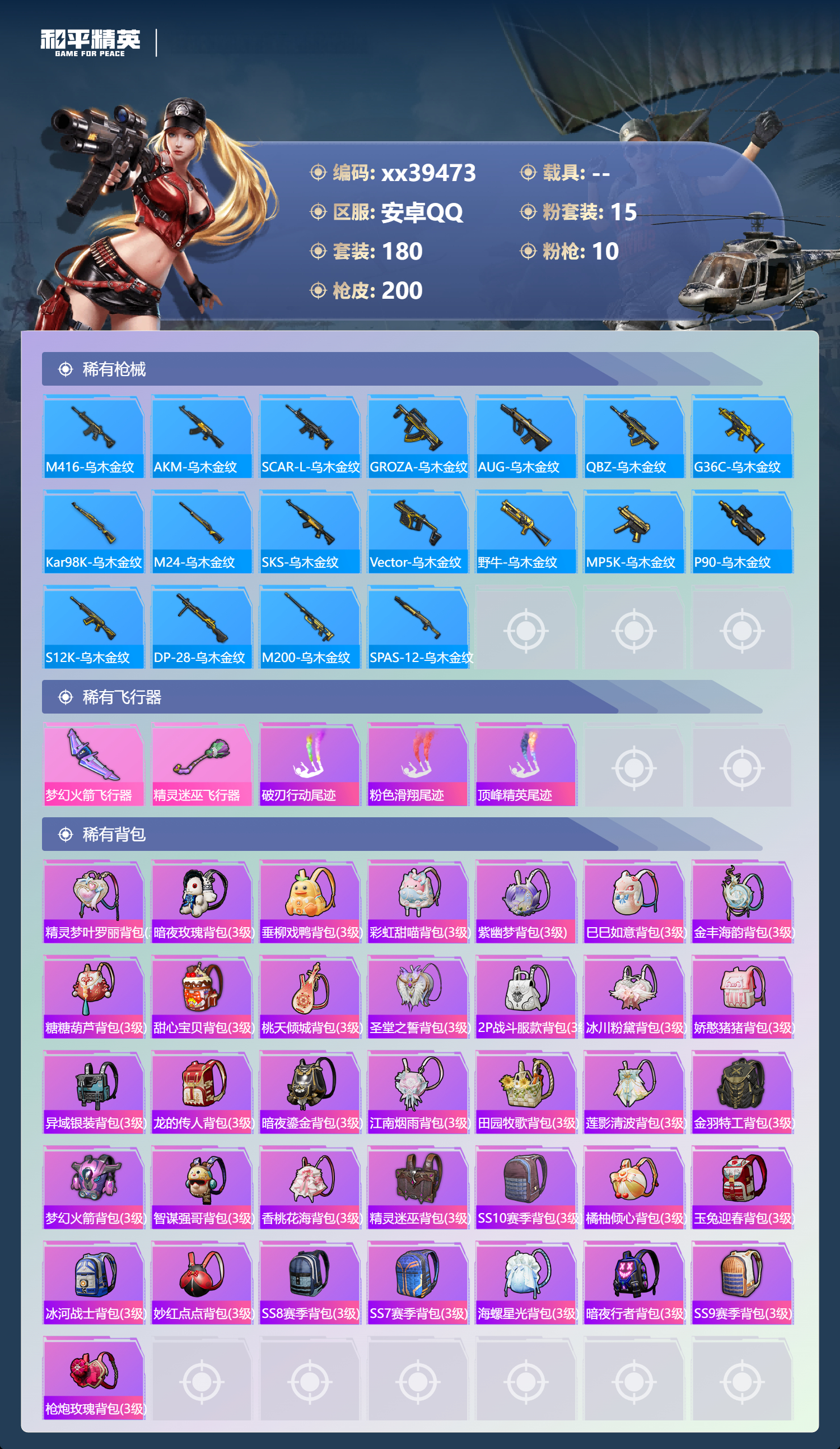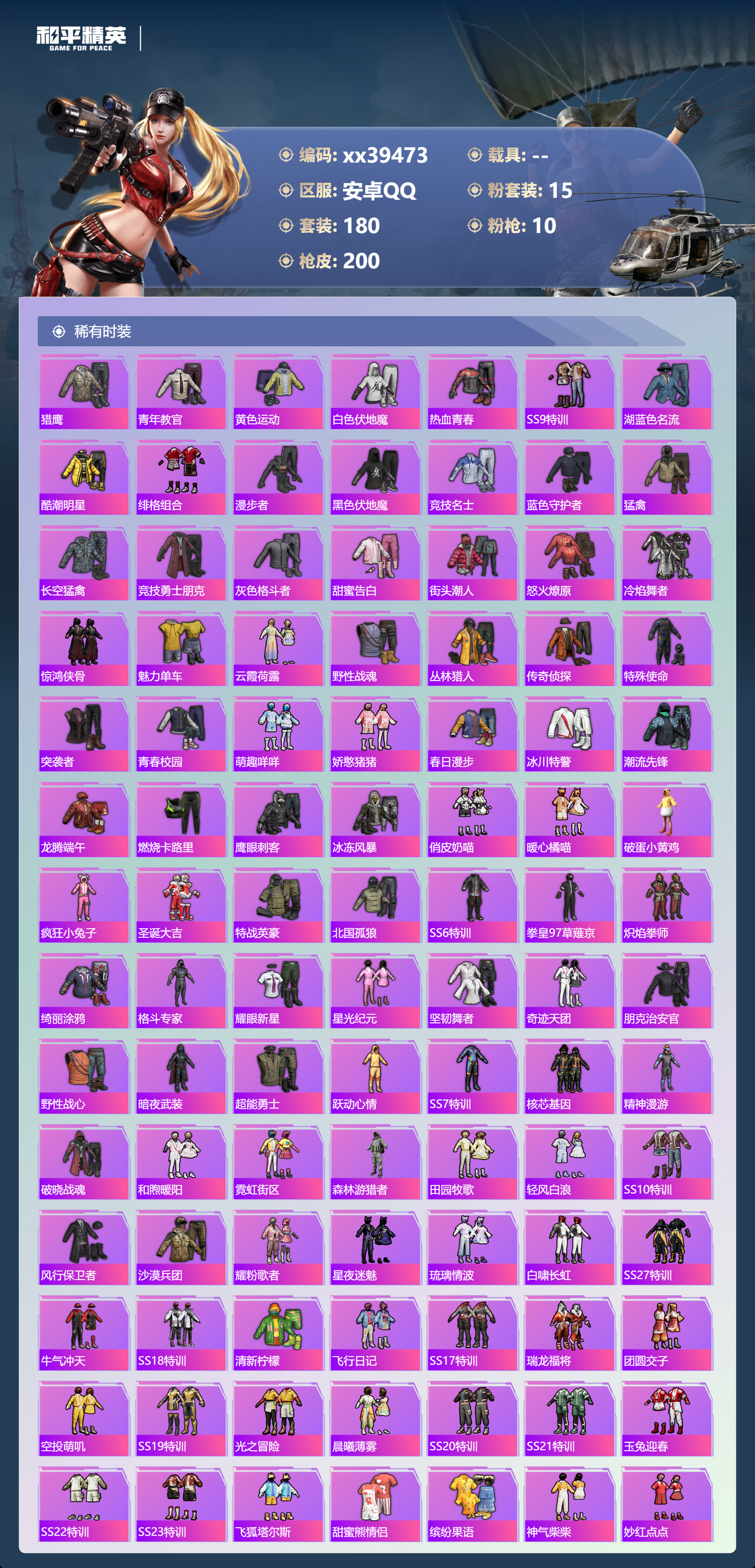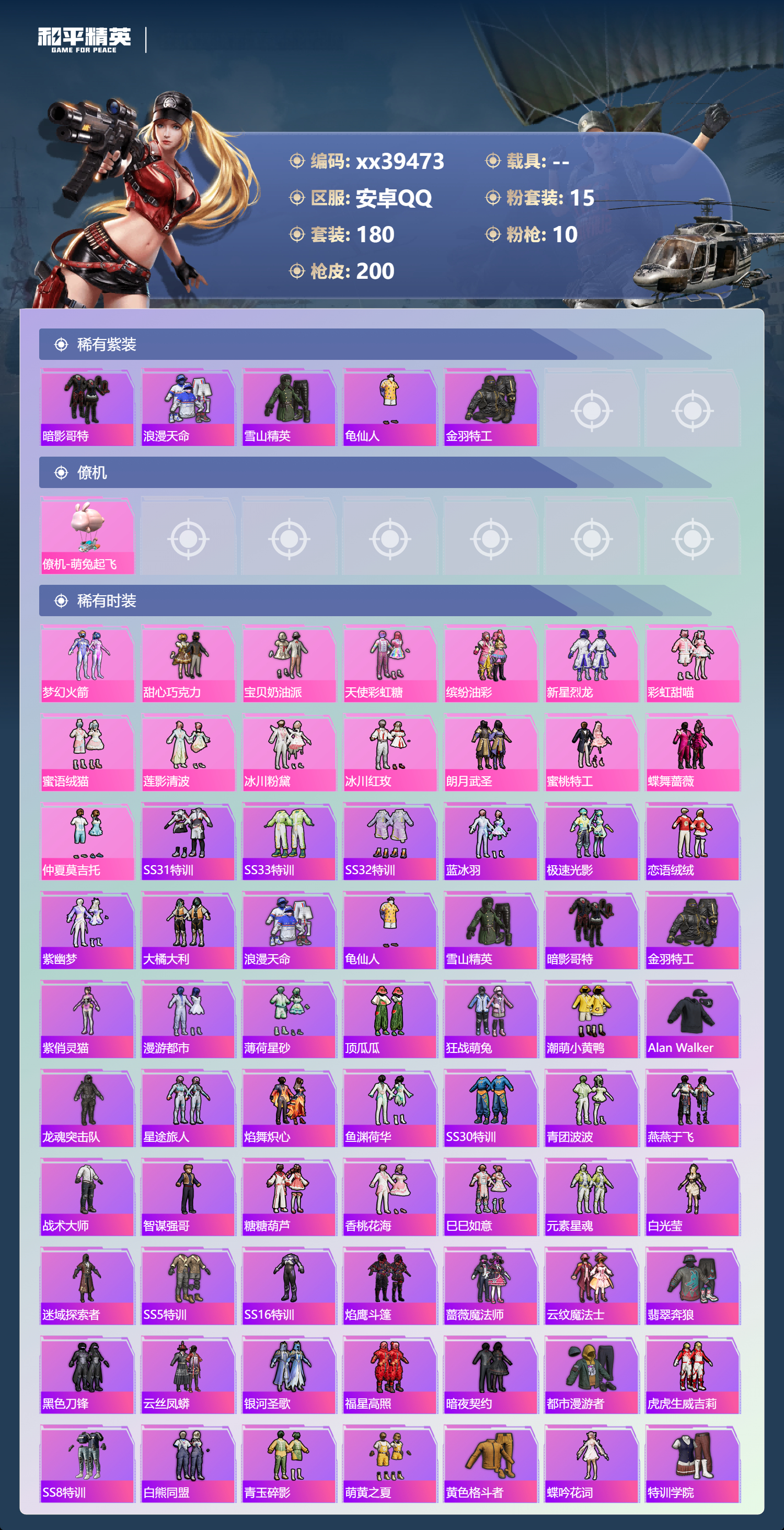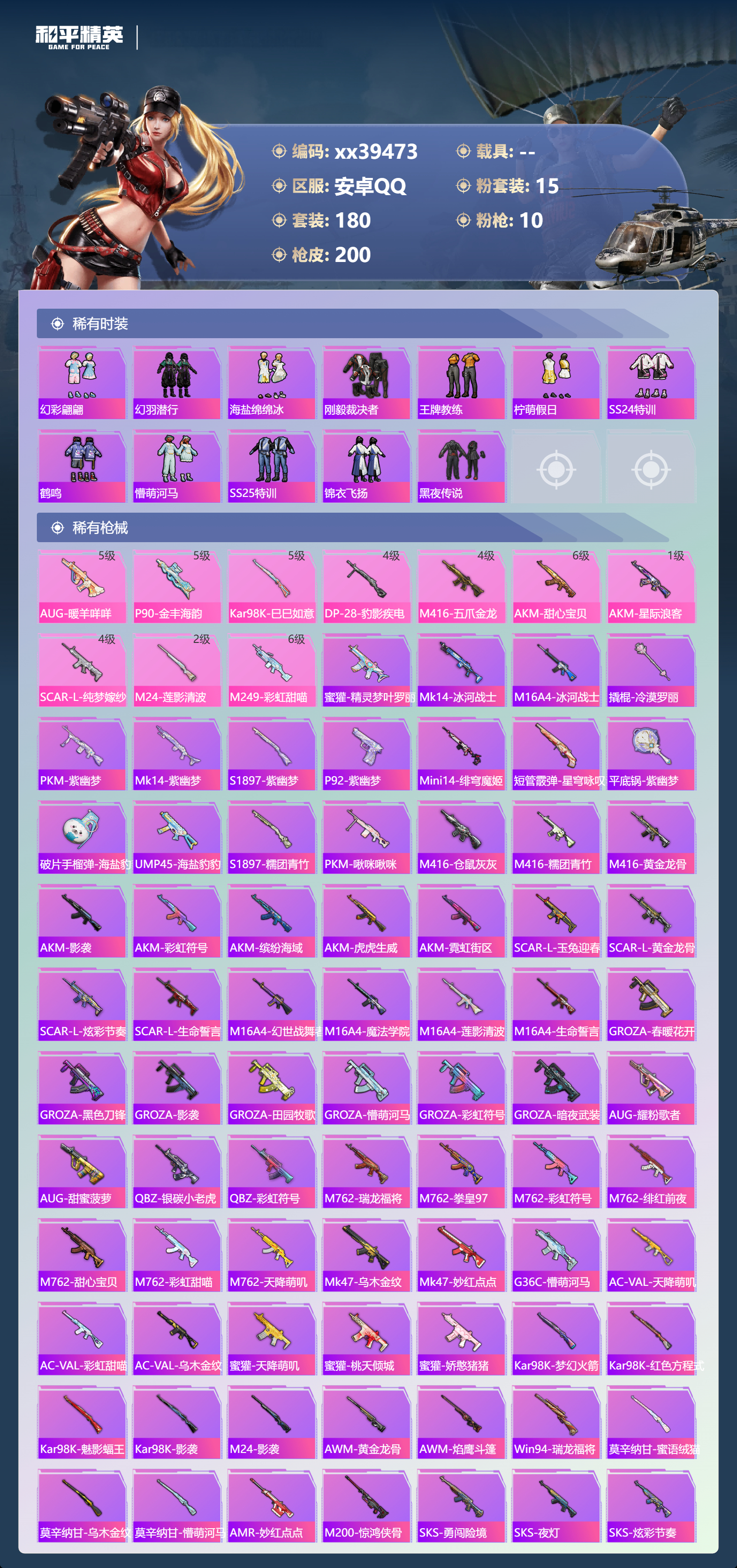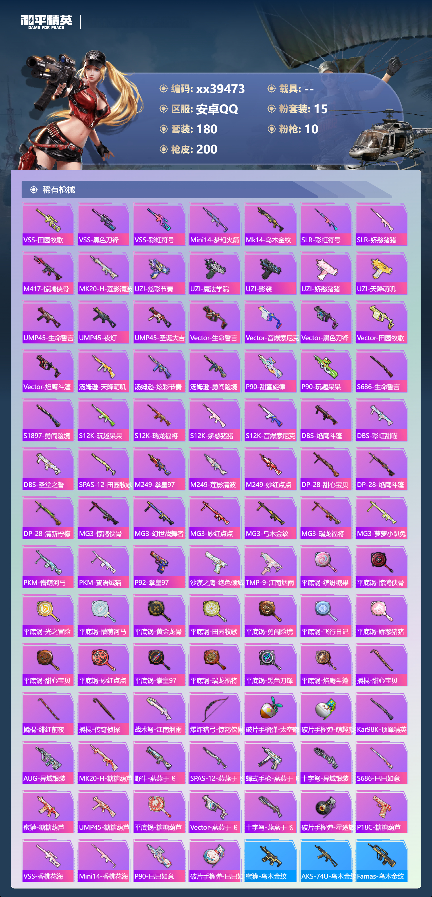 _2271220-包人脸安卓手q-8王牌印记-15粉装-10特效呛-66909热力值-180套装-200呛皮 【15粉装】套装-新星烈龙套装-缤纷油彩套装-蜜桃特工套装-莲影清波套装-蝶舞蔷薇套装-彩虹甜喵套装-梦幻火箭套装-甜心巧克力套装-仲夏莫吉托套装-冰川粉黛套装-宝贝奶油派套装-蜜语绒猫套装-冰川红玫套装-天使彩虹糖套装-朗月武圣 【10特效呛】akm-星际浪客/1级kar98k-巳巳如意/5级m24-莲影清波/2级aug-暖羊咩咩/5级dp-28-豹影疾电/4级p90-金丰海韵/5级m416-五爪金龙/4级akm-甜心宝贝/6级m249-彩虹甜喵/6级scar-l-纯梦嫁纱/4级 【5稀有紫装】暗影哥特浪漫天命雪山精英龟仙人金羽特工 【1僚机】僚机-萌兔起飞 【180稀有时装】梦幻火箭甜心巧克力宝贝奶油派天使彩虹糖缤纷油彩新星烈龙ss31特训ss33特训ss32特训蓝冰羽极速光影恋语绒绒紫幽梦大橘大利浪漫天命龟仙人雪山精英暗影哥特金羽特工紫俏灵猫漫游都市薄荷星砂顶瓜瓜彩虹甜喵蜜语绒猫莲影清波冰川粉黛冰川红玫朗月武圣蜜桃特工蝶舞蔷薇仲夏莫吉托狂战萌兔潮萌小黄鸭alanwalker龙魂突击队星途旅人焰舞炽心鱼渊荷华ss30特训青团波波燕燕于飞战术大师智谋强哥糖糖葫芦香桃花海巳巳如意元素星魂白光莹迷域探索者ss5特训ss16特训焰鹰斗篷蔷薇魔法师云纹魔法士翡翠奔狼黑色刀锋云丝凤蟒银河圣歌福星高照暗夜契约都市漫游者虎虎生威吉莉ss8特训白熊同盟青玉碎影萌黄之夏黄色格斗者蝶吟花词特训学院猎鹰青年教官黄色运动白色伏地魔热血青春ss9特训湖蓝色名流酷潮明星绯格组合漫步者黑色伏地魔竞技名士蓝色守护者猛禽长空猛禽竞技勇士朋克灰色格斗者甜蜜告白街头潮人怒火燎原冷焰舞者惊鸿侠骨魅力单车云霞荷露野性战魂丛林猎人传奇侦探特殊使命突袭者青春校园萌趣咩咩娇憨猪猪春日漫步冰川特警潮流先锋龙腾端午燃烧卡路里鹰眼刺客冰冻风暴俏皮奶喵暖心橘喵破蛋小黄鸡疯狂小兔子圣诞大吉特战英豪北国孤狼ss6特训拳皇97草薙京炽焰拳师绮丽涂鸦格斗专家耀眼新星星光纪元坚韧舞者奇迹天团朋克治安官野性战心暗夜武装超能勇士跃动心情ss7特训核芯基因精神漫游破晓战魂和煦暖阳霓虹街区森林游猎者田园牧歌轻风白浪ss10特训风行保卫者沙漠兵团耀粉歌者星夜迷魅琉璃情波白啸长虹ss27特训牛气冲天ss18特训清新柠檬飞行日记ss17特训瑞龙福将团圆交子空投萌叽ss19特训光之冒险晨曦薄雾ss20特训ss21特训玉兔迎春ss22特训ss23特训飞狐塔尔斯甜蜜熊情侣缤纷果语神气柴柴妙红点点幻彩翩翩幻羽潜行海盐绵绵冰刚毅裁决者王牌教练柠萌假日ss24特训鹤鸣懵萌河马ss25特训锦衣飞扬黑夜传说 【200稀有呛械】蜜獾-精灵梦叶罗丽aug-暖羊咩咩/5级p90-金丰海韵/5级kar98k-巳巳如意/5级dp-28-豹影疾电/4级mk14-冰河战士m16a4-冰河战士m416-五爪金龙/4级akm-甜心宝贝/6级akm-星际浪客/1级scar-l-纯梦嫁纱/4级m24-莲影清波/2级m249-彩虹甜喵/6级撬棍-冷漠罗丽pkm-紫幽梦mk14-紫幽梦蜜獾-乌木金纹s1897-紫幽梦p92-紫幽梦mini14-绯穹魔姬短管霰弹-星穹咏叹调平底锅-紫幽梦破片手留单-海盐豹豹ump45-海盐豹豹aks-74u-乌木金纹famas-乌木金纹s1897-糯团青竹pkm-啾咪啾咪m416-仓鼠灰灰m416-乌木金纹m416-糯团青竹m416-黄金龙骨akm-影袭akm-乌木金纹akm-彩虹符号akm-缤纷海域akm-虎虎生威akm-霓虹街区scar-l-玉兔迎春scar-l-乌木金纹scar-l-黄金龙骨scar-l-炫彩节奏scar-l-生命誓言m16a4-幻世战舞者m16a4-魔法学院m16a4-莲影清波m16a4-生命誓言groza-乌木金纹groza-春暖花开groza-黑色刀锋groza-影袭groza-田园牧歌groza-懵萌河马groza-彩虹符号groza-暗夜武装aug-乌木金纹aug-耀粉歌者aug-甜蜜菠萝q-乌木金纹q-银碳小老虎q-彩虹符号m762-瑞龙福将m762-拳皇97m762-彩虹符号m762-绯红前夜m762-甜心宝贝m762-彩虹甜喵m762-天降萌叽mk47-乌木金纹mk47-妙红点点g36c-乌木金纹g36c-懵萌河马ac-val-天降萌叽ac-val-彩虹甜喵ac-val-乌木金纹蜜獾-天降萌叽蜜獾-桃夭倾城蜜獾-娇憨猪猪kar98k-乌木金纹kar98k-梦幻火箭kar98k-红色方程式kar98k-魅影蝠王kar98k-影袭m24-乌木金纹m24-影袭awm-黄金龙骨awm-焰鹰斗篷win94-瑞龙福将莫辛纳甘-蜜语绒猫莫辛纳甘-乌木金纹莫辛纳甘-懵萌河马amr-妙红点点m200-惊鸿侠骨sks-勇闯险境sks-乌木金纹sks-夜灯sks-炫彩节奏vss-田园牧歌vss-黑色刀锋vss-彩虹符号mini14-梦幻火箭mk14-乌木金纹slr-彩虹符号slr-娇憨猪猪m417-惊鸿侠骨mk20-h-莲影清波uzi-炫彩节奏uzi-魔法学院uzi-影袭uzi-娇憨猪猪uzi-天降萌叽ump45-生命誓言ump45-夜灯ump45-圣诞大吉vect-乌木金纹vect-生命誓言vect-音爆索尼克vect-黑色刀锋vect-田园牧歌vect-焰鹰斗篷汤姆逊-天降萌叽汤姆逊-炫彩节奏汤姆逊-勇闯险境野牛-乌木金纹mp5k-乌木金纹p90-乌木金纹p90-甜蜜旋律p90-玩趣呆呆s686-生命誓言s1897-勇闯险境s12k-玩趣呆呆s12k-乌木金纹s12k-瑞龙福将s12k-娇憨猪猪s12k-音爆索尼克dbs-焰鹰斗篷dbs-彩虹甜喵dbs-圣堂之誓spas-12-田园牧歌m249-拳皇97m249-莲影清波m249-妙红点点dp-28-甜心宝贝dp-28-焰鹰斗篷dp-28-清新柠檬dp-28-乌木金纹mg3-惊鸿侠骨mg3-幻世战舞者mg3-妙红点点mg3-乌木金纹mg3-瑞龙福将mg3-萝萝小趴兔pkm-懵萌河马pkm-蜜语绒猫p92-拳皇97沙墨之鹦-绝色倾城tmp-9-江南烟雨平底锅-缤纷糖果平底锅-惊鸿侠骨平底锅-光之冒险平底锅-懵萌河马平底锅-黄金龙骨平底锅-田园牧歌平底锅-勇闯险境平底锅-飞行日记平底锅-娇憨猪猪平底锅-甜心宝贝平底锅-妙红点点平底锅-拳