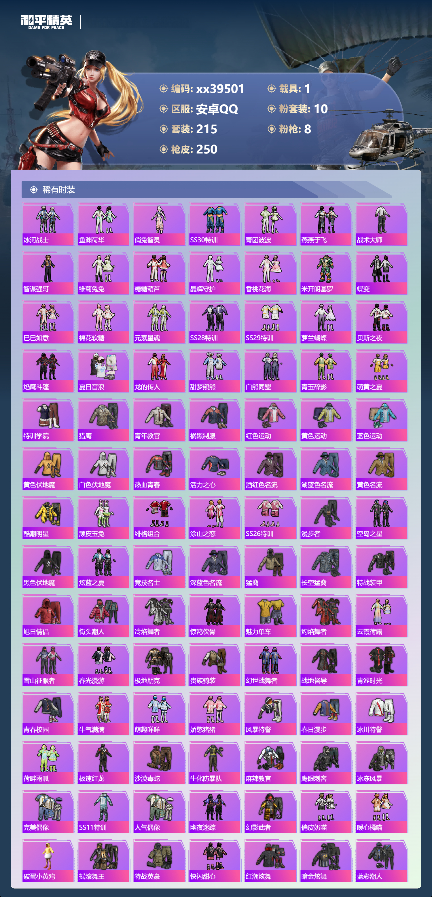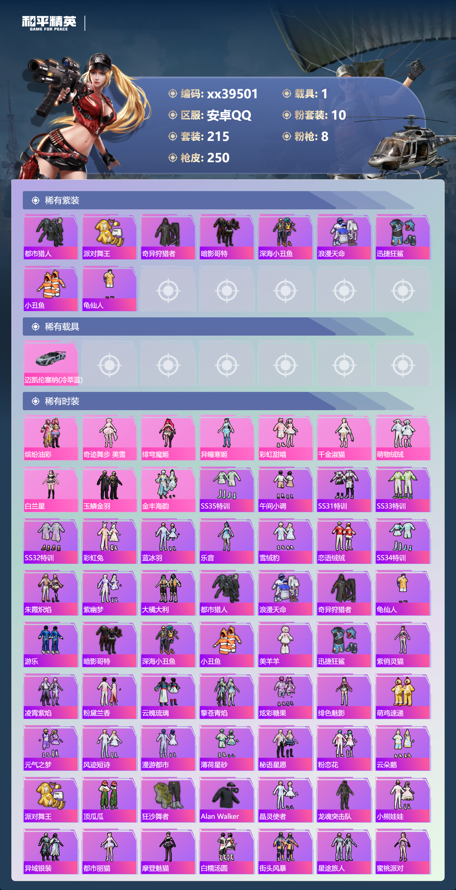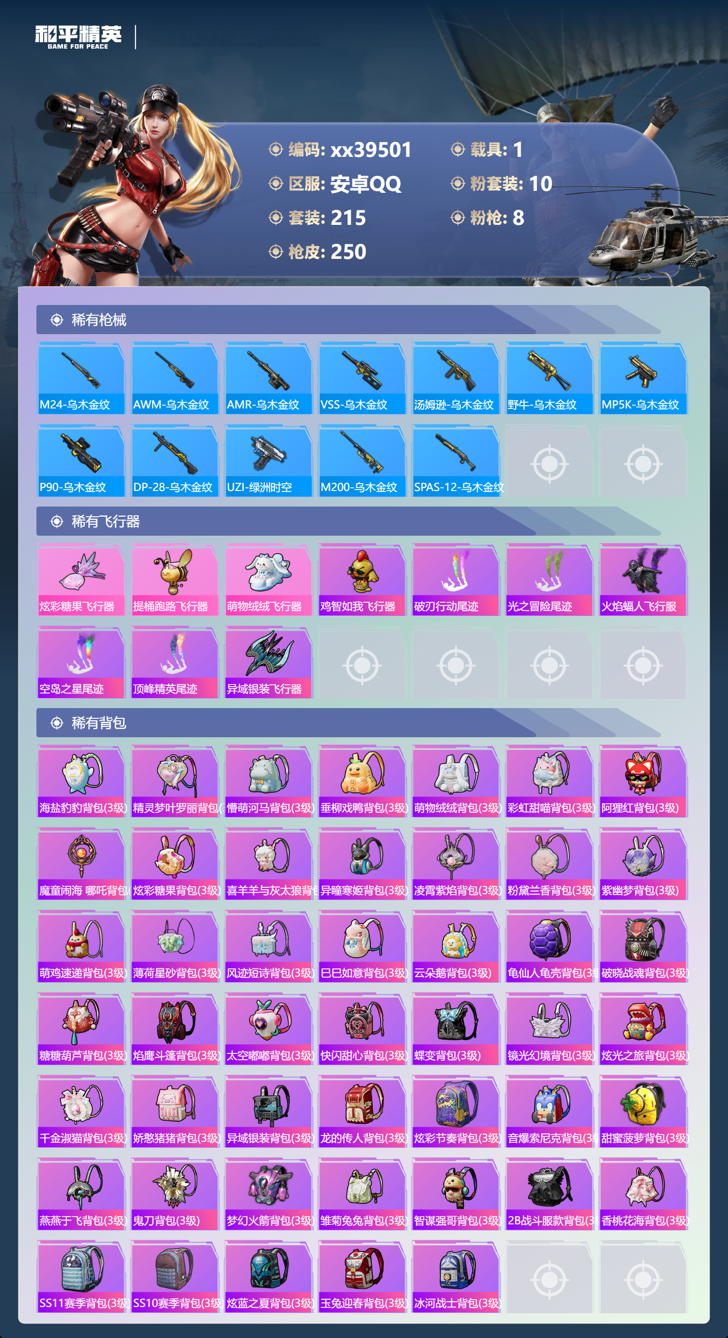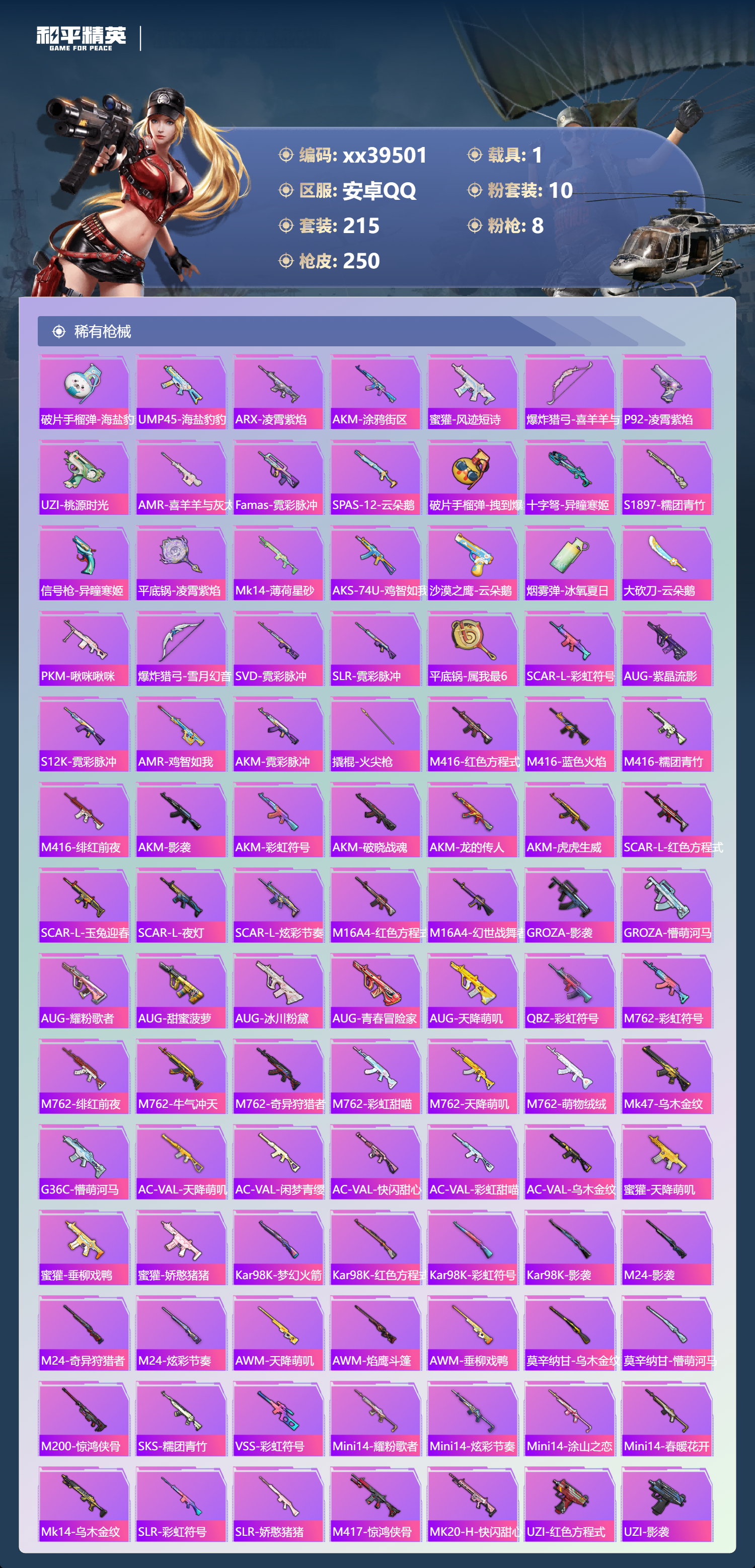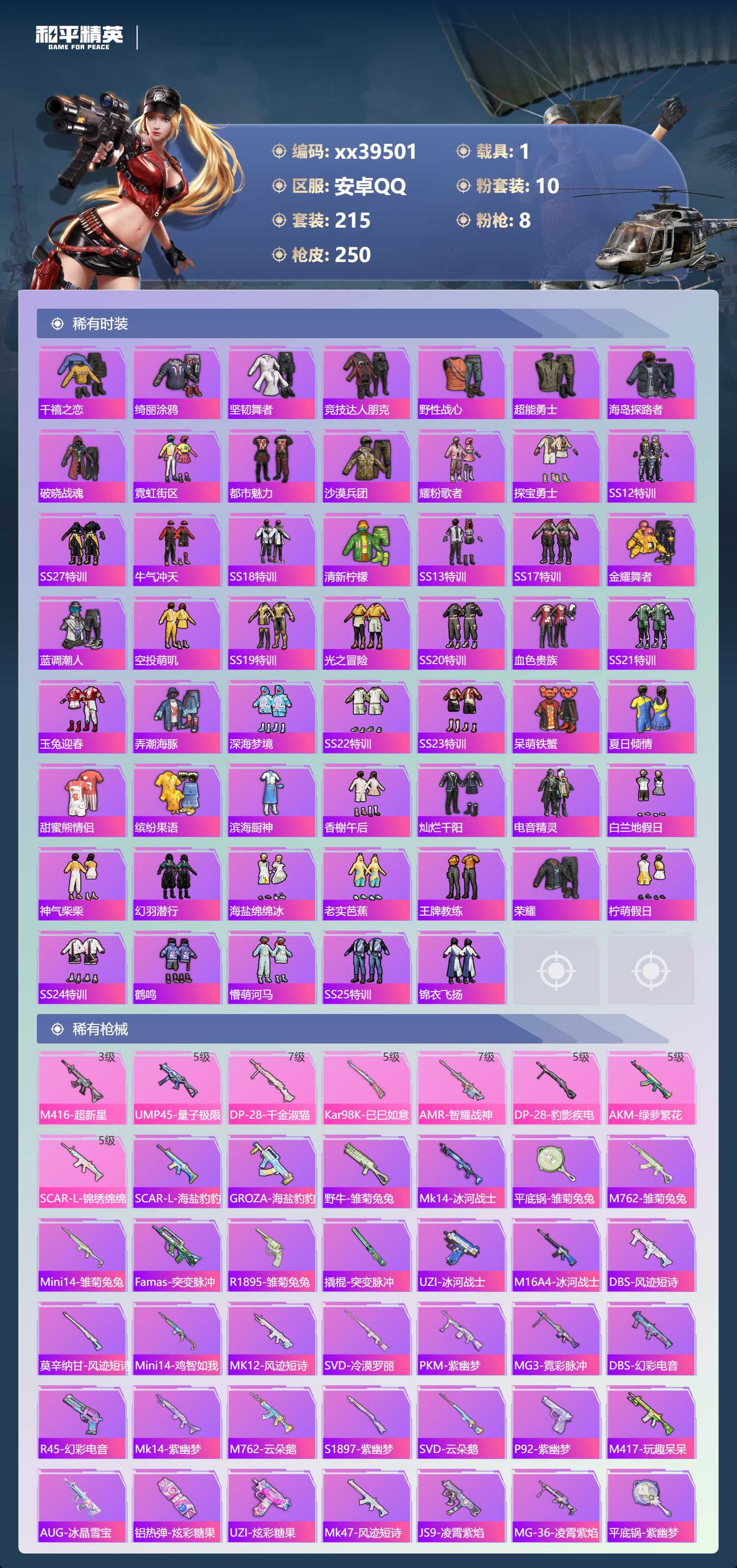 _2271258-可二次安卓手q-14王牌印记-10粉装-8特效呛-1载具-82433热力值-215套装-250呛皮-3卓越印记 【10粉装】角色-白兰星套装-缤纷油彩套装-萌物绒绒套装-玉鳞金羽角色-绯穹魔姬套装-金丰海韵角色-异瞳寒姬角色-奇迹舞步美雪套装-彩虹甜喵角色-千金淑猫 【8特效呛】ump45-量子极限/5级dp-28-豹影疾电/5级scar-l-锦绣绵绵/5级dp-28-千金淑猫/7级m416-超新星/3级kar98k-巳巳如意/5级amr-智耀战神/7级akm-绿萝繁花/5级 【9稀有紫装】都市猎人派对舞王奇异狩猎者暗影哥特深海小丑鱼浪漫天命迅捷狂鲨小丑鱼龟仙人 【1稀有载具】迈凯伦塞纳冷萃蓝 【215稀有时装】缤纷油彩奇迹舞步美雪绯穹魔姬异瞳寒姬ss35特训午间小调ss31特训ss33特训ss32特训彩虹兔蓝冰羽乐音雪绒豹恋语绒绒ss34特训朱霞炽焰紫幽梦大橘大利都市猎人浪漫天命奇异狩猎者龟仙人游乐暗影哥特深海小丑鱼小丑鱼美羊羊迅捷狂鲨紫俏灵猫凌霄紫焰粉黛兰香云魄琉璃擎苍青焰炫彩糖果绯色魅影萌鸡速递元气之梦风迹短诗漫游都市薄荷星砂秘语星愿粉恋花云朵鹅派对舞王顶瓜瓜彩虹甜喵千金淑猫萌物绒绒白兰星玉鳞金羽金丰海韵狂沙舞者alanwalker晶灵使者龙魂突击队小熊娃娃异域银装都市丽猫摩登魅猫白糯汤圆街头风暴星途旅人蜜桃派对冰河战士鱼渊荷华俏兔智灵ss30特训青团波波燕燕于飞战术大师智谋强哥雏菊兔兔糖糖葫芦晶辉守护香桃花海米开朗基罗蝶变巳巳如意棉花软糖元素星魂ss28特训ss29特训萝兰蝴蝶贝斯之夜焰鹰斗篷夏日音浪龙的传人甜梦熊熊白熊同盟青玉碎影萌黄之夏特训学院猎鹰青年教官橘黑制服红色运动黄色运动蓝色运动黄色伏地魔白色伏地魔热血青春活力之心酒红色名流湖蓝色名流黄色名流酷潮明星顽皮玉兔绯格组合涂山之恋ss26特训漫步者空岛之星黑色伏地魔炫蓝之夏竞技名士深蓝色名流猛禽长空猛禽特战装甲旭日情侣街头潮人冷焰舞者惊鸿侠骨魅力单车灼焰舞者云霞荷露雪山征服者春光漫游极地朋克贵族骑装幻世战舞者战地督导青涩时光青春校园牛气满满萌趣咩咩娇憨猪猪风暴特警春日漫步冰川特警荷畔雨呱极速红龙沙漠毒蛇生化防暴队麻辣教官鹰眼刺客冰冻风暴完美偶像ss11特训人气偶像幽夜迷踪幻影武者俏皮奶喵暖心橘喵破蛋小黄鸡摇滚舞王特战英豪快闪甜心红潮炫舞暗金炫舞蓝彩潮人千禧之恋绮丽涂鸦坚韧舞者竞技达人朋克野性战心超能勇士海岛探路者破晓战魂霓虹街区都市魅力沙漠兵团耀粉歌者探宝勇士ss12特训ss27特训牛气冲天ss18特训清新柠檬ss13特训ss17特训金耀舞者蓝调潮人空投萌叽ss19特训光之冒险ss20特训血色贵族ss21特训玉兔迎春弄潮海豚深海梦境ss22特训ss23特训呆萌铁蟹夏日倾情甜蜜熊情侣缤纷果语滨海厨神香榭午后灿烂千阳电音精灵白兰地假日神气柴柴幻羽潜行海盐绵绵冰老实芭蕉王牌教练荣耀柠萌假日ss24特训鹤鸣懵萌河马ss25特训锦衣飞扬 【250稀有呛械】m416-超新星/3级ump45-量子极限/5级dbs-乌木金纹scar-l-海盐豹豹groza-海盐豹豹dp-28-千金淑猫/7级kar98k-巳巳如意/5级amr-智耀战神/7级dp-28-豹影疾电/5级野牛-雏菊兔兔mk14-冰河战士平底锅-雏菊兔兔m762-雏菊兔兔mini14-雏菊兔兔famas-突变脉冲r1895-雏菊兔兔撬棍-突变脉冲uzi-冰河战士m16a4-冰河战士mk20-h-乌木金纹akm-绿萝繁花/5级scar-l-锦绣绵绵/5级dbs-风迹短诗莫辛纳甘-风迹短诗mini14-鸡智如我akm-绿洲时空win94-乌木金纹mk12-风迹短诗svd-冷漠罗丽pkm-紫幽梦mg3-霓彩脉冲dbs-幻彩电音r45-幻彩电音mk14-紫幽梦蜜獾-乌木金纹m762-云朵鹅s1897-紫幽梦svd-云朵鹅p92-紫幽梦awm-绿洲时空m417-玩趣呆呆aug-冰晶雪宝铝热弹-炫彩糖果uzi-炫彩糖果ump45-绿洲时空mk47-风迹短诗js9-凌霄紫焰mg-36-凌霄紫焰平底锅-紫幽梦破片手留单-海盐豹豹ump45-海盐豹豹arx-凌霄紫焰aks-74u-乌木金纹akm-涂鸦街区蜜獾-风迹短诗爆炸猎弓-喜羊羊与灰太狼p92-凌霄紫焰uzi-桃源时光amr-喜羊羊与灰太狼famas-乌木金纹famas-霓彩脉冲spas-12-云朵鹅破片手留单-拽到爆炸十子怒-异瞳寒姬s1897-糯团青竹信号呛-异瞳寒姬平底锅-凌霄紫焰mk14-薄荷星砂aks-74u-鸡智如我沙墨之鹦-云朵鹅盐雾蛋-冰氧夏日大砍刀-云朵鹅pkm-啾咪啾咪爆炸猎弓-雪月幻音svd-霓彩脉冲slr-霓彩脉冲平底锅-属我最6scar-l-彩虹符号蜜獾-绿洲时空aug-紫晶流影s12k-霓彩脉冲amr-鸡智如我akm-霓彩脉冲撬棍-火尖呛m416-红色方程式m416-蓝色火焰m416-糯团青竹m416-绯红前夜akm-影袭akm-彩虹符号akm-破晓战魂akm-龙的传人akm-虎虎生威scar-l-红色方程式scar-l-玉兔迎春scar-l-夜灯scar-l-炫彩节奏m16a4-红色方程式m16a4-幻世战舞者groza-影袭groza-懵萌河马aug-耀粉歌者aug-甜蜜菠萝aug-冰川粉黛aug-青春冒险家aug-天降萌叽q-彩虹符号m762-彩虹符号m762-绯红前夜m762-牛气冲天m762-奇异狩猎者m762-彩虹甜喵m762-天降萌叽m762-萌物绒绒mk47-乌木金纹g36c-乌木金纹g36c-懵萌河马ac-val-天降萌叽ac-val-闲梦青缨ac-val-快闪甜心ac-val-彩虹甜喵ac-val-乌木金纹蜜獾-天降萌叽蜜獾-垂柳戏鸭蜜獾-娇憨猪猪kar98k-梦幻火箭kar98k-红色方程式kar98k-彩虹符号kar98k-影袭m24-乌木金纹m24-影袭m24-奇异狩猎者m24-炫彩节奏awm-天降萌叽awm-乌木金纹awm-焰鹰斗篷awm-垂柳戏鸭莫辛纳甘-乌木金纹莫辛纳甘-懵萌河马amr-乌木金纹m200-惊鸿侠骨sks-糯团青竹vss-乌木金纹vss-彩虹符号mini14-耀粉歌者mini14-炫彩节奏mini14-涂山之恋mini14-春暖花开mk14-乌木金纹slr-彩虹符号slr-娇憨猪猪m417