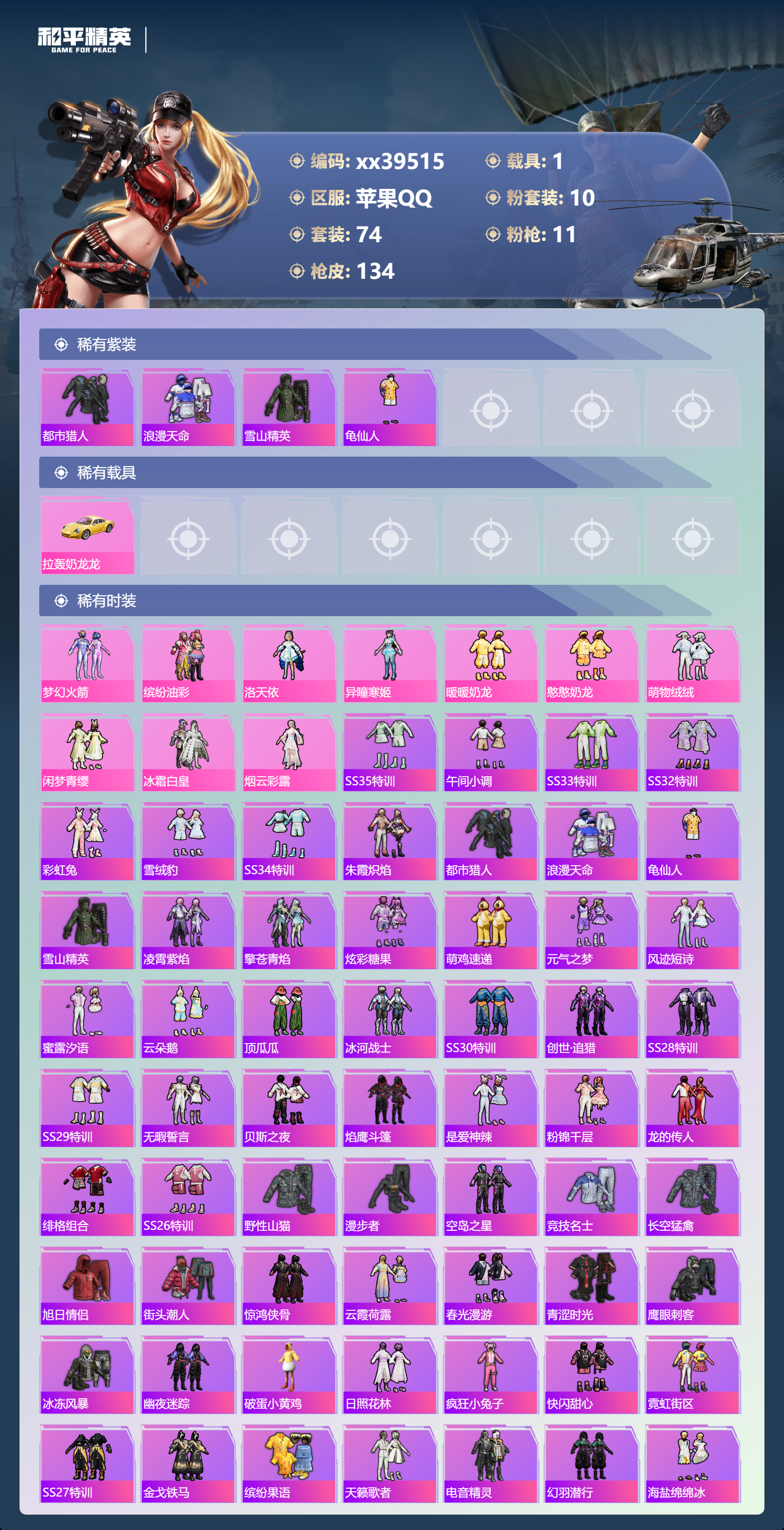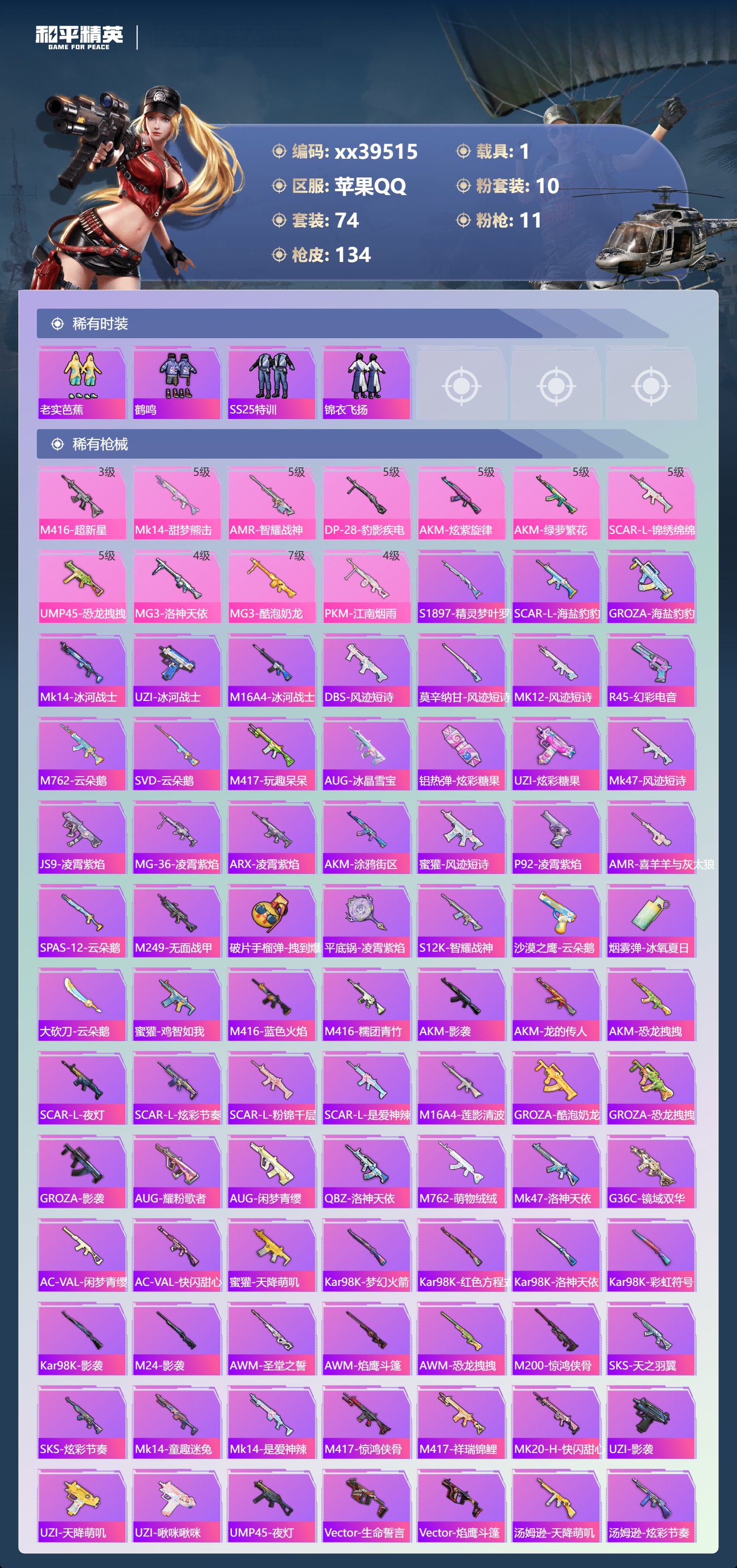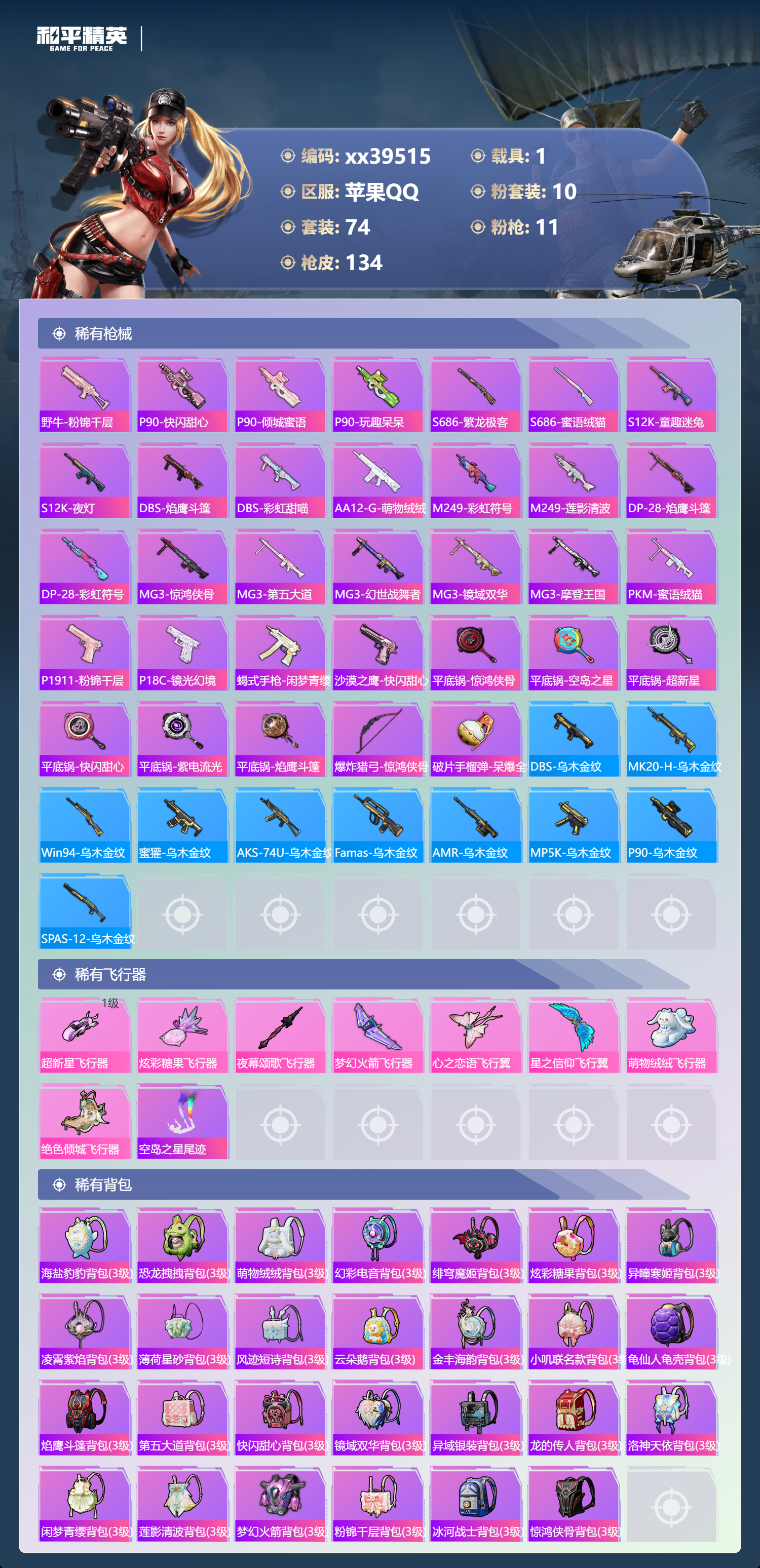 _2271256-包人脸苹果手q-6王牌印记-10粉装-11特效呛-1载具-48085热力值-74套装-134呛皮-2卓越印记-2传奇印记 【10粉装】角色-洛天依套装-暖暖奶龙角色-异瞳寒姬套装-萌物绒绒角色-烟云彩露套装-憨憨奶龙套装-缤纷油彩套装-冰霜白皇套装-梦幻火箭套装-闲梦青缨 【11特效呛】dp-28-豹影疾电/5级scar-l-锦绣绵绵/5级pkm-江南烟雨/4级m416-超新星/3级akm-绿萝繁花/5级akm-炫紫旋律/5级mk14-甜梦熊击/5级mg3-洛神天依/4级amr-智耀战神/5级ump45-恐龙拽拽/5级mg3-酷泡奶龙/7级 【4稀有紫装】都市猎人浪漫天命雪山精英龟仙人 【1稀有载具】拉轰奶龙龙 【74稀有时装】梦幻火箭缤纷油彩洛天依异瞳寒姬ss35特训午间小调ss33特训ss32特训彩虹兔雪绒豹ss34特训朱霞炽焰都市猎人浪漫天命龟仙人雪山精英凌霄紫焰擎苍青焰炫彩糖果萌鸡速递元气之梦风迹短诗蜜露汐语云朵鹅顶瓜瓜暖暖奶龙憨憨奶龙萌物绒绒闲梦青缨冰霜白皇烟云彩露冰河战士ss30特训创世·追猎ss28特训ss29特训无暇誓言贝斯之夜焰鹰斗篷是爱神辣粉锦千层龙的传人绯格组合ss26特训野性山猫漫步者空岛之星竞技名士长空猛禽旭日情侣街头潮人惊鸿侠骨云霞荷露春光漫游青涩时光鹰眼刺客冰冻风暴幽夜迷踪破蛋小黄鸡日照花林疯狂小兔子快闪甜心霓虹街区ss27特训金戈铁马缤纷果语天籁歌者电音精灵幻羽潜行海盐绵绵冰老实芭蕉鹤鸣ss25特训锦衣飞扬 【134稀有呛械】m416-超新星/3级dbs-乌木金纹s1897-精灵梦叶罗丽scar-l-海盐豹豹groza-海盐豹豹mk14-甜梦熊击/5级amr-智耀战神/5级dp-28-豹影疾电/5级mk14-冰河战士uzi-冰河战士m16a4-冰河战士mk20-h-乌木金纹akm-炫紫旋律/5级akm-绿萝繁花/5级scar-l-锦绣绵绵/5级ump45-恐龙拽拽/5级mg3-洛神天依/4级mg3-酷泡奶龙/7级pkm-江南烟雨/4级dbs-风迹短诗莫辛纳甘-风迹短诗win94-乌木金纹mk12-风迹短诗r45-幻彩电音蜜獾-乌木金纹m762-云朵鹅svd-云朵鹅m417-玩趣呆呆aug-冰晶雪宝铝热弹-炫彩糖果uzi-炫彩糖果mk47-风迹短诗js9-凌霄紫焰mg-36-凌霄紫焰arx-凌霄紫焰aks-74u-乌木金纹akm-涂鸦街区蜜獾-风迹短诗p92-凌霄紫焰amr-喜羊羊与灰太狼famas-乌木金纹spas-12-云朵鹅m249-无面战甲破片手留单-拽到爆炸平底锅-凌霄紫焰s12k-智耀战神沙墨之鹦-云朵鹅盐雾蛋-冰氧夏日大砍刀-云朵鹅蜜獾-鸡智如我m416-蓝色火焰m416-糯团青竹akm-影袭akm-龙的传人akm-恐龙拽拽scar-l-夜灯scar-l-炫彩节奏scar-l-粉锦千层scar-l-是爱神辣m16a4-莲影清波groza-酷泡奶龙groza-恐龙拽拽groza-影袭aug-耀粉歌者aug-闲梦青缨q-洛神天依m762-萌物绒绒mk47-洛神天依g36c-镜域双华ac-val-闲梦青缨ac-val-快闪甜心蜜獾-天降萌叽kar98k-梦幻火箭kar98k-红色方程式kar98k-洛神天依kar98k-彩虹符号kar98k-影袭m24-影袭awm-圣堂之誓awm-焰鹰斗篷awm-恐龙拽拽amr-乌木金纹m200-惊鸿侠骨sks-天之羽翼sks-炫彩节奏mk14-童趣迷兔mk14-是爱神辣m417-惊鸿侠骨m417-祥瑞锦鲤mk20-h-快闪甜心uzi-影袭uzi-天降萌叽uzi-啾咪啾咪ump45-夜灯vect-生命誓言vect-焰鹰斗篷汤姆逊-天降萌叽汤姆逊-炫彩节奏野牛-粉锦千层mp5k-乌木金纹p90-乌木金纹p90-快闪甜心p90-倾城蜜语p90-玩趣呆呆s686-繁龙极客s686-蜜语绒猫s12k-童趣迷兔s12k-夜灯dbs-焰鹰斗篷dbs-彩虹甜喵aa12-g-萌物绒绒m249-彩虹符号m249-莲影清波dp-28-焰鹰斗篷dp-28-彩虹符号mg3-惊鸿侠骨mg3-第五大道mg3-幻世战舞者mg3-镜域双华mg3-摩登王国pkm-蜜语绒猫p1911-粉锦千层p18c-镜光幻境蝎式手呛-闲梦青缨沙墨之鹦-快闪甜心平底锅-惊鸿侠骨平底锅-空岛之星平底锅-超新星平底锅-快闪甜心平底锅-紫电流光平底锅-焰鹰斗篷爆炸猎弓-惊鸿侠骨破片手留单-呆爆全场spas-12-乌木金纹 【9稀有飞行器】超新星飞行器/1级炫彩糖果飞行器空岛之星尾迹夜幕颂歌飞行器梦幻火箭飞行器心之恋语飞行翼星之信仰飞行翼萌物绒绒飞行器绝色倾城飞行器 【27稀有背包】海盐豹豹背包3级恐龙拽拽背包3级萌物绒绒背包3级幻彩电音背包3级绯穹魔姬背包3级炫彩糖果背包3级异瞳寒姬背包3级凌霄紫焰背包3级薄荷星砂背包3级风迹短诗背包3级云朵鹅背包3级金丰海韵背包3级小叽联名款背包3级龟仙人龟壳背包3级焰鹰斗篷背包3级第五大道背包3级快闪甜心背包3级镜域双华背包3级异域银装背包3级龙的传人背包3级洛神天依背包3级闲梦青缨背包3级莲影清波背包3级梦幻火箭背包3级粉锦千层背包3级冰河战士背包3级惊鸿侠骨背包3级