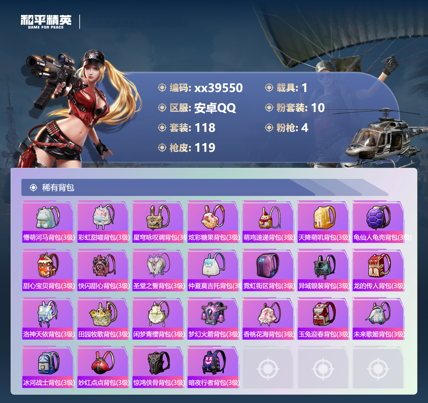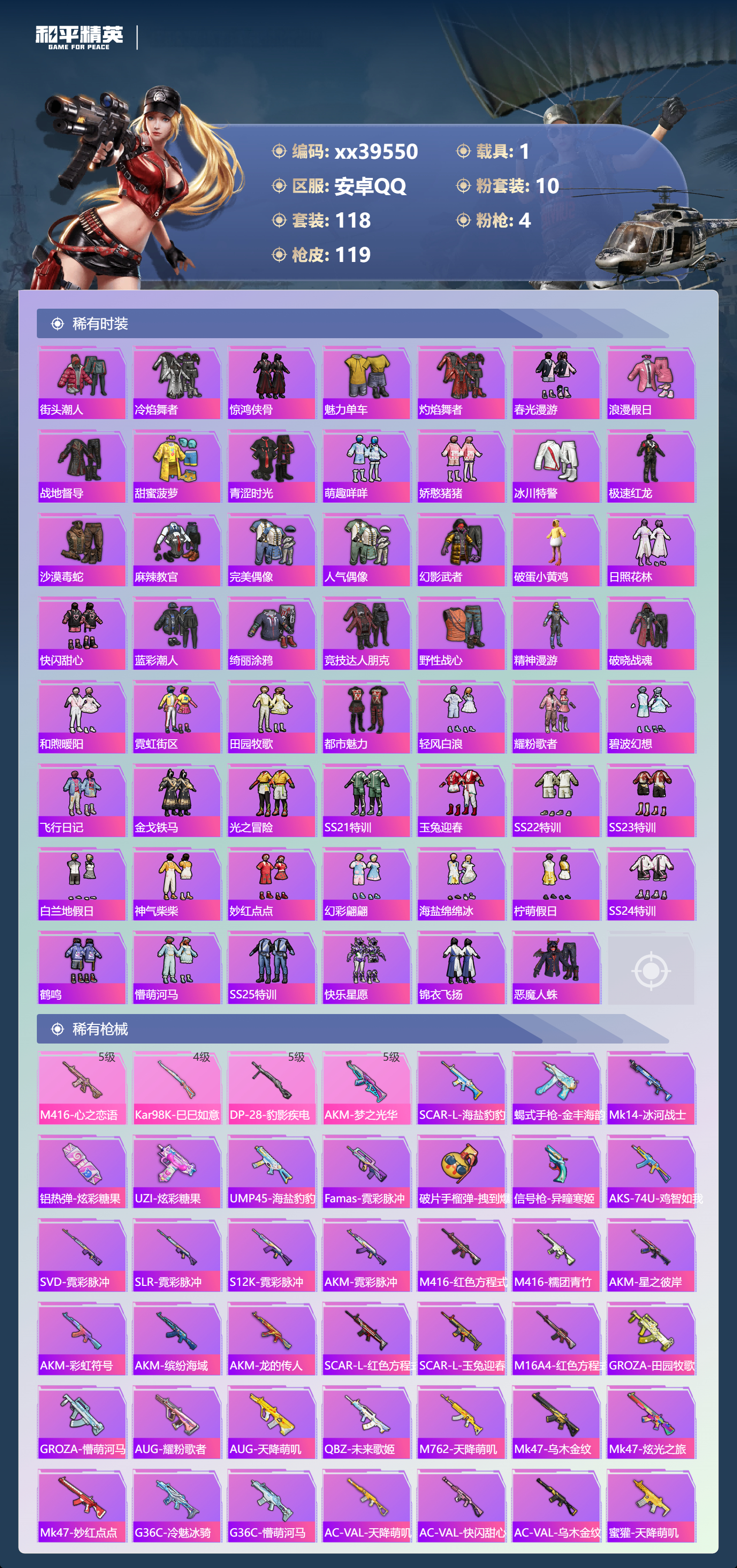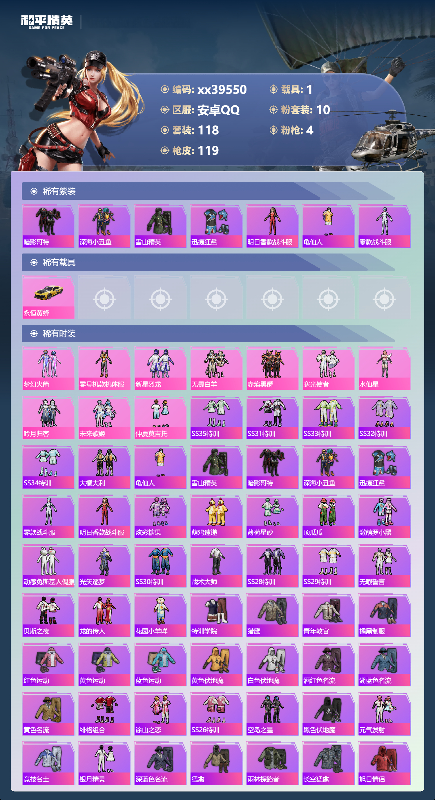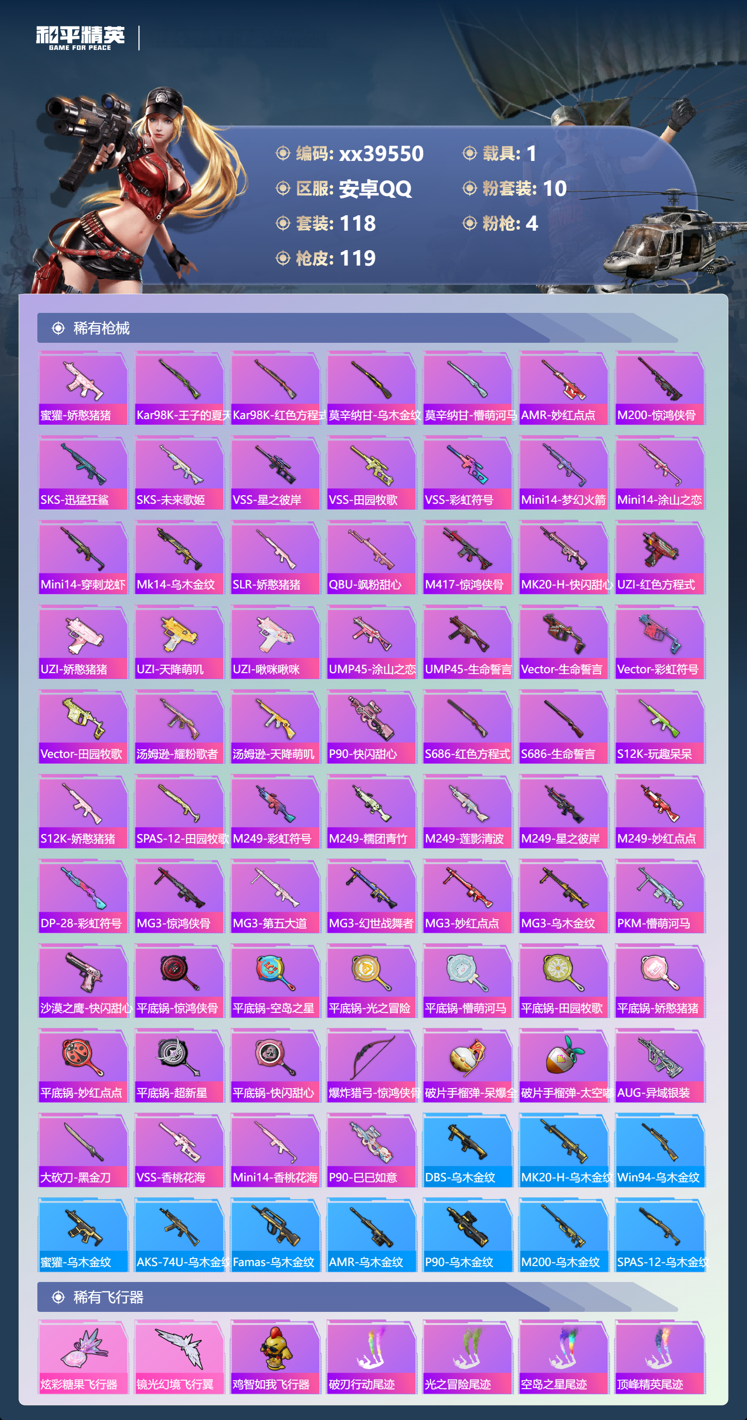 _2271250-包人脸安卓手q-7王牌印记-10粉装-4特效呛-1载具-47009热力值-118套装-119呛皮-2卓越印记-1传奇印记 【10粉装】套装-赤焰黑爵套装-无畏白羊角色-零号机款机体服套装-梦幻火箭套装-新星烈龙角色-水仙星套装-吟月归客套装-仲夏莫吉托套装-寒光使者套装-未来歌姬 【4特效呛】kar98k-巳巳如意/4级m416-心之恋语/5级akm-梦之光华/5级dp-28-豹影疾电/5级 【7稀有紫装】暗影哥特深海小丑鱼雪山精英迅捷狂鲨明日香款战斗服龟仙人零款战斗服 【1稀有载具】永恒黄蜂 【118稀有时装】梦幻火箭零号机款机体服新星烈龙ss35特训ss31特训ss33特训ss32特训ss34特训大橘大利龟仙人雪山精英暗影哥特深海小丑鱼迅捷狂鲨零款战斗服明日香款战斗服炫彩糖果萌鸡速递薄荷星砂顶瓜瓜无畏白羊赤焰黑爵寒光使者水仙星吟月归客未来歌姬仲夏莫吉托激萌罗小黑动感兔斯基人偶服光矢逐梦ss30特训战术大师ss28特训ss29特训无暇誓言贝斯之夜龙的传人花园小羊咩特训学院猎鹰青年教官橘黑制服红色运动黄色运动蓝色运动黄色伏地魔白色伏地魔酒红色名流湖蓝色名流黄色名流绯格组合涂山之恋ss26特训空岛之星黑色伏地魔元气发射竞技名士银月精灵深蓝色名流猛禽雨林探路者长空猛禽旭日情侣街头潮人冷焰舞者惊鸿侠骨魅力单车灼焰舞者春光漫游浪漫假日战地督导甜蜜菠萝青涩时光萌趣咩咩娇憨猪猪冰川特警极速红龙沙漠毒蛇麻辣教官完美偶像人气偶像幻影武者破蛋小黄鸡日照花林快闪甜心蓝彩潮人绮丽涂鸦竞技达人朋克野性战心精神漫游破晓战魂和煦暖阳霓虹街区田园牧歌都市魅力轻风白浪耀粉歌者碧波幻想飞行日记金戈铁马光之冒险ss21特训玉兔迎春ss22特训ss23特训白兰地假日神气柴柴妙红点点幻彩翩翩海盐绵绵冰柠萌假日ss24特训鹤鸣懵萌河马ss25特训快乐星愿锦衣飞扬恶魔人蛛 【119稀有呛械】m416-心之恋语/5级dbs-乌木金纹scar-l-海盐豹豹kar98k-巳巳如意/4级dp-28-豹影疾电/5级蝎式手呛-金丰海韵mk14-冰河战士mk20-h-乌木金纹akm-梦之光华/5级win94-乌木金纹蜜獾-乌木金纹铝热弹-炫彩糖果uzi-炫彩糖果ump45-海盐豹豹aks-74u-乌木金纹famas-乌木金纹famas-霓彩脉冲破片手留单-拽到爆炸信号呛-异瞳寒姬aks-74u-鸡智如我svd-霓彩脉冲slr-霓彩脉冲s12k-霓彩脉冲akm-霓彩脉冲m416-红色方程式m416-糯团青竹akm-星之彼岸akm-彩虹符号akm-缤纷海域akm-龙的传人scar-l-红色方程式scar-l-玉兔迎春m16a4-红色方程式groza-田园牧歌groza-懵萌河马aug-耀粉歌者aug-天降萌叽q-未来歌姬m762-天降萌叽mk47-乌木金纹mk47-炫光之旅mk47-妙红点点g36c-冷魅冰骑g36c-懵萌河马ac-val-天降萌叽ac-val-快闪甜心ac-val-乌木金纹蜜獾-天降萌叽蜜獾-娇憨猪猪kar98k-王子的夏天kar98k-红色方程式莫辛纳甘-乌木金纹莫辛纳甘-懵萌河马amr-乌木金纹amr-妙红点点m200-惊鸿侠骨sks-迅猛狂鲨sks-未来歌姬vss-星之彼岸vss-田园牧歌vss-彩虹符号mini14-梦幻火箭mini14-涂山之恋mini14-穿刺龙虾mk14-乌木金纹slr-娇憨猪猪qbu-飒粉甜心m417-惊鸿侠骨mk20-h-快闪甜心uzi-红色方程式uzi-娇憨猪猪uzi-天降萌叽uzi-啾咪啾咪ump45-涂山之恋ump45-生命誓言vect-生命誓言vect-彩虹符号vect-田园牧歌汤姆逊-耀粉歌者汤姆逊-天降萌叽p90-乌木金纹p90-快闪甜心s686-红色方程式s686-生命誓言s12k-玩趣呆呆s12k-娇憨猪猪spas-12-田园牧歌m249-彩虹符号m249-糯团青竹m249-莲影清波m249-星之彼岸m249-妙红点点dp-28-彩虹符号mg3-惊鸿侠骨mg3-第五大道mg3-幻世战舞者mg3-妙红点点mg3-乌木金纹pkm-懵萌河马沙墨之鹦-快闪甜心平底锅-惊鸿侠骨平底锅-空岛之星平底锅-光之冒险平底锅-懵萌河马平底锅-田园牧歌平底锅-娇憨猪猪平底锅-妙红点点平底锅-超新星平底锅-快闪甜心爆炸猎弓-惊鸿侠骨破片手留单-呆爆全场破片手留单-太空嘟嘟aug-异域银装m200-乌木金纹spas-12-乌木金纹大砍刀-黑金刀vss-香桃花海mini14-香桃花海p90-巳巳如意 【7稀有飞行器】鸡智如我飞行器炫彩糖果飞行器破刃行动尾迹光之冒险尾迹空岛之星尾迹顶峰精英尾迹镜光幻境飞行翼 【25稀有背包】懵萌河马背包3级彩虹甜喵背包3级星穹咏叹调背包3级炫彩糖果背包3级萌鸡速递背包3级天降萌叽背包3级龟仙人龟壳背包3级甜心宝贝背包3级快闪甜心背包3级圣堂之誓背包3级仲夏莫吉托背包3级霓虹街区背包3级异域银装背包3级龙的传人背包3级洛神天依背包3级田园牧歌背包3级闲梦青缨背包3级梦幻火箭背包3级香桃花海背包3级玉兔迎春背包3级未来歌姬背包3级冰河战士背包3级妙红点点背包3级惊鸿侠骨背包3级暗夜行者背包3级
