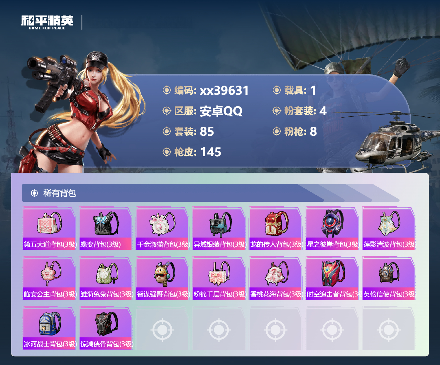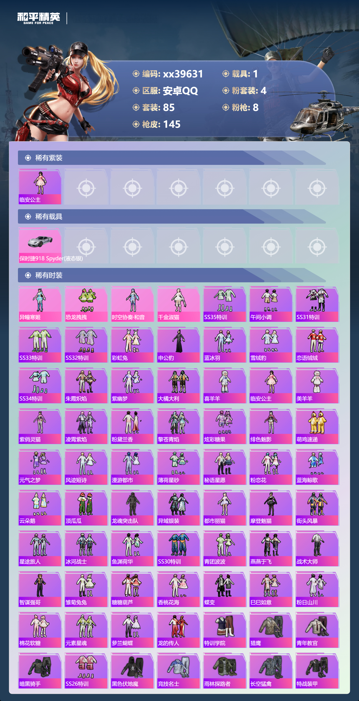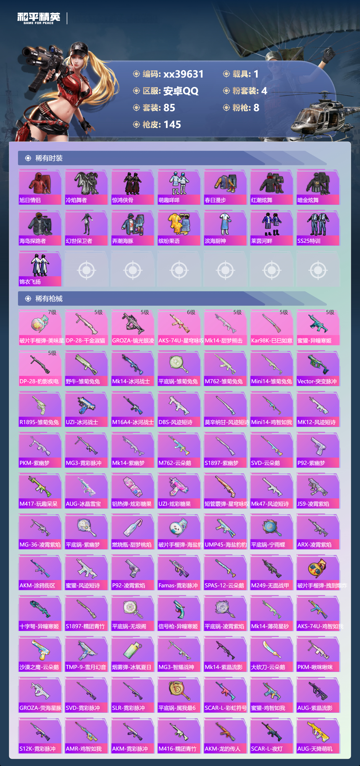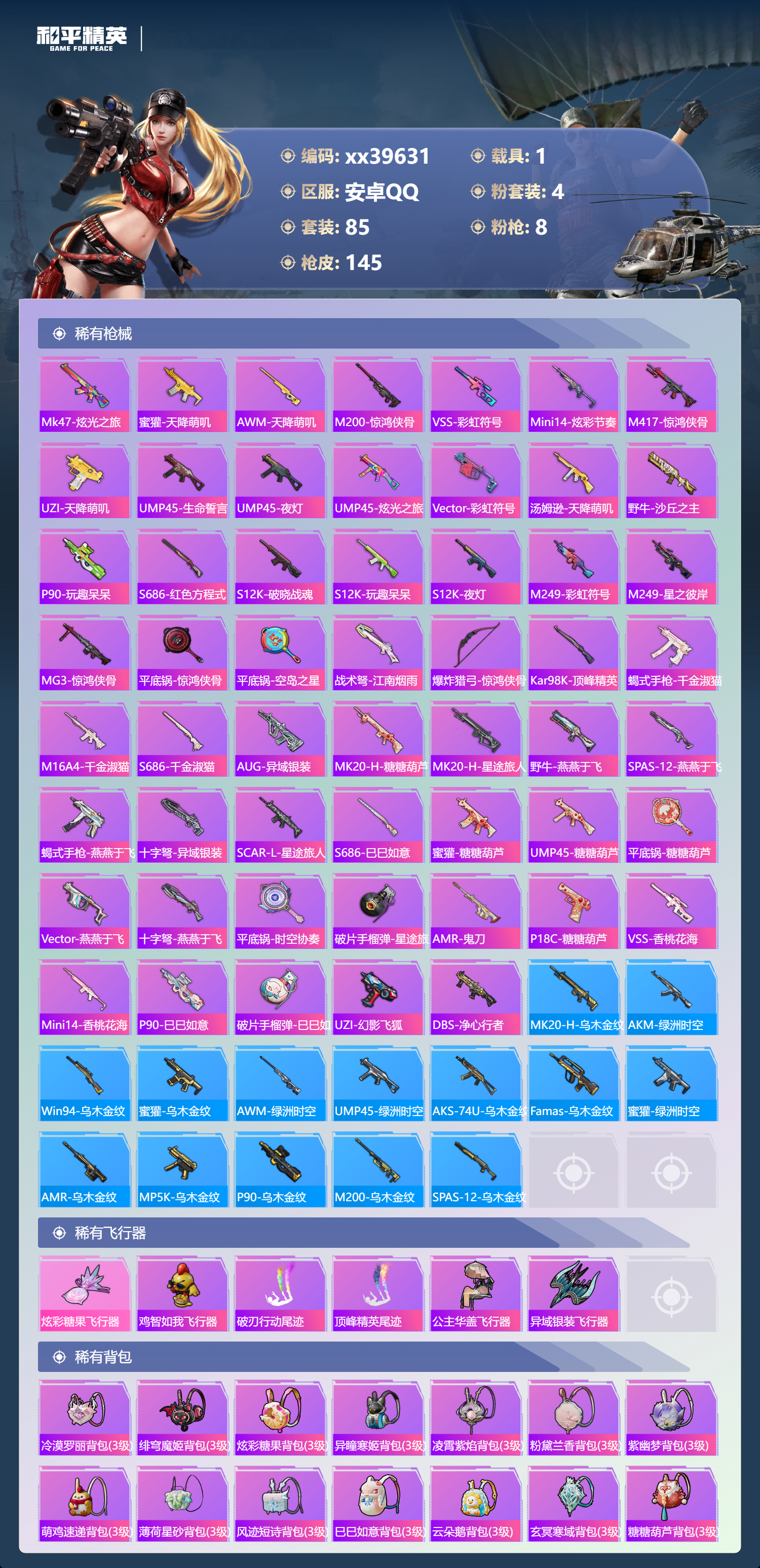_2274530-可二次安卓手q-3王牌印记-4粉装-8特效呛-1载具-42486热力值-85套装-145呛皮-2卓越印记-1传奇印记 【4粉装】角色-千金淑猫时空协奏·和音套装-恐龙拽拽角色-异瞳寒姬 【8特效呛】mk14-甜梦熊击/5级破片手留单-美味星星糖/7级蜜獾-异瞳寒姬/5级groza-镜光银凌/5级dp-28-豹影疾电/5级dp-28-千金淑猫/5级kar98k-巳巳如意/5级aks-74u-星穹咏叹调/6级 【1稀有紫装】临安公主 【1稀有载具】保时捷918sper液态银 【85稀有时装】异瞳寒姬ss35特训午间小调ss31特训ss33特训ss32特训彩虹兔申公豹蓝冰羽雪绒豹恋语绒绒ss34特训朱霞炽焰紫幽梦大橘大利喜羊羊临安公主美羊羊紫俏灵猫凌霄紫焰粉黛兰香擎苍青焰炫彩糖果绯色魅影萌鸡速递元气之梦风迹短诗漫游都市薄荷星砂秘语星愿粉恋花蓝海鲸歌云朵鹅顶瓜瓜恐龙拽拽时空协奏·和音千金淑猫龙魂突击队异域银装都市丽猫摩登魅猫街头风暴星途旅人冰河战士鱼渊荷华ss30特训青团波波燕燕于飞战术大师智谋强哥雏菊兔兔糖糖葫芦香桃花海蝶变巳巳如意粉日山川棉花软糖元素星魂萝兰蝴蝶龙的传人特训学院猎鹰青年教官暗黑骑手ss26特训黑色伏地魔竞技名士雨林探路者长空猛禽特战装甲旭日情侣冷焰舞者惊鸿侠骨萌趣咩咩春日漫步红潮炫舞暗金炫舞海岛探路者幻世保卫者弄潮海豚缤纷果语滨海厨神莱茵河畔ss25特训锦衣飞扬 【145稀有呛械】破片手留单-美味星星糖/7级dp-28-千金淑猫/5级groza-镜光银凌/5级aks-74u-星穹咏叹调/6级mk14-甜梦熊击/5级kar98k-巳巳如意/5级蜜獾-异瞳寒姬/5级dp-28-豹影疾电/5级野牛-雏菊兔兔mk14-冰河战士平底锅-雏菊兔兔m762-雏菊兔兔mini14-雏菊兔兔vect-突变脉冲r1895-雏菊兔兔uzi-冰河战士m16a4-冰河战士mk20-h-乌木金纹dbs-风迹短诗莫辛纳甘-风迹短诗mini14-鸡智如我akm-绿洲时空win94-乌木金纹mk12-风迹短诗pkm-紫幽梦mg3-霓彩脉冲mk14-紫幽梦蜜獾-乌木金纹m762-云朵鹅s1897-紫幽梦svd-云朵鹅p92-紫幽梦awm-绿洲时空m417-玩趣呆呆aug-冰晶雪宝铝热弹-炫彩糖果uzi-炫彩糖果ump45-绿洲时空短管霰弹-星穹咏叹调mk47-风迹短诗js9-凌霄紫焰mg-36-凌霄紫焰平底锅-紫幽梦燃烧瓶-甜梦桃焰破片手留单-海盐豹豹ump45-海盐豹豹平底锅-宁雨蝶arx-凌霄紫焰aks-74u-乌木金纹akm-涂鸦街区蜜獾-风迹短诗p92-凌霄紫焰famas-乌木金纹famas-霓彩脉冲spas-12-云朵鹅m249-无面战甲破片手留单-拽到爆炸十子怒-异瞳寒姬s1897-糯团青竹平底锅-无垠阁信号呛-异瞳寒姬平底锅-凌霄紫焰mk14-薄荷星砂aks-74u-鸡智如我沙墨之鹦-云朵鹅tmp-9-雪月幻音盐雾蛋-冰氧夏日mg3-智耀战神mk14-紫晶流影大砍刀-云朵鹅pkm-啾咪啾咪groza-荧海星豚svd-霓彩脉冲slr-霓彩脉冲平底锅-属我最6scar-l-彩虹符号蜜獾-绿洲时空蜜獾-鸡智如我aug-紫晶流影s12k-霓彩脉冲amr-鸡智如我akm-霓彩脉冲m416-糯团青竹akm-龙的传人scar-l-夜灯aug-天降萌叽mk47-炫光之旅蜜獾-天降萌叽awm-天降萌叽amr-乌木金纹m200-惊鸿侠骨vss-彩虹符号mini14-炫彩节奏m417-惊鸿侠骨uzi-天降萌叽ump45-生命誓言ump45-夜灯ump45-炫光之旅vect-彩虹符号汤姆逊-天降萌叽野牛-沙丘之主mp5k-乌木金纹p90-乌木金纹p90-玩趣呆呆s686-红色方程式s12k-破晓战魂s12k-玩趣呆呆s12k-夜灯m249-彩虹符号m249-星之彼岸mg3-惊鸿侠骨平底锅-惊鸿侠骨平底锅-空岛之星战术弩-江南烟雨爆炸猎弓-惊鸿侠骨kar98k-顶峰精英蝎式手呛-千金淑猫m16a4-千金淑猫s686-千金淑猫aug-异域银装mk20-h-糖糖葫芦mk20-h-星途旅人野牛-燕燕于飞m200-乌木金纹spas-12-燕燕于飞蝎式手呛-燕燕于飞十子怒-异域银装scar-l-星途旅人s686-巳巳如意蜜獾-糖糖葫芦ump45-糖糖葫芦spas-12-乌木金纹平底锅-糖糖葫芦vect-燕燕于飞十子怒-燕燕于飞平底锅-时空协奏破片手留单-星途旅人amr-鬼刀p18c-糖糖葫芦vss-香桃花海mini14-香桃花海p90-巳巳如意破片手留单-巳巳如意uzi-幻影飞狐dbs-净心行者 【6稀有飞行器】鸡智如我飞行器炫彩糖果飞行器破刃行动尾迹顶峰精英尾迹公主华盖飞行器异域银装飞行器 【30稀有背包】冷漠罗丽背包3级绯穹魔姬背包3级炫彩糖果背包3级异瞳寒姬背包3级凌霄紫焰背包3级粉黛兰香背包3级紫幽梦背包3级萌鸡速递背包3级薄荷星砂背包3级风迹短诗背包3级巳巳如意背包3级云朵鹅背包3级玄冥寒域背包3级糖糖葫芦背包3级第五大道背包3级蝶变背包3级千金淑猫背包3级异域银装背包3级龙的传人背包3级星之彼岸背包3级莲影清波背包3级临安公主背包3级雏菊兔兔背包3级智谋强哥背包3级粉锦千层背包3级香桃花海背包3级时空追击者背包3级英伦信使背包3级冰河战士背包3级惊鸿侠骨背包3级