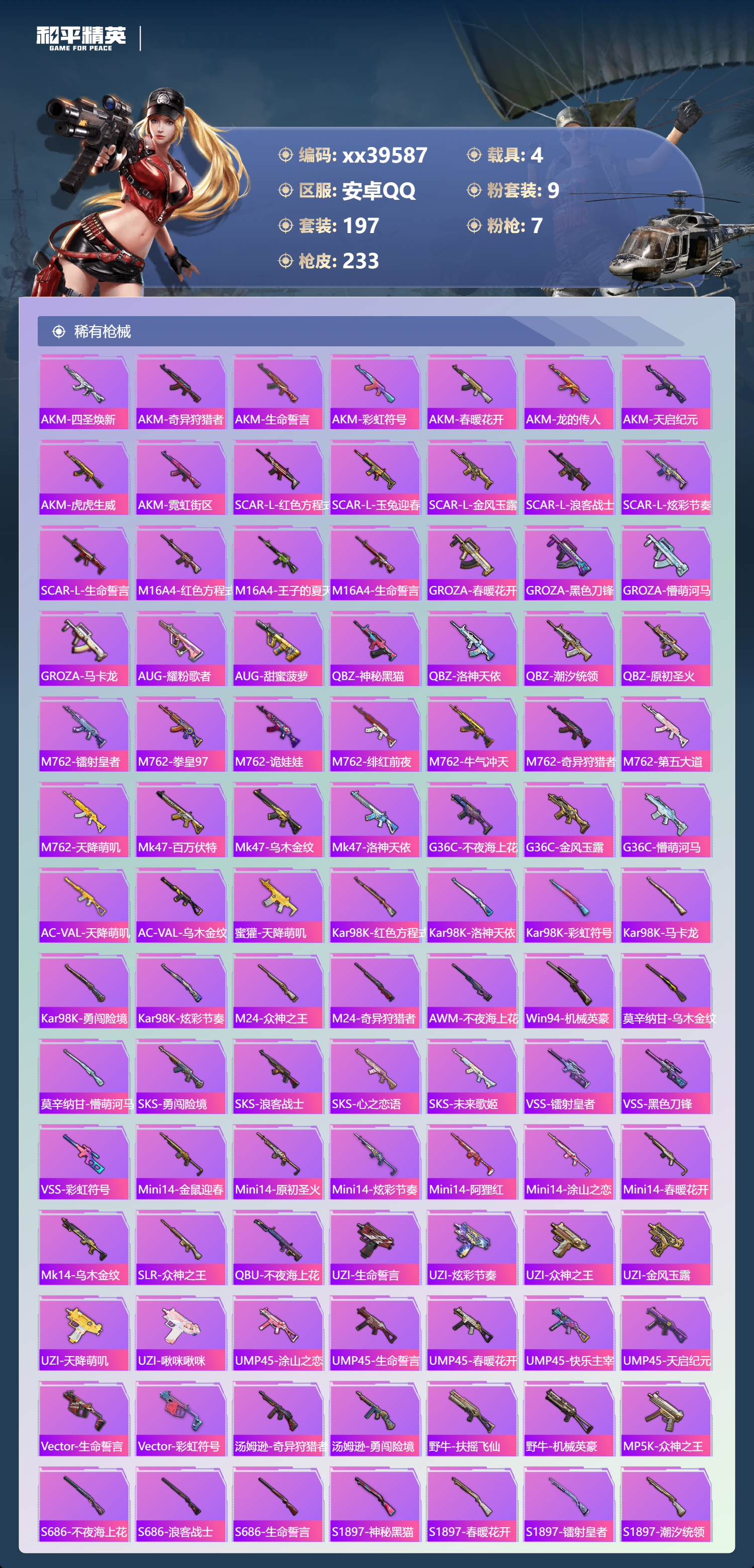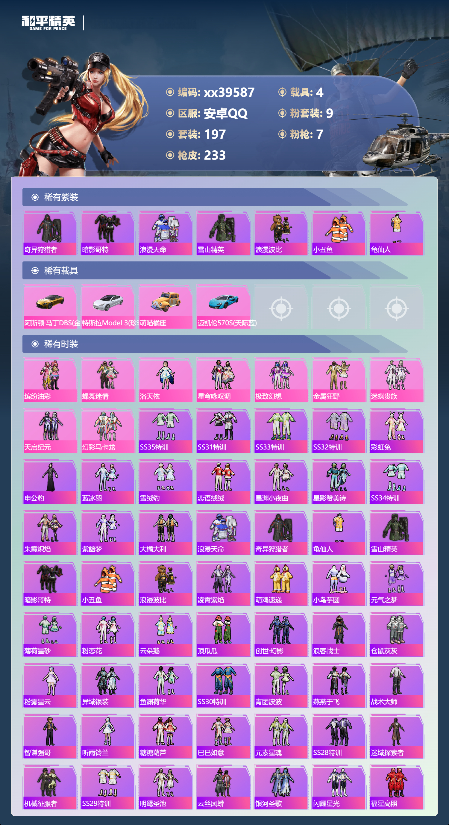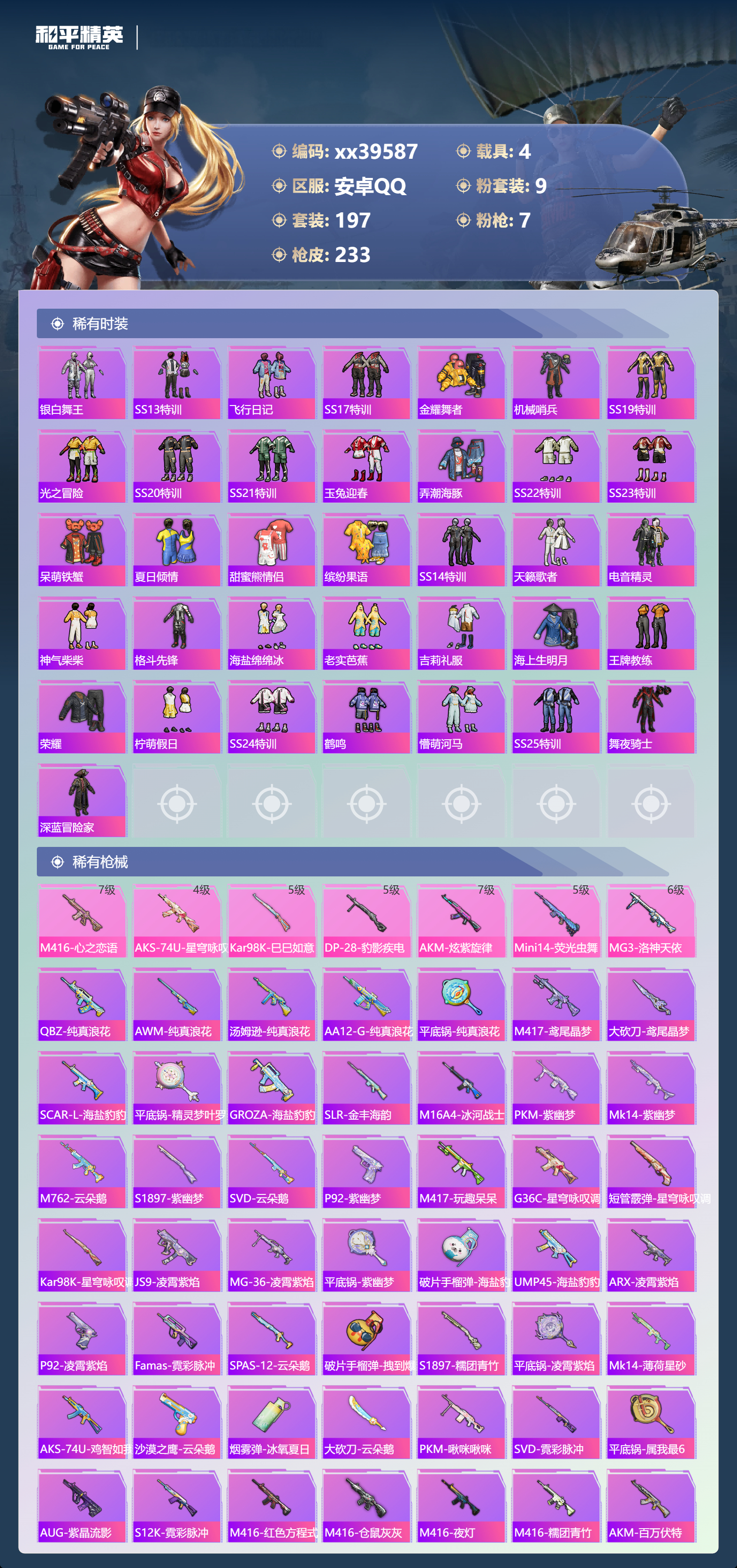 _2274519-包人脸安卓手q-13王牌印记-9粉装-7特效呛-4载具-84917热力值-197套装-233呛皮-3卓越印记-1传奇印记 【9粉装】套装-蝶舞迷情套装-缤纷油彩套装-迷蝶贵族套装-极致幻想套装-金属狂野角色-洛天依套装-幻彩马卡龙套装-星穹咏叹调套装-天启纪元 【7特效呛】akm-炫紫旋律/7级kar98k-巳巳如意/5级mg3-洛神天依/6级mini14-荧光虫舞/5级dp-28-豹影疾电/5级m416-心之恋语/7级aks-74u-星穹咏叹调/4级 【7稀有紫装】奇异狩猎者暗影哥特浪漫天命雪山精英浪漫波比小丑鱼龟仙人 【4稀有载具】阿斯顿·马丁dbs金特斯拉model3珍珠白萌喵橘座迈凯伦570s天际蓝 【197稀有时装】缤纷油彩蝶舞迷情洛天依星穹咏叹调ss35特训ss31特训ss33特训ss32特训彩虹兔申公豹蓝冰羽雪绒豹恋语绒绒星渊小夜曲星影赞美诗ss34特训朱霞炽焰紫幽梦大橘大利浪漫天命奇异狩猎者龟仙人雪山精英暗影哥特小丑鱼浪漫波比凌霄紫焰萌鸡速递小鸟芋圆元气之梦薄荷星砂粉恋花云朵鹅顶瓜瓜极致幻想金属狂野创世·幻影迷蝶贵族天启纪元幻彩马卡龙浪客战士仓鼠灰灰粉雾星云异域银装鱼渊荷华ss30特训青团波波燕燕于飞战术大师智谋强哥听雨铃兰糖糖葫芦巳巳如意元素星魂ss28特训迷域探索者机械征服者ss29特训明鸳圣池云丝凤蟒银河圣歌闪耀星光福星高照虎虎生威吉莉夏日音浪龙的传人五号元素ss8特训众神之王智慧之神萌黄之夏摇滚狂鲨特训学院海洋之心猎鹰深海来使青年教官橘黑制服红色运动黄色运动蓝色运动黄色伏地魔白色伏地魔热血青春活力之心ss9特训白月香洋装酒红色名流神秘舞者湖蓝色名流黄色名流丝绸行者酷潮明星绯格组合涂山之恋ss26特训野性山猫酷萌兔限定空岛之星热情海星炫蓝之夏纯真浪花骑行爱好者竞技名士深蓝色名流猛禽长空猛禽竞技勇士朋克特战装甲旭日情侣灰色格斗者街头潮人怒火燎原冷焰舞者魅力单车丛林猎人nv战队服传奇侦探贵族骑装甜蜜菠萝青涩时光牛气满满冰川特警极速红龙梦之呓语完美偶像人气偶像幻影武者破蛋小黄鸡朱雀圣者北国孤狼蓝彩潮人ss6特训拳皇97草薙京炽焰拳师绮丽涂鸦格斗专家坚韧舞者竞技达人朋克淡雅花蕊玲珑飞花原初圣火超能勇士逆风勇士海岛探路者跃动心情ss7特训核芯基因精神漫游破晓战魂霓虹街区ss10特训沙漠兵团闪金天王镭射皇者软萌银虎耀粉歌者风华少年志ss12特训ss27特训ss18特训银白舞王ss13特训飞行日记ss17特训金耀舞者机械哨兵ss19特训光之冒险ss20特训ss21特训玉兔迎春弄潮海豚ss22特训ss23特训呆萌铁蟹夏日倾情甜蜜熊情侣缤纷果语ss14特训天籁歌者电音精灵神气柴柴格斗先锋海盐绵绵冰老实芭蕉吉莉礼服海上生明月王牌教练荣耀柠萌假日ss24特训鹤鸣懵萌河马ss25特训舞夜骑士深蓝冒险家 【233稀有呛械】m416-心之恋语/7级q-纯真浪花awm-纯真浪花汤姆逊-纯真浪花dbs-乌木金纹aa12-g-纯真浪花平底锅-纯真浪花m417-鸢尾晶梦大砍刀-鸢尾晶梦scar-l-海盐豹豹平底锅-精灵梦叶罗丽groza-海盐豹豹aks-74u-星穹咏叹调/4级kar98k-巳巳如意/5级dp-28-豹影疾电/5级slr-金丰海韵m16a4-冰河战士mk20-h-乌木金纹akm-炫紫旋律/7级mini14-荧光虫舞/5级mg3-洛神天依/6级win94-乌木金纹pkm-紫幽梦mk14-紫幽梦蜜獾-乌木金纹m762-云朵鹅s1897-紫幽梦svd-云朵鹅p92-紫幽梦m417-玩趣呆呆g36c-星穹咏叹调短管霰弹-星穹咏叹调kar98k-星穹咏叹调js9-凌霄紫焰mg-36-凌霄紫焰平底锅-紫幽梦破片手留单-海盐豹豹ump45-海盐豹豹arx-凌霄紫焰aks-74u-乌木金纹p92-凌霄紫焰famas-乌木金纹famas-霓彩脉冲spas-12-云朵鹅破片手留单-拽到爆炸s1897-糯团青竹平底锅-凌霄紫焰mk14-薄荷星砂aks-74u-鸡智如我沙墨之鹦-云朵鹅盐雾蛋-冰氧夏日大砍刀-云朵鹅pkm-啾咪啾咪svd-霓彩脉冲平底锅-属我最6aug-紫晶流影s12k-霓彩脉冲m416-红色方程式m416-仓鼠灰灰m416-夜灯m416-糯团青竹akm-百万伏特akm-四圣焕新akm-奇异狩猎者akm-生命誓言akm-乌木金纹akm-彩虹符号akm-春暖花开akm-龙的传人akm-天启纪元akm-虎虎生威akm-霓虹街区scar-l-红色方程式scar-l-玉兔迎春scar-l-乌木金纹scar-l-金风玉露scar-l-浪客战士scar-l-炫彩节奏scar-l-生命誓言m16a4-红色方程式m16a4-王子的夏天m16a4-生命誓言groza-乌木金纹groza-春暖花开groza-黑色刀锋groza-懵萌河马groza-马卡龙aug-耀粉歌者aug-甜蜜菠萝q-神秘黑猫q-洛神天依q-潮汐统领q-原初圣火q-乌木金纹m762-镭射皇者m762-拳皇97m762-诡娃娃m762-绯红前夜m762-牛气冲天m762-奇异狩猎者m762-第五大道m762-天降萌叽mk47-百万伏特mk47-乌木金纹mk47-洛神天依g36c-不夜海上花g36c-乌木金纹g36c-金风玉露g36c-懵萌河马ac-val-天降萌叽ac-val-乌木金纹蜜獾-天降萌叽kar98k-红色方程式kar98k-洛神天依kar98k-彩虹符号kar98k-马卡龙kar98k-勇闯险境kar98k-炫彩节奏m24-乌木金纹m24-众神之王m24-奇异狩猎者awm-乌木金纹awm-不夜海上花win94-机械英豪莫辛纳甘-乌木金纹莫辛纳甘-懵萌河马amr-乌木金纹sks-勇闯险境sks-浪客战士sks-心之恋语sks-未来歌姬vss-乌木金纹vss-镭射皇者vss-黑色刀锋vss-彩虹符号mini14-金鼠迎春mini14-原初圣火mini14-乌木金纹mini14-炫彩节奏mini14-阿狸红mini14-涂山之恋mini14-春暖花开mk14-乌木金纹slr-众神之王qbu-不夜海上花uzi-生命誓言uzi-炫彩节奏uzi-众神之王uzi-金风玉露uzi-天降萌叽uzi-啾咪啾咪ump45-涂山之恋ump45-生命誓言ump45-春暖花开ump45-快乐主宰ump45-天启纪元vect-乌木金纹vect-生命誓言vect-彩虹符号汤姆逊-乌木金纹汤姆逊-奇异狩猎者