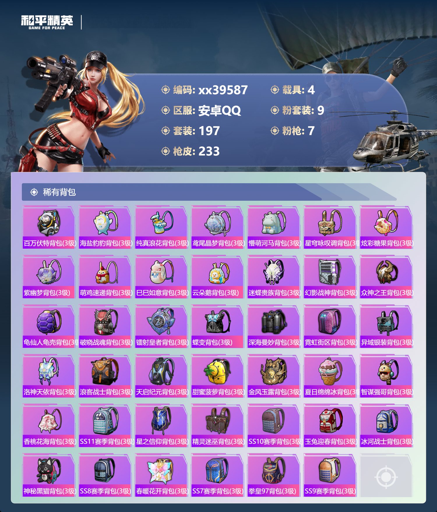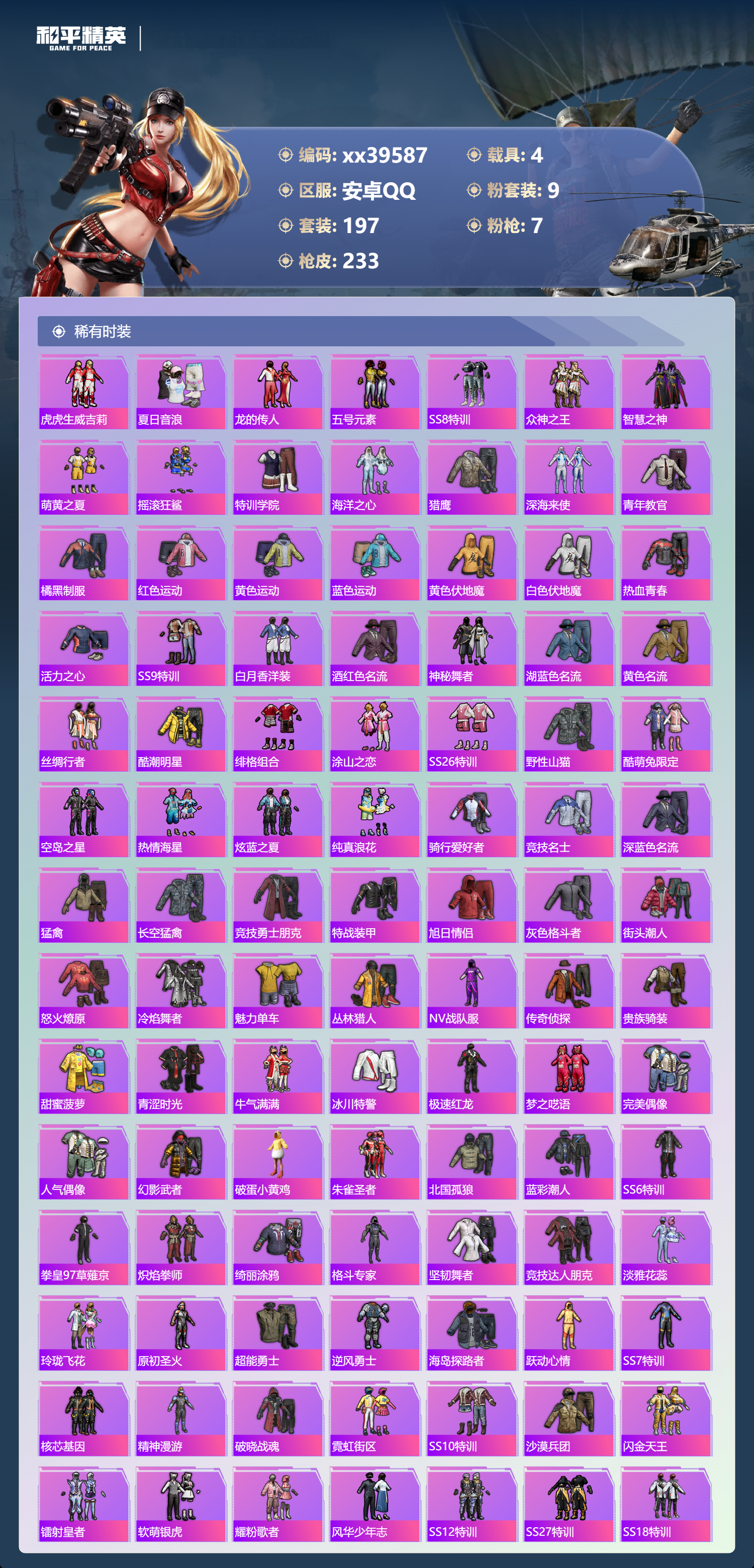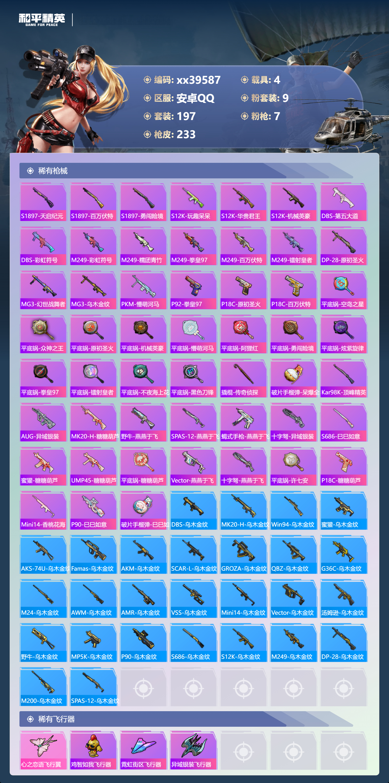 _2274519-包人脸安卓手q-13王牌印记-9粉装-7特效呛-4载具-84917热力值-197套装-233呛皮-3卓越印记-1传奇印记 【9粉装】套装-蝶舞迷情套装-缤纷油彩套装-迷蝶贵族套装-极致幻想套装-金属狂野角色-洛天依套装-幻彩马卡龙套装-星穹咏叹调套装-天启纪元 【7特效呛】akm-炫紫旋律/7级kar98k-巳巳如意/5级mg3-洛神天依/6级mini14-荧光虫舞/5级dp-28-豹影疾电/5级m416-心之恋语/7级aks-74u-星穹咏叹调/4级 【7稀有紫装】奇异狩猎者暗影哥特浪漫天命雪山精英浪漫波比小丑鱼龟仙人 【4稀有载具】阿斯顿·马丁dbs金特斯拉model3珍珠白萌喵橘座迈凯伦570s天际蓝 【197稀有时装】缤纷油彩蝶舞迷情洛天依星穹咏叹调ss35特训ss31特训ss33特训ss32特训彩虹兔申公豹蓝冰羽雪绒豹恋语绒绒星渊小夜曲星影赞美诗ss34特训朱霞炽焰紫幽梦大橘大利浪漫天命奇异狩猎者龟仙人雪山精英暗影哥特小丑鱼浪漫波比凌霄紫焰萌鸡速递小鸟芋圆元气之梦薄荷星砂粉恋花云朵鹅顶瓜瓜极致幻想金属狂野创世·幻影迷蝶贵族天启纪元幻彩马卡龙浪客战士仓鼠灰灰粉雾星云异域银装鱼渊荷华ss30特训青团波波燕燕于飞战术大师智谋强哥听雨铃兰糖糖葫芦巳巳如意元素星魂ss28特训迷域探索者机械征服者ss29特训明鸳圣池云丝凤蟒银河圣歌闪耀星光福星高照虎虎生威吉莉夏日音浪龙的传人五号元素ss8特训众神之王智慧之神萌黄之夏摇滚狂鲨特训学院海洋之心猎鹰深海来使青年教官橘黑制服红色运动黄色运动蓝色运动黄色伏地魔白色伏地魔热血青春活力之心ss9特训白月香洋装酒红色名流神秘舞者湖蓝色名流黄色名流丝绸行者酷潮明星绯格组合涂山之恋ss26特训野性山猫酷萌兔限定空岛之星热情海星炫蓝之夏纯真浪花骑行爱好者竞技名士深蓝色名流猛禽长空猛禽竞技勇士朋克特战装甲旭日情侣灰色格斗者街头潮人怒火燎原冷焰舞者魅力单车丛林猎人nv战队服传奇侦探贵族骑装甜蜜菠萝青涩时光牛气满满冰川特警极速红龙梦之呓语完美偶像人气偶像幻影武者破蛋小黄鸡朱雀圣者北国孤狼蓝彩潮人ss6特训拳皇97草薙京炽焰拳师绮丽涂鸦格斗专家坚韧舞者竞技达人朋克淡雅花蕊玲珑飞花原初圣火超能勇士逆风勇士海岛探路者跃动心情ss7特训核芯基因精神漫游破晓战魂霓虹街区ss10特训沙漠兵团闪金天王镭射皇者软萌银虎耀粉歌者风华少年志ss12特训ss27特训ss18特训银白舞王ss13特训飞行日记ss17特训金耀舞者机械哨兵ss19特训光之冒险ss20特训ss21特训玉兔迎春弄潮海豚ss22特训ss23特训呆萌铁蟹夏日倾情甜蜜熊情侣缤纷果语ss14特训天籁歌者电音精灵神气柴柴格斗先锋海盐绵绵冰老实芭蕉吉莉礼服海上生明月王牌教练荣耀柠萌假日ss24特训鹤鸣懵萌河马ss25特训舞夜骑士深蓝冒险家 【233稀有呛械】m416-心之恋语/7级q-纯真浪花awm-纯真浪花汤姆逊-纯真浪花dbs-乌木金纹aa12-g-纯真浪花平底锅-纯真浪花m417-鸢尾晶梦大砍刀-鸢尾晶梦scar-l-海盐豹豹平底锅-精灵梦叶罗丽groza-海盐豹豹aks-74u-星穹咏叹调/4级kar98k-巳巳如意/5级dp-28-豹影疾电/5级slr-金丰海韵m16a4-冰河战士mk20-h-乌木金纹akm-炫紫旋律/7级mini14-荧光虫舞/5级mg3-洛神天依/6级win94-乌木金纹pkm-紫幽梦mk14-紫幽梦蜜獾-乌木金纹m762-云朵鹅s1897-紫幽梦svd-云朵鹅p92-紫幽梦m417-玩趣呆呆g36c-星穹咏叹调短管霰弹-星穹咏叹调kar98k-星穹咏叹调js9-凌霄紫焰mg-36-凌霄紫焰平底锅-紫幽梦破片手留单-海盐豹豹ump45-海盐豹豹arx-凌霄紫焰aks-74u-乌木金纹p92-凌霄紫焰famas-乌木金纹famas-霓彩脉冲spas-12-云朵鹅破片手留单-拽到爆炸s1897-糯团青竹平底锅-凌霄紫焰mk14-薄荷星砂aks-74u-鸡智如我沙墨之鹦-云朵鹅盐雾蛋-冰氧夏日大砍刀-云朵鹅pkm-啾咪啾咪svd-霓彩脉冲平底锅-属我最6aug-紫晶流影s12k-霓彩脉冲m416-红色方程式m416-仓鼠灰灰m416-夜灯m416-糯团青竹akm-百万伏特akm-四圣焕新akm-奇异狩猎者akm-生命誓言akm-乌木金纹akm-彩虹符号akm-春暖花开akm-龙的传人akm-天启纪元akm-虎虎生威akm-霓虹街区scar-l-红色方程式scar-l-玉兔迎春scar-l-乌木金纹scar-l-金风玉露scar-l-浪客战士scar-l-炫彩节奏scar-l-生命誓言m16a4-红色方程式m16a4-王子的夏天m16a4-生命誓言groza-乌木金纹groza-春暖花开groza-黑色刀锋groza-懵萌河马groza-马卡龙aug-耀粉歌者aug-甜蜜菠萝q-神秘黑猫q-洛神天依q-潮汐统领q-原初圣火q-乌木金纹m762-镭射皇者m762-拳皇97m762-诡娃娃m762-绯红前夜m762-牛气冲天m762-奇异狩猎者m762-第五大道m762-天降萌叽mk47-百万伏特mk47-乌木金纹mk47-洛神天依g36c-不夜海上花g36c-乌木金纹g36c-金风玉露g36c-懵萌河马ac-val-天降萌叽ac-val-乌木金纹蜜獾-天降萌叽kar98k-红色方程式kar98k-洛神天依kar98k-彩虹符号kar98k-马卡龙kar98k-勇闯险境kar98k-炫彩节奏m24-乌木金纹m24-众神之王m24-奇异狩猎者awm-乌木金纹awm-不夜海上花win94-机械英豪莫辛纳甘-乌木金纹莫辛纳甘-懵萌河马amr-乌木金纹sks-勇闯险境sks-浪客战士sks-心之恋语sks-未来歌姬vss-乌木金纹vss-镭射皇者vss-黑色刀锋vss-彩虹符号mini14-金鼠迎春mini14-原初圣火mini14-乌木金纹mini14-炫彩节奏mini14-阿狸红mini14-涂山之恋mini14-春暖花开mk14-乌木金纹slr-众神之王qbu-不夜海上花uzi-生命誓言uzi-炫彩节奏uzi-众神之王uzi-金风玉露uzi-天降萌叽uzi-啾咪啾咪ump45-涂山之恋ump45-生命誓言ump45-春暖花开ump45-快乐主宰ump45-天启纪元vect-乌木金纹vect-生命誓言vect-彩虹符号汤姆逊-乌木金纹汤姆逊-奇异狩猎者