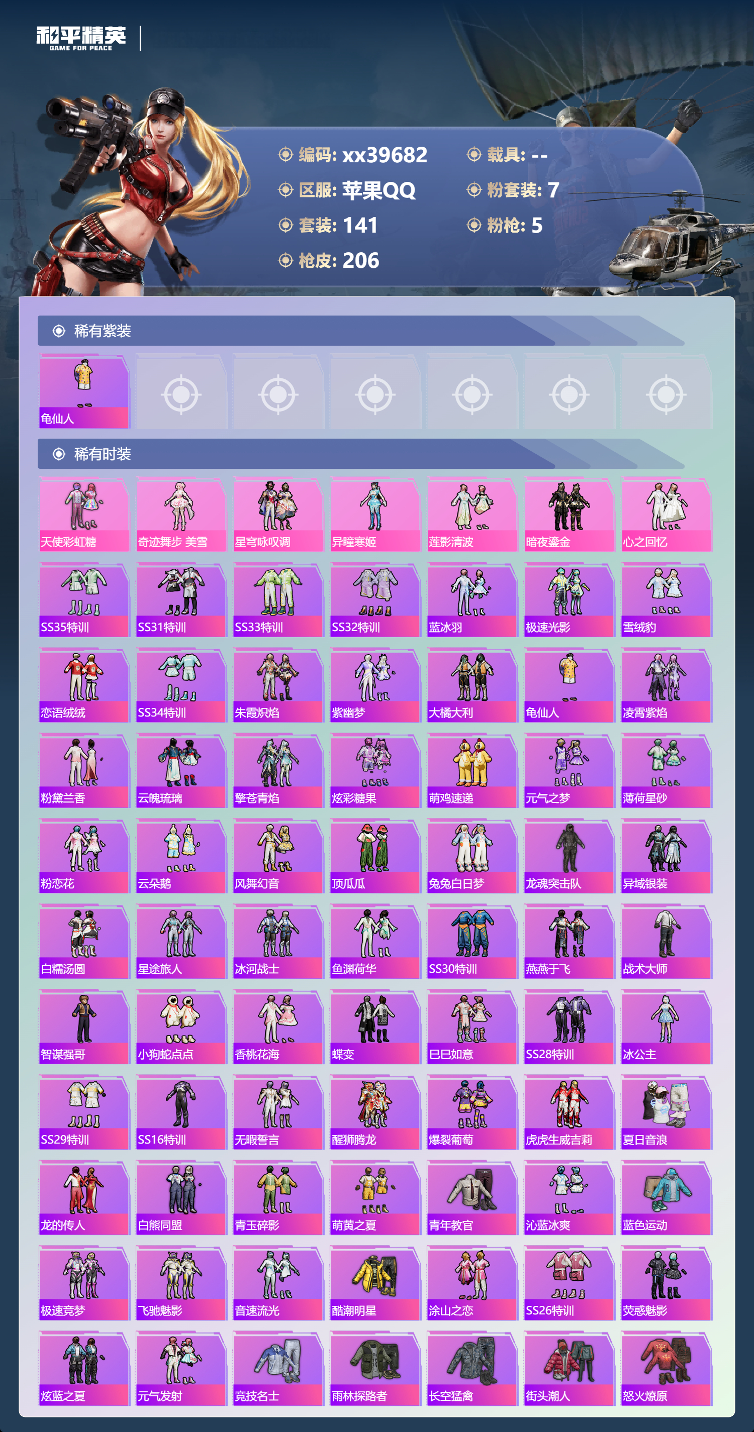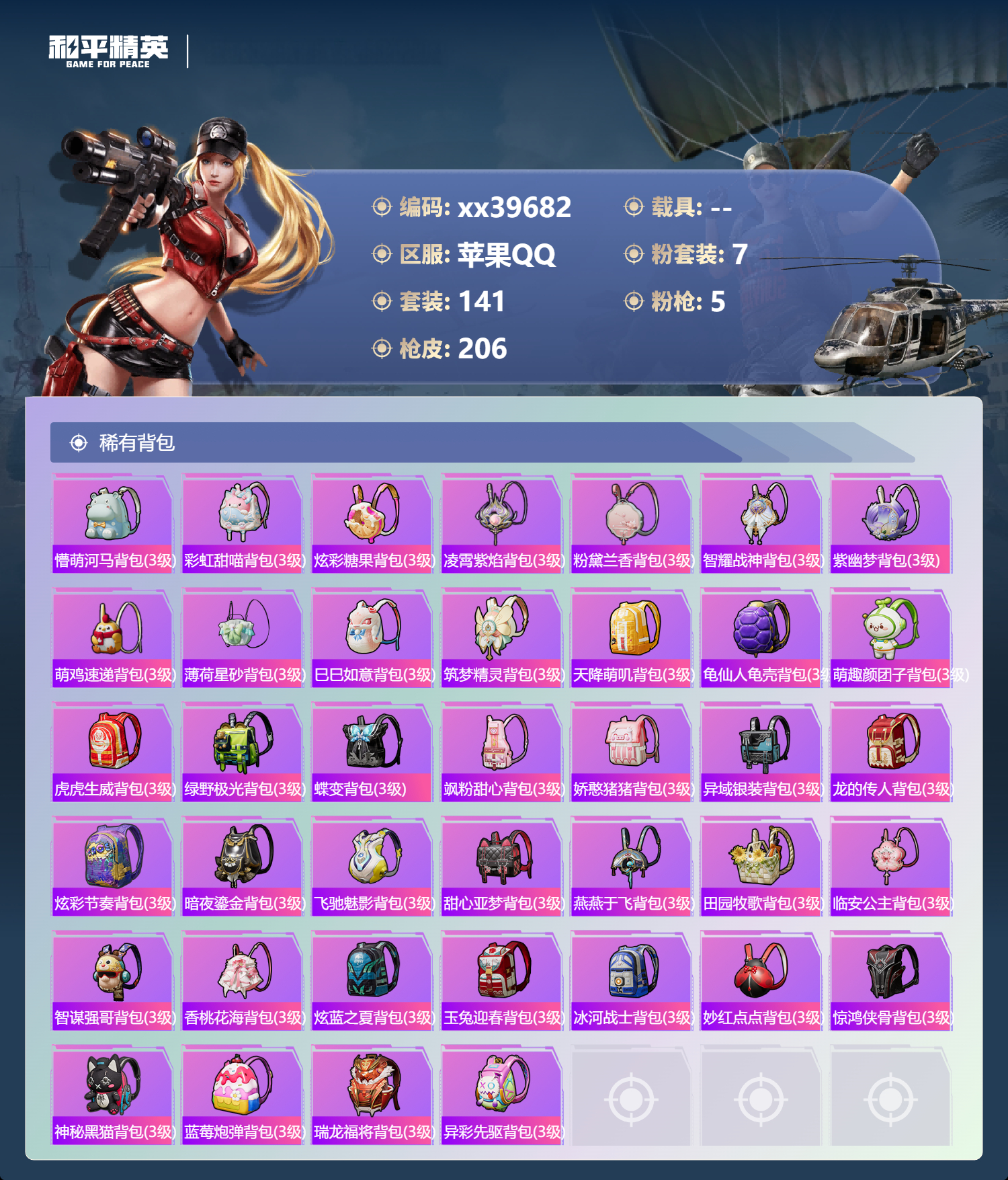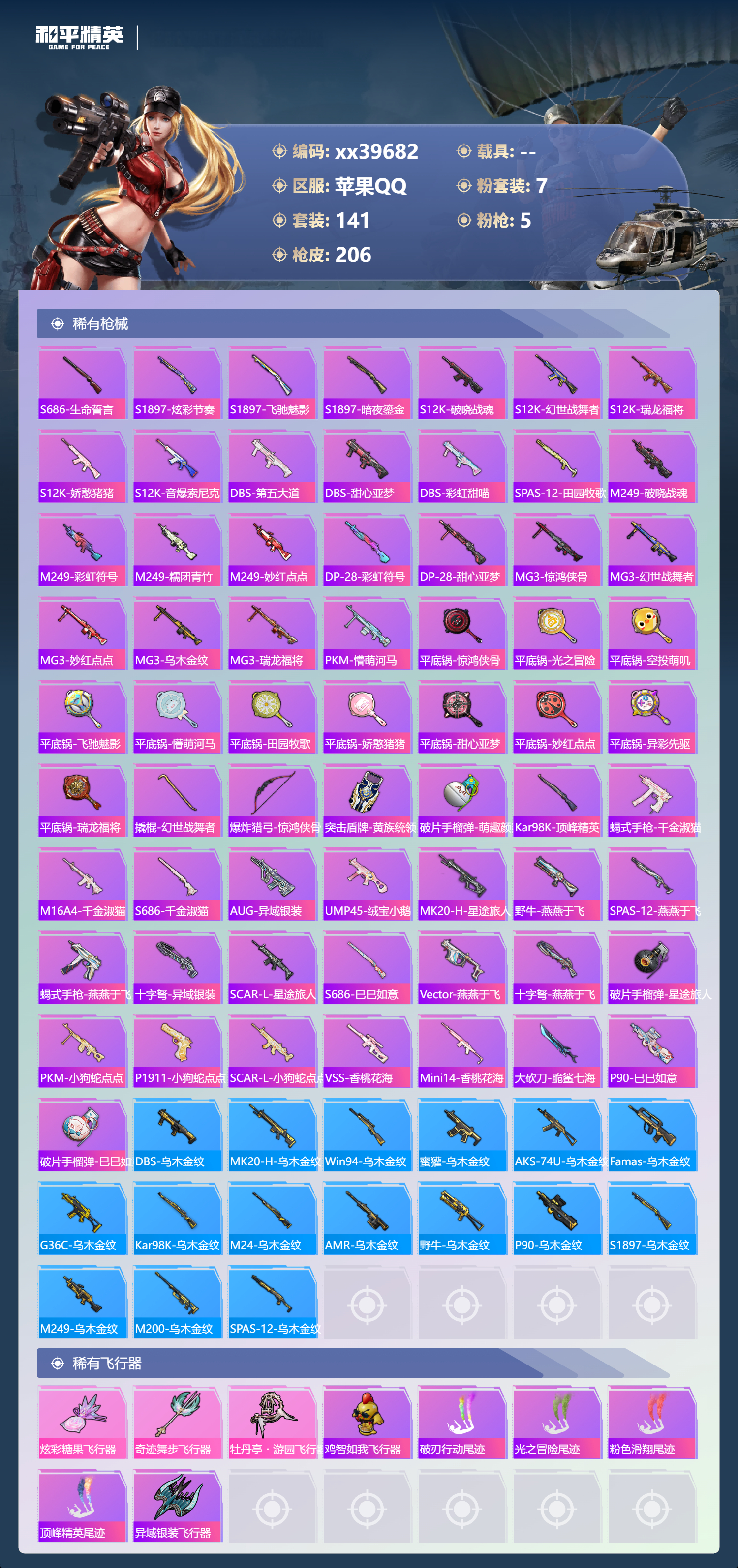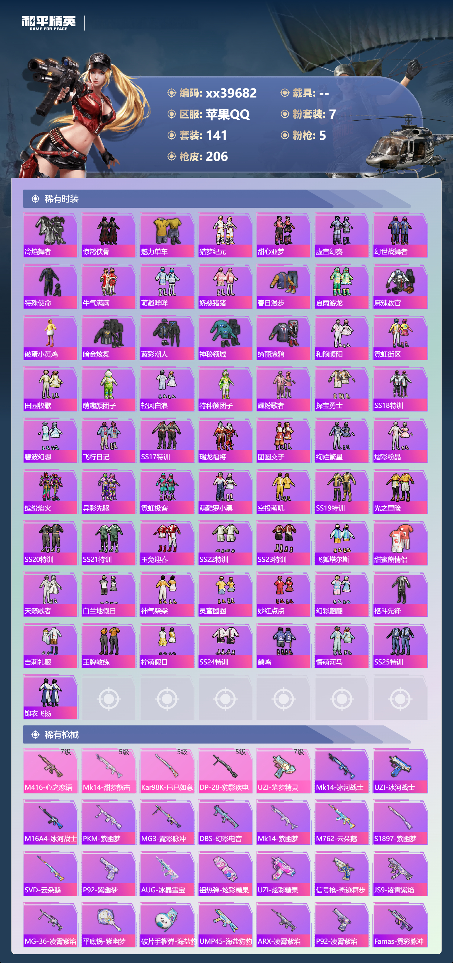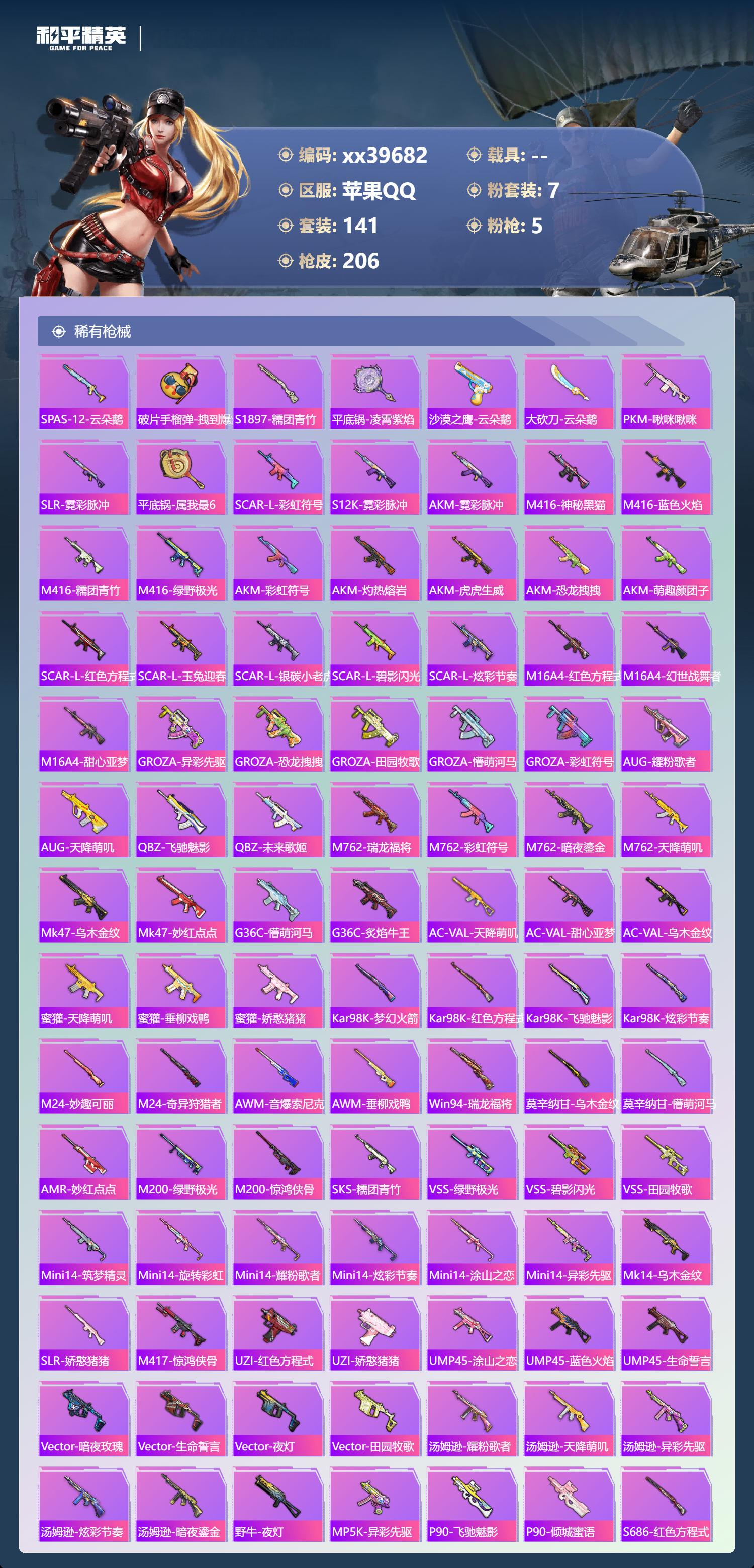 _2274502-可二次苹果手q-14王牌印记-7粉装-5特效呛-63482热力值-141套装-206呛皮-1卓越印记-1传奇印记 【7粉装】角色-奇迹舞步美雪套装-星穹咏叹调套装-暗夜鎏金套装-莲影清波套装-天使彩虹糖套装-心之回忆角色-异瞳寒姬 【5特效呛】kar98k-巳巳如意/5级dp-28-豹影疾电/5级mk14-甜梦熊击/5级uzi-筑梦精灵/7级m416-心之恋语/7级 【1稀有紫装】龟仙人 【141稀有时装】天使彩虹糖奇迹舞步美雪星穹咏叹调异瞳寒姬ss35特训ss31特训ss33特训ss32特训蓝冰羽极速光影雪绒豹恋语绒绒ss34特训朱霞炽焰紫幽梦大橘大利龟仙人凌霄紫焰粉黛兰香云魄琉璃擎苍青焰炫彩糖果萌鸡速递元气之梦薄荷星砂粉恋花云朵鹅风舞幻音顶瓜瓜莲影清波暗夜鎏金心之回忆兔兔白日梦龙魂突击队异域银装白糯汤圆星途旅人冰河战士鱼渊荷华ss30特训燕燕于飞战术大师智谋强哥小狗蛇点点香桃花海蝶变巳巳如意ss28特训冰公主ss29特训ss16特训无暇誓言醒狮腾龙爆裂葡萄虎虎生威吉莉夏日音浪龙的传人白熊同盟青玉碎影萌黄之夏青年教官沁蓝冰爽蓝色运动极速竞梦飞驰魅影音速流光酷潮明星涂山之恋ss26特训荧惑魅影炫蓝之夏元气发射竞技名士雨林探路者长空猛禽街头潮人怒火燎原冷焰舞者惊鸿侠骨魅力单车猎梦纪元甜心亚梦虚音幻奏幻世战舞者特殊使命牛气满满萌趣咩咩娇憨猪猪春日漫步夏雨游龙麻辣教官破蛋小黄鸡暗金炫舞蓝彩潮人神秘领域绮丽涂鸦和煦暖阳霓虹街区田园牧歌萌趣颜团子轻风白浪特种颜团子耀粉歌者探宝勇士ss18特训碧波幻想飞行日记ss17特训瑞龙福将团圆交子绚烂繁星熠彩粉晶缤纷焰火异彩先驱霓虹极客萌酷罗小黑空投萌叽ss19特训光之冒险ss20特训ss21特训玉兔迎春ss22特训ss23特训飞狐塔尔斯甜蜜熊情侣天籁歌者白兰地假日神气柴柴灵蜜圈圈妙红点点幻彩翩翩格斗先锋吉莉礼服王牌教练柠萌假日ss24特训鹤鸣懵萌河马ss25特训锦衣飞扬 【206稀有呛械】m416-心之恋语/7级dbs-乌木金纹mk14-甜梦熊击/5级kar98k-巳巳如意/5级dp-28-豹影疾电/5级mk14-冰河战士uzi-冰河战士m16a4-冰河战士mk20-h-乌木金纹uzi-筑梦精灵/7级win94-乌木金纹pkm-紫幽梦mg3-霓彩脉冲dbs-幻彩电音mk14-紫幽梦蜜獾-乌木金纹m762-云朵鹅s1897-紫幽梦svd-云朵鹅p92-紫幽梦aug-冰晶雪宝铝热弹-炫彩糖果uzi-炫彩糖果信号呛-奇迹舞步js9-凌霄紫焰mg-36-凌霄紫焰平底锅-紫幽梦破片手留单-海盐豹豹ump45-海盐豹豹arx-凌霄紫焰aks-74u-乌木金纹p92-凌霄紫焰famas-乌木金纹famas-霓彩脉冲spas-12-云朵鹅破片手留单-拽到爆炸s1897-糯团青竹平底锅-凌霄紫焰沙墨之鹦-云朵鹅大砍刀-云朵鹅pkm-啾咪啾咪slr-霓彩脉冲平底锅-属我最6scar-l-彩虹符号s12k-霓彩脉冲akm-霓彩脉冲m416-神秘黑猫m416-蓝色火焰m416-糯团青竹m416-绿野极光akm-彩虹符号akm-灼热熔岩akm-虎虎生威akm-恐龙拽拽akm-萌趣颜团子scar-l-红色方程式scar-l-玉兔迎春scar-l-银碳小老虎scar-l-碧影闪光scar-l-炫彩节奏m16a4-红色方程式m16a4-幻世战舞者m16a4-甜心亚梦groza-异彩先驱groza-恐龙拽拽groza-田园牧歌groza-懵萌河马groza-彩虹符号aug-耀粉歌者aug-天降萌叽q-飞驰魅影q-未来歌姬m762-瑞龙福将m762-彩虹符号m762-暗夜鎏金m762-天降萌叽mk47-乌木金纹mk47-妙红点点g36c-乌木金纹g36c-懵萌河马g36c-炙焰牛王ac-val-天降萌叽ac-val-甜心亚梦ac-val-乌木金纹蜜獾-天降萌叽蜜獾-垂柳戏鸭蜜獾-娇憨猪猪kar98k-乌木金纹kar98k-梦幻火箭kar98k-红色方程式kar98k-飞驰魅影kar98k-炫彩节奏m24-乌木金纹m24-妙趣可丽m24-奇异狩猎者awm-音爆索尼克awm-垂柳戏鸭win94-瑞龙福将莫辛纳甘-乌木金纹莫辛纳甘-懵萌河马amr-乌木金纹amr-妙红点点m200-绿野极光m200-惊鸿侠骨sks-糯团青竹vss-绿野极光vss-碧影闪光vss-田园牧歌mini14-筑梦精灵mini14-旋转彩虹mini14-耀粉歌者mini14-炫彩节奏mini14-涂山之恋mini14-异彩先驱mk14-乌木金纹slr-娇憨猪猪m417-惊鸿侠骨uzi-红色方程式uzi-娇憨猪猪ump45-涂山之恋ump45-蓝色火焰ump45-生命誓言vect-暗夜玫瑰vect-生命誓言vect-夜灯vect-田园牧歌汤姆逊-耀粉歌者汤姆逊-天降萌叽汤姆逊-异彩先驱汤姆逊-炫彩节奏汤姆逊-暗夜鎏金野牛-乌木金纹野牛-夜灯mp5k-异彩先驱p90-乌木金纹p90-飞驰魅影p90-倾城蜜语s686-红色方程式s686-生命誓言s1897-乌木金纹s1897-炫彩节奏s1897-飞驰魅影s1897-暗夜鎏金s12k-破晓战魂s12k-幻世战舞者s12k-瑞龙福将s12k-娇憨猪猪s12k-音爆索尼克dbs-第五大道dbs-甜心亚梦dbs-彩虹甜喵spas-12-田园牧歌m249-破晓战魂m249-彩虹符号m249-糯团青竹m249-乌木金纹m249-妙红点点dp-28-彩虹符号dp-28-甜心亚梦mg3-惊鸿侠骨mg3-幻世战舞者mg3-妙红点点mg3-乌木金纹mg3-瑞龙福将pkm-懵萌河马平底锅-惊鸿侠骨平底锅-光之冒险平底锅-空投萌叽平底锅-飞驰魅影平底锅-懵萌河马平底锅-田园牧歌平底锅-娇憨猪猪平底锅-甜心亚梦平底锅-妙红点点平底锅-异彩先驱平底锅-瑞龙福将撬棍-幻世战舞者爆炸猎弓-惊鸿侠骨突击盾牌-黄族统领破片手留单-萌趣颜团子kar98k-顶峰精英蝎式手呛-千金淑猫m16a4-千金淑猫s686-千金淑猫aug-异域银装ump45-绒宝小鹅mk20-h-星途旅人野牛-燕燕于飞m200-乌木金纹spas-12-燕燕于飞蝎式手呛-燕燕于飞十子怒-异域银装scar-l-星途旅人s686-巳巳如意spas-12-乌木金纹vect-燕燕于飞十子怒-燕燕于飞破片手留单-星途旅人pkm-小狗蛇点点p1911-小狗蛇点点scar-l-小狗蛇点点vss-香桃花海mini14-香桃花海大砍刀-脆鲨七海p90-巳巳如意破片手留单-巳巳如意 【9稀有