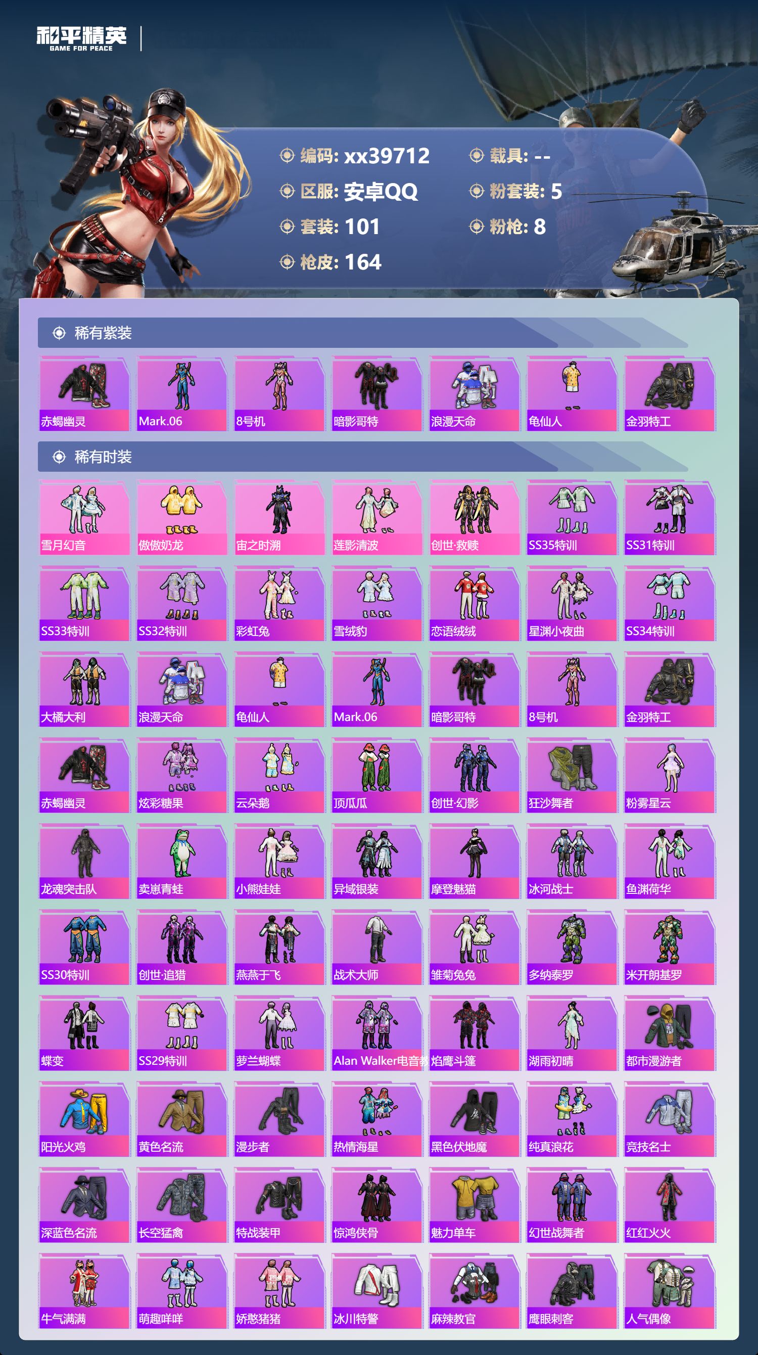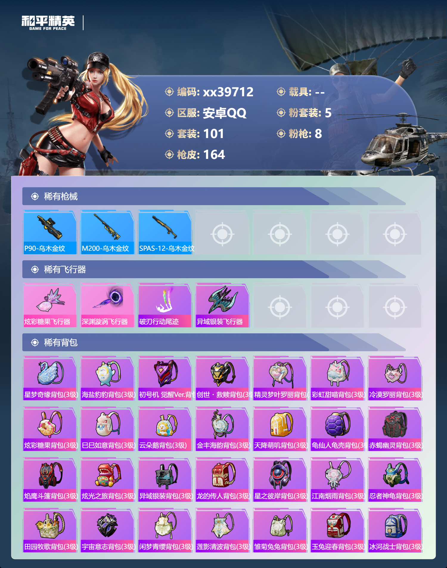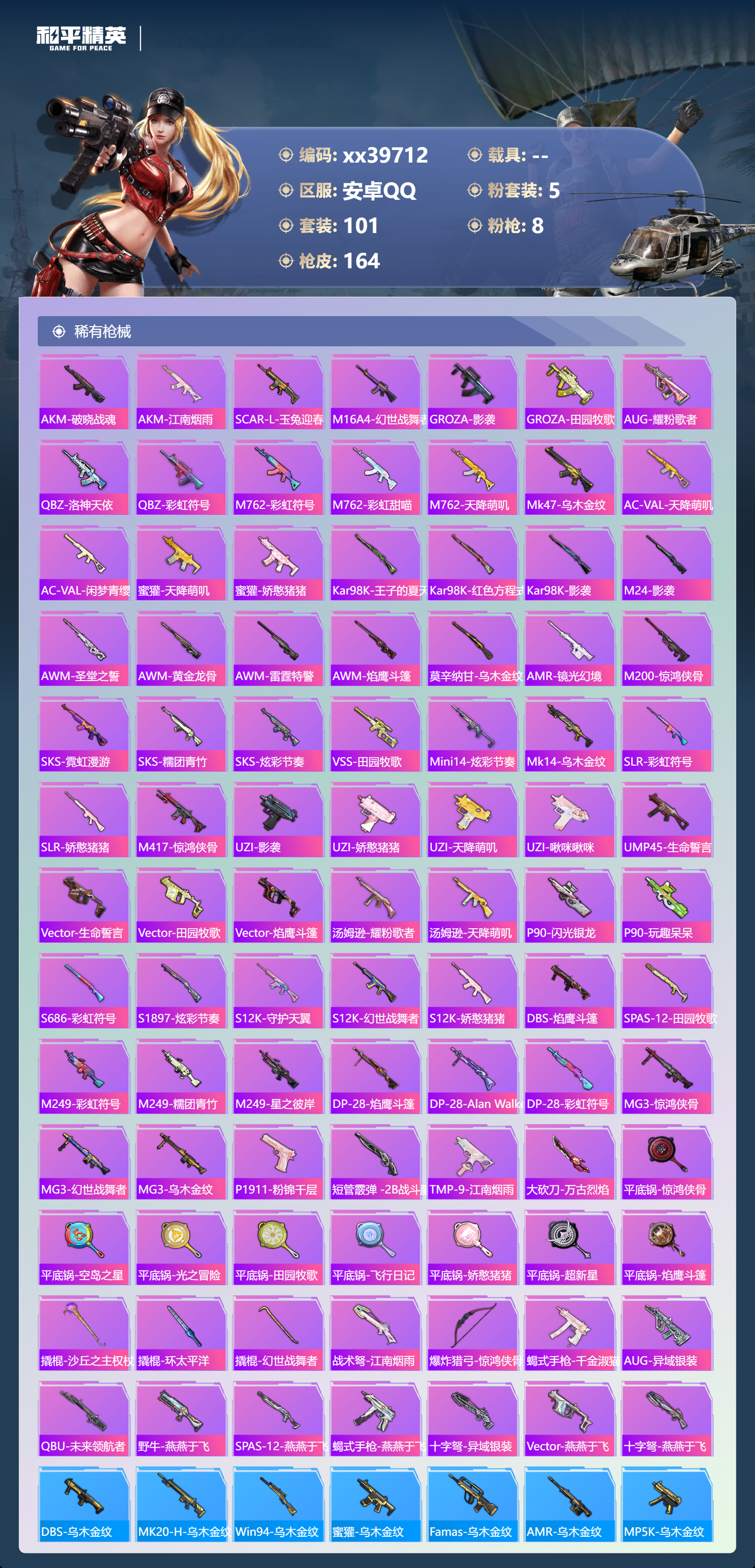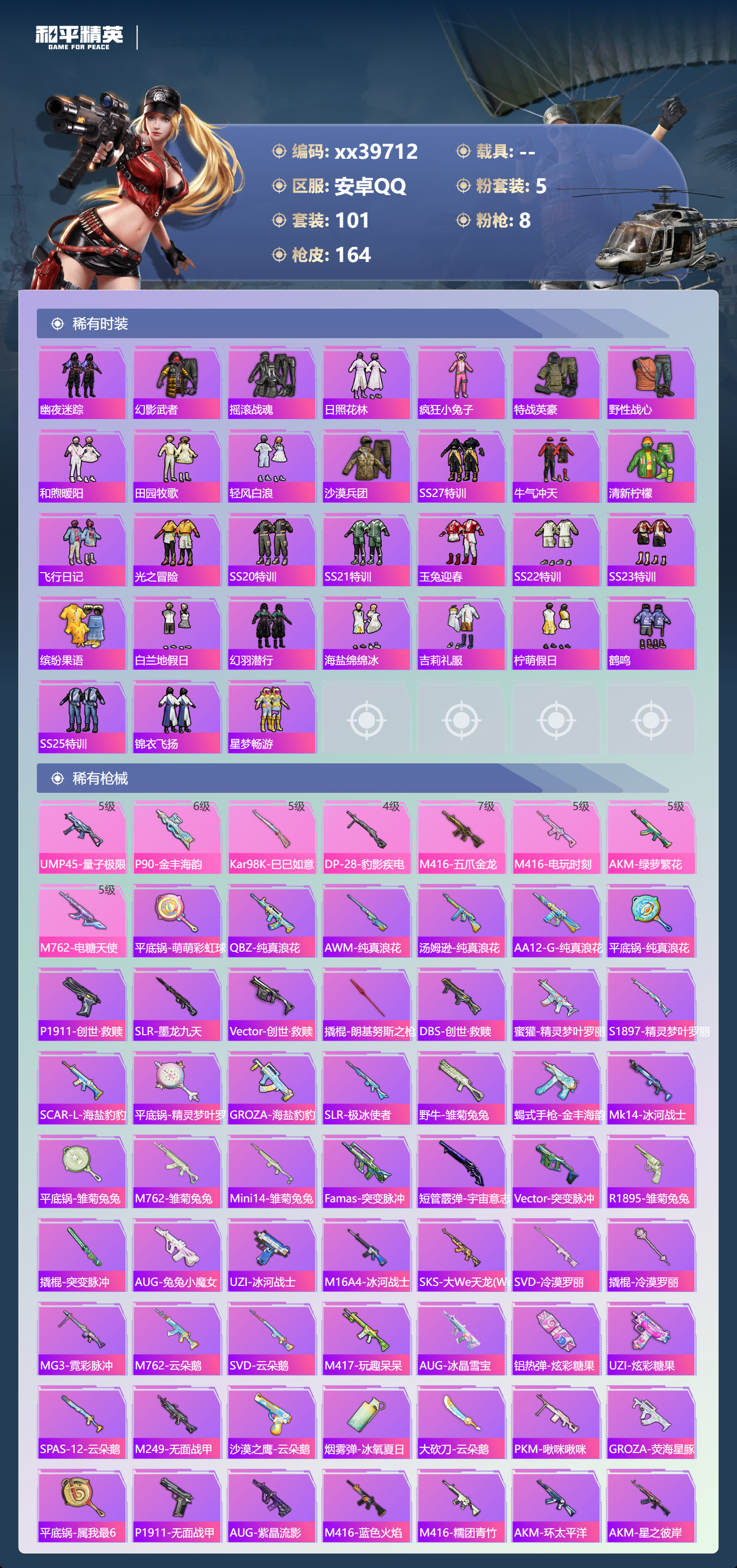 _2274500-包人脸安卓手q-6王牌印记-5粉装-8特效呛-48915热力值-101套装-164呛皮-2卓越印记 【5粉装】套装-创世·救赎套装-傲傲奶龙角色-宙之时溯套装-雪月幻音套装-莲影清波 【8特效呛】m416-五爪金龙/7级ump45-量子极限/5级m416-电玩时刻/5级p90-金丰海韵/6级dp-28-豹影疾电/4级akm-绿萝繁花/5级m762-电糖天使/5级kar98k-巳巳如意/5级 【7稀有紫装】赤蝎幽灵mark.068号机暗影哥特浪漫天命龟仙人金羽特工 【101稀有时装】雪月幻音ss35特训ss31特训ss33特训ss32特训彩虹兔雪绒豹恋语绒绒星渊小夜曲ss34特训大橘大利浪漫天命龟仙人mark.06暗影哥特8号机金羽特工赤蝎幽灵炫彩糖果云朵鹅顶瓜瓜傲傲奶龙创世·幻影宙之时溯莲影清波创世·救赎狂沙舞者粉雾星云龙魂突击队卖崽青蛙小熊娃娃异域银装摩登魅猫冰河战士鱼渊荷华ss30特训创世·追猎燕燕于飞战术大师雏菊兔兔多纳泰罗米开朗基罗蝶变ss29特训萝兰蝴蝶alanwalker电音教主焰鹰斗篷湖雨初晴都市漫游者阳光火鸡黄色名流漫步者热情海星黑色伏地魔纯真浪花竞技名士深蓝色名流长空猛禽特战装甲惊鸿侠骨魅力单车幻世战舞者红红火火牛气满满萌趣咩咩娇憨猪猪冰川特警麻辣教官鹰眼刺客人气偶像幽夜迷踪幻影武者摇滚战魂日照花林疯狂小兔子特战英豪野性战心和煦暖阳田园牧歌轻风白浪沙漠兵团ss27特训牛气冲天清新柠檬飞行日记光之冒险ss20特训ss21特训玉兔迎春ss22特训ss23特训缤纷果语白兰地假日幻羽潜行海盐绵绵冰吉莉礼服柠萌假日鹤鸣ss25特训锦衣飞扬星梦畅游 【164稀有呛械】平底锅-萌萌彩虹球ump45-量子极限/5级q-纯真浪花awm-纯真浪花汤姆逊-纯真浪花dbs-乌木金纹aa12-g-纯真浪花平底锅-纯真浪花p1911-创世·救赎slr-墨龙九天vect-创世·救赎撬棍-朗基努斯之呛dbs-创世·救赎蜜獾-精灵梦叶罗丽s1897-精灵梦叶罗丽scar-l-海盐豹豹平底锅-精灵梦叶罗丽groza-海盐豹豹p90-金丰海韵/6级kar98k-巳巳如意/5级dp-28-豹影疾电/4级slr-极冰使者野牛-雏菊兔兔蝎式手呛-金丰海韵mk14-冰河战士平底锅-雏菊兔兔m762-雏菊兔兔mini14-雏菊兔兔famas-突变脉冲短管霰弹-宇宙意志vect-突变脉冲r1895-雏菊兔兔撬棍-突变脉冲aug-兔兔小魔女uzi-冰河战士m16a4-冰河战士mk20-h-乌木金纹m416-五爪金龙/7级m416-电玩时刻/5级akm-绿萝繁花/5级m762-电糖天使/5级win94-乌木金纹sks-大we天龙wegamesvd-冷漠罗丽撬棍-冷漠罗丽mg3-霓彩脉冲蜜獾-乌木金纹m762-云朵鹅svd-云朵鹅m417-玩趣呆呆aug-冰晶雪宝铝热弹-炫彩糖果uzi-炫彩糖果famas-乌木金纹spas-12-云朵鹅m249-无面战甲沙墨之鹦-云朵鹅盐雾蛋-冰氧夏日大砍刀-云朵鹅pkm-啾咪啾咪groza-荧海星豚平底锅-属我最6p1911-无面战甲aug-紫晶流影m416-蓝色火焰m416-糯团青竹akm-环太平洋akm-星之彼岸akm-破晓战魂akm-江南烟雨scar-l-玉兔迎春m16a4-幻世战舞者groza-影袭groza-田园牧歌aug-耀粉歌者q-洛神天依q-彩虹符号m762-彩虹符号m762-彩虹甜喵m762-天降萌叽mk47-乌木金纹ac-val-天降萌叽ac-val-闲梦青缨蜜獾-天降萌叽蜜獾-娇憨猪猪kar98k-王子的夏天kar98k-红色方程式kar98k-影袭m24-影袭awm-圣堂之誓awm-黄金龙骨awm-雷霆特警awm-焰鹰斗篷莫辛纳甘-乌木金纹amr-乌木金纹amr-镜光幻境m200-惊鸿侠骨sks-霓虹漫游sks-糯团青竹sks-炫彩节奏vss-田园牧歌mini14-炫彩节奏mk14-乌木金纹slr-彩虹符号slr-娇憨猪猪m417-惊鸿侠骨uzi-影袭uzi-娇憨猪猪uzi-天降萌叽uzi-啾咪啾咪ump45-生命誓言vect-生命誓言vect-田园牧歌vect-焰鹰斗篷汤姆逊-耀粉歌者汤姆逊-天降萌叽mp5k-乌木金纹p90-乌木金纹p90-闪光银龙p90-玩趣呆呆s686-彩虹符号s1897-炫彩节奏s12k-守护天翼s12k-幻世战舞者s12k-娇憨猪猪dbs-焰鹰斗篷spas-12-田园牧歌m249-彩虹符号m249-糯团青竹m249-星之彼岸dp-28-焰鹰斗篷dp-28-alanwalker潮音版dp-28-彩虹符号mg3-惊鸿侠骨mg3-幻世战舞者mg3-乌木金纹p1911-粉锦千层短管霰弹-2b战斗服款tmp-9-江南烟雨大砍刀-万古烈焰平底锅-惊鸿侠骨平底锅-空岛之星平底锅-光之冒险平底锅-田园牧歌平底锅-飞行日记平底锅-娇憨猪猪平底锅-超新星平底锅-焰鹰斗篷撬棍-沙丘之主权杖撬棍-环太平洋撬棍-幻世战舞者战术弩-江南烟雨爆炸猎弓-惊鸿侠骨蝎式手呛-千金淑猫aug-异域银装qbu-未来领航者野牛-燕燕于飞m200-乌木金纹spas-12-燕燕于飞蝎式手呛-燕燕于飞十子怒-异域银装spas-12-乌木金纹vect-燕燕于飞十子怒-燕燕于飞 【4稀有飞行器】炫彩糖果飞行器破刃行动尾迹深渊漩涡飞行器异域银装飞行器 【28稀有背包】星梦奇缘背包3级海盐豹豹背包3级初号机觉醒ver.背包3级创世・救赎背包3级精灵梦叶罗丽背包3级彩虹甜喵背包3级冷漠罗丽背包3级炫彩糖果背包3级巳巳如意背包3级云朵鹅背包3级金丰海韵背包3级天降萌叽背包3级龟仙人龟壳背包3级赤蝎幽灵背包3级焰鹰斗篷背包3级炫光之旅背包3级异域银装背包3级龙的传人背包3级星之彼岸背包3级江南烟雨背包3级忍者神龟背包3级田园牧歌背包3级宇宙意志背包3级闲梦青缨背包3级莲影清波背包3级雏菊兔兔背包3级玉兔迎春背包3级冰河战士背包3级