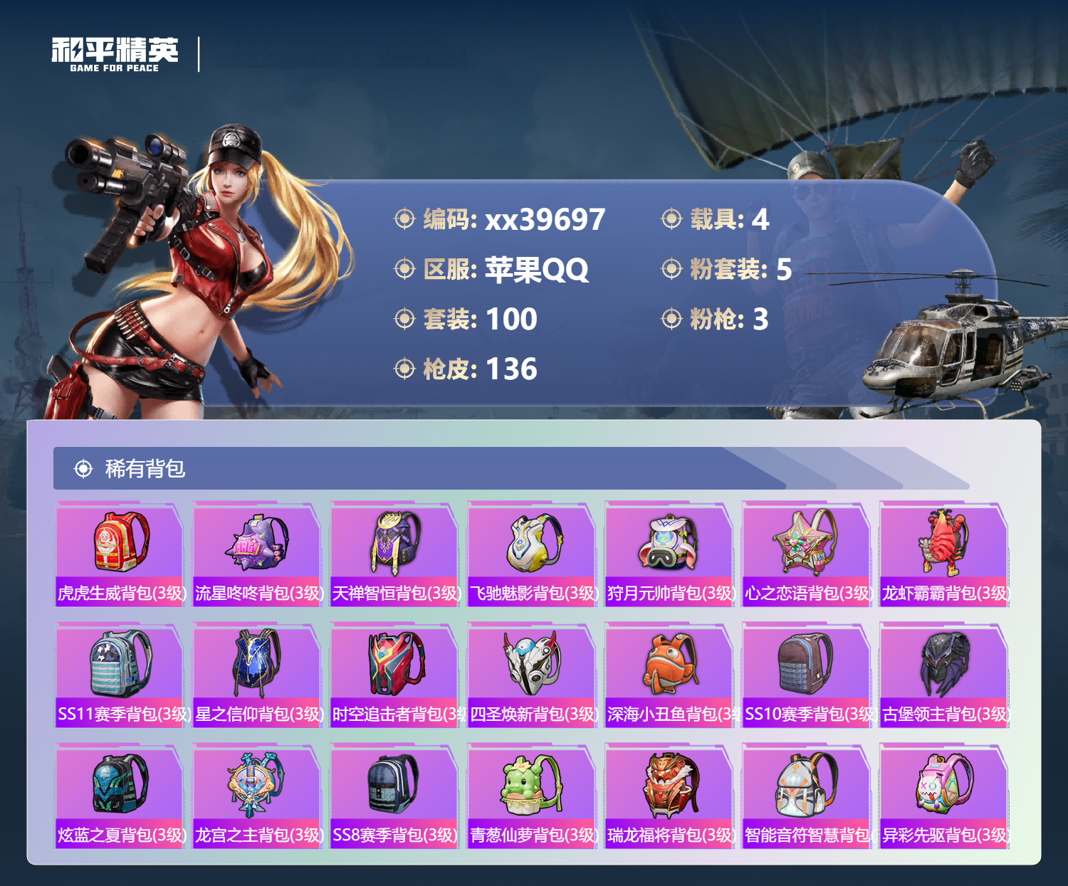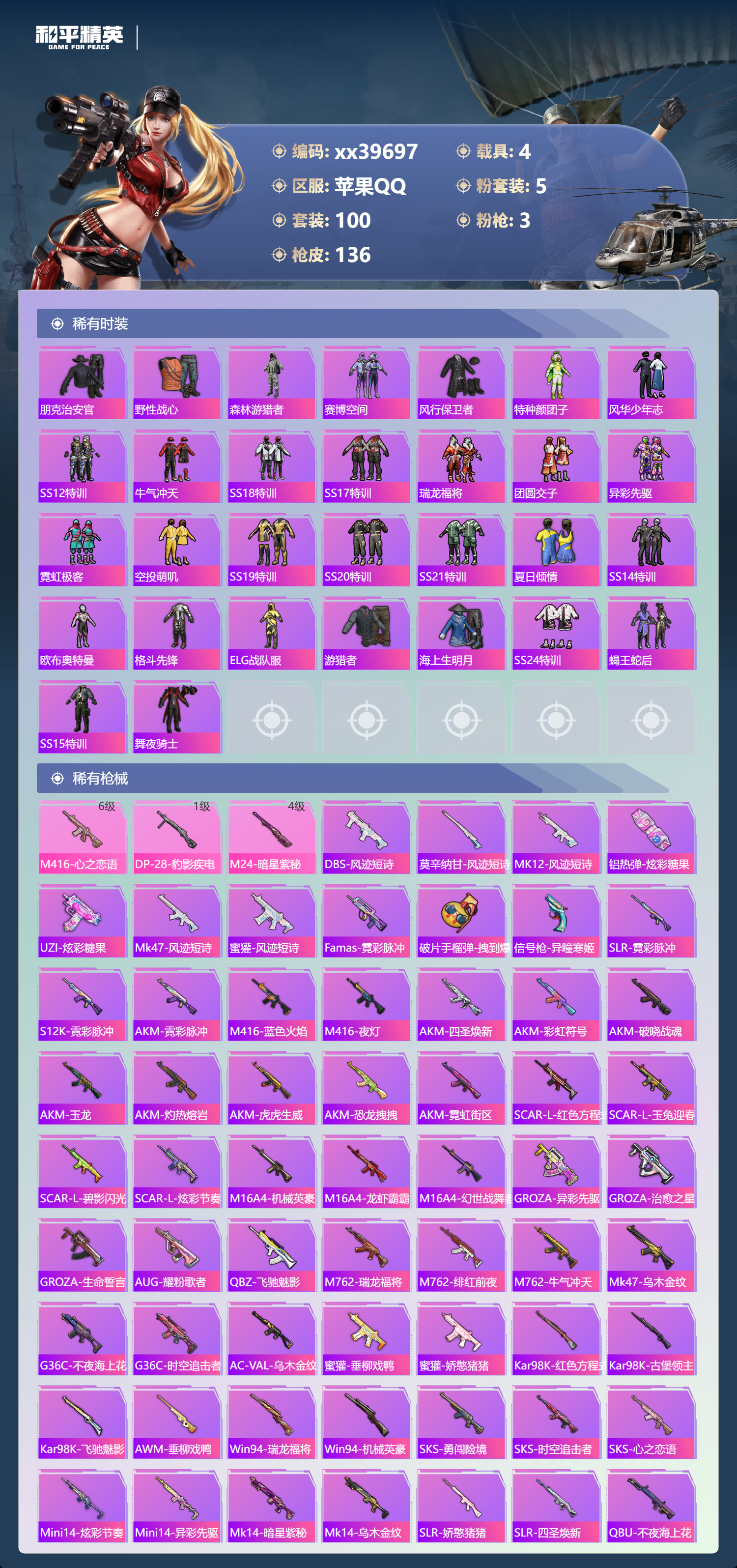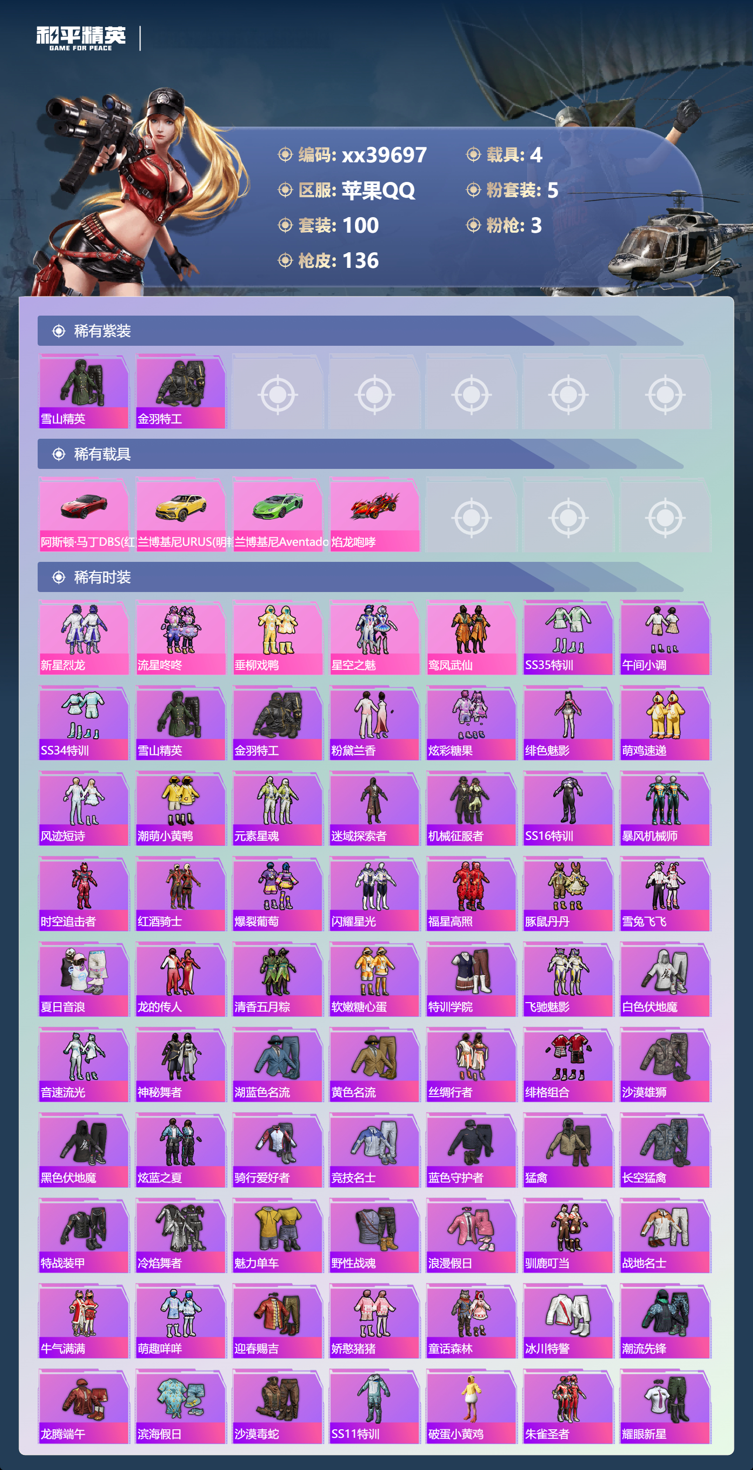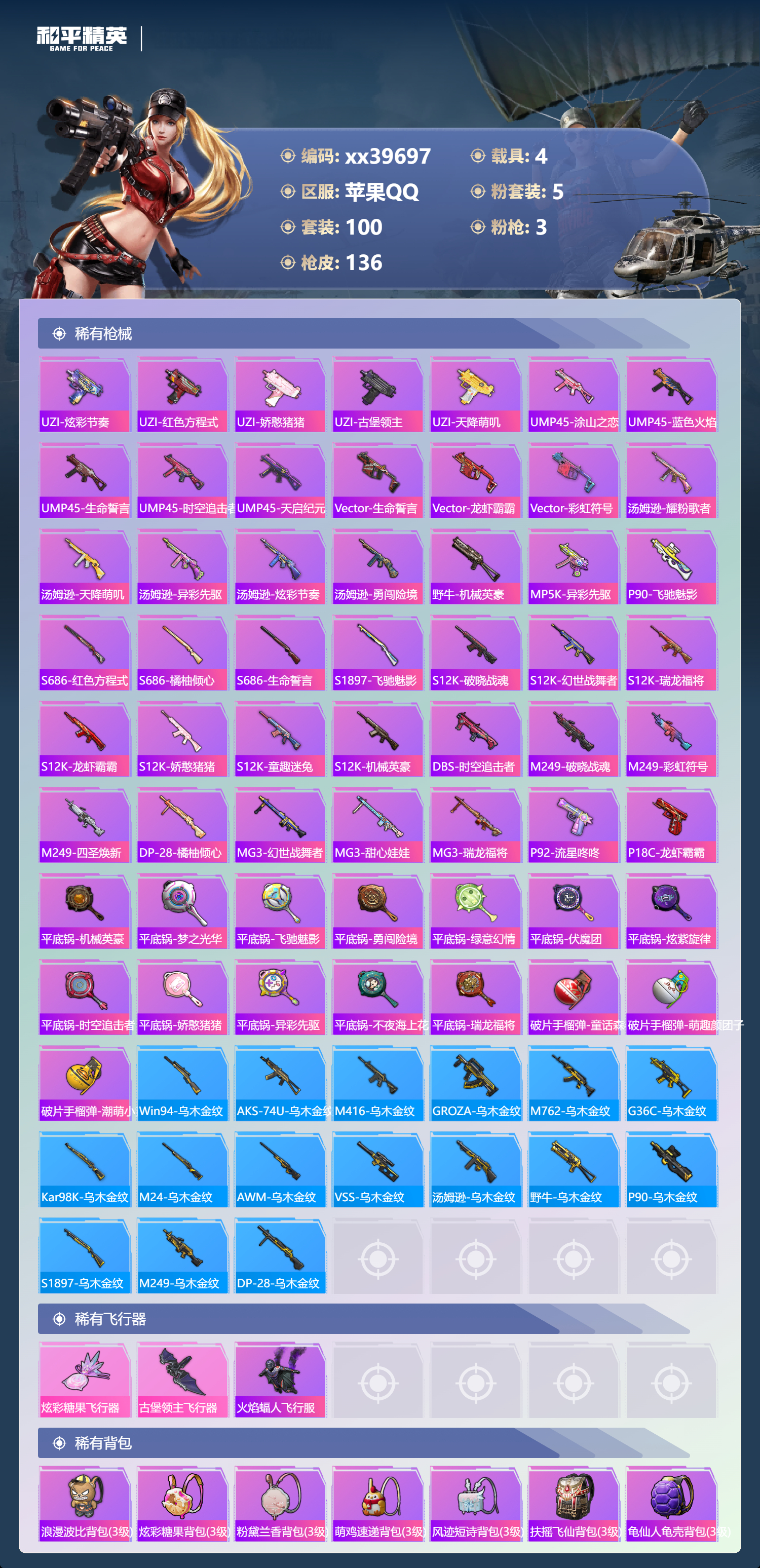 _2274501-包人脸苹果手q-6王牌印记-5粉装-3特效呛-4载具-46001热力值-100套装-136呛皮 【5粉装】套装-流星咚咚套装-星空之魅套装-垂柳戏鸭套装-鸾凤武仙套装-新星烈龙 【3特效呛】m416-心之恋语/6级m24-暗星紫秘/4级dp-28-豹影疾电/1级 【2稀有紫装】雪山精英金羽特工 【4稀有载具】阿斯顿·马丁dbs红兰博基尼urus明艳黄兰博基尼aventadsvj翡翠绿焰龙咆哮 【100稀有时装】新星烈龙ss35特训午间小调ss34特训雪山精英金羽特工粉黛兰香炫彩糖果绯色魅影萌鸡速递风迹短诗流星咚咚垂柳戏鸭星空之魅鸾凤武仙潮萌小黄鸭元素星魂迷域探索者机械征服者ss16特训暴风机械师时空追击者红酒骑士爆裂葡萄闪耀星光福星高照豚鼠丹丹雪兔飞飞夏日音浪龙的传人清香五月粽软嫩糖心蛋特训学院飞驰魅影白色伏地魔音速流光神秘舞者湖蓝色名流黄色名流丝绸行者绯格组合沙漠雄狮黑色伏地魔炫蓝之夏骑行爱好者竞技名士蓝色守护者猛禽长空猛禽特战装甲冷焰舞者魅力单车野性战魂浪漫假日驯鹿叮当战地名士牛气满满萌趣咩咩迎春赐吉娇憨猪猪童话森林冰川特警潮流先锋龙腾端午滨海假日沙漠毒蛇ss11特训破蛋小黄鸡朱雀圣者耀眼新星朋克治安官野性战心森林游猎者赛博空间风行保卫者特种颜团子风华少年志ss12特训牛气冲天ss18特训ss17特训瑞龙福将团圆交子异彩先驱霓虹极客空投萌叽ss19特训ss20特训ss21特训夏日倾情ss14特训欧布奥特曼格斗先锋elg战队服游猎者海上生明月ss24特训蝎王蛇后ss15特训舞夜骑士 【136稀有呛械】m416-心之恋语/6级dp-28-豹影疾电/1级m24-暗星紫秘/4级dbs-风迹短诗莫辛纳甘-风迹短诗win94-乌木金纹mk12-风迹短诗铝热弹-炫彩糖果uzi-炫彩糖果mk47-风迹短诗aks-74u-乌木金纹蜜獾-风迹短诗famas-霓彩脉冲破片手留单-拽到爆炸信号呛-异瞳寒姬slr-霓彩脉冲s12k-霓彩脉冲akm-霓彩脉冲m416-乌木金纹m416-蓝色火焰m416-夜灯akm-四圣焕新akm-彩虹符号akm-破晓战魂akm-玉龙akm-灼热熔岩akm-虎虎生威akm-恐龙拽拽akm-霓虹街区scar-l-红色方程式scar-l-玉兔迎春scar-l-碧影闪光scar-l-炫彩节奏m16a4-机械英豪m16a4-龙虾霸霸m16a4-幻世战舞者groza-乌木金纹groza-异彩先驱groza-治愈之星groza-生命誓言aug-耀粉歌者q-飞驰魅影m762-瑞龙福将m762-乌木金纹m762-绯红前夜m762-牛气冲天mk47-乌木金纹g36c-不夜海上花g36c-乌木金纹g36c-时空追击者ac-val-乌木金纹蜜獾-垂柳戏鸭蜜獾-娇憨猪猪kar98k-乌木金纹kar98k-红色方程式kar98k-古堡领主kar98k-飞驰魅影m24-乌木金纹awm-乌木金纹awm-垂柳戏鸭win94-瑞龙福将win94-机械英豪sks-勇闯险境sks-时空追击者sks-心之恋语vss-乌木金纹mini14-炫彩节奏mini14-异彩先驱mk14-暗星紫秘mk14-乌木金纹slr-娇憨猪猪slr-四圣焕新qbu-不夜海上花uzi-炫彩节奏uzi-红色方程式uzi-娇憨猪猪uzi-古堡领主uzi-天降萌叽ump45-涂山之恋ump45-蓝色火焰ump45-生命誓言ump45-时空追击者ump45-天启纪元vect-生命誓言vect-龙虾霸霸vect-彩虹符号汤姆逊-耀粉歌者汤姆逊-天降萌叽汤姆逊-乌木金纹汤姆逊-异彩先驱汤姆逊-炫彩节奏汤姆逊-勇闯险境野牛-乌木金纹野牛-机械英豪mp5k-异彩先驱p90-乌木金纹p90-飞驰魅影s686-红色方程式s686-橘柚倾心s686-生命誓言s1897-乌木金纹s1897-飞驰魅影s12k-破晓战魂s12k-幻世战舞者s12k-瑞龙福将s12k-龙虾霸霸s12k-娇憨猪猪s12k-童趣迷兔s12k-机械英豪dbs-时空追击者m249-破晓战魂m249-彩虹符号m249-乌木金纹m249-四圣焕新dp-28-橘柚倾心dp-28-乌木金纹mg3-幻世战舞者mg3-甜心娃娃mg3-瑞龙福将p92-流星咚咚p18c-龙虾霸霸平底锅-机械英豪平底锅-梦之光华平底锅-飞驰魅影平底锅-勇闯险境平底锅-绿意幻情平底锅-伏魔团平底锅-炫紫旋律平底锅-时空追击者平底锅-娇憨猪猪平底锅-异彩先驱平底锅-不夜海上花平底锅-瑞龙福将破片手留单-童话森林破片手留单-萌趣颜团子破片手留单-潮萌小黄鸭 【3稀有飞行器】炫彩糖果飞行器火焰蝠人飞行服古堡领主飞行器 【28稀有背包】浪漫波比背包3级炫彩糖果背包3级粉黛兰香背包3级萌鸡速递背包3级风迹短诗背包3级扶摇飞仙背包3级龟仙人龟壳背包3级虎虎生威背包3级流星咚咚背包3级天禅智恒背包3级飞驰魅影背包3级狩月元帅背包3级心之恋语背包3级龙虾霸霸背包3级ss11赛季背包3级星之信仰背包3级时空追击者背包3级四圣焕新背包3级深海小丑鱼背包3级ss10赛季背包3级古堡领主背包3级炫蓝之夏背包3级龙宫之主背包3级ss8赛季背包3级青葱仙萝背包3级瑞龙福将背包3级智能音符智慧背包3级异彩先驱背包3级