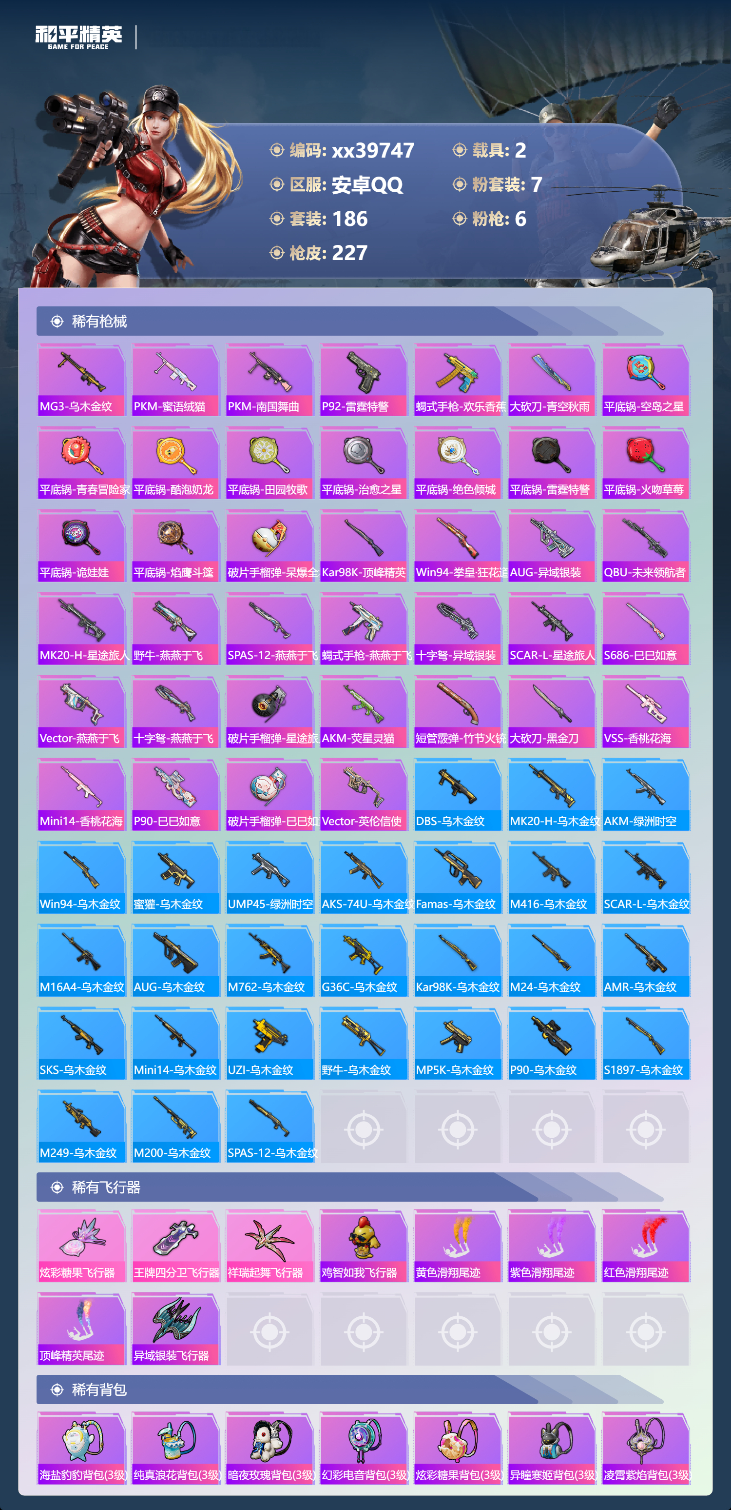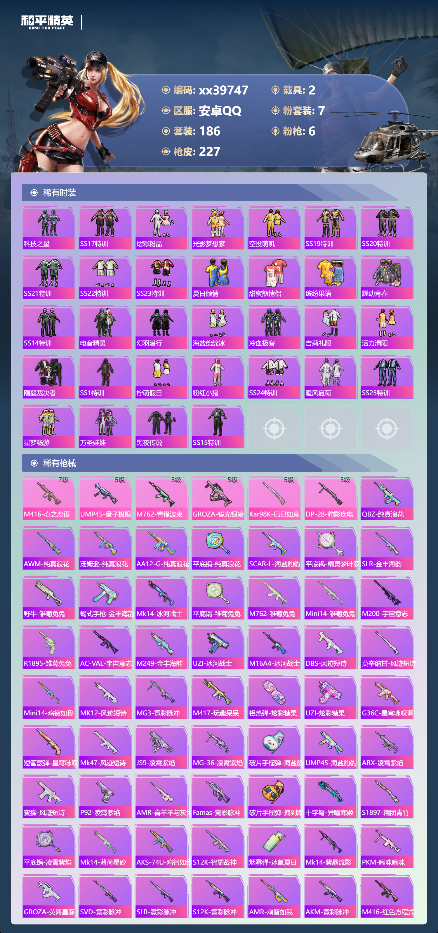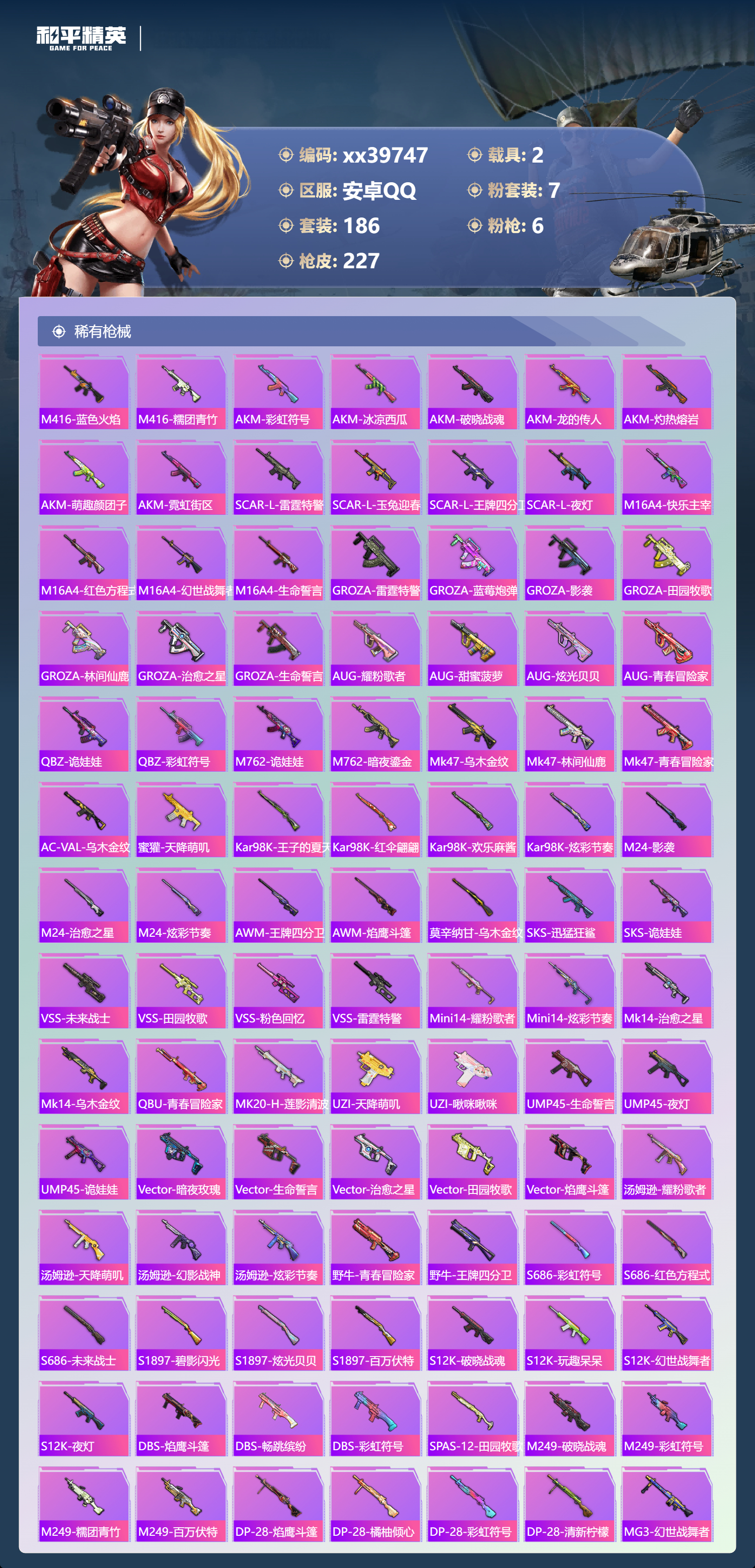 _2277393-可二次安卓手q-13王牌印记-7粉装-6特效呛-2载具-75031热力值-186套装-227呛皮-3卓越印记-1传奇印记 【7粉装】角色-异瞳寒姬套装-傲傲奶龙角色-樱桃泡泡角色-茉莉星套装-蓝莓炮弹套装-金丰海韵角色-呆萌星弥 【6特效呛】groza-镜光银凌/5级ump45-量子极限/5级dp-28-豹影疾电/5级m762-青锋波束/5级m416-心之恋语/7级kar98k-巳巳如意/5级 【4稀有紫装】派对舞王雪山精英龟仙人临安公主 【2稀有载具】玛莎拉蒂ghibli金时空跃影星辉银 【1僚机】僚机-萌兔起飞 【186稀有时装】异瞳寒姬ss35特训午间小调ss31特训ss33特训ss32特训白辉玉蕊时希公主恋语绒绒星影赞美诗ss34特训朱霞炽焰大橘大利龟仙人临安公主雪山精英游乐美羊羊凌霄紫焰云魄琉璃擎苍青焰炫彩糖果绯色魅影萌鸡速递元气之梦风迹短诗漫游都市薄荷星砂秘语星愿派对舞王傲傲奶龙蓝莓炮弹茉莉星樱桃泡泡金丰海韵呆萌星弥狂战萌兔龙魂突击队小熊娃娃异域银装白糯汤圆街头风暴星途旅人冰河战士鱼渊荷华ss30特训创世·追猎燕燕于飞战术大师智谋强哥雏菊兔兔香桃花海蝶变巳巳如意湖畔霞光元素星魂ss28特训ss29特训萝兰蝴蝶皇家花园ss16特训华灯初上焰鹰斗篷童真绒兔豚鼠丹丹龙的传人黄色格斗者击剑大师超能拳王特训学院猎鹰青年教官橘黑制服红色运动黄色运动蓝色运动黄色伏地魔白色伏地魔热血青春冰川格斗者帅气教官酒红色名流湖蓝色名流黄色名流酷潮明星绯格组合ss26特训漫步者热情海星黑色伏地魔炫蓝之夏纯真浪花竞技名士深蓝色名流猛禽雨林探路者长空猛禽特战装甲战地菁英灰色格斗者街头潮人冷焰舞者魅力单车灼焰舞者夜莺强袭者ss2特训派对绅士极地朋克幻世战舞者战地督导甜蜜菠萝半糖蓝莓午夜朋克青涩时光特种空勤和平特警风暴特警冰川特警雷霆特警幻影公爵极速红龙鹰眼刺客花羊椰椰ss3特训攀登者完美偶像灵动马戏师人气偶像ss4特训幻影武者梦魇先生青春冒险家破蛋小黄鸡潮流游乐家疯狂小兔子圣诞大吉蓝彩潮人绮丽涂鸦耀眼新星坚韧舞者竞技达人朋克海岛探路者破晓战魂霓虹街区都市魅力萌趣颜团子轻风白浪耀粉歌者探宝勇士ss12特训ss27特训牛气冲天ss18特训治愈之星科技之星ss17特训熠彩粉晶光影梦想家空投萌叽ss19特训ss20特训ss21特训ss22特训ss23特训夏日倾情甜蜜熊情侣缤纷果语耀动青春ss14特训电音精灵幻羽潜行海盐绵绵冰冷血极客吉莉礼服活力清阳刚毅裁决者ss1特训柠萌假日粉红小猪ss24特训暖风夏荷ss25特训星梦畅游万圣娃娃黑夜传说ss15特训 【227稀有呛械】m416-心之恋语/7级ump45-量子极限/5级q-纯真浪花awm-纯真浪花汤姆逊-纯真浪花dbs-乌木金纹aa12-g-纯真浪花平底锅-纯真浪花scar-l-海盐豹豹平底锅-精灵梦叶罗丽m762-青锋波束/5级groza-镜光银凌/5级kar98k-巳巳如意/5级dp-28-豹影疾电/5级slr-金丰海韵野牛-雏菊兔兔蝎式手呛-金丰海韵mk14-冰河战士平底锅-雏菊兔兔m762-雏菊兔兔mini14-雏菊兔兔m200-宇宙意志r1895-雏菊兔兔ac-val-宇宙意志m249-金丰海韵uzi-冰河战士m16a4-冰河战士mk20-h-乌木金纹dbs-风迹短诗莫辛纳甘-风迹短诗mini14-鸡智如我akm-绿洲时空win94-乌木金纹mk12-风迹短诗mg3-霓彩脉冲蜜獾-乌木金纹m417-玩趣呆呆铝热弹-炫彩糖果uzi-炫彩糖果ump45-绿洲时空g36c-星穹咏叹调短管霰弹-星穹咏叹调mk47-风迹短诗js9-凌霄紫焰mg-36-凌霄紫焰破片手留单-海盐豹豹ump45-海盐豹豹arx-凌霄紫焰aks-74u-乌木金纹蜜獾-风迹短诗p92-凌霄紫焰amr-喜羊羊与灰太狼famas-乌木金纹famas-霓彩脉冲破片手留单-拽到爆炸十子怒-异瞳寒姬s1897-糯团青竹平底锅-凌霄紫焰mk14-薄荷星砂aks-74u-鸡智如我s12k-智耀战神盐雾蛋-冰氧夏日mk14-紫晶流影pkm-啾咪啾咪groza-荧海星豚svd-霓彩脉冲slr-霓彩脉冲s12k-霓彩脉冲amr-鸡智如我akm-霓彩脉冲m416-红色方程式m416-乌木金纹m416-蓝色火焰m416-糯团青竹akm-彩虹符号akm-冰凉西瓜akm-破晓战魂akm-龙的传人akm-灼热熔岩akm-萌趣颜团子akm-霓虹街区scar-l-雷霆特警scar-l-玉兔迎春scar-l-乌木金纹scar-l-王牌四分卫scar-l-夜灯m16a4-快乐主宰m16a4-红色方程式m16a4-幻世战舞者m16a4-乌木金纹m16a4-生命誓言groza-雷霆特警groza-蓝莓炮弹groza-影袭groza-田园牧歌groza-林间仙鹿groza-治愈之星groza-生命誓言aug-乌木金纹aug-耀粉歌者aug-甜蜜菠萝aug-炫光贝贝aug-青春冒险家q-诡娃娃q-彩虹符号m762-诡娃娃m762-乌木金纹m762-暗夜鎏金mk47-乌木金纹mk47-林间仙鹿mk47-青春冒险家g36c-乌木金纹ac-val-乌木金纹蜜獾-天降萌叽kar98k-乌木金纹kar98k-王子的夏天kar98k-红伞翩翩kar98k-欢乐麻酱kar98k-炫彩节奏m24-乌木金纹m24-影袭m24-治愈之星m24-炫彩节奏awm-王牌四分卫awm-焰鹰斗篷莫辛纳甘-乌木金纹amr-乌木金纹sks-迅猛狂鲨sks-乌木金纹sks-诡娃娃vss-未来战士vss-田园牧歌vss-粉色回忆vss-雷霆特警mini14-耀粉歌者mini14-乌木金纹mini14-炫彩节奏mk14-治愈之星mk14-乌木金纹qbu-青春冒险家mk20-h-莲影清波uzi-乌木金纹uzi-天降萌叽uzi-啾咪啾咪ump45-生命誓言ump45-夜灯ump45-诡娃娃vect-暗夜玫瑰vect-生命誓言vect-治愈之星vect-田园牧歌vect-焰鹰斗篷汤姆逊-耀粉歌者汤姆逊-天降萌叽汤姆逊-幻影战神汤姆逊-炫彩节奏野牛-乌木金纹野牛-青春冒险家野牛-王牌四分卫mp5k-乌木金纹p90-乌木金纹s686-彩虹符号s686-红色方程式s686-未来战士s1897-碧影闪光s1897-乌木金纹s1897-炫光贝贝s1897-百万伏特s12k-破晓战魂s12k-玩趣呆呆s12k-幻世战舞者s12k-夜灯dbs-焰鹰斗篷dbs