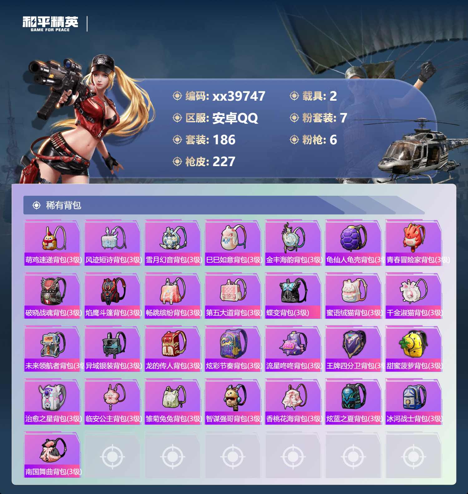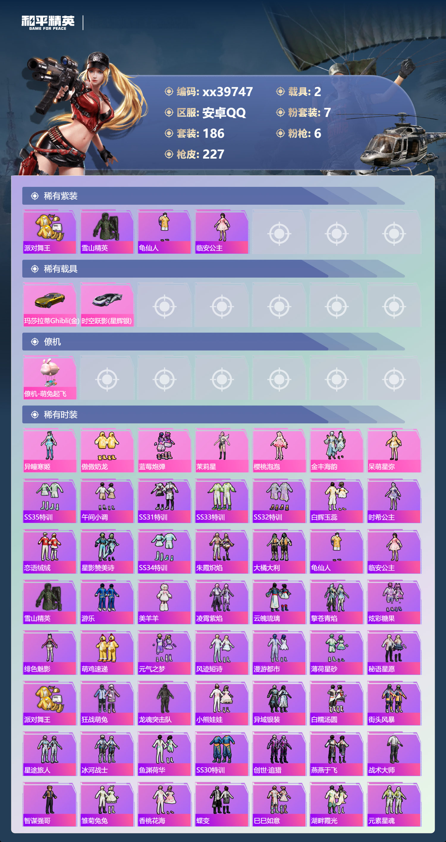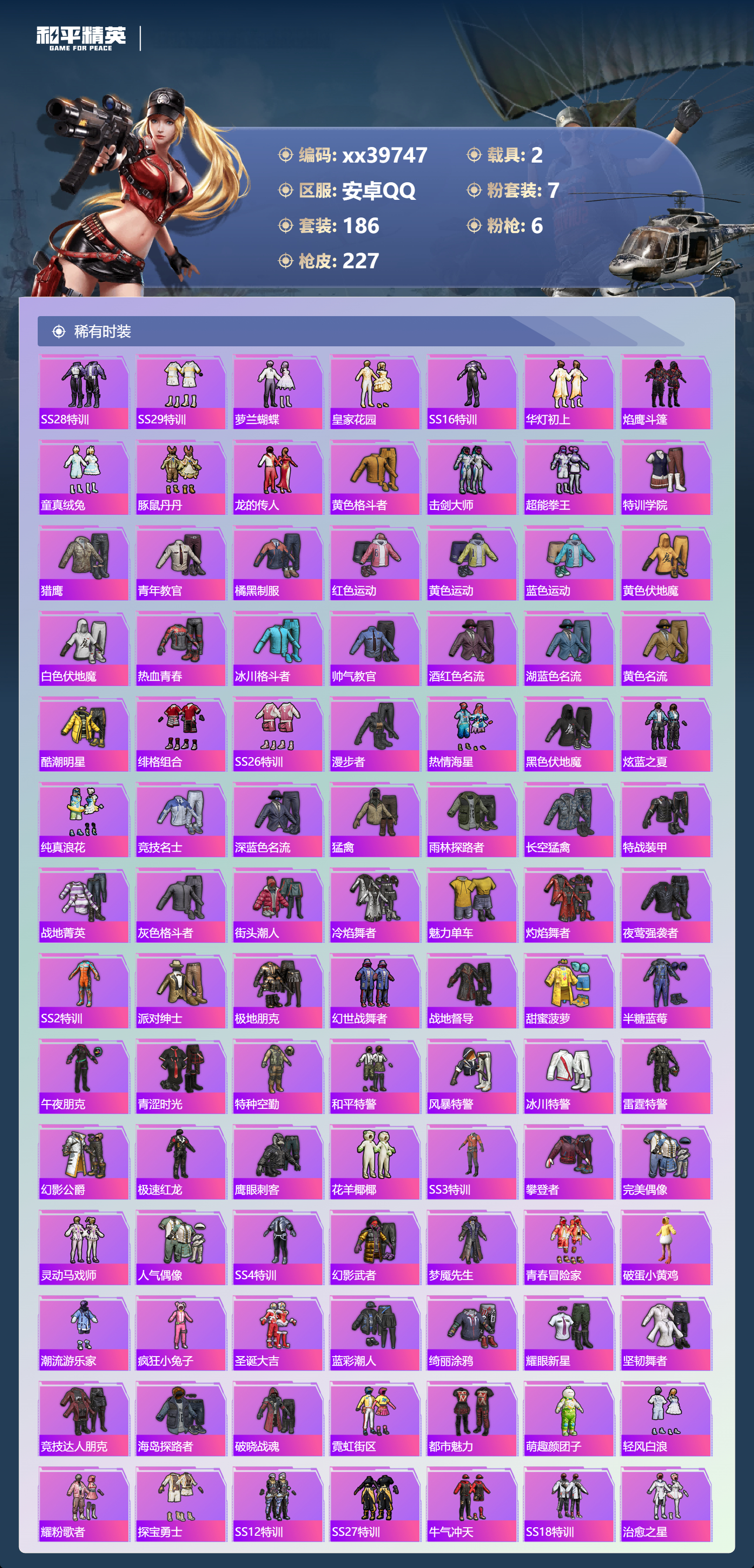 _2277393-可二次安卓手q-13王牌印记-7粉装-6特效呛-2载具-75031热力值-186套装-227呛皮-3卓越印记-1传奇印记 【7粉装】角色-异瞳寒姬套装-傲傲奶龙角色-樱桃泡泡角色-茉莉星套装-蓝莓炮弹套装-金丰海韵角色-呆萌星弥 【6特效呛】groza-镜光银凌/5级ump45-量子极限/5级dp-28-豹影疾电/5级m762-青锋波束/5级m416-心之恋语/7级kar98k-巳巳如意/5级 【4稀有紫装】派对舞王雪山精英龟仙人临安公主 【2稀有载具】玛莎拉蒂ghibli金时空跃影星辉银 【1僚机】僚机-萌兔起飞 【186稀有时装】异瞳寒姬ss35特训午间小调ss31特训ss33特训ss32特训白辉玉蕊时希公主恋语绒绒星影赞美诗ss34特训朱霞炽焰大橘大利龟仙人临安公主雪山精英游乐美羊羊凌霄紫焰云魄琉璃擎苍青焰炫彩糖果绯色魅影萌鸡速递元气之梦风迹短诗漫游都市薄荷星砂秘语星愿派对舞王傲傲奶龙蓝莓炮弹茉莉星樱桃泡泡金丰海韵呆萌星弥狂战萌兔龙魂突击队小熊娃娃异域银装白糯汤圆街头风暴星途旅人冰河战士鱼渊荷华ss30特训创世·追猎燕燕于飞战术大师智谋强哥雏菊兔兔香桃花海蝶变巳巳如意湖畔霞光元素星魂ss28特训ss29特训萝兰蝴蝶皇家花园ss16特训华灯初上焰鹰斗篷童真绒兔豚鼠丹丹龙的传人黄色格斗者击剑大师超能拳王特训学院猎鹰青年教官橘黑制服红色运动黄色运动蓝色运动黄色伏地魔白色伏地魔热血青春冰川格斗者帅气教官酒红色名流湖蓝色名流黄色名流酷潮明星绯格组合ss26特训漫步者热情海星黑色伏地魔炫蓝之夏纯真浪花竞技名士深蓝色名流猛禽雨林探路者长空猛禽特战装甲战地菁英灰色格斗者街头潮人冷焰舞者魅力单车灼焰舞者夜莺强袭者ss2特训派对绅士极地朋克幻世战舞者战地督导甜蜜菠萝半糖蓝莓午夜朋克青涩时光特种空勤和平特警风暴特警冰川特警雷霆特警幻影公爵极速红龙鹰眼刺客花羊椰椰ss3特训攀登者完美偶像灵动马戏师人气偶像ss4特训幻影武者梦魇先生青春冒险家破蛋小黄鸡潮流游乐家疯狂小兔子圣诞大吉蓝彩潮人绮丽涂鸦耀眼新星坚韧舞者竞技达人朋克海岛探路者破晓战魂霓虹街区都市魅力萌趣颜团子轻风白浪耀粉歌者探宝勇士ss12特训ss27特训牛气冲天ss18特训治愈之星科技之星ss17特训熠彩粉晶光影梦想家空投萌叽ss19特训ss20特训ss21特训ss22特训ss23特训夏日倾情甜蜜熊情侣缤纷果语耀动青春ss14特训电音精灵幻羽潜行海盐绵绵冰冷血极客吉莉礼服活力清阳刚毅裁决者ss1特训柠萌假日粉红小猪ss24特训暖风夏荷ss25特训星梦畅游万圣娃娃黑夜传说ss15特训 【227稀有呛械】m416-心之恋语/7级ump45-量子极限/5级q-纯真浪花awm-纯真浪花汤姆逊-纯真浪花dbs-乌木金纹aa12-g-纯真浪花平底锅-纯真浪花scar-l-海盐豹豹平底锅-精灵梦叶罗丽m762-青锋波束/5级groza-镜光银凌/5级kar98k-巳巳如意/5级dp-28-豹影疾电/5级slr-金丰海韵野牛-雏菊兔兔蝎式手呛-金丰海韵mk14-冰河战士平底锅-雏菊兔兔m762-雏菊兔兔mini14-雏菊兔兔m200-宇宙意志r1895-雏菊兔兔ac-val-宇宙意志m249-金丰海韵uzi-冰河战士m16a4-冰河战士mk20-h-乌木金纹dbs-风迹短诗莫辛纳甘-风迹短诗mini14-鸡智如我akm-绿洲时空win94-乌木金纹mk12-风迹短诗mg3-霓彩脉冲蜜獾-乌木金纹m417-玩趣呆呆铝热弹-炫彩糖果uzi-炫彩糖果ump45-绿洲时空g36c-星穹咏叹调短管霰弹-星穹咏叹调mk47-风迹短诗js9-凌霄紫焰mg-36-凌霄紫焰破片手留单-海盐豹豹ump45-海盐豹豹arx-凌霄紫焰aks-74u-乌木金纹蜜獾-风迹短诗p92-凌霄紫焰amr-喜羊羊与灰太狼famas-乌木金纹famas-霓彩脉冲破片手留单-拽到爆炸十子怒-异瞳寒姬s1897-糯团青竹平底锅-凌霄紫焰mk14-薄荷星砂aks-74u-鸡智如我s12k-智耀战神盐雾蛋-冰氧夏日mk14-紫晶流影pkm-啾咪啾咪groza-荧海星豚svd-霓彩脉冲slr-霓彩脉冲s12k-霓彩脉冲amr-鸡智如我akm-霓彩脉冲m416-红色方程式m416-乌木金纹m416-蓝色火焰m416-糯团青竹akm-彩虹符号akm-冰凉西瓜akm-破晓战魂akm-龙的传人akm-灼热熔岩akm-萌趣颜团子akm-霓虹街区scar-l-雷霆特警scar-l-玉兔迎春scar-l-乌木金纹scar-l-王牌四分卫scar-l-夜灯m16a4-快乐主宰m16a4-红色方程式m16a4-幻世战舞者m16a4-乌木金纹m16a4-生命誓言groza-雷霆特警groza-蓝莓炮弹groza-影袭groza-田园牧歌groza-林间仙鹿groza-治愈之星groza-生命誓言aug-乌木金纹aug-耀粉歌者aug-甜蜜菠萝aug-炫光贝贝aug-青春冒险家q-诡娃娃q-彩虹符号m762-诡娃娃m762-乌木金纹m762-暗夜鎏金mk47-乌木金纹mk47-林间仙鹿mk47-青春冒险家g36c-乌木金纹ac-val-乌木金纹蜜獾-天降萌叽kar98k-乌木金纹kar98k-王子的夏天kar98k-红伞翩翩kar98k-欢乐麻酱kar98k-炫彩节奏m24-乌木金纹m24-影袭m24-治愈之星m24-炫彩节奏awm-王牌四分卫awm-焰鹰斗篷莫辛纳甘-乌木金纹amr-乌木金纹sks-迅猛狂鲨sks-乌木金纹sks-诡娃娃vss-未来战士vss-田园牧歌vss-粉色回忆vss-雷霆特警mini14-耀粉歌者mini14-乌木金纹mini14-炫彩节奏mk14-治愈之星mk14-乌木金纹qbu-青春冒险家mk20-h-莲影清波uzi-乌木金纹uzi-天降萌叽uzi-啾咪啾咪ump45-生命誓言ump45-夜灯ump45-诡娃娃vect-暗夜玫瑰vect-生命誓言vect-治愈之星vect-田园牧歌vect-焰鹰斗篷汤姆逊-耀粉歌者汤姆逊-天降萌叽汤姆逊-幻影战神汤姆逊-炫彩节奏野牛-乌木金纹野牛-青春冒险家野牛-王牌四分卫mp5k-乌木金纹p90-乌木金纹s686-彩虹符号s686-红色方程式s686-未来战士s1897-碧影闪光s1897-乌木金纹s1897-炫光贝贝s1897-百万伏特s12k-破晓战魂s12k-玩趣呆呆s12k-幻世战舞者s12k-夜灯dbs-焰鹰斗篷dbs