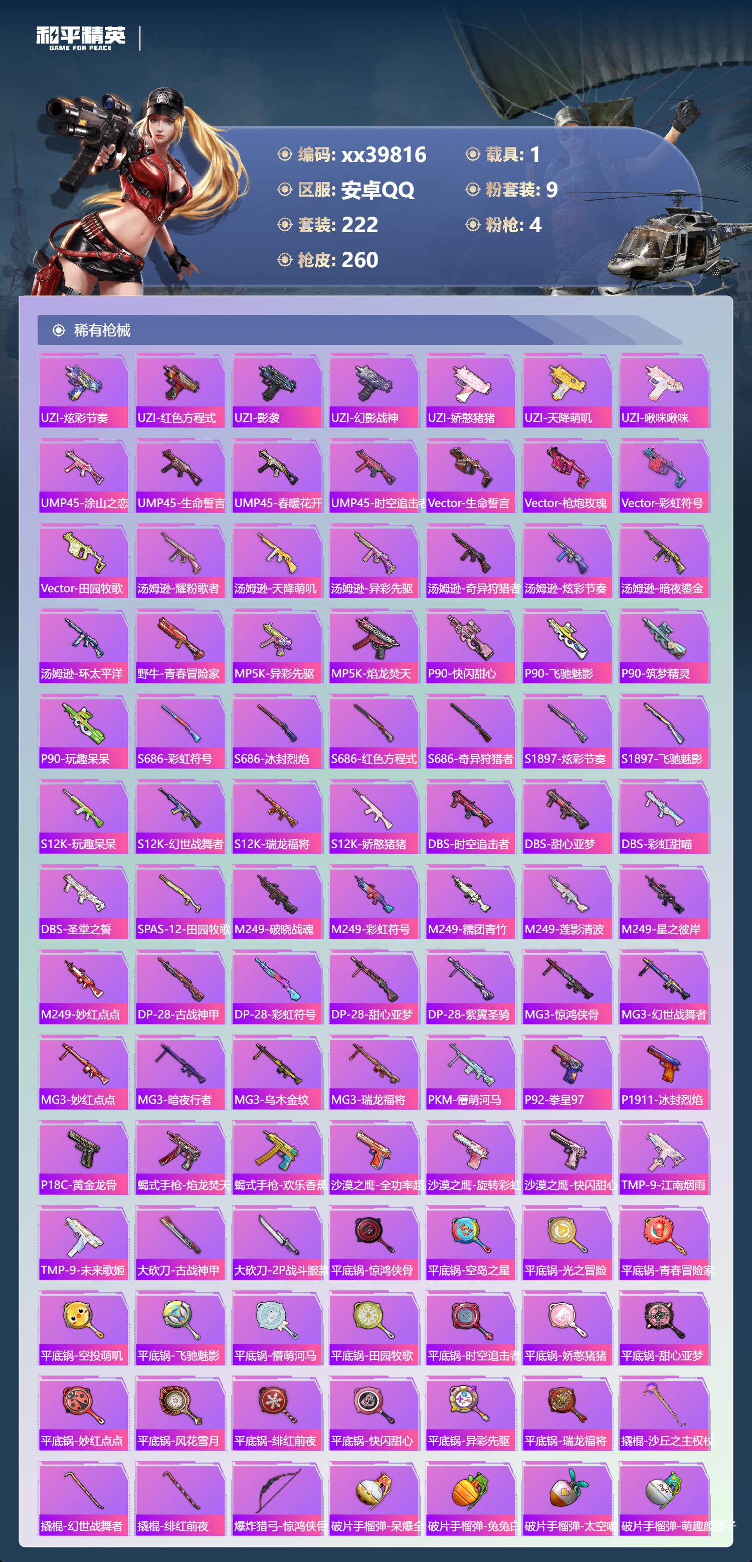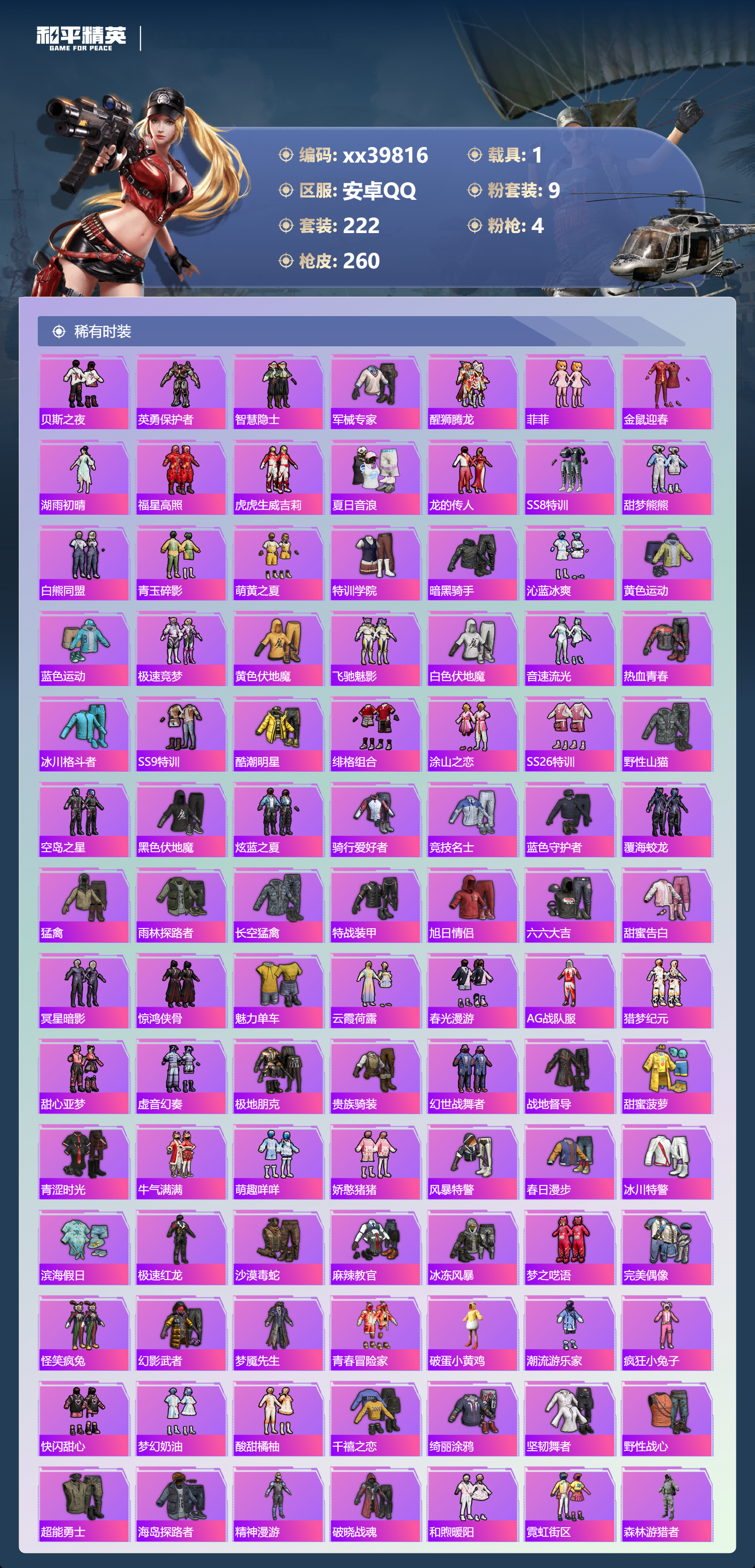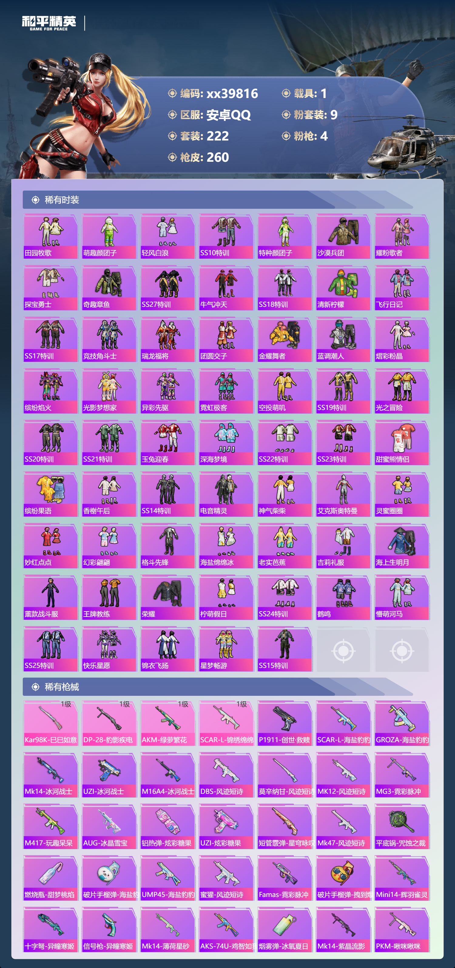 _2277391-可二次安卓手q-11王牌印记-9粉装-4特效呛-1载具-89937热力值-222套装-260呛皮-2卓越印记-1传奇印记 【9粉装】套装-橘柚倾心套装-沙场疾风角色-异瞳寒姬角色-复仇流浪者套装-未来歌姬套装-骨龙祭渊角色-洛天依套装-蓝莓炮弹套装-虎啸骄阳 【4特效呛】scar-l-锦绣绵绵/1级dp-28-豹影疾电/1级kar98k-巳巳如意/1级akm-绿萝繁花/1级 【10稀有紫装】2p战斗服款mark.06奇异狩猎者暗影哥特浪漫天命雪山精英浪漫波比迅捷狂鲨龟仙人暗夜魅影 【1稀有载具】永恒黄蜂 【222稀有时装】洛天依异瞳寒姬ss35特训午间小调ss31特训ss33特训ss32特训恋语绒绒大橘大利浪漫天命暗夜魅影奇异狩猎者龟仙人mark.06雪山精英游乐暗影哥特迅捷狂鲨浪漫波比紫俏灵猫粉黛兰香云魄琉璃炫彩糖果萌鸡速递风迹短诗秘语星愿风舞幻音顶瓜瓜2p战斗服款虎啸骄阳沙场疾风蓝莓炮弹复仇流浪者橘柚倾心骨龙祭渊未来歌姬激萌罗小黑大橘为重狂沙舞者龙魂突击队卖崽青蛙异域银装火种守卫者白糯汤圆街头风暴星途旅人冰河战士ss30特训海琴烟达芬奇战术大师智谋强哥香桃花海蝶变元素星魂ss28特训冰公主ss29特训ss16特训华灯初上暴风机械师时空追击者星辰守护者贝斯之夜英勇保护者智慧隐士军械专家醒狮腾龙菲菲金鼠迎春湖雨初晴福星高照虎虎生威吉莉夏日音浪龙的传人ss8特训甜梦熊熊白熊同盟青玉碎影萌黄之夏特训学院暗黑骑手沁蓝冰爽黄色运动蓝色运动极速竞梦黄色伏地魔飞驰魅影白色伏地魔音速流光热血青春冰川格斗者ss9特训酷潮明星绯格组合涂山之恋ss26特训野性山猫空岛之星黑色伏地魔炫蓝之夏骑行爱好者竞技名士蓝色守护者覆海蛟龙猛禽雨林探路者长空猛禽特战装甲旭日情侣六六大吉甜蜜告白冥星暗影惊鸿侠骨魅力单车云霞荷露春光漫游ag战队服猎梦纪元甜心亚梦虚音幻奏极地朋克贵族骑装幻世战舞者战地督导甜蜜菠萝青涩时光牛气满满萌趣咩咩娇憨猪猪风暴特警春日漫步冰川特警滨海假日极速红龙沙漠毒蛇麻辣教官冰冻风暴梦之呓语完美偶像怪笑疯兔幻影武者梦魇先生青春冒险家破蛋小黄鸡潮流游乐家疯狂小兔子快闪甜心梦幻奶油酸甜橘柚千禧之恋绮丽涂鸦坚韧舞者野性战心超能勇士海岛探路者精神漫游破晓战魂和煦暖阳霓虹街区森林游猎者田园牧歌萌趣颜团子轻风白浪ss10特训特种颜团子沙漠兵团耀粉歌者探宝勇士奇趣章鱼ss27特训牛气冲天ss18特训清新柠檬飞行日记ss17特训竞技角斗士瑞龙福将团圆交子金耀舞者蓝调潮人熠彩粉晶缤纷焰火光影梦想家异彩先驱霓虹极客空投萌叽ss19特训光之冒险ss20特训ss21特训玉兔迎春深海梦境ss22特训ss23特训甜蜜熊情侣缤纷果语香榭午后ss14特训电音精灵神气柴柴艾克斯奥特曼灵蜜圈圈妙红点点幻彩翩翩格斗先锋海盐绵绵冰老实芭蕉吉莉礼服海上生明月薰款战斗服王牌教练荣耀柠萌假日ss24特训鹤鸣懵萌河马ss25特训快乐星愿锦衣飞扬星梦畅游ss15特训 【260稀有呛械】dbs-乌木金纹p1911-创世·救赎scar-l-海盐豹豹groza-海盐豹豹kar98k-巳巳如意/1级dp-28-豹影疾电/1级mk14-冰河战士uzi-冰河战士m16a4-冰河战士mk20-h-乌木金纹akm-绿萝繁花/1级scar-l-锦绣绵绵/1级dbs-风迹短诗莫辛纳甘-风迹短诗win94-乌木金纹mk12-风迹短诗mg3-霓彩脉冲蜜獾-乌木金纹m417-玩趣呆呆aug-冰晶雪宝铝热弹-炫彩糖果uzi-炫彩糖果短管霰弹-星穹咏叹调mk47-风迹短诗平底锅-咒蚀之裁燃烧瓶-甜梦桃焰破片手留单-海盐豹豹ump45-海盐豹豹aks-74u-乌木金纹蜜獾-风迹短诗famas-乌木金纹famas-霓彩脉冲破片手留单-拽到爆炸mini14-辉羽雀灵十子怒-异瞳寒姬信号呛-异瞳寒姬mk14-薄荷星砂aks-74u-鸡智如我盐雾蛋-冰氧夏日mk14-紫晶流影pkm-啾咪啾咪svd-霓彩脉冲slr-霓彩脉冲平底锅-属我最6蜜獾-鸡智如我amr-鸡智如我m416-红色方程式m416-夜灯m416-糯团青竹m416-暗夜行者m416-诡夜天鹅m416-绯红前夜akm-筑梦精灵akm-百万伏特akm-奇异狩猎者akm-星之彼岸akm-彩虹符号akm-江南烟雨akm-龙的传人akm-2p战斗服款akm-灼热熔岩akm-虎虎生威akm-萌趣颜团子akm-霓虹街区scar-l-红色方程式scar-l-玉兔迎春m16a4-蓝色火焰m16a4-幻世战舞者m16a4-甜心亚梦groza-乌木金纹groza-异彩先驱groza-田园牧歌groza-懵萌河马groza-彩虹符号aug-幻影战神aug-耀粉歌者aug-怪笑疯兔aug-青春冒险家aug-2p战斗服款aug-天降萌叽q-飞驰魅影q-洛神天依q-乌木金纹q-彩虹符号m762-瑞龙福将m762-绯红前夜m762-奇异狩猎者m762-暗夜鎏金m762-天降萌叽m762-萌物绒绒mk47-乌木金纹mk47-炫光之旅mk47-妙红点点mk47-洛神天依mk47-青春冒险家g36c-乌木金纹g36c-暗夜玫瑰g36c-懵萌河马g36c-时空追击者ac-val-天降萌叽ac-val-闲梦青缨ac-val-快闪甜心ac-val-甜心亚梦ac-val-乌木金纹蜜獾-天降萌叽蜜獾-娇憨猪猪kar98k-乌木金纹kar98k-红色方程式kar98k-洛神天依kar98k-电玩视界kar98k-飞驰魅影kar98k-彩虹符号kar98k-炫彩节奏m24-乌木金纹m24-奇异狩猎者m24-炫彩节奏awm-天降萌叽win94-瑞龙福将win94-夏日绵绵冰win94-怪笑疯兔莫辛纳甘-乌木金纹莫辛纳甘-懵萌河马amr-乌木金纹amr-镜光幻境amr-妙红点点m200-惊鸿侠骨sks-时空追击者sks-糯团青竹sks-炫彩节奏vss-星之彼岸vss-田园牧歌vss-彩虹符号mini14-梦幻火箭mini14-耀粉歌者mini14-阿狸红mini14-涂山之恋mini14-异彩先驱mk14-乌木金纹slr-彩虹符号slr-娇憨猪猪slr-四圣焕新qbu-青春冒险家m417-惊鸿侠骨mk20-h-快闪甜心mk20-h-莲影清波uzi-炫彩节奏uzi-红色方程式uzi-影袭uzi-幻影