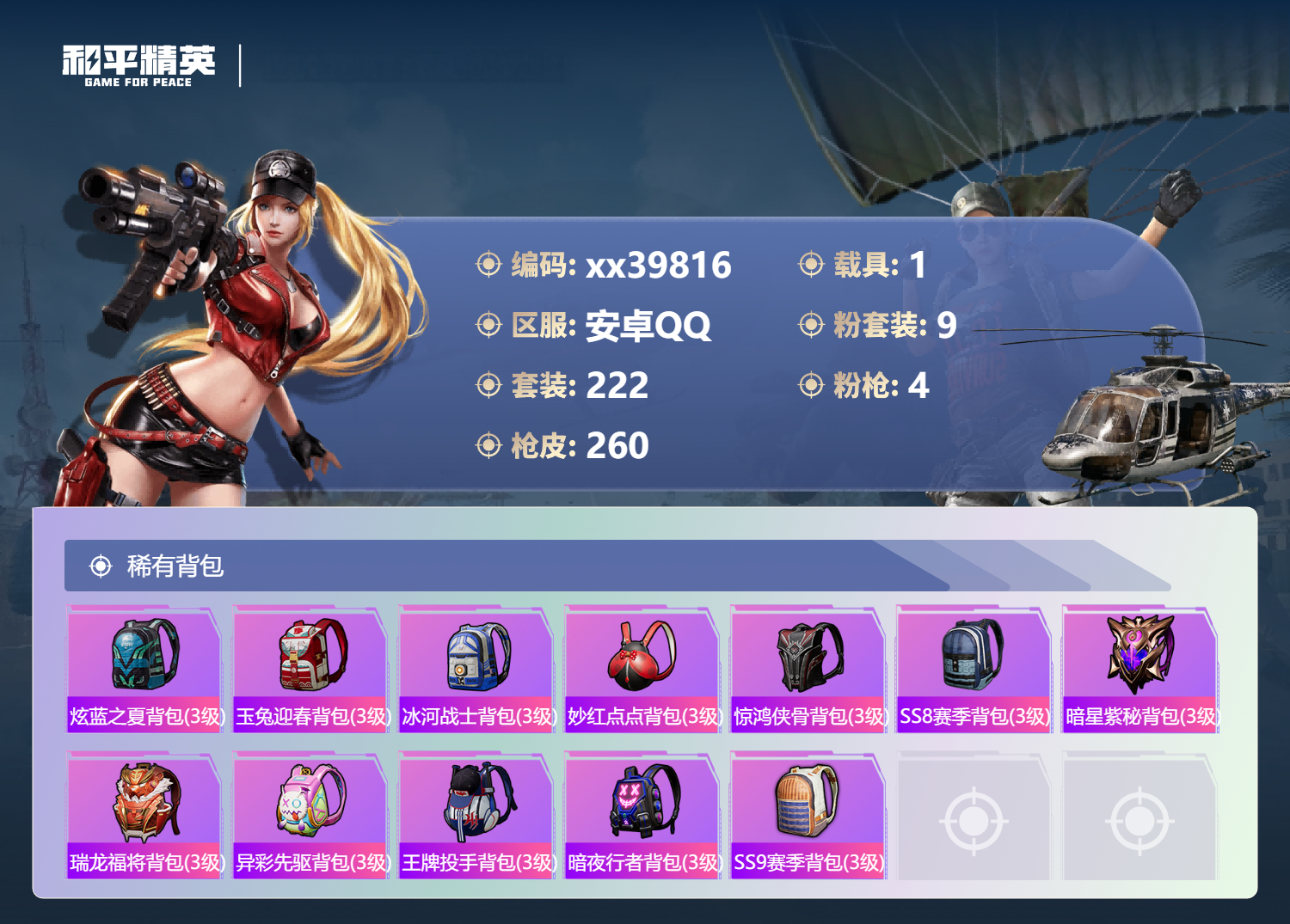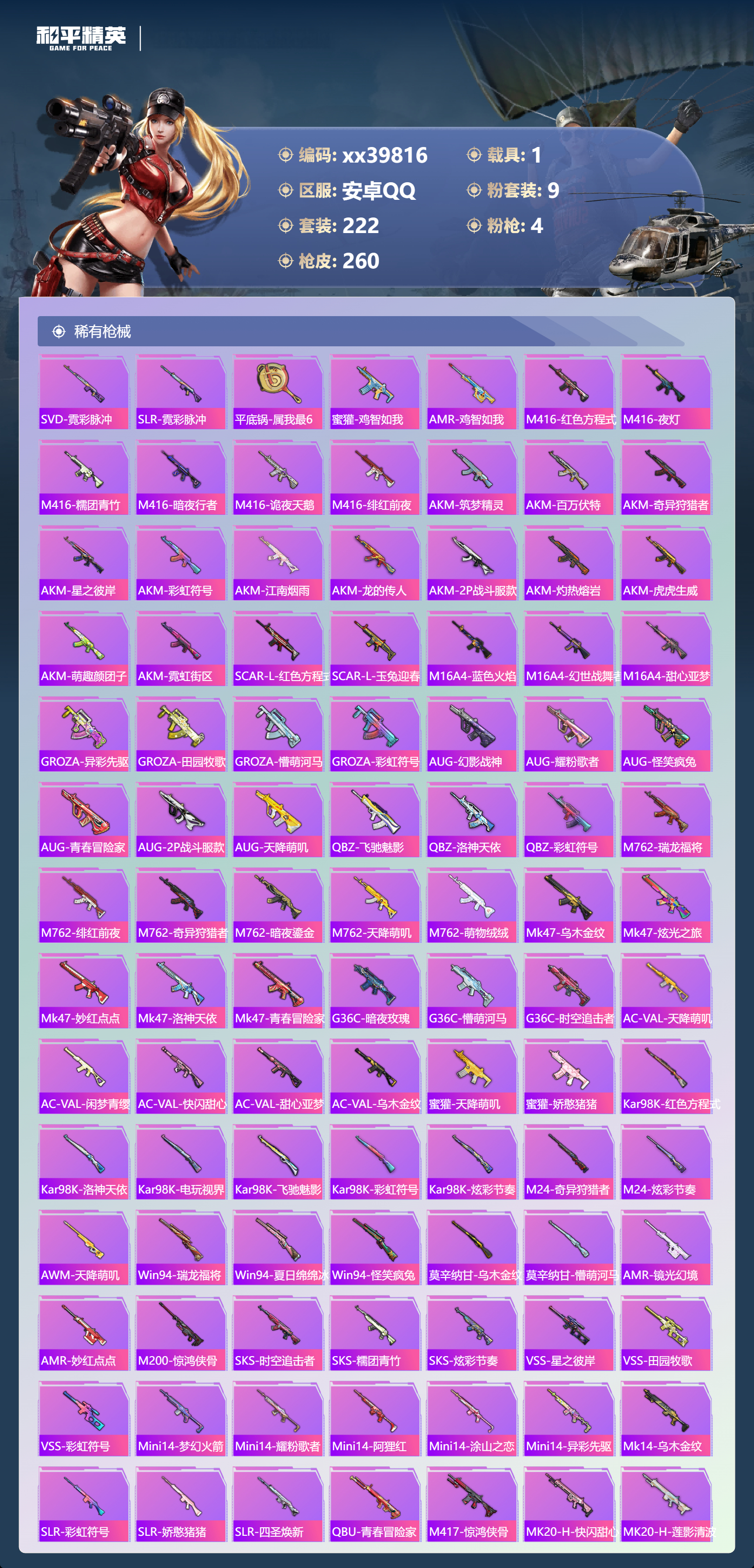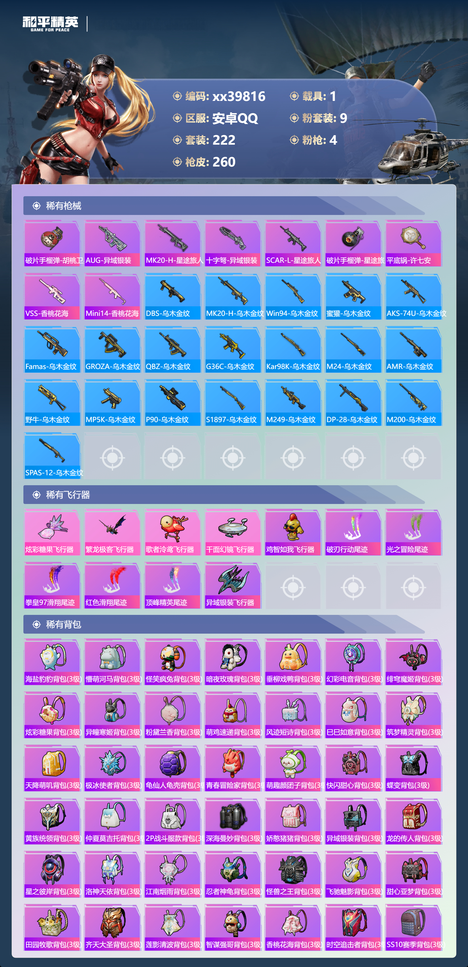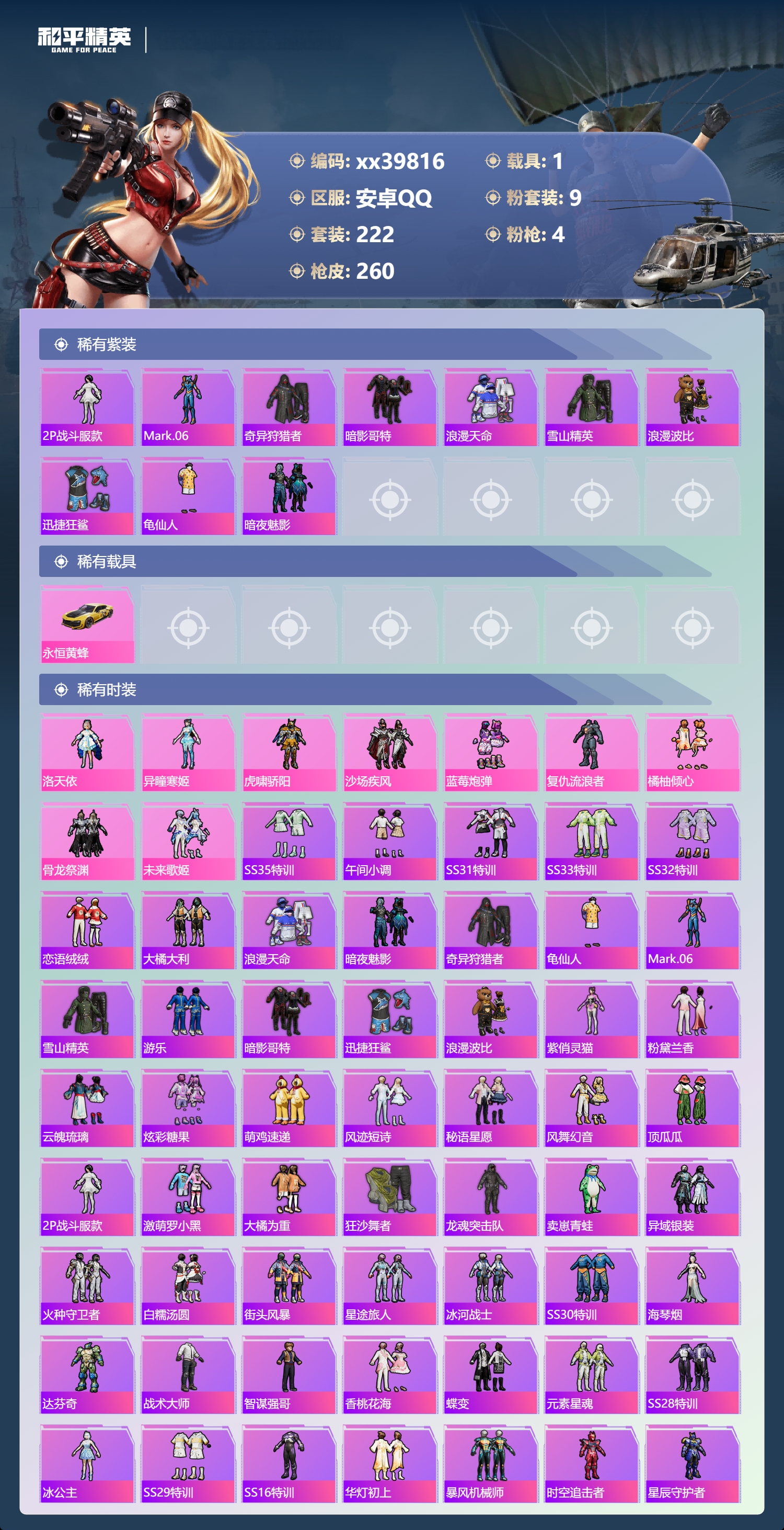_2277391-可二次安卓手q-11王牌印记-9粉装-4特效呛-1载具-89937热力值-222套装-260呛皮-2卓越印记-1传奇印记 【9粉装】套装-橘柚倾心套装-沙场疾风角色-异瞳寒姬角色-复仇流浪者套装-未来歌姬套装-骨龙祭渊角色-洛天依套装-蓝莓炮弹套装-虎啸骄阳 【4特效呛】scar-l-锦绣绵绵/1级dp-28-豹影疾电/1级kar98k-巳巳如意/1级akm-绿萝繁花/1级 【10稀有紫装】2p战斗服款mark.06奇异狩猎者暗影哥特浪漫天命雪山精英浪漫波比迅捷狂鲨龟仙人暗夜魅影 【1稀有载具】永恒黄蜂 【222稀有时装】洛天依异瞳寒姬ss35特训午间小调ss31特训ss33特训ss32特训恋语绒绒大橘大利浪漫天命暗夜魅影奇异狩猎者龟仙人mark.06雪山精英游乐暗影哥特迅捷狂鲨浪漫波比紫俏灵猫粉黛兰香云魄琉璃炫彩糖果萌鸡速递风迹短诗秘语星愿风舞幻音顶瓜瓜2p战斗服款虎啸骄阳沙场疾风蓝莓炮弹复仇流浪者橘柚倾心骨龙祭渊未来歌姬激萌罗小黑大橘为重狂沙舞者龙魂突击队卖崽青蛙异域银装火种守卫者白糯汤圆街头风暴星途旅人冰河战士ss30特训海琴烟达芬奇战术大师智谋强哥香桃花海蝶变元素星魂ss28特训冰公主ss29特训ss16特训华灯初上暴风机械师时空追击者星辰守护者贝斯之夜英勇保护者智慧隐士军械专家醒狮腾龙菲菲金鼠迎春湖雨初晴福星高照虎虎生威吉莉夏日音浪龙的传人ss8特训甜梦熊熊白熊同盟青玉碎影萌黄之夏特训学院暗黑骑手沁蓝冰爽黄色运动蓝色运动极速竞梦黄色伏地魔飞驰魅影白色伏地魔音速流光热血青春冰川格斗者ss9特训酷潮明星绯格组合涂山之恋ss26特训野性山猫空岛之星黑色伏地魔炫蓝之夏骑行爱好者竞技名士蓝色守护者覆海蛟龙猛禽雨林探路者长空猛禽特战装甲旭日情侣六六大吉甜蜜告白冥星暗影惊鸿侠骨魅力单车云霞荷露春光漫游ag战队服猎梦纪元甜心亚梦虚音幻奏极地朋克贵族骑装幻世战舞者战地督导甜蜜菠萝青涩时光牛气满满萌趣咩咩娇憨猪猪风暴特警春日漫步冰川特警滨海假日极速红龙沙漠毒蛇麻辣教官冰冻风暴梦之呓语完美偶像怪笑疯兔幻影武者梦魇先生青春冒险家破蛋小黄鸡潮流游乐家疯狂小兔子快闪甜心梦幻奶油酸甜橘柚千禧之恋绮丽涂鸦坚韧舞者野性战心超能勇士海岛探路者精神漫游破晓战魂和煦暖阳霓虹街区森林游猎者田园牧歌萌趣颜团子轻风白浪ss10特训特种颜团子沙漠兵团耀粉歌者探宝勇士奇趣章鱼ss27特训牛气冲天ss18特训清新柠檬飞行日记ss17特训竞技角斗士瑞龙福将团圆交子金耀舞者蓝调潮人熠彩粉晶缤纷焰火光影梦想家异彩先驱霓虹极客空投萌叽ss19特训光之冒险ss20特训ss21特训玉兔迎春深海梦境ss22特训ss23特训甜蜜熊情侣缤纷果语香榭午后ss14特训电音精灵神气柴柴艾克斯奥特曼灵蜜圈圈妙红点点幻彩翩翩格斗先锋海盐绵绵冰老实芭蕉吉莉礼服海上生明月薰款战斗服王牌教练荣耀柠萌假日ss24特训鹤鸣懵萌河马ss25特训快乐星愿锦衣飞扬星梦畅游ss15特训 【260稀有呛械】dbs-乌木金纹p1911-创世·救赎scar-l-海盐豹豹groza-海盐豹豹kar98k-巳巳如意/1级dp-28-豹影疾电/1级mk14-冰河战士uzi-冰河战士m16a4-冰河战士mk20-h-乌木金纹akm-绿萝繁花/1级scar-l-锦绣绵绵/1级dbs-风迹短诗莫辛纳甘-风迹短诗win94-乌木金纹mk12-风迹短诗mg3-霓彩脉冲蜜獾-乌木金纹m417-玩趣呆呆aug-冰晶雪宝铝热弹-炫彩糖果uzi-炫彩糖果短管霰弹-星穹咏叹调mk47-风迹短诗平底锅-咒蚀之裁燃烧瓶-甜梦桃焰破片手留单-海盐豹豹ump45-海盐豹豹aks-74u-乌木金纹蜜獾-风迹短诗famas-乌木金纹famas-霓彩脉冲破片手留单-拽到爆炸mini14-辉羽雀灵十子怒-异瞳寒姬信号呛-异瞳寒姬mk14-薄荷星砂aks-74u-鸡智如我盐雾蛋-冰氧夏日mk14-紫晶流影pkm-啾咪啾咪svd-霓彩脉冲slr-霓彩脉冲平底锅-属我最6蜜獾-鸡智如我amr-鸡智如我m416-红色方程式m416-夜灯m416-糯团青竹m416-暗夜行者m416-诡夜天鹅m416-绯红前夜akm-筑梦精灵akm-百万伏特akm-奇异狩猎者akm-星之彼岸akm-彩虹符号akm-江南烟雨akm-龙的传人akm-2p战斗服款akm-灼热熔岩akm-虎虎生威akm-萌趣颜团子akm-霓虹街区scar-l-红色方程式scar-l-玉兔迎春m16a4-蓝色火焰m16a4-幻世战舞者m16a4-甜心亚梦groza-乌木金纹groza-异彩先驱groza-田园牧歌groza-懵萌河马groza-彩虹符号aug-幻影战神aug-耀粉歌者aug-怪笑疯兔aug-青春冒险家aug-2p战斗服款aug-天降萌叽q-飞驰魅影q-洛神天依q-乌木金纹q-彩虹符号m762-瑞龙福将m762-绯红前夜m762-奇异狩猎者m762-暗夜鎏金m762-天降萌叽m762-萌物绒绒mk47-乌木金纹mk47-炫光之旅mk47-妙红点点mk47-洛神天依mk47-青春冒险家g36c-乌木金纹g36c-暗夜玫瑰g36c-懵萌河马g36c-时空追击者ac-val-天降萌叽ac-val-闲梦青缨ac-val-快闪甜心ac-val-甜心亚梦ac-val-乌木金纹蜜獾-天降萌叽蜜獾-娇憨猪猪kar98k-乌木金纹kar98k-红色方程式kar98k-洛神天依kar98k-电玩视界kar98k-飞驰魅影kar98k-彩虹符号kar98k-炫彩节奏m24-乌木金纹m24-奇异狩猎者m24-炫彩节奏awm-天降萌叽win94-瑞龙福将win94-夏日绵绵冰win94-怪笑疯兔莫辛纳甘-乌木金纹莫辛纳甘-懵萌河马amr-乌木金纹amr-镜光幻境amr-妙红点点m200-惊鸿侠骨sks-时空追击者sks-糯团青竹sks-炫彩节奏vss-星之彼岸vss-田园牧歌vss-彩虹符号mini14-梦幻火箭mini14-耀粉歌者mini14-阿狸红mini14-涂山之恋mini14-异彩先驱mk14-乌木金纹slr-彩虹符号slr-娇憨猪猪slr-四圣焕新qbu-青春冒险家m417-惊鸿侠骨mk20-h-快闪甜心mk20-h-莲影清波uzi-炫彩节奏uzi-红色方程式uzi-影袭uzi-幻影
