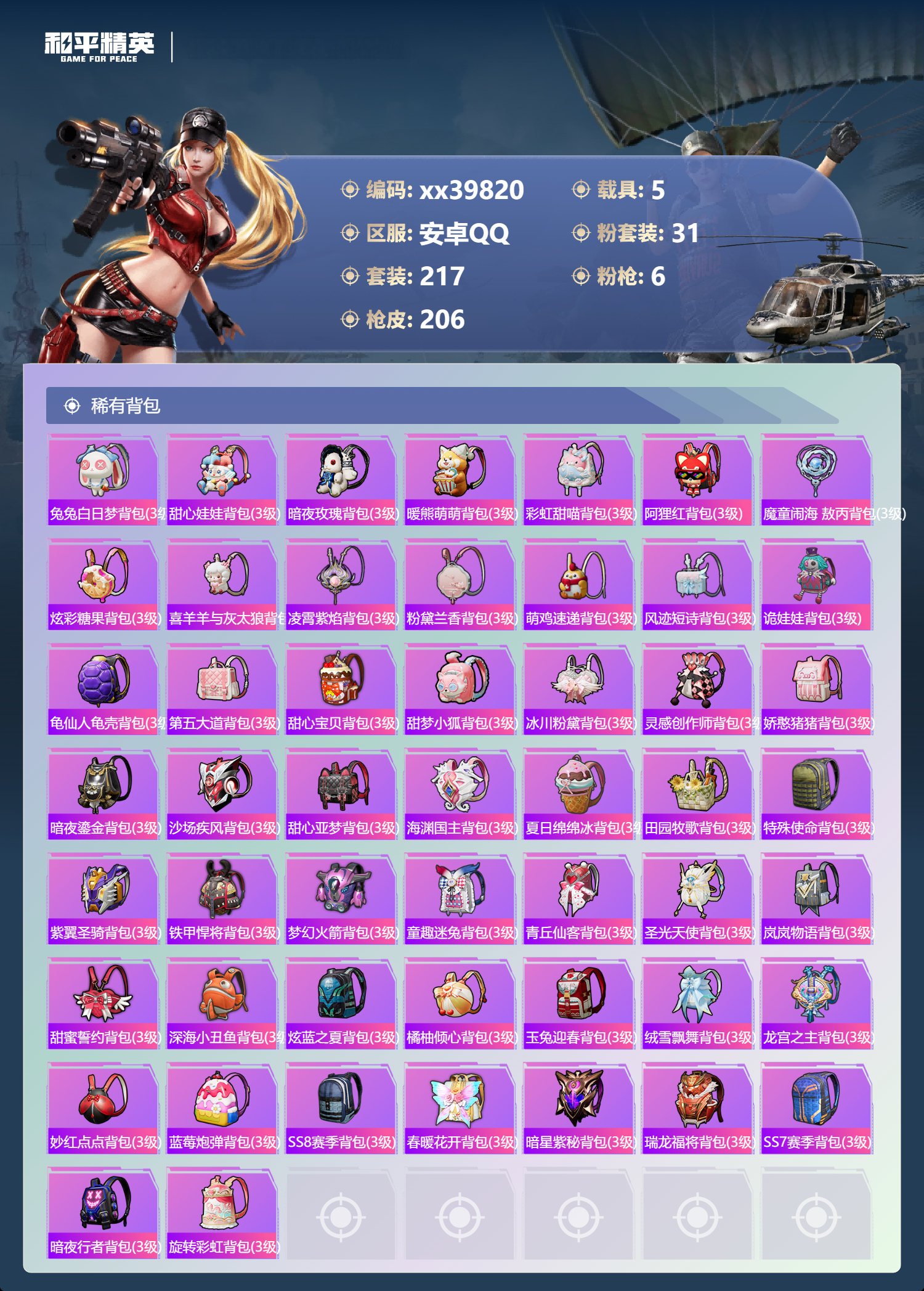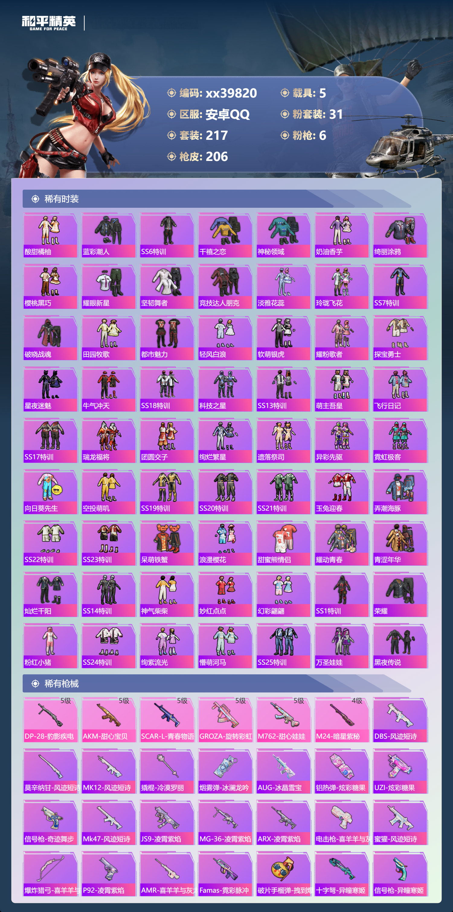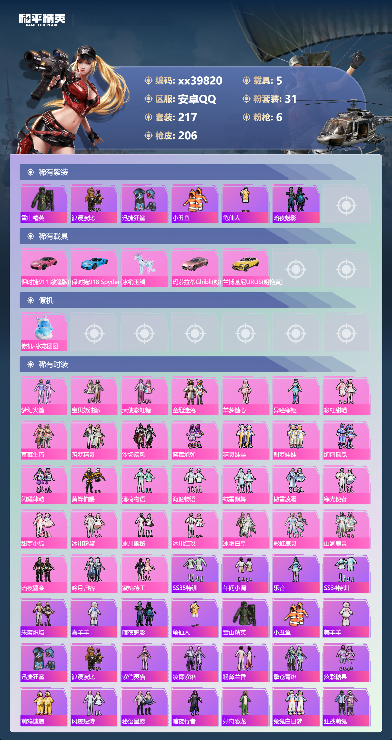 _2277388-可二次安卓手q-7王牌印记-31粉装-6特效呛-5载具-84312热力值-217套装-206呛皮-1卓越印记-1传奇印记 【31粉装】角色-羊梦糖心套装-甜梦小狐套装-山涧鹿灵套装-吟月归客角色-异瞳寒姬套装-草莓生巧套装-冰川红玫套装-暗夜鎏金套装-童趣迷兔套装-彩虹鹿灵套装-寒光使者套装-天使彩虹糖套装-筑梦精灵套装-冰霜白皇套装-酣梦娃娃套装-彩虹甜喵套装-海盐物语套装-绚丽摇曳套装-绒雪飘舞套装-蓝莓炮弹套装-梦幻火箭套装-薄荷物语套装-黄蜂伯爵套装-精灵娃娃套装-闪耀律动套装-蜜桃特工套装-冰川粉黛套装-宝贝奶油派套装-沙场疾风套装-冰川幽秘套装-傲雪凌霜 【6特效呛】dp-28-豹影疾电/5级groza-旋转彩虹/5级m762-甜心娃娃/5级m24-暗星紫秘/4级scar-l-青春物语/5级akm-甜心宝贝/5级 【6稀有紫装】雪山精英浪漫波比迅捷狂鲨小丑鱼龟仙人暗夜魅影 【5稀有载具】保时捷911敞篷版星珀红保时捷918sper沉静蓝冰绡玉鳞玛莎拉蒂ghibli粉兰博基尼urus明艳黄 【1僚机】僚机-冰龙团团 【217稀有时装】梦幻火箭宝贝奶油派天使彩虹糖童趣迷兔羊梦糖心异瞳寒姬ss35特训午间小调乐音ss34特训朱霞炽焰喜羊羊暗夜魅影龟仙人雪山精英小丑鱼美羊羊迅捷狂鲨浪漫波比紫俏灵猫凌霄紫焰粉黛兰香擎苍青焰炫彩糖果萌鸡速递风迹短诗秘语星愿彩虹甜喵草莓生巧筑梦精灵沙场疾风蓝莓炮弹精灵娃娃酣梦娃娃绚丽摇曳闪耀律动黄蜂伯爵薄荷物语海盐物语绒雪飘舞傲雪凌霜寒光使者甜梦小狐冰川粉黛冰川幽秘冰川红玫冰霜白皇彩虹鹿灵山涧鹿灵暗夜鎏金吟月归客蜜桃特工暗夜行者好奇恐龙兔兔白日梦狂战萌兔潮萌小黄鸭龙宫之主ss5特训暗夜傀儡水晶王族军械专家青丘仙客银河圣歌暗夜契约海龙战士纯白誓言雪兔飞飞虎虎生威吉莉军刀雅典娜糖果砰砰白熊同盟隐空刺影双刃海滨突袭者特训学院猎鹰青年教官橘黑制服红色运动沁蓝冰爽黄色运动浓情蜜辣蓝色运动5.56爱好者黄色伏地魔飞驰魅影白色伏地魔音速流光热血青春酒红色名流阳光火鸡湖蓝色名流黄色名流抹茶蜜豆ss26特训黑色伏地魔炫蓝之夏骑行爱好者竞技名士蓝色守护者浑天鲲鹏深蓝色名流猛禽长空猛禽特战装甲战地菁英旭日情侣粉团憨憨灰色格斗者软羊咩咩甜蜜告白街头潮人怒火燎原冷焰舞者魅力单车灼焰舞者奶芙汪汪夜莺强袭者恶魔喵喵猎梦纪元甜心亚梦ss2特训虚音幻奏浪漫假日贵族骑装幻世战舞者战地督导青涩时光青春校园牛气满满萌趣咩咩娇憨猪猪风暴特警冰川特警夏雨游龙极速红龙wifi精灵沙漠毒蛇麻辣教官ss3特训灵幻魔术师完美偶像灵动马戏师人气偶像ss4特训幻影武者俏皮奶喵梦魇先生暖心橘喵破蛋小黄鸡疯狂小兔子圣诞大吉梦幻奶油酸甜橘柚蓝彩潮人ss6特训千禧之恋神秘领域奶油香芋绮丽涂鸦樱桃黑巧耀眼新星坚韧舞者竞技达人朋克淡雅花蕊玲珑飞花ss7特训破晓战魂田园牧歌都市魅力轻风白浪软萌银虎耀粉歌者探宝勇士星夜迷魅牛气冲天ss18特训科技之星ss13特训萌主吾皇飞行日记ss17特训瑞龙福将团圆交子绚烂繁星遗落祭司异彩先驱霓虹极客向日葵先生空投萌叽ss19特训ss20特训ss21特训玉兔迎春弄潮海豚ss22特训ss23特训呆萌铁蟹浪漫樱花甜蜜熊情侣耀动青春青涩年华灿烂千阳ss14特训神气柴柴妙红点点幻彩翩翩ss1特训荣耀粉红小猪ss24特训绚紫流光懵萌河马ss25特训万圣娃娃黑夜传说 【206稀有呛械】dp-28-豹影疾电/5级akm-甜心宝贝/5级scar-l-青春物语/5级groza-旋转彩虹/5级m762-甜心娃娃/5级m24-暗星紫秘/4级dbs-风迹短诗莫辛纳甘-风迹短诗win94-乌木金纹mk12-风迹短诗撬棍-冷漠罗丽盐雾蛋-冰澜龙吟aug-冰晶雪宝铝热弹-炫彩糖果uzi-炫彩糖果信号呛-奇迹舞步mk47-风迹短诗js9-凌霄紫焰mg-36-凌霄紫焰arx-凌霄紫焰aks-74u-乌木金纹电击呛-喜羊羊与灰太狼蜜獾-风迹短诗爆炸猎弓-喜羊羊与灰太狼p92-凌霄紫焰amr-喜羊羊与灰太狼famas-霓彩脉冲破片手留单-拽到爆炸十子怒-异瞳寒姬信号呛-异瞳寒姬平底锅-凌霄紫焰svd-霓彩脉冲slr-霓彩脉冲scar-l-彩虹符号蜜獾-冰澜龙吟大砍刀-冰澜龙吟s12k-霓彩脉冲akm-霓彩脉冲m416-乌木金纹m416-暗夜行者m416-暗星紫秘akm-筑梦精灵akm-环太平洋akm-夜灯akm-生命誓言akm-彩虹符号akm-缤纷海域akm-春暖花开akm-灼热熔岩scar-l-玉兔迎春scar-l-乌木金纹scar-l-青丘仙客scar-l-粉色回忆m16a4-幻世战舞者m16a4-甜心亚梦m16a4-生命誓言groza-春暖花开groza-异彩先驱groza-田园牧歌groza-青春物语groza-懵萌河马groza-甜蜜草莓aug-乌木金纹aug-耀粉歌者aug-冰川粉黛aug-幻梦音符aug-天降萌叽q-神秘黑猫q-飞驰魅影q-诡娃娃m762-生命誓言m762-瑞龙福将m762-诡娃娃m762-乌木金纹m762-奇异狩猎者m762-暖熊萌萌m762-橘柚倾心m762-绒雪飘舞m762-彩虹甜喵mk47-百万伏特mk47-乌木金纹mk47-粉色回忆mk47-林间仙鹿mk47-妙红点点g36c-乌木金纹g36c-暗夜玫瑰g36c-青丘仙客g36c-懵萌河马ac-val-彩虹甜喵ac-val-甜心亚梦ac-val-乌木金纹蜜獾-天降萌叽蜜獾-娇憨猪猪kar98k-梦幻火箭kar98k-王子的夏天kar98k-飞驰魅影m24-乌木金纹m24-炫彩节奏awm-乌木金纹awm-垂柳戏鸭awm-恐龙拽拽win94-瑞龙福将莫辛纳甘-乌木金纹莫辛纳甘-懵萌河马amr-暗夜行者amr-乌木金纹amr-妙红点点sks-幻梦音符sks-迅猛狂鲨sks-青丘仙客sks-乌木金纹sks-诡娃娃vss-未来战士vss-星之彼岸vss-呛炮玫瑰vss-田园牧歌vss-粉色回忆mini14-生命誓言mini14-旋转彩虹mini14-乌木金纹mini14-阿狸红mini14-星夜魔法