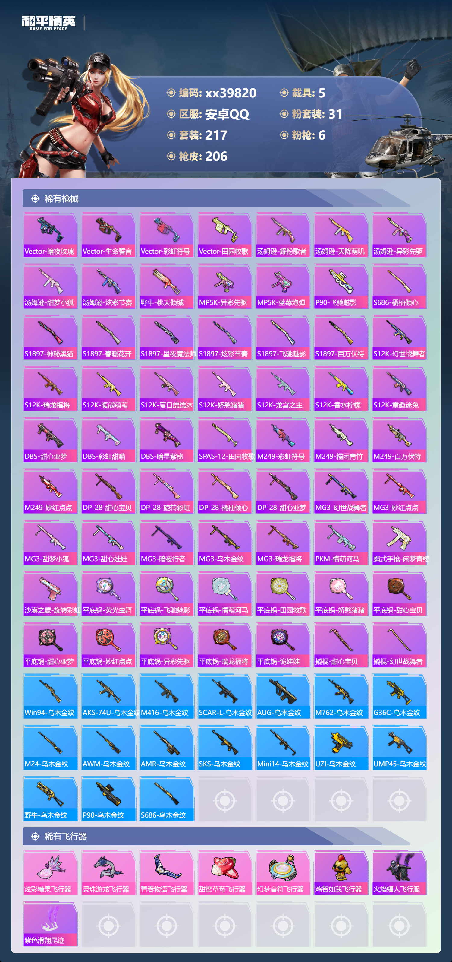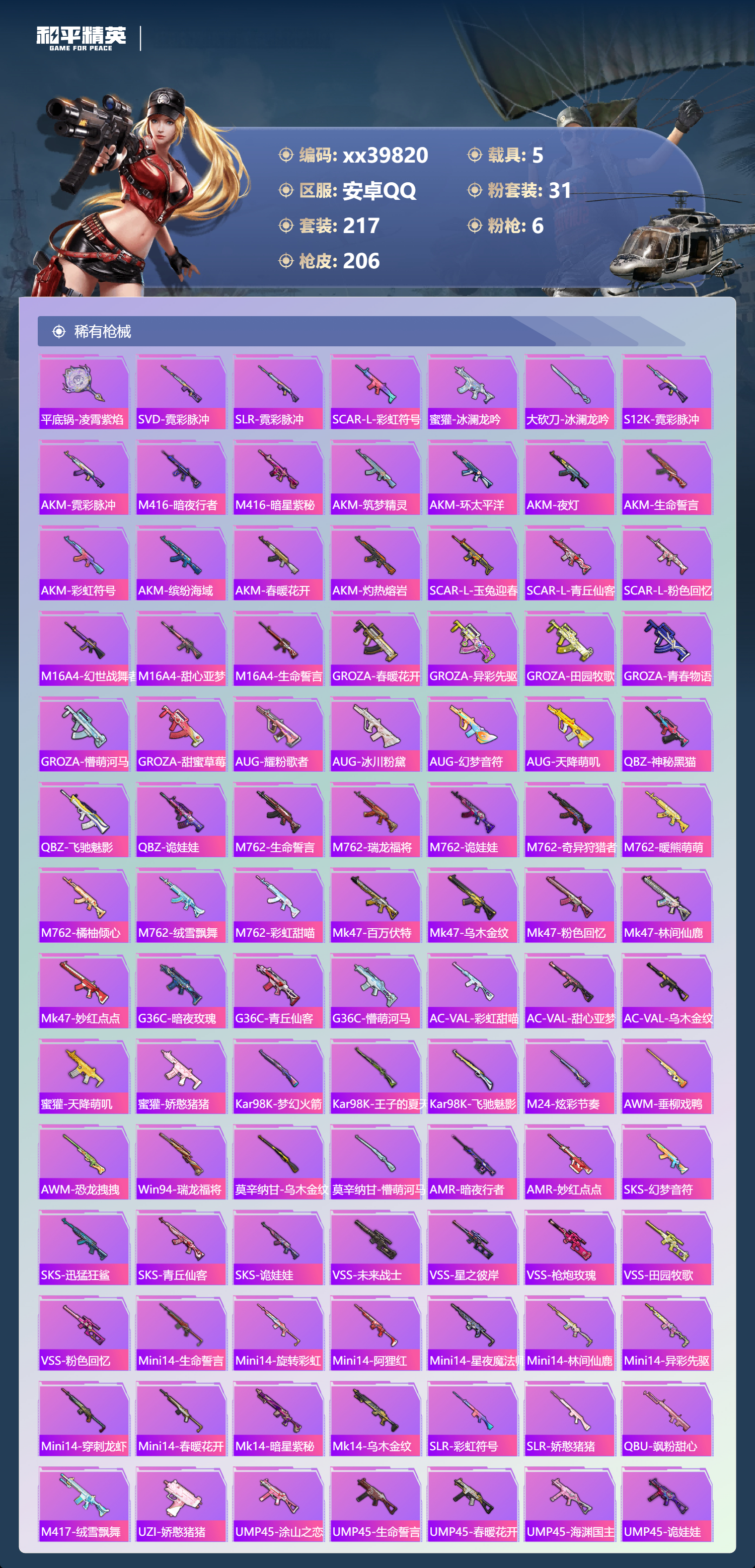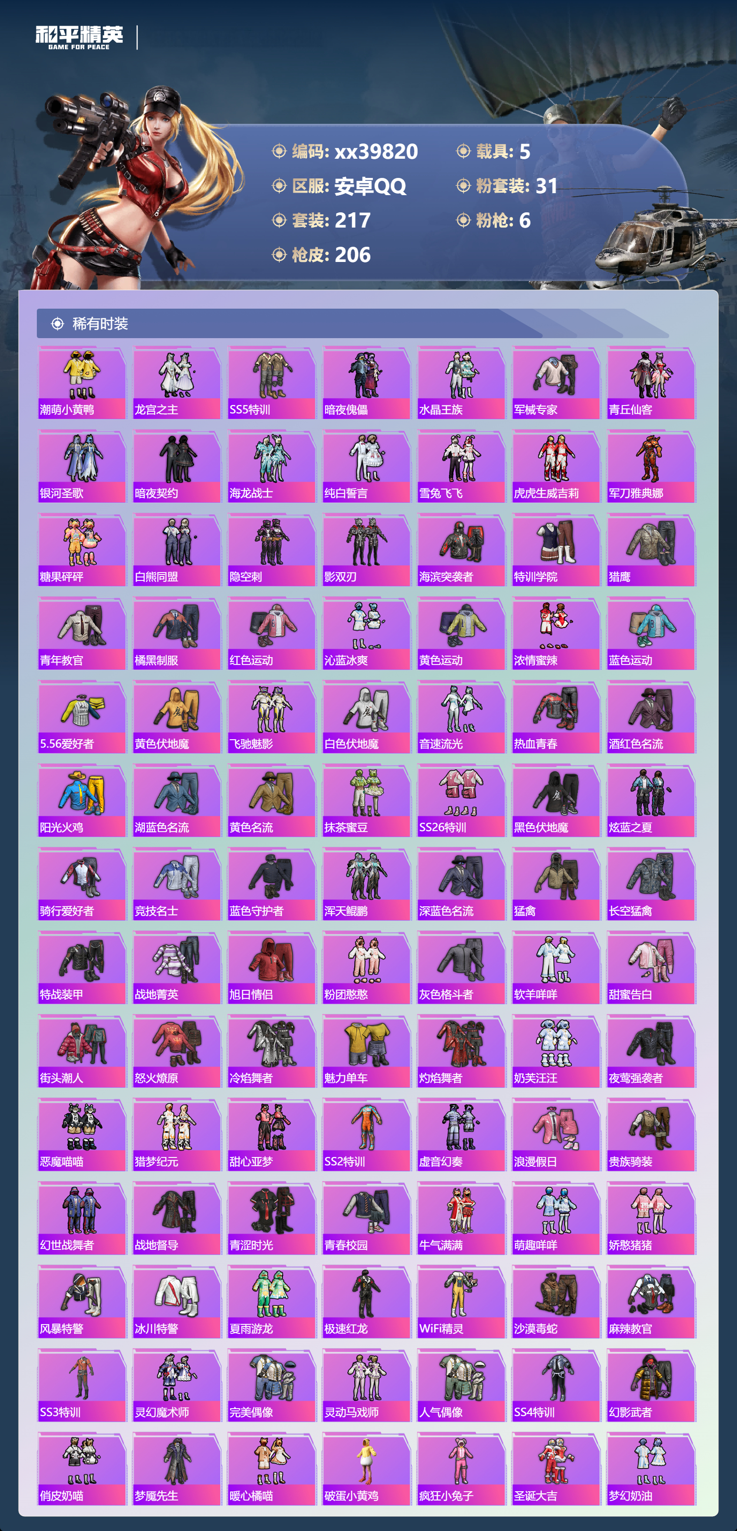 _2277388-可二次安卓手q-7王牌印记-31粉装-6特效呛-5载具-84312热力值-217套装-206呛皮-1卓越印记-1传奇印记 【31粉装】角色-羊梦糖心套装-甜梦小狐套装-山涧鹿灵套装-吟月归客角色-异瞳寒姬套装-草莓生巧套装-冰川红玫套装-暗夜鎏金套装-童趣迷兔套装-彩虹鹿灵套装-寒光使者套装-天使彩虹糖套装-筑梦精灵套装-冰霜白皇套装-酣梦娃娃套装-彩虹甜喵套装-海盐物语套装-绚丽摇曳套装-绒雪飘舞套装-蓝莓炮弹套装-梦幻火箭套装-薄荷物语套装-黄蜂伯爵套装-精灵娃娃套装-闪耀律动套装-蜜桃特工套装-冰川粉黛套装-宝贝奶油派套装-沙场疾风套装-冰川幽秘套装-傲雪凌霜 【6特效呛】dp-28-豹影疾电/5级groza-旋转彩虹/5级m762-甜心娃娃/5级m24-暗星紫秘/4级scar-l-青春物语/5级akm-甜心宝贝/5级 【6稀有紫装】雪山精英浪漫波比迅捷狂鲨小丑鱼龟仙人暗夜魅影 【5稀有载具】保时捷911敞篷版星珀红保时捷918sper沉静蓝冰绡玉鳞玛莎拉蒂ghibli粉兰博基尼urus明艳黄 【1僚机】僚机-冰龙团团 【217稀有时装】梦幻火箭宝贝奶油派天使彩虹糖童趣迷兔羊梦糖心异瞳寒姬ss35特训午间小调乐音ss34特训朱霞炽焰喜羊羊暗夜魅影龟仙人雪山精英小丑鱼美羊羊迅捷狂鲨浪漫波比紫俏灵猫凌霄紫焰粉黛兰香擎苍青焰炫彩糖果萌鸡速递风迹短诗秘语星愿彩虹甜喵草莓生巧筑梦精灵沙场疾风蓝莓炮弹精灵娃娃酣梦娃娃绚丽摇曳闪耀律动黄蜂伯爵薄荷物语海盐物语绒雪飘舞傲雪凌霜寒光使者甜梦小狐冰川粉黛冰川幽秘冰川红玫冰霜白皇彩虹鹿灵山涧鹿灵暗夜鎏金吟月归客蜜桃特工暗夜行者好奇恐龙兔兔白日梦狂战萌兔潮萌小黄鸭龙宫之主ss5特训暗夜傀儡水晶王族军械专家青丘仙客银河圣歌暗夜契约海龙战士纯白誓言雪兔飞飞虎虎生威吉莉军刀雅典娜糖果砰砰白熊同盟隐空刺影双刃海滨突袭者特训学院猎鹰青年教官橘黑制服红色运动沁蓝冰爽黄色运动浓情蜜辣蓝色运动5.56爱好者黄色伏地魔飞驰魅影白色伏地魔音速流光热血青春酒红色名流阳光火鸡湖蓝色名流黄色名流抹茶蜜豆ss26特训黑色伏地魔炫蓝之夏骑行爱好者竞技名士蓝色守护者浑天鲲鹏深蓝色名流猛禽长空猛禽特战装甲战地菁英旭日情侣粉团憨憨灰色格斗者软羊咩咩甜蜜告白街头潮人怒火燎原冷焰舞者魅力单车灼焰舞者奶芙汪汪夜莺强袭者恶魔喵喵猎梦纪元甜心亚梦ss2特训虚音幻奏浪漫假日贵族骑装幻世战舞者战地督导青涩时光青春校园牛气满满萌趣咩咩娇憨猪猪风暴特警冰川特警夏雨游龙极速红龙wifi精灵沙漠毒蛇麻辣教官ss3特训灵幻魔术师完美偶像灵动马戏师人气偶像ss4特训幻影武者俏皮奶喵梦魇先生暖心橘喵破蛋小黄鸡疯狂小兔子圣诞大吉梦幻奶油酸甜橘柚蓝彩潮人ss6特训千禧之恋神秘领域奶油香芋绮丽涂鸦樱桃黑巧耀眼新星坚韧舞者竞技达人朋克淡雅花蕊玲珑飞花ss7特训破晓战魂田园牧歌都市魅力轻风白浪软萌银虎耀粉歌者探宝勇士星夜迷魅牛气冲天ss18特训科技之星ss13特训萌主吾皇飞行日记ss17特训瑞龙福将团圆交子绚烂繁星遗落祭司异彩先驱霓虹极客向日葵先生空投萌叽ss19特训ss20特训ss21特训玉兔迎春弄潮海豚ss22特训ss23特训呆萌铁蟹浪漫樱花甜蜜熊情侣耀动青春青涩年华灿烂千阳ss14特训神气柴柴妙红点点幻彩翩翩ss1特训荣耀粉红小猪ss24特训绚紫流光懵萌河马ss25特训万圣娃娃黑夜传说 【206稀有呛械】dp-28-豹影疾电/5级akm-甜心宝贝/5级scar-l-青春物语/5级groza-旋转彩虹/5级m762-甜心娃娃/5级m24-暗星紫秘/4级dbs-风迹短诗莫辛纳甘-风迹短诗win94-乌木金纹mk12-风迹短诗撬棍-冷漠罗丽盐雾蛋-冰澜龙吟aug-冰晶雪宝铝热弹-炫彩糖果uzi-炫彩糖果信号呛-奇迹舞步mk47-风迹短诗js9-凌霄紫焰mg-36-凌霄紫焰arx-凌霄紫焰aks-74u-乌木金纹电击呛-喜羊羊与灰太狼蜜獾-风迹短诗爆炸猎弓-喜羊羊与灰太狼p92-凌霄紫焰amr-喜羊羊与灰太狼famas-霓彩脉冲破片手留单-拽到爆炸十子怒-异瞳寒姬信号呛-异瞳寒姬平底锅-凌霄紫焰svd-霓彩脉冲slr-霓彩脉冲scar-l-彩虹符号蜜獾-冰澜龙吟大砍刀-冰澜龙吟s12k-霓彩脉冲akm-霓彩脉冲m416-乌木金纹m416-暗夜行者m416-暗星紫秘akm-筑梦精灵akm-环太平洋akm-夜灯akm-生命誓言akm-彩虹符号akm-缤纷海域akm-春暖花开akm-灼热熔岩scar-l-玉兔迎春scar-l-乌木金纹scar-l-青丘仙客scar-l-粉色回忆m16a4-幻世战舞者m16a4-甜心亚梦m16a4-生命誓言groza-春暖花开groza-异彩先驱groza-田园牧歌groza-青春物语groza-懵萌河马groza-甜蜜草莓aug-乌木金纹aug-耀粉歌者aug-冰川粉黛aug-幻梦音符aug-天降萌叽q-神秘黑猫q-飞驰魅影q-诡娃娃m762-生命誓言m762-瑞龙福将m762-诡娃娃m762-乌木金纹m762-奇异狩猎者m762-暖熊萌萌m762-橘柚倾心m762-绒雪飘舞m762-彩虹甜喵mk47-百万伏特mk47-乌木金纹mk47-粉色回忆mk47-林间仙鹿mk47-妙红点点g36c-乌木金纹g36c-暗夜玫瑰g36c-青丘仙客g36c-懵萌河马ac-val-彩虹甜喵ac-val-甜心亚梦ac-val-乌木金纹蜜獾-天降萌叽蜜獾-娇憨猪猪kar98k-梦幻火箭kar98k-王子的夏天kar98k-飞驰魅影m24-乌木金纹m24-炫彩节奏awm-乌木金纹awm-垂柳戏鸭awm-恐龙拽拽win94-瑞龙福将莫辛纳甘-乌木金纹莫辛纳甘-懵萌河马amr-暗夜行者amr-乌木金纹amr-妙红点点sks-幻梦音符sks-迅猛狂鲨sks-青丘仙客sks-乌木金纹sks-诡娃娃vss-未来战士vss-星之彼岸vss-呛炮玫瑰vss-田园牧歌vss-粉色回忆mini14-生命誓言mini14-旋转彩虹mini14-乌木金纹mini14-阿狸红mini14-星夜魔法