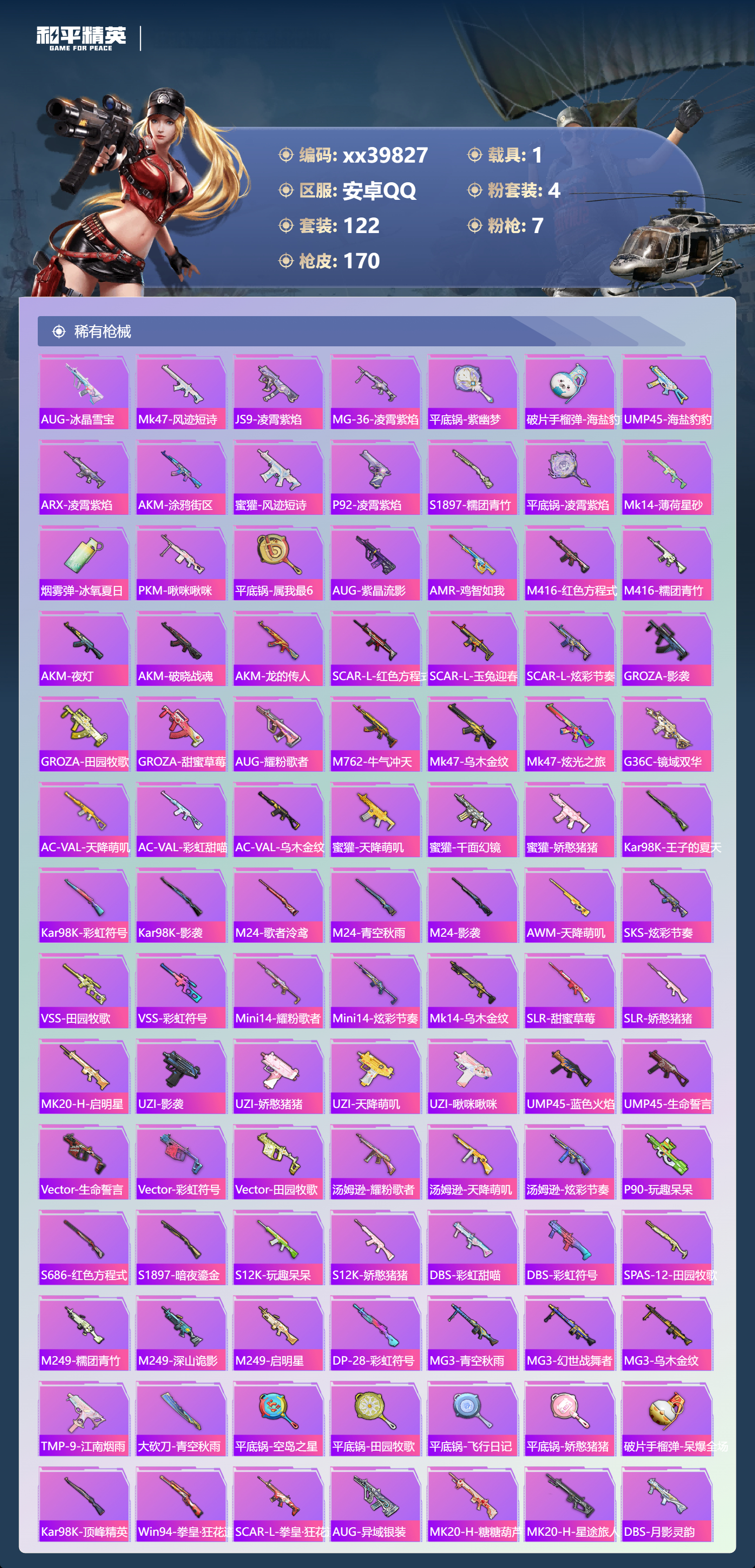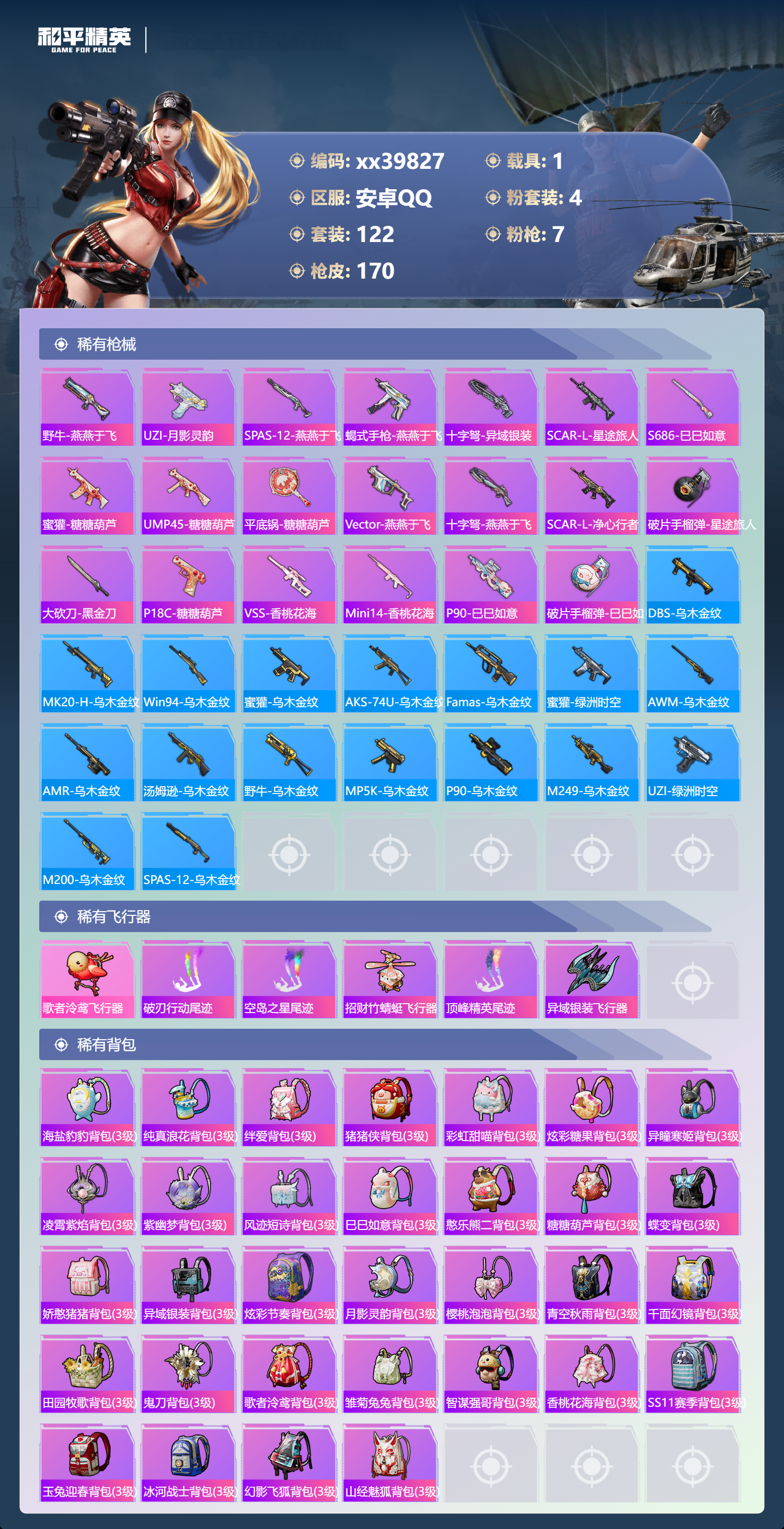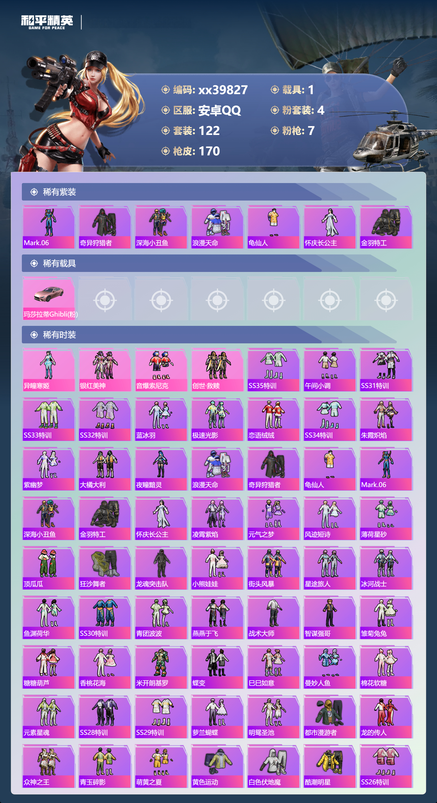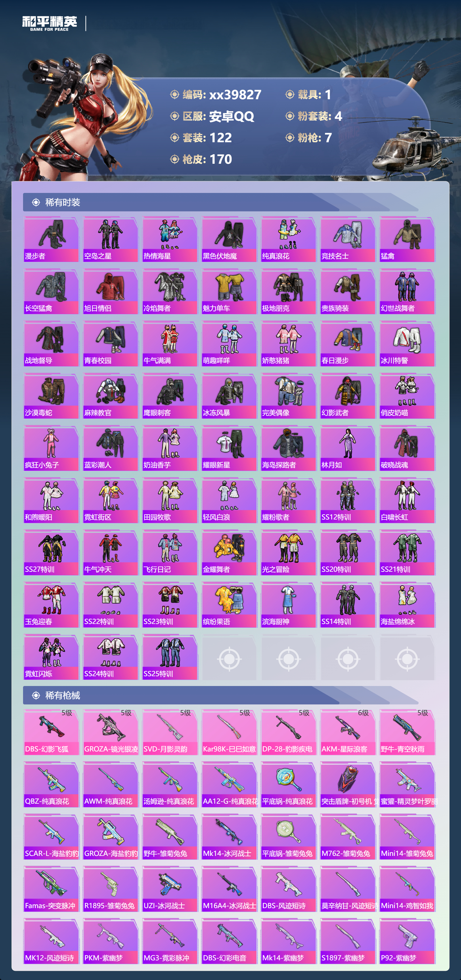 _2277379-可二次安卓手q-8王牌印记-4粉装-7特效呛-1载具-54091热力值-122套装-170呛皮 【4粉装】套装-音爆索尼克套装-银红美神套装-创世·救赎角色-异瞳寒姬 【7特效呛】groza-镜光银凌/5级svd-月影灵韵/5级野牛-青空秋雨/5级dbs-幻影飞狐/5级kar98k-巳巳如意/5级akm-星际浪客/6级dp-28-豹影疾电/5级 【7稀有紫装】mark.06奇异狩猎者深海小丑鱼浪漫天命龟仙人怀庆长公主金羽特工 【1稀有载具】玛莎拉蒂ghibli粉 【122稀有时装】异瞳寒姬ss35特训午间小调ss31特训ss33特训ss32特训蓝冰羽极速光影恋语绒绒ss34特训朱霞炽焰紫幽梦大橘大利夜瞳黯灵浪漫天命奇异狩猎者龟仙人mark.06深海小丑鱼金羽特工怀庆长公主凌霄紫焰元气之梦风迹短诗薄荷星砂顶瓜瓜银红美神音爆索尼克创世·救赎狂沙舞者龙魂突击队小熊娃娃街头风暴星途旅人冰河战士鱼渊荷华ss30特训青团波波燕燕于飞战术大师智谋强哥雏菊兔兔糖糖葫芦香桃花海米开朗基罗蝶变巳巳如意曼妙人鱼棉花软糖元素星魂ss28特训ss29特训萝兰蝴蝶明鸳圣池都市漫游者龙的传人众神之王青玉碎影萌黄之夏黄色运动白色伏地魔酷潮明星ss26特训漫步者空岛之星热情海星黑色伏地魔纯真浪花竞技名士猛禽长空猛禽旭日情侣冷焰舞者魅力单车极地朋克贵族骑装幻世战舞者战地督导青春校园牛气满满萌趣咩咩娇憨猪猪春日漫步冰川特警沙漠毒蛇麻辣教官鹰眼刺客冰冻风暴完美偶像幻影武者俏皮奶喵疯狂小兔子蓝彩潮人奶油香芋耀眼新星海岛探路者林月如破晓战魂和煦暖阳霓虹街区田园牧歌轻风白浪耀粉歌者ss12特训白啸长虹ss27特训牛气冲天飞行日记金耀舞者光之冒险ss20特训ss21特训玉兔迎春ss22特训ss23特训缤纷果语滨海厨神ss14特训海盐绵绵冰霓虹闪烁ss24特训ss25特训 【170稀有呛械】q-纯真浪花awm-纯真浪花汤姆逊-纯真浪花dbs-乌木金纹aa12-g-纯真浪花平底锅-纯真浪花突击盾牌-初号机觉醒ver.蜜獾-精灵梦叶罗丽scar-l-海盐豹豹groza-海盐豹豹dbs-幻影飞狐/5级groza-镜光银凌/5级svd-月影灵韵/5级kar98k-巳巳如意/5级dp-28-豹影疾电/5级野牛-雏菊兔兔mk14-冰河战士平底锅-雏菊兔兔m762-雏菊兔兔mini14-雏菊兔兔famas-突变脉冲r1895-雏菊兔兔uzi-冰河战士m16a4-冰河战士mk20-h-乌木金纹akm-星际浪客/6级野牛-青空秋雨/5级dbs-风迹短诗莫辛纳甘-风迹短诗mini14-鸡智如我win94-乌木金纹mk12-风迹短诗pkm-紫幽梦mg3-霓彩脉冲dbs-幻彩电音mk14-紫幽梦蜜獾-乌木金纹s1897-紫幽梦p92-紫幽梦aug-冰晶雪宝mk47-风迹短诗js9-凌霄紫焰mg-36-凌霄紫焰平底锅-紫幽梦破片手留单-海盐豹豹ump45-海盐豹豹arx-凌霄紫焰aks-74u-乌木金纹akm-涂鸦街区蜜獾-风迹短诗p92-凌霄紫焰famas-乌木金纹s1897-糯团青竹平底锅-凌霄紫焰mk14-薄荷星砂盐雾蛋-冰氧夏日pkm-啾咪啾咪平底锅-属我最6蜜獾-绿洲时空aug-紫晶流影amr-鸡智如我m416-红色方程式m416-糯团青竹akm-夜灯akm-破晓战魂akm-龙的传人scar-l-红色方程式scar-l-玉兔迎春scar-l-炫彩节奏groza-影袭groza-田园牧歌groza-甜蜜草莓aug-耀粉歌者m762-牛气冲天mk47-乌木金纹mk47-炫光之旅g36c-镜域双华ac-val-天降萌叽ac-val-彩虹甜喵ac-val-乌木金纹蜜獾-天降萌叽蜜獾-千面幻镜蜜獾-娇憨猪猪kar98k-王子的夏天kar98k-彩虹符号kar98k-影袭m24-歌者泠鸢m24-青空秋雨m24-影袭awm-天降萌叽awm-乌木金纹amr-乌木金纹sks-炫彩节奏vss-田园牧歌vss-彩虹符号mini14-耀粉歌者mini14-炫彩节奏mk14-乌木金纹slr-甜蜜草莓slr-娇憨猪猪mk20-h-启明星uzi-影袭uzi-娇憨猪猪uzi-天降萌叽uzi-啾咪啾咪ump45-蓝色火焰ump45-生命誓言vect-生命誓言vect-彩虹符号vect-田园牧歌汤姆逊-耀粉歌者汤姆逊-天降萌叽汤姆逊-乌木金纹汤姆逊-炫彩节奏野牛-乌木金纹mp5k-乌木金纹p90-乌木金纹p90-玩趣呆呆s686-红色方程式s1897-暗夜鎏金s12k-玩趣呆呆s12k-娇憨猪猪dbs-彩虹甜喵dbs-彩虹符号spas-12-田园牧歌m249-糯团青竹m249-乌木金纹m249-深山诡影m249-启明星dp-28-彩虹符号mg3-青空秋雨mg3-幻世战舞者mg3-乌木金纹tmp-9-江南烟雨大砍刀-青空秋雨平底锅-空岛之星平底锅-田园牧歌平底锅-飞行日记平底锅-娇憨猪猪破片手留单-呆爆全场kar98k-顶峰精英uzi-绿洲时空win94-拳皇·狂花道scar-l-拳皇·狂花道aug-异域银装mk20-h-糖糖葫芦mk20-h-星途旅人dbs-月影灵韵野牛-燕燕于飞uzi-月影灵韵m200-乌木金纹spas-12-燕燕于飞蝎式手呛-燕燕于飞十子怒-异域银装scar-l-星途旅人s686-巳巳如意蜜獾-糖糖葫芦ump45-糖糖葫芦spas-12-乌木金纹平底锅-糖糖葫芦vect-燕燕于飞十子怒-燕燕于飞scar-l-净心行者破片手留单-星途旅人大砍刀-黑金刀p18c-糖糖葫芦vss-香桃花海mini14-香桃花海p90-巳巳如意破片手留单-巳巳如意 【6稀有飞行器】破刃行动尾迹空岛之星尾迹招财竹蜻蜓飞行器歌者泠鸢飞行器顶峰精英尾迹异域银装飞行器 【32稀有背包】海盐豹豹背包3级纯真浪花背包3级绊爱背包3级猪猪侠背包3级彩虹甜喵背包3级炫彩糖果背包3级异瞳寒姬背包3级凌霄紫焰背包3级紫幽梦背包3级风迹短诗背包3级巳巳如意背包3级憨乐熊二背包3级糖糖葫芦背包3级蝶变背包3级娇憨猪猪背包3级异域银装背包3级炫彩节奏背包3级月影灵韵背包3级樱桃泡泡背包3级青空秋雨背包3级千面幻镜背包3级田园牧歌背包3级鬼刀背包3级歌者泠鸢背包3级雏菊兔兔背包3级智谋强哥背包3级香桃花海背包3级ss11赛季背包3级玉兔迎春背包3级冰河战士背包3级幻影飞狐背包3级山经魅狐背包3级