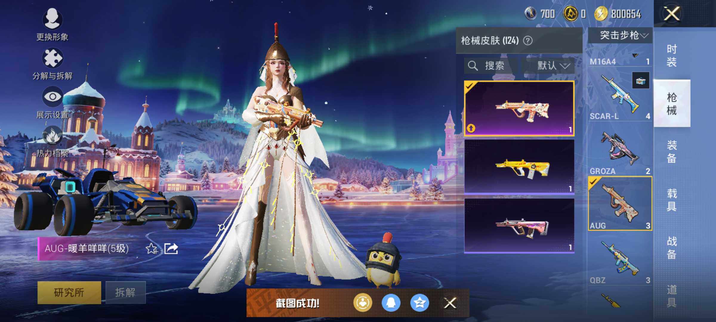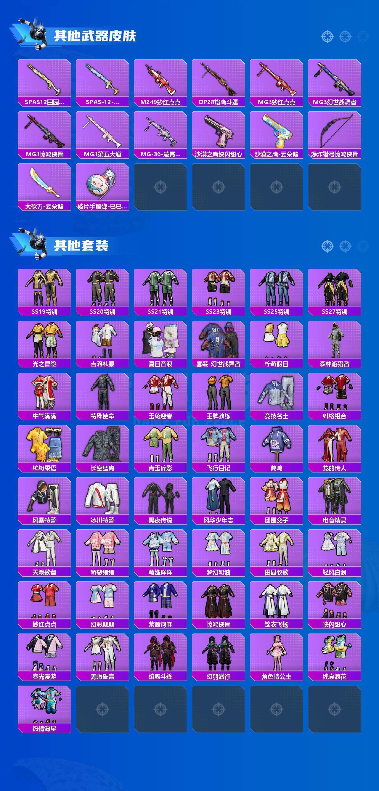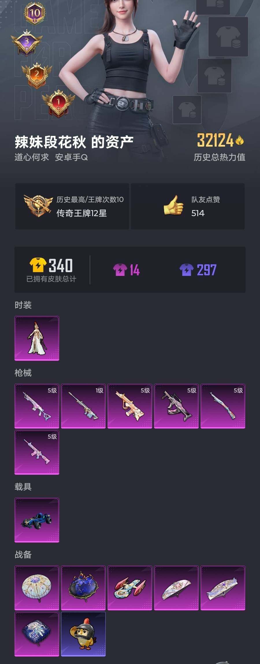 6036-1粉装-6特效呛-1载具-1粉色飞行器-32124热力值-10王牌印记-67套装-124呛皮 【粉色载具】:合金龙骨(蓝) 【粉色套装】:角色-萨利娅 【粉色呛皮等级】:m416-电玩时刻五级,groza-镜光银凌五级,aug-暖羊咩咩五级,kar98k-巳巳如意五级,mk14-甜梦熊击五级,amr-智耀战神一级 【粉色呛皮】:m416-电玩时刻,groz