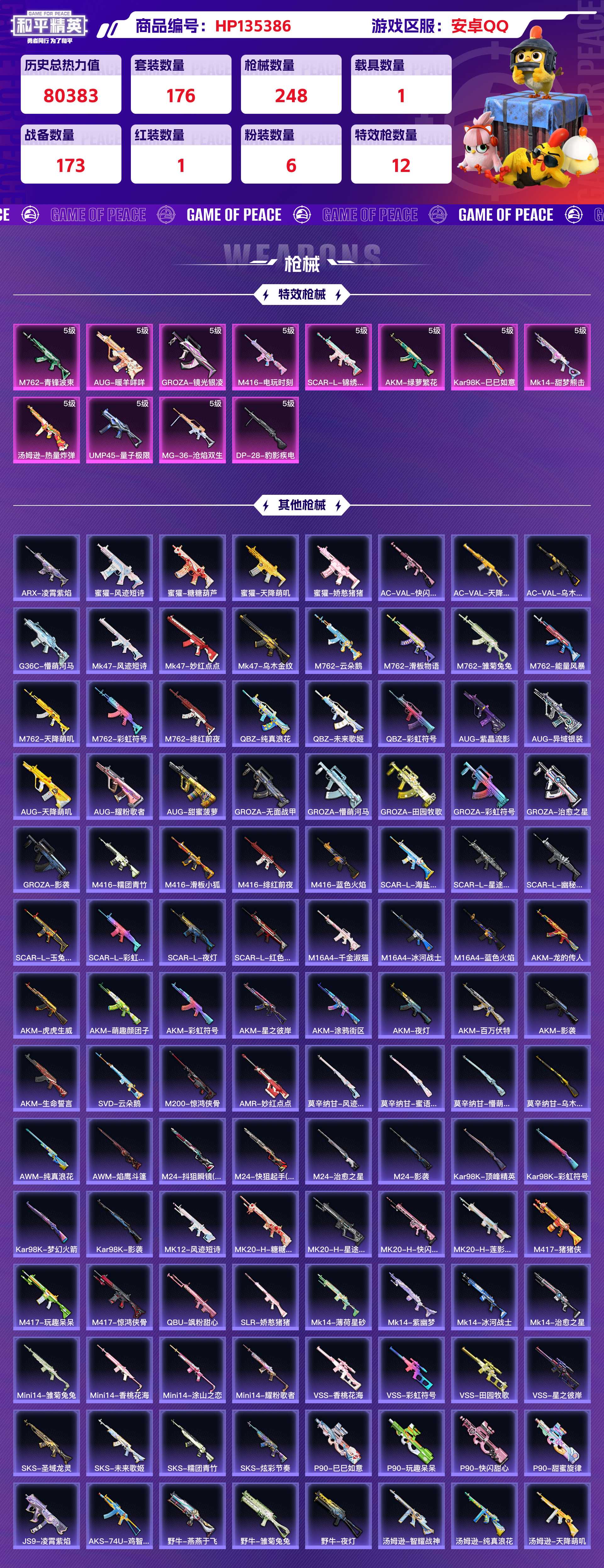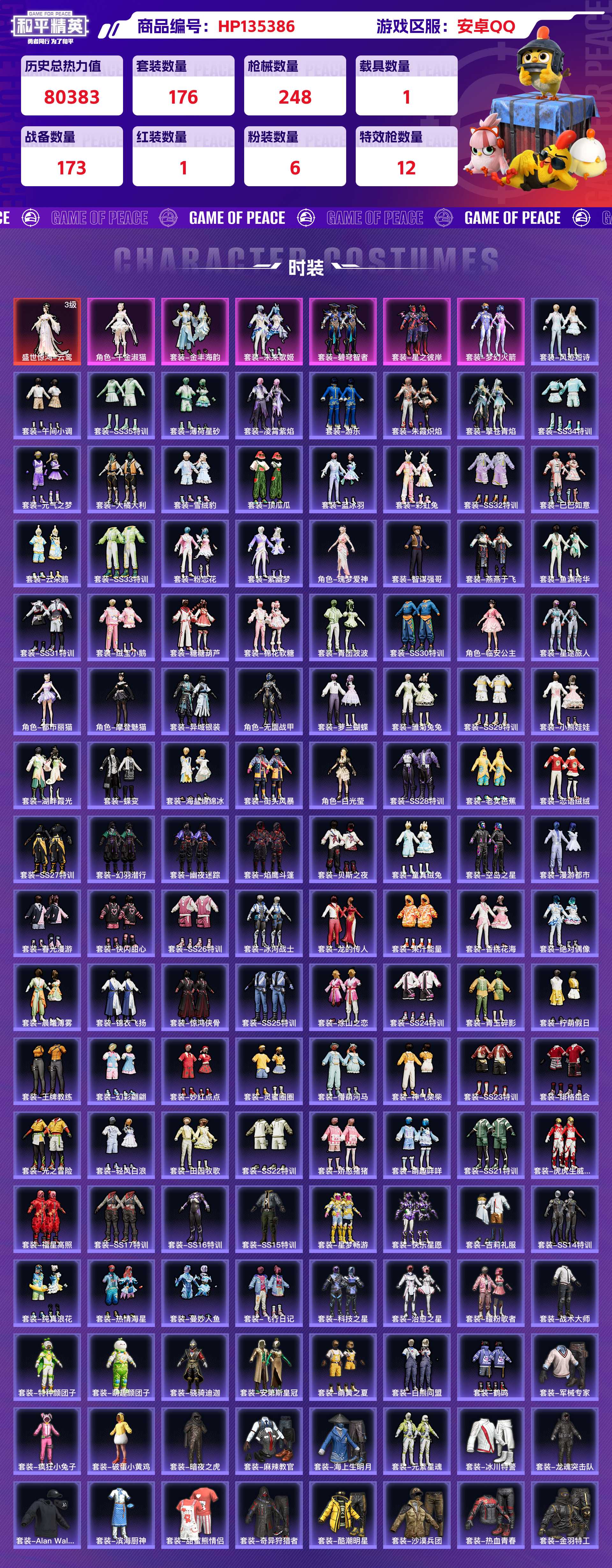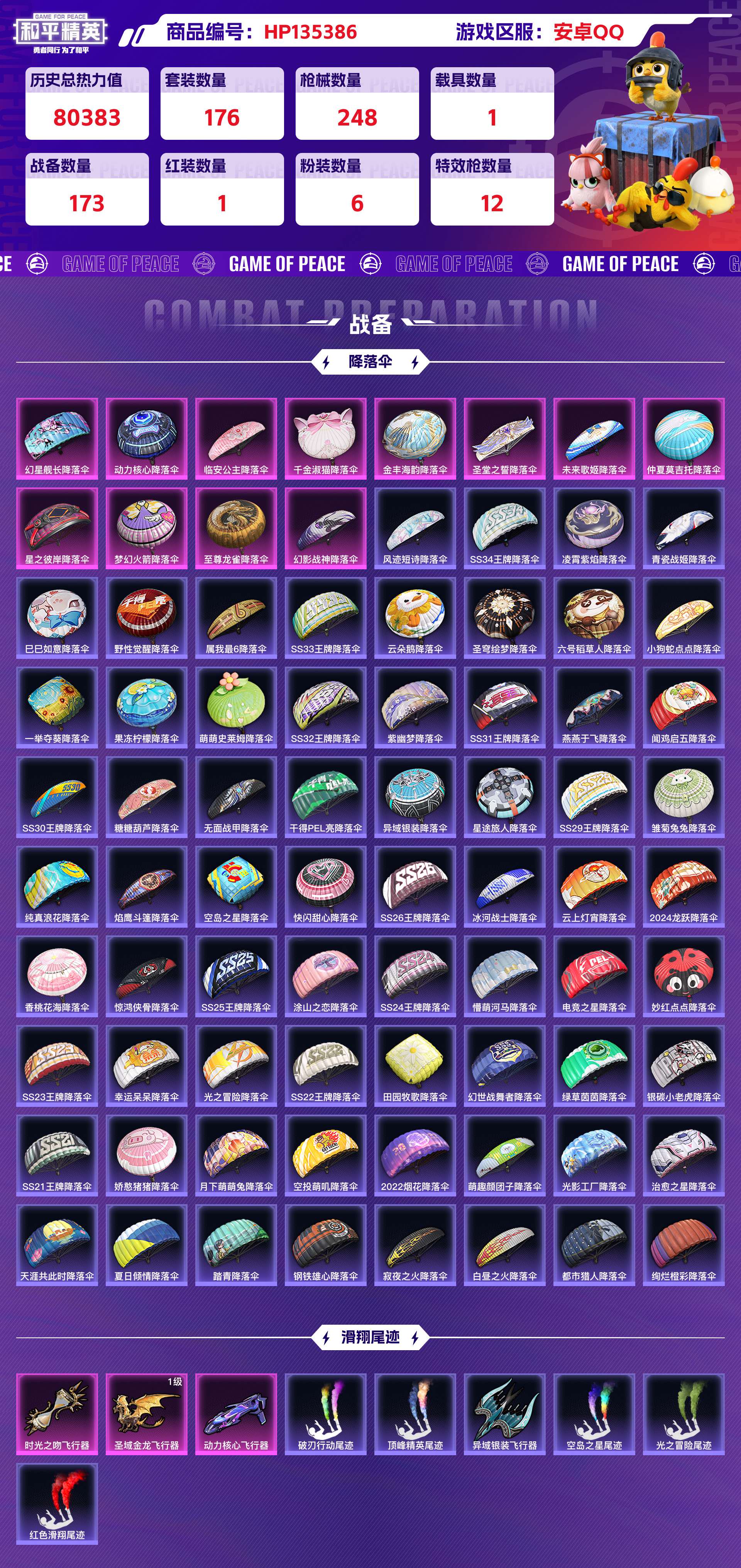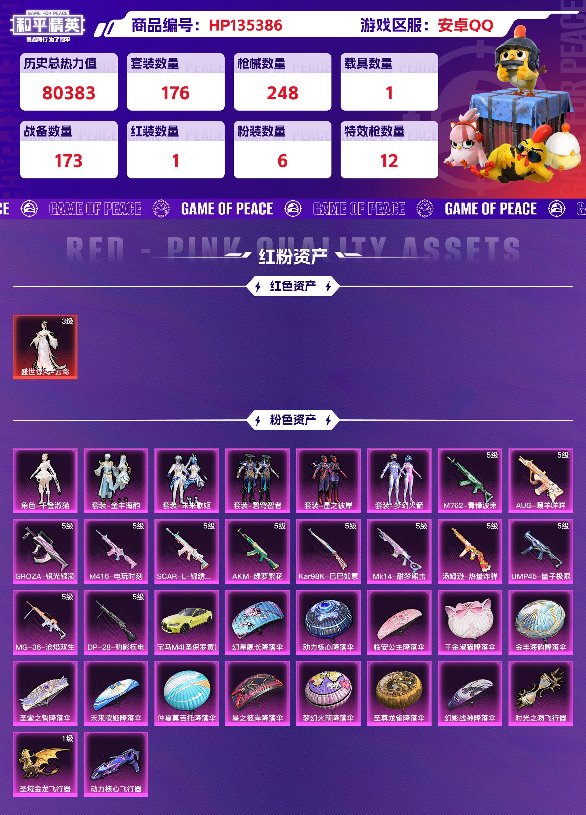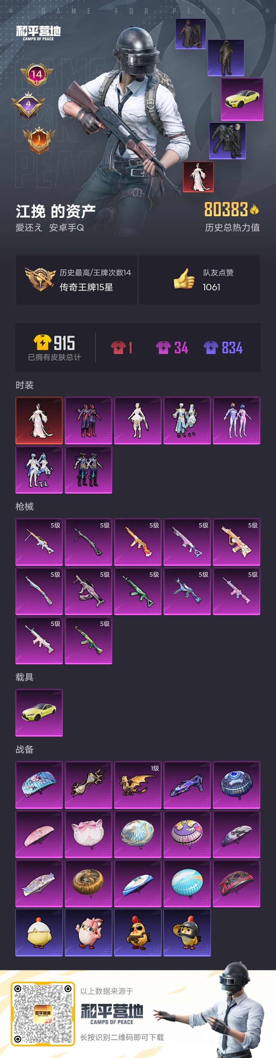 _2238131-安卓qq历史总热力值:80383红装数量:1粉装数量:6特效呛数量:12载具数量:1王牌印记:14历史最高段位:传奇王牌15星套装数量:176时装数量:650呛械数量:248战备数量:173装备数量:317载具:宝马m4圣保罗黄时装:盛世惊鸿-云鸾3级套装-星之彼岸套装-未来歌姬套装-梦幻火箭套装-碧穹智者套装-金丰海韵角色-千金淑猫套装-alanwalker套装-ss14特训套装-ss15特训套装-ss16特训套装-ss17特训套装-ss21特训套装-ss22特训套装-ss23特训套装-ss24特训套装-ss25特训套装-ss26特训套装-ss27特训套装-ss28特训套装-ss29特训套装-ss30特训套装-ss31特训套装-ss32特训套装-ss33特训套装-ss34特训套装-ss35特训套装-云朵鹅套装-元气之梦套装-元素星魂套装-光之冒险套装-军械专家套装-冰冻风暴套装-冰川特警套装-冰河战士套装-冷焰舞者套装-凌霄紫焰套装-千禧之恋套装-午间小调套装-吉莉礼服套装-坚韧舞者套装-大橘大利套装-奇异狩猎者套装-妙红点点套装-娇憨猪猪套装-安第斯皇冠套装-小熊娃娃套装-巳巳如意套装-幻彩翩翩套装-幻影武者套装-幻羽潜行套装-幽夜迷踪套装-异域银装套装-彩虹兔套装-快乐星愿套装-快闪甜心套装-怒火燎原套装-恋语绒绒套装-惊鸿侠骨套装-懵萌河马套装-战术大师套装-擎苍青焰套装-旭日情侣套装-星梦畅游套装-星途旅人套装-春光漫游套装-晨曦薄雾套装-智谋强哥套装-暗夜之虎套装-曼妙人鱼套装-朱霞炽焰套装-果汁能量套装-柠萌假日套装-棉花软糖套装-橘黑制服套装-沙漠兵团套装-沙漠毒蛇套装-治愈之星套装-浪漫天命套装-海上生明月套装-海岛探路者套装-海盐绵绵冰套装-涂山之恋套装-深蓝色名流套装-游乐套装-湖畔霞光套装-湖蓝色名流套装-滨海厨神套装-漫步者套装-漫游都市套装-灵蜜圈圈套装-灼焰舞者套装-热情海星套装-热血青春套装-焰鹰斗篷套装-燕燕于飞套装-特战英豪套装-特战装甲套装-特种颜团子套装-猎鹰套装-猛禽套装-王牌教练套装-甜蜜熊情侣套装-田园牧歌套装-疯狂小兔子套装-白熊同盟套装-白色伏地魔套装-破蛋小黄鸡套装-神气柴柴套装-福星高照套装-科技之星套装-空岛之星套装-竞技名士套装-童真绒兔套装-粉恋花套装-糖糖葫芦套装-紫幽梦套装-红色运动套装-纯真浪花套装-绒宝小鹅套装-绝对偶像套装-绮丽涂鸦套装-绯格组合套装-耀眼新星套装-耀粉歌者套装-老实芭蕉套装-萌趣咩咩套装-萌趣颜团子套装-萌黄之夏套装-萝兰蝴蝶套装-蓝冰羽套装-蓝彩潮人套装-蓝色运动套装-薄荷星砂套装-虎虎生威吉莉套装-蝶变套装-街头潮人套装-街头风暴套装-贝斯之夜套装-轻风白浪套装-都市漫游者套装-都市猎人套装-酒红色名流套装-酷潮明星套装-野性战心套装-金羽特工套装-锦衣飞扬套装-长空猛禽套装-雏菊兔兔套装-雨林探路者套装-雪绒豹套装-青团波波套装-青玉碎影套装-顶瓜瓜套装-风迹短诗套装-飞行日记套装-香桃花海套装-骁骑迪迦套装-魅力单车套装-鱼渊荷华套装-鹤鸣套装-鹰眼刺客套装-麻辣教官套装-黄色伏地魔套装-黄色名流套装-黄色运动套装-黑色伏地魔套装-龙的传人套装-龙腾端午套装-龙魂突击队角色-临安公主角色-摩登魅猫角色-无面战甲角色-瑰梦爱神角色-白光莹角色-都市丽猫呛械:akm-绿萝繁花5级aug-暖羊咩咩5级groza-镜光银凌5级m416-电玩时刻5级m762-青锋波束5级scar-l-锦绣绵绵5级ac-val-乌木金纹ac-val-天降萌叽ac-val-快闪甜心akm-夜灯akm-彩虹符号akm-影袭akm-星之彼岸akm-涂鸦街区akm-生命誓言akm-百万伏特akm-萌趣颜团子akm-虎虎生威akm-龙的传人arx-凌霄紫焰aug-天降萌叽aug-异域银装aug-甜蜜菠萝aug-紫晶流影aug-耀粉歌者g36c-懵萌河马groza-彩虹符号groza-影袭groza-懵萌河马groza-无面战甲groza-治愈之星groza-田园牧歌m16a4-冰河战士m16a4-千金淑猫m16a4-蓝色火焰m416-滑板小狐m416-糯团青竹m416-绯红前夜m416-蓝色火焰m762-云朵鹅m762-天降萌叽m762-彩虹符号m762-滑板物语m762-绯红前夜m762-能量风暴m762-雏菊兔兔mk47-乌木金纹mk47-妙红点点mk47-风迹短诗q-彩虹符号q-未来歌姬q-纯真浪花scar-l-夜灯scar-l-幽秘魅影scar-l-彩虹符号scar-l-星途旅人scar-l-海盐豹豹scar-l-玉兔迎春scar-l-红色方程式蜜獾-天降萌叽蜜獾-娇憨猪猪蜜獾-糖糖葫芦蜜獾-风迹短诗kar98k-巳巳如意5级amr-妙红点点awm-焰鹰斗篷awm-纯真浪花kar98k-彩虹符号kar98k-影袭kar98k-梦幻火箭kar98k-顶峰精英m200-惊鸿侠骨m24-影袭m24-快狙起手快手m24-抖狙瞬镜抖音m24-治愈之星svd-云朵鹅莫辛纳甘-乌木金纹莫辛纳甘-懵萌河马莫辛纳甘-蜜语绒猫莫辛纳甘-风迹短诗mk14-甜梦熊击5级m417-惊鸿侠骨m417-猪猪侠m417-玩趣呆呆mk12-风迹短诗mk20-h-快闪甜心mk20-h-星途旅人mk20-h-糖糖葫芦mk20-h-莲影清波mini14-涂山之恋mini14-耀粉歌者mini14-雏菊兔兔mini14-香桃花海mk14-冰河战士mk14-治愈之星mk14-紫幽梦mk14-薄荷星砂qbu-飒粉甜心sks-圣域龙灵sks-未来歌姬sks-炫彩节奏sks-糯团青竹slr-娇憨猪猪vss-彩虹符号vss-星之彼岸vss-田园牧歌vss-香桃花海ump45-量子极限5级汤姆逊-热量炸弹5级aks-74u-鸡智如我js9-凌霄紫焰p90-巳巳如意p90-快闪甜心p90-玩趣呆呆p90-甜蜜旋律ump45-海盐豹豹ump45-涂山之恋ump45-生命誓言ump45-糖糖葫芦ump45-绒宝小鹅ump45-蓝色火焰uzi-冰河战士uzi-啾咪啾咪uzi-天降萌叽uzi-娇憨猪猪uzi-幻影战神uzi-影袭uzi-炫彩节奏vect-动力核心vect-彩虹符号vect-治愈之星vect-焰鹰斗篷vect-燕燕于飞vect-生命誓言vec