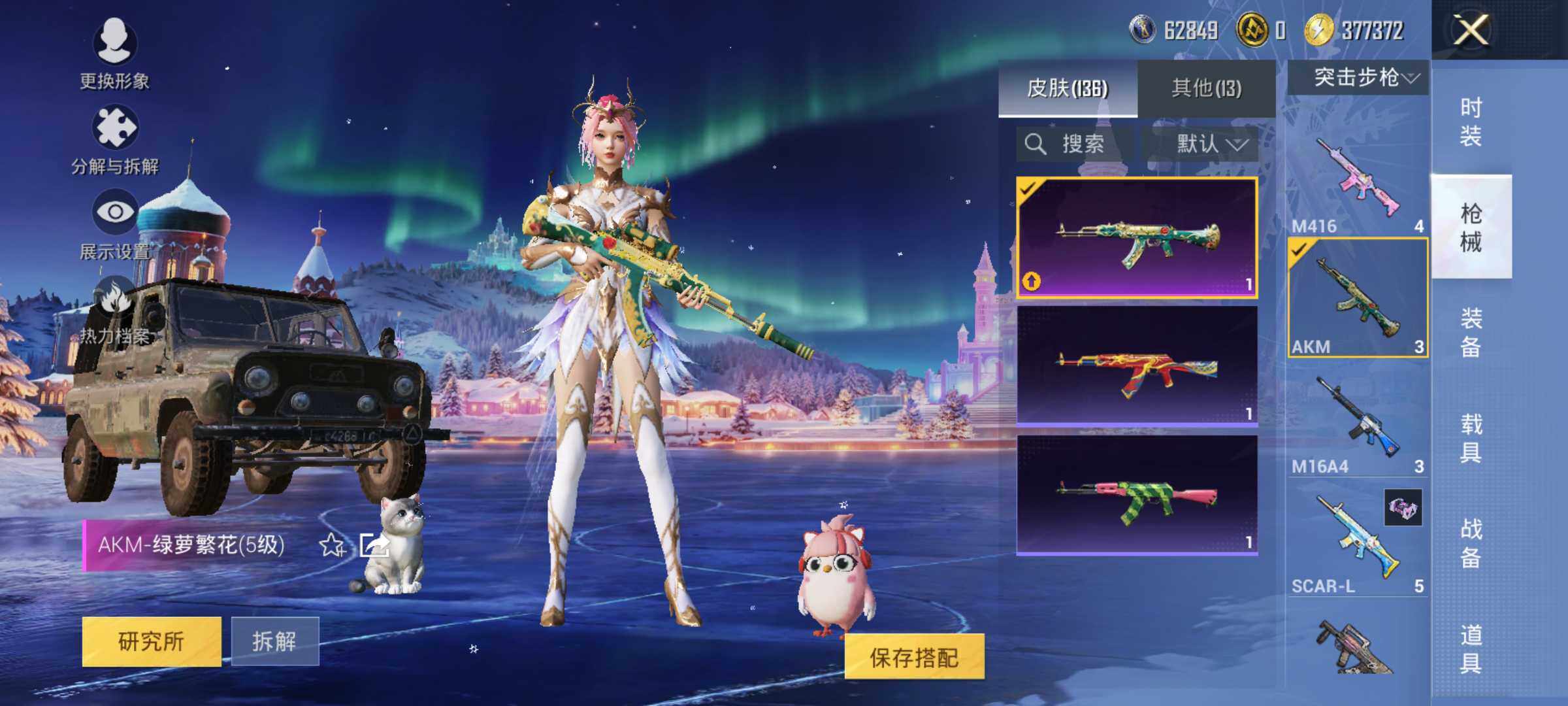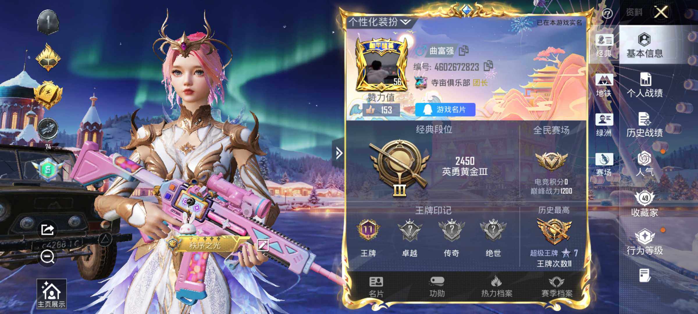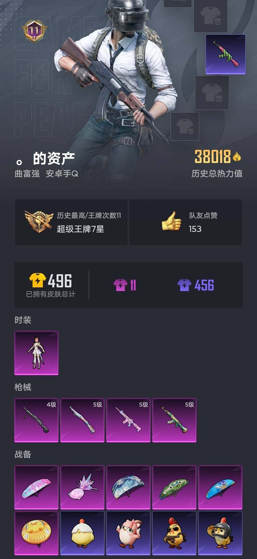 6038-1粉装-4特效呛-0载具-1粉色飞行器-38018热力值-11王牌印记-105套装-135呛皮 【热门品类】:套装-金羽特工,套装-龟仙人 【粉色套装】:角色-圣堂之誓 【粉色呛皮等级】:akm-绿萝繁花五级,m416-电玩时刻五级,kar98k-巳巳如意五级,dp-28-豹影疾电四级 【粉色呛皮】:akm-绿萝繁花,m416-电玩时刻,kar98k-巳巳如意,d