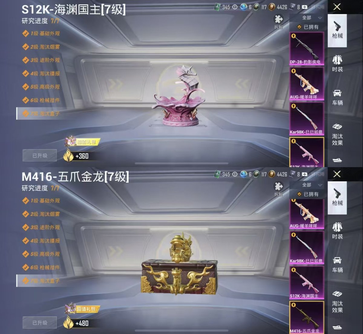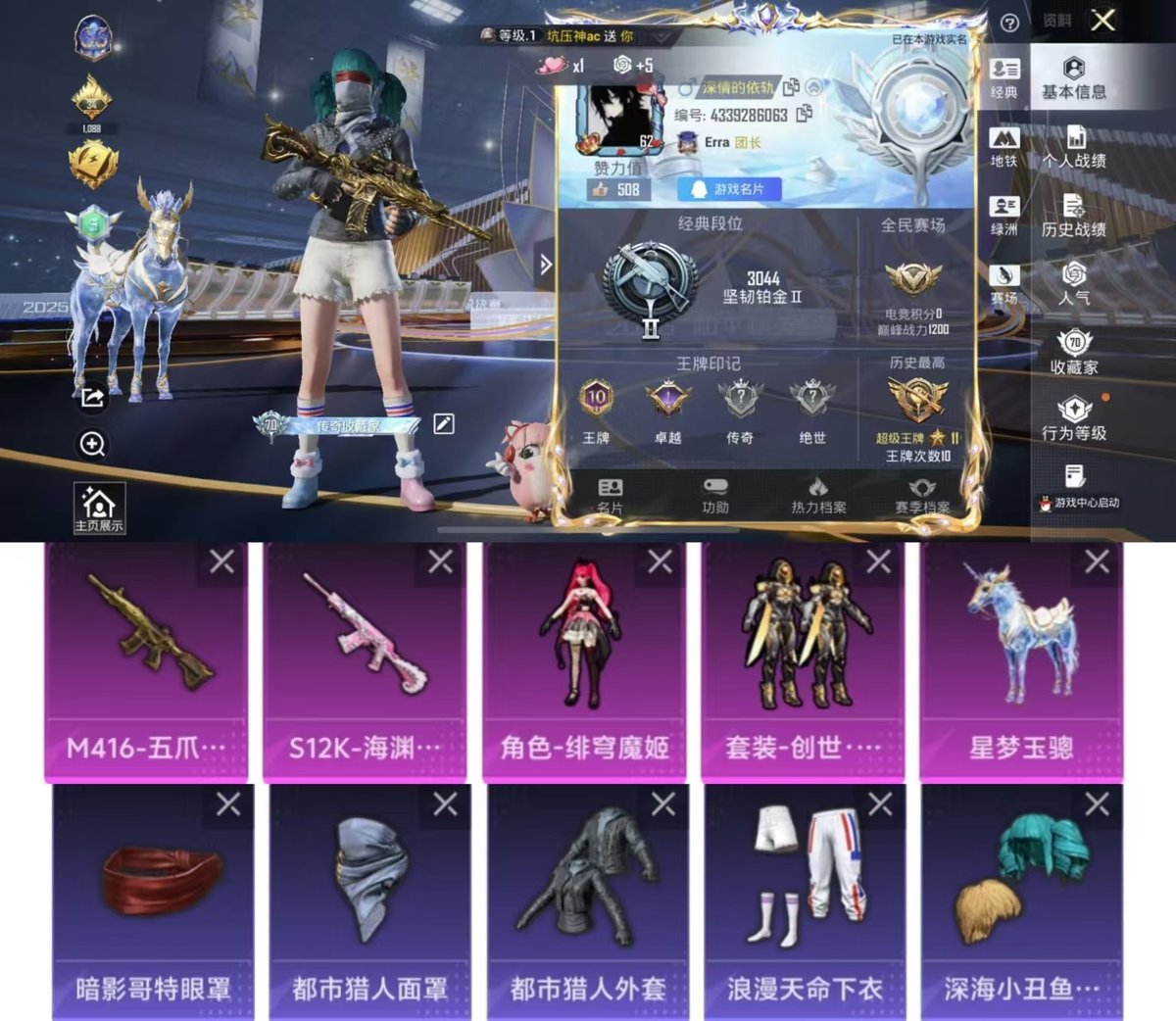 2289055-实名: 可修改 时装数: 837 载具数: 1 呛械数: 263 战备数: 185 热门装扮: 深海小丑鱼鹰眼刺客都市猎人恒星战甲极致幻想相思残雪海渊国主奇迹天团兔兔白日梦仲夏莫吉托创世·救赎绯穹魔姬 载具: 星梦玉骢 稀有呛皮: m416五爪金龙s12k海渊国主kar98k-巳巳如意aug-暖羊咩咩dp-28-豹影疾电
