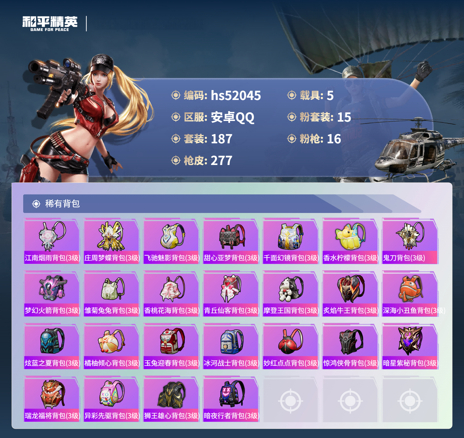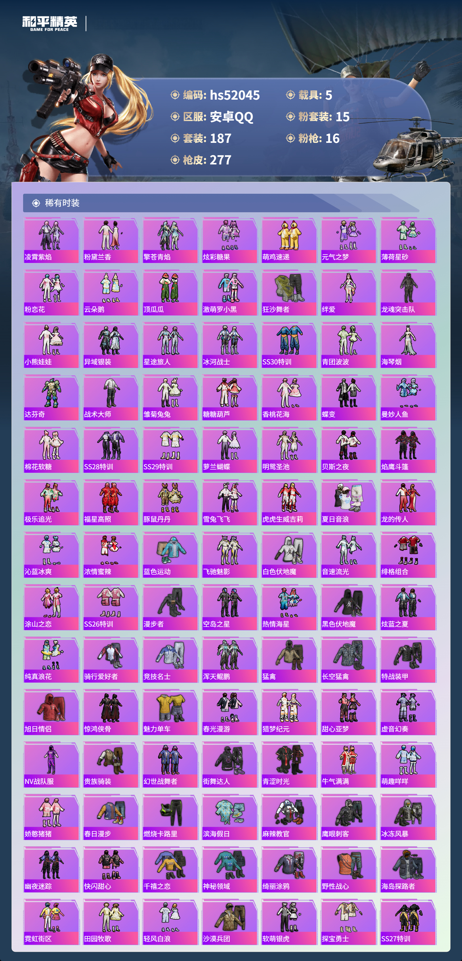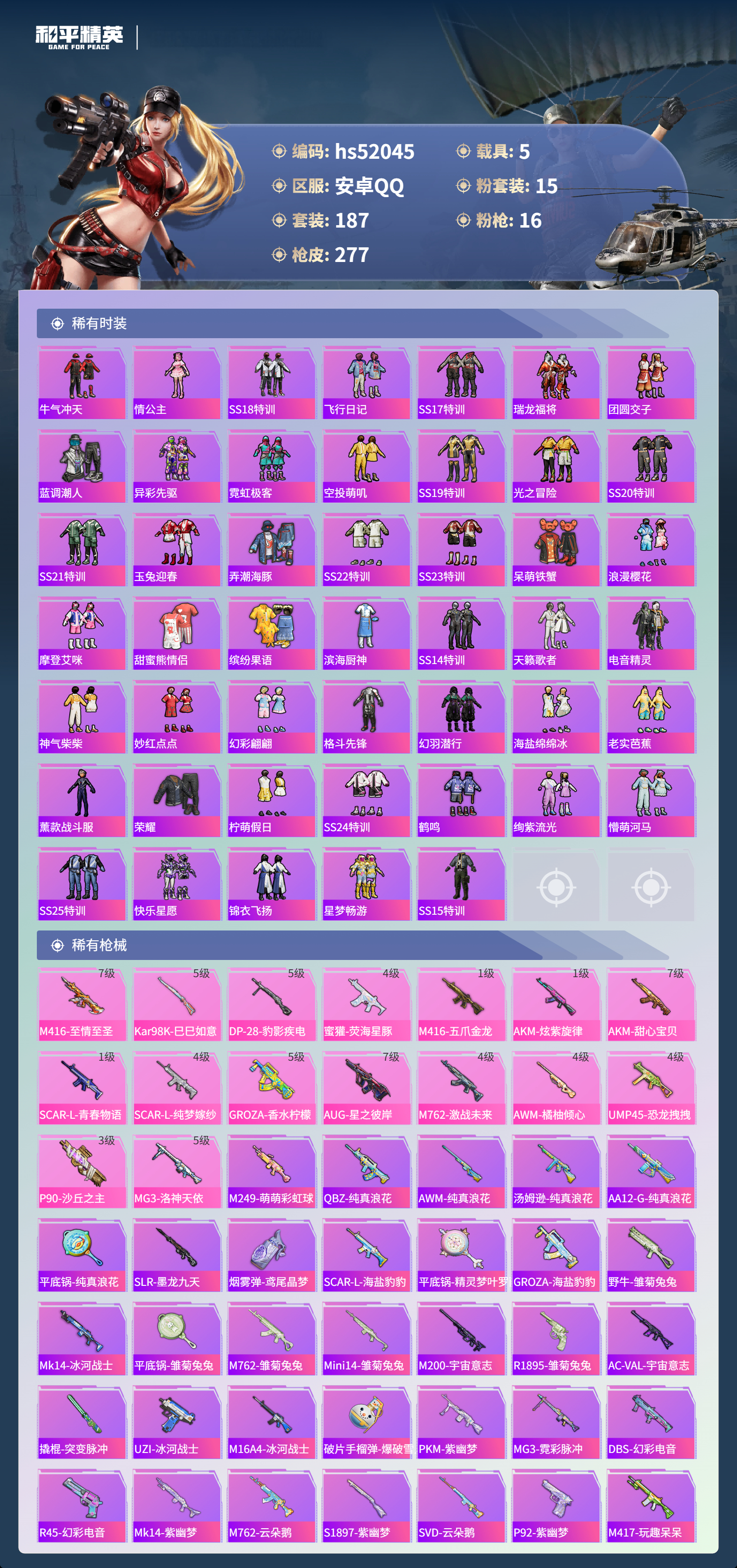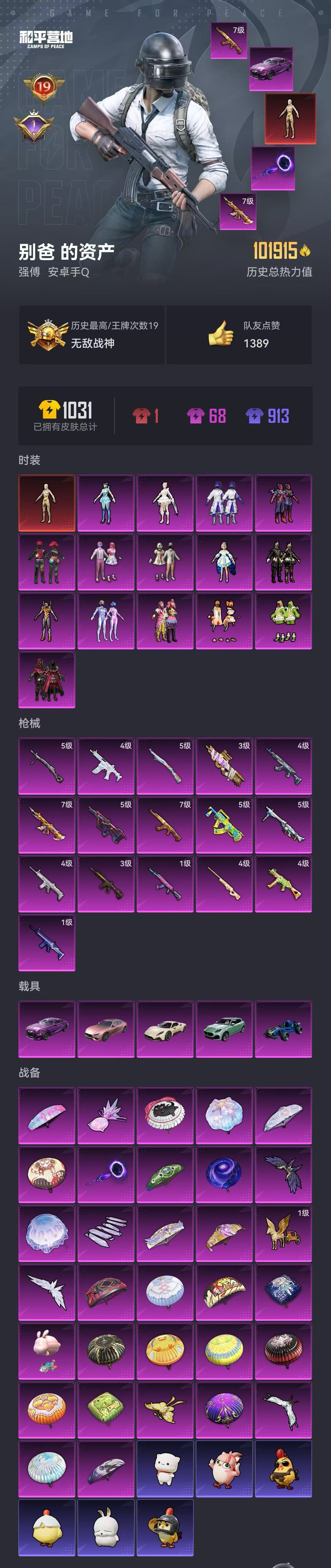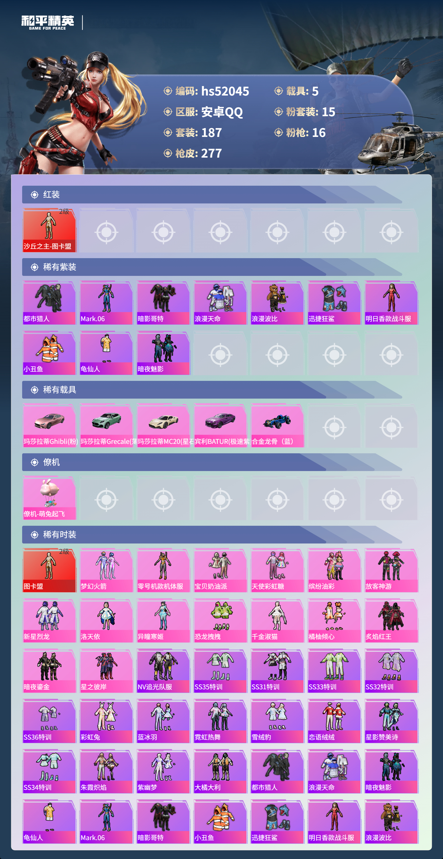 hs52045 安卓手q-19王牌印记-有战神框-1红装-15粉装-16特效呛-5载具-热力值-187套装-277呛皮-1卓越印记【1红装】沙丘之主-图卡盟/2级【15粉装】套装-缤纷油彩套装-暗夜鎏金套装-炙焰红王套装-新星烈龙角色-异瞳寒姬套装-宝贝奶油派套装-放客神游套装-星之彼岸套装-恐龙拽拽套装-橘柚倾心角色-千金淑猫套装-天使彩虹糖角色-洛天依