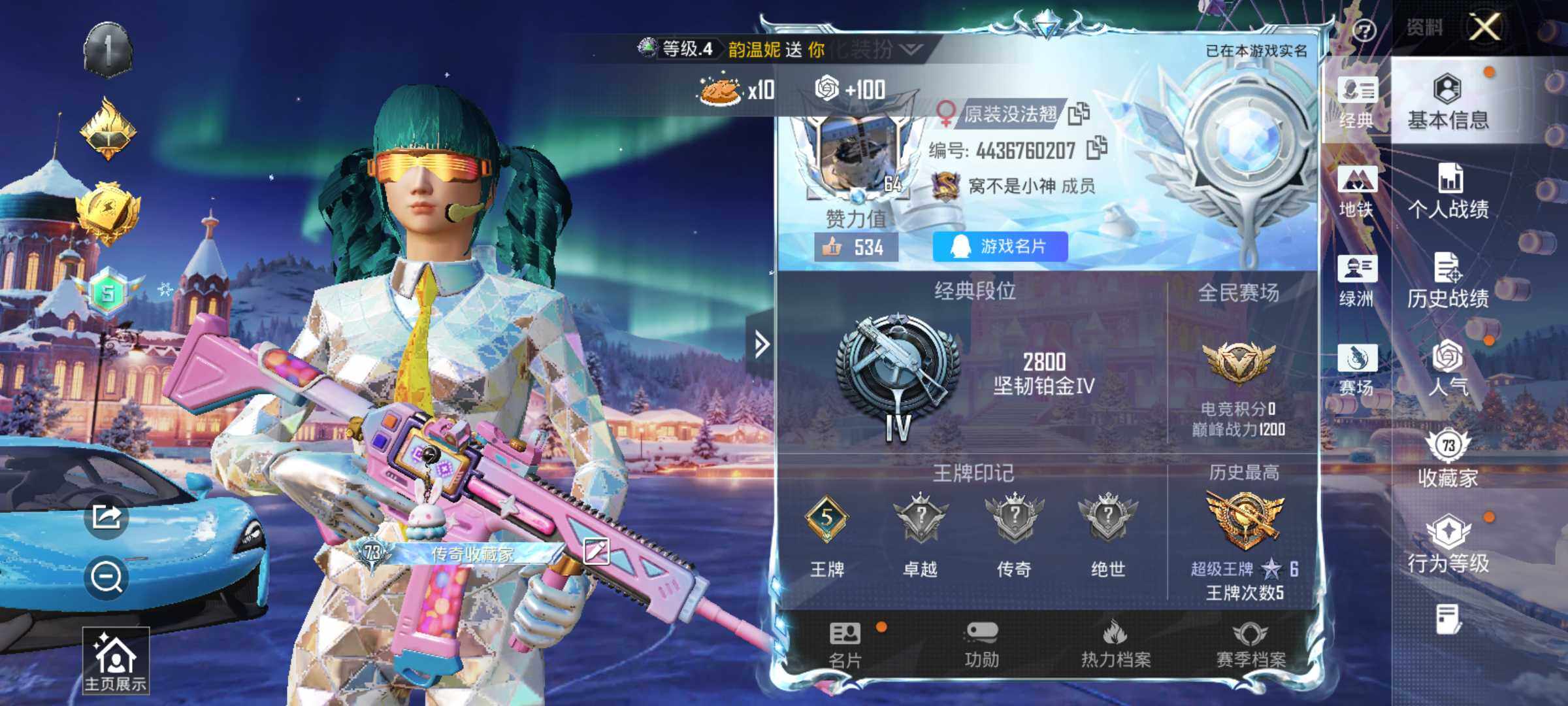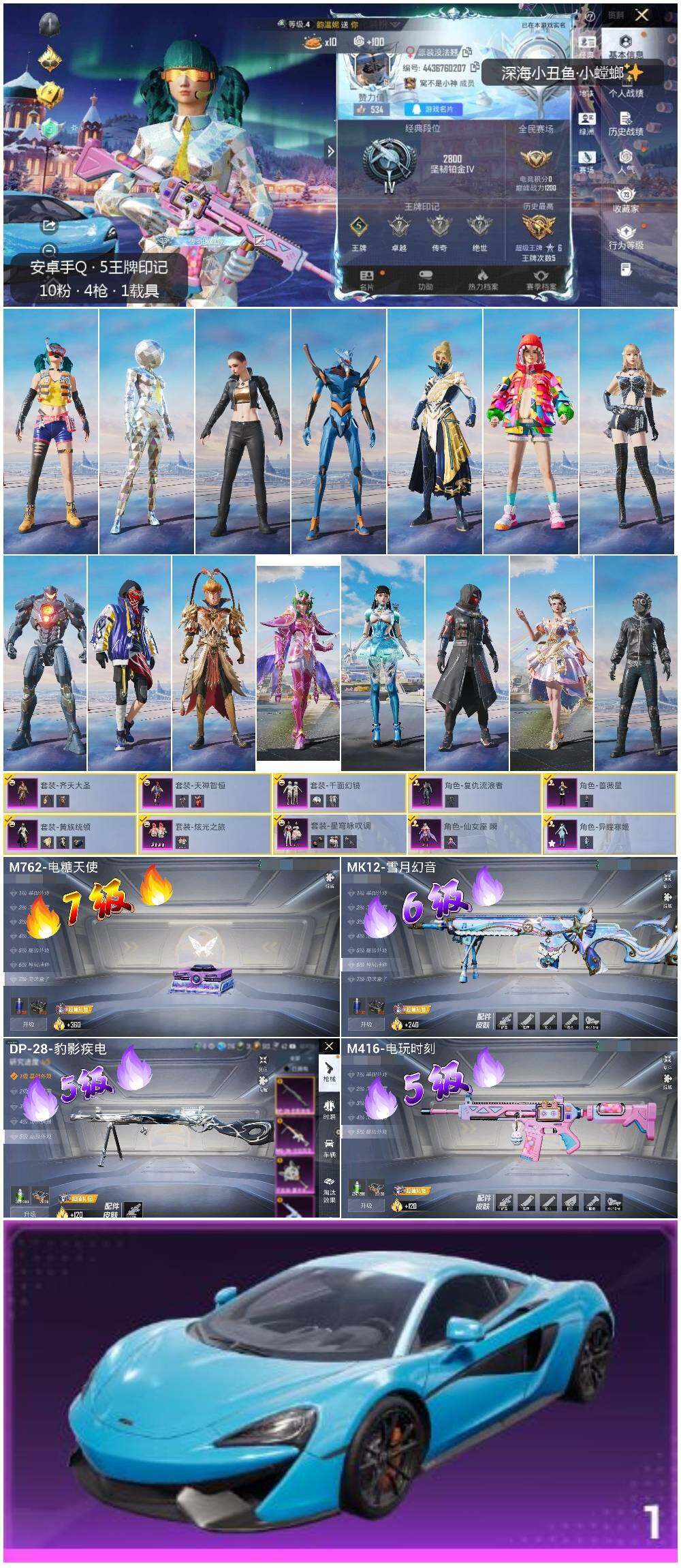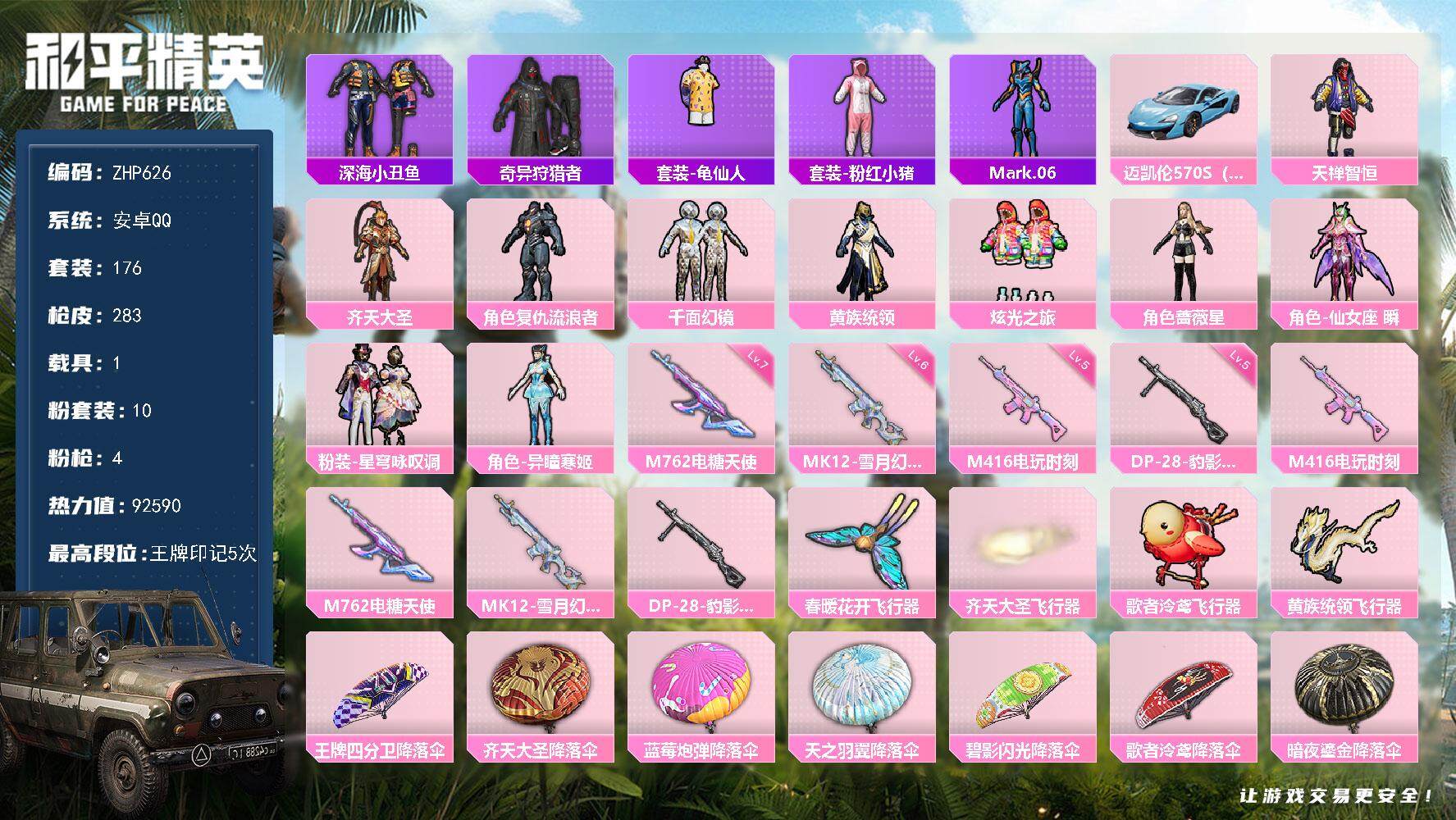 [14284707]【店主推荐捡漏号!可直接换绑】 安卓 手q-10粉装-4特效呛-1载具-5粉色飞行器-9.2w热力值-5王牌印记-176套装-283呛皮【热门品类】:套装-深海小丑鱼,套装-奇异狩猎者,套装-龟仙人,套装-粉红小猪,角色-mark.06【粉色载具】:迈凯伦570s(天际蓝)【粉色套装】:粉装-天禅智恒,粉装-齐天大圣,角色-复仇流浪者,粉装-千面幻镜,粉装-黄族统领,粉装-炫光之旅,角色-蔷薇星,角色-仙女座 瞬,粉装-星穹咏叹调,角色-异瞳寒姬【粉色呛皮等级】:m416-电玩时刻五级,m762-电糖天使七级,mk12-雪月幻音六级,dp-28-豹影疾电五级【粉色飞行器】:春暖花开飞行器,齐天大圣飞行器,歌者泠鸢飞行器,黄族统领飞行器