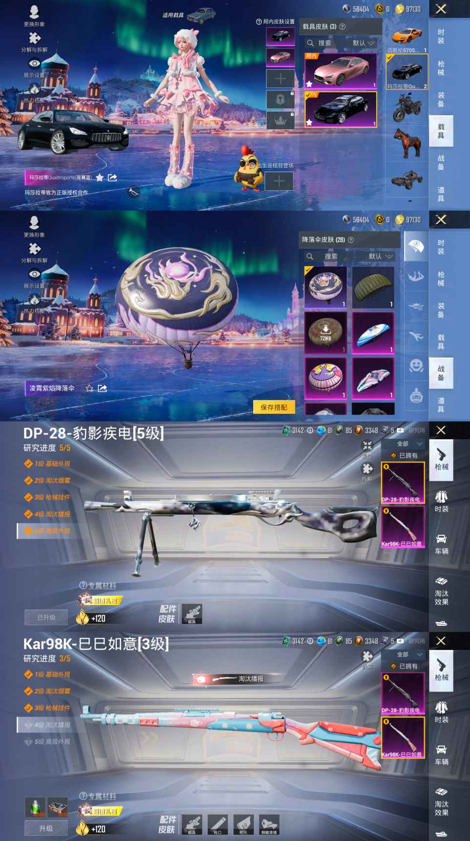 安卓q-3载具2粉装2特效呛5热门95套装96呛皮 34028热力值 1印记 历史超级王牌2星 【3载具】 玛莎拉蒂q蓝色 迈凯伦570s旭日黄 玛莎拉蒂粉色 【2粉装】 幻影 羊梦糖心 【2特效呛】 kar98k-巳巳如意 3级 dp-28-豹影疾电 5级 【5热门】 龟仙人 2b战斗服款 粉红小猪 破蛋小黄鸡 极速红龙 【1头盔】 深海小丑鱼头盔 蓝色运动 黄色伏