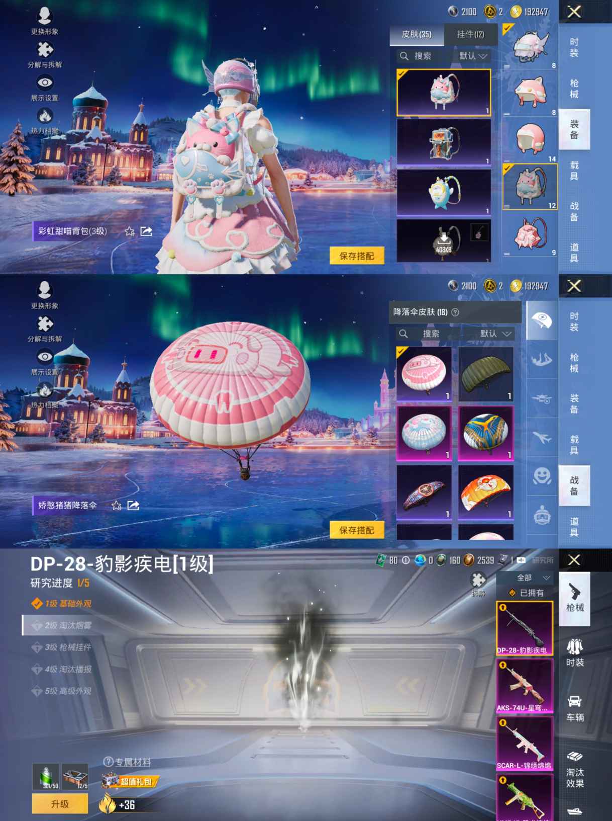 安卓q-1稀有1粉装4特效呛1热门57套装69呛皮 21044热力值 2印记 历史超级王牌2星 【1稀有】 浪漫天命 【1粉装】 蜜语绒猫 【4特效呛】 scar-l-锦绣绵绵 5级 aks-74u-星穹咏叹调 2级 dp-28-豹影疾电 1级 ump45-恐龙拽拽 6级 【1热门】 龟仙人 【1飞行器】 绝色倾城飞行器 【1背包】 梦幻火箭背包 白色伏地魔
