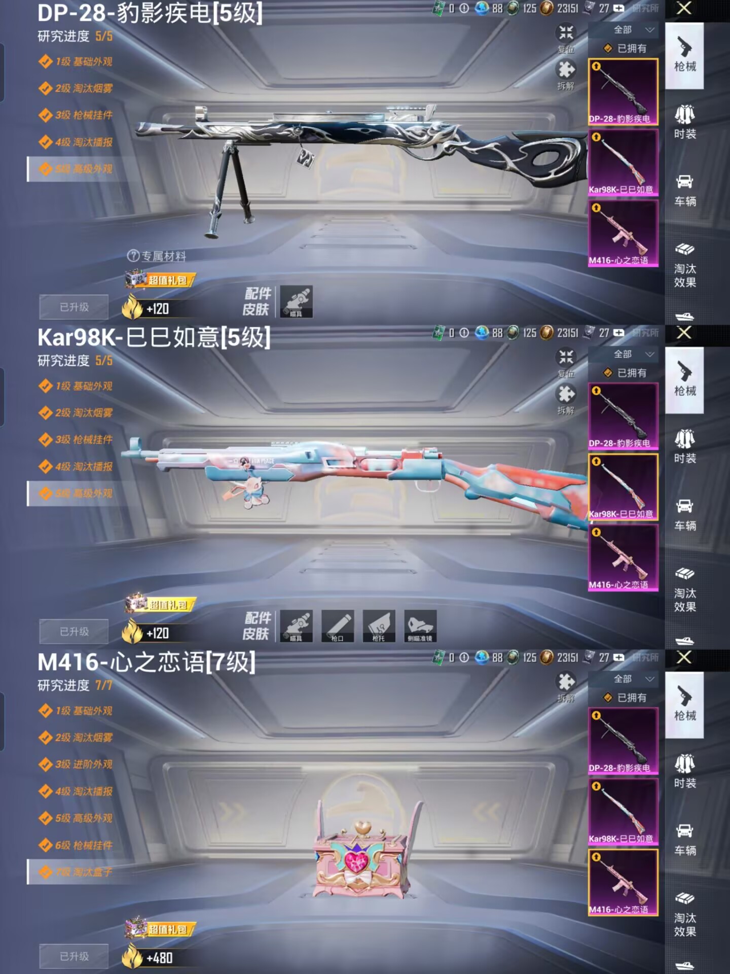 【身法号3载具4粉装3特效呛 浪漫波比 暗影哥特 心之恋语7级】安卓q-3载具4粉装3特效呛14热门148套装144呛皮 51249热力值 3印记 历史卓越王牌5星 【3载具】 阿斯顿马丁s红色 合金龙骨蓝色 空客蔚蓝之翼僚机 【4粉装】 极致幻想 苍蓝魅影 翡翠骑士 绚金战神 【3特效呛】 m416-心之恋语 7级 kar98k-巳巳如意 5级 dp-28-豹影疾电