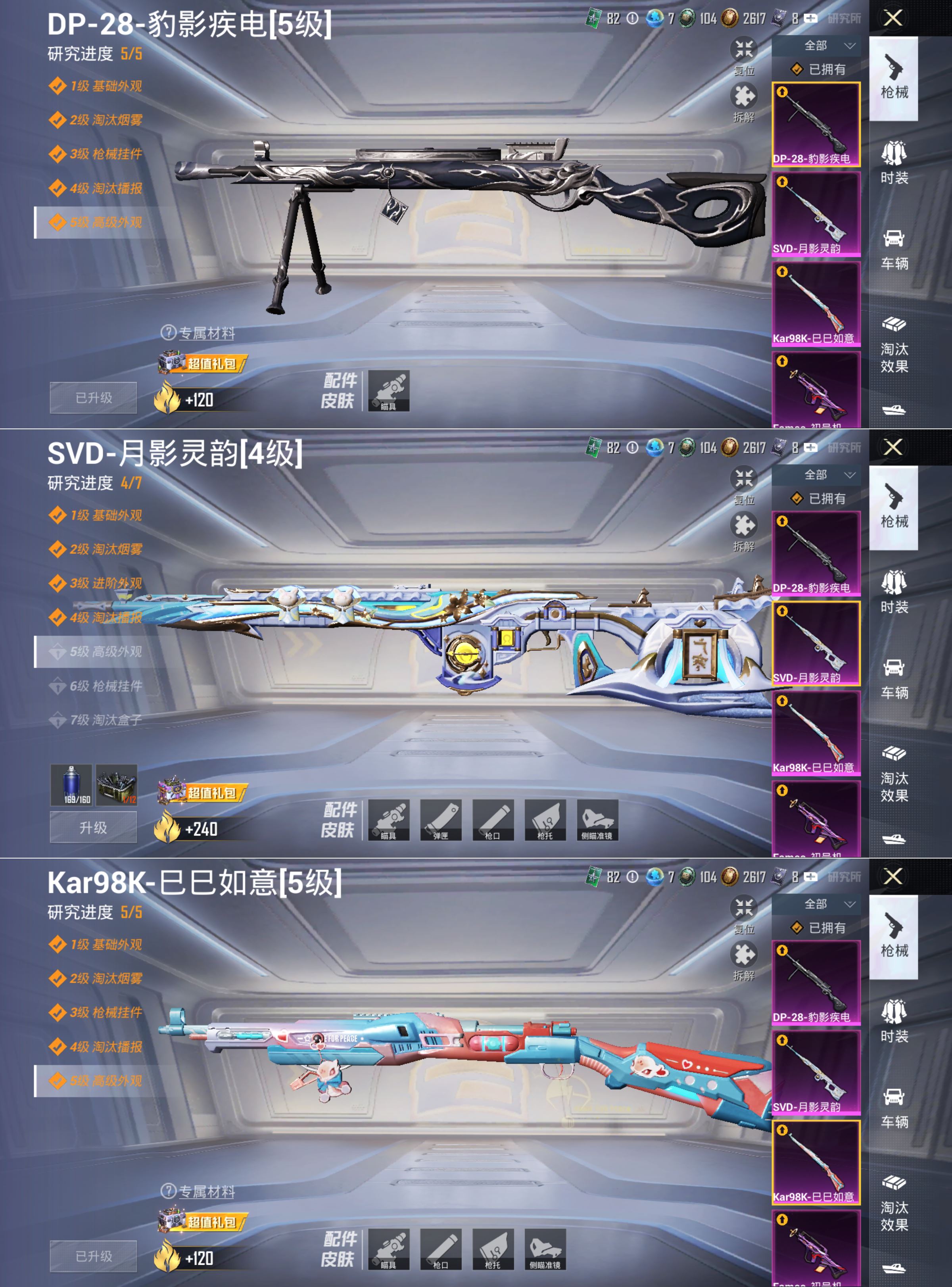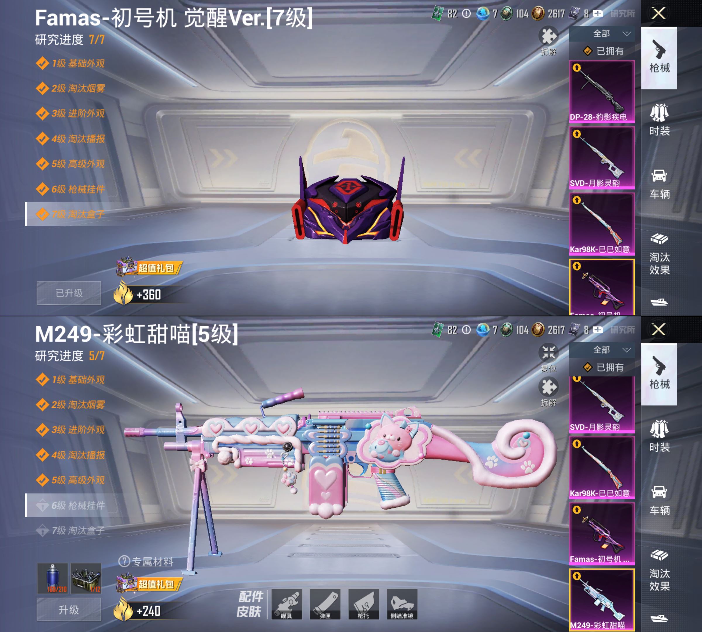 【3粉装5特效呛 觉醒初号机 7级】安卓q-42846热力值 历史荣耀皇冠ⅰ 119套装 143呛皮 【3粉装】 雪月幻音 勇猛狮王 暗夜鎏金 【5特效呛】 famas-觉醒初号机 7级 kar98k-巳巳如意 5级 dp-28-豹影疾电 5级 svd-月影灵韵 4级 m249-彩虹甜喵 5级 【2飞行器】 梦幻火箭飞行器 太空嘟嘟飞行器 【5热门】 龟