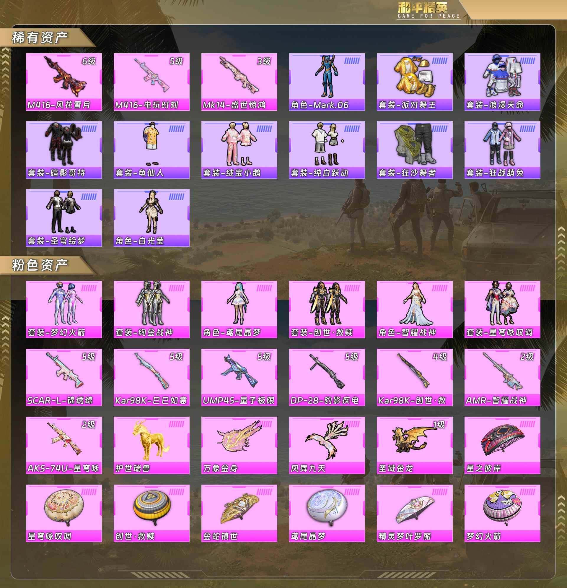 公主号-金鞋/浪漫天命/红眼罩/梦幻火箭/绚金战神/鸢尾晶梦/创世救赎/智耀战神/星穹咏叹调/m4风花雪月6级/m4电玩时刻5级/mk14盛世惊鸿3级/scar锦绣绵绵5级/98k巳巳如意5级/ump量子极限5级/dp28豹影疾电5级/98k创世救赎4级/amr智耀战神2级/aks星穹咏叹调2级/护世瑞兽(6粉套10粉呛1载具)没战神框hp3792 附带700红装碎片-3粉色飞行器-41648热力值-6王牌印记-80套装-134呛皮 【热门品类】:粉装-梦幻火箭,套装-浪漫天命,套装-派对舞王,套装-龟仙人,套装-暗影哥特,角色-mark.06 【粉色载具】:护世瑞兽 【粉色套装】:粉装-梦幻火箭,粉装-绚金战神,角色-鸢尾晶梦,套装-创世·救赎,角色-智耀战神,粉装-星穹咏叹调 【粉色呛皮等级】:scar-l-锦绣绵绵五级,m416-风花雪月六级,m416-电玩时刻五级,ump45-量子极限五级,aks-74u-星穹咏叹调二级,kar98k-创世·救赎四级,kar98k-巳巳如意五级,mk14-盛世惊鸿三级,amr-智耀战神二级,dp-28-豹影疾电五级 【粉色呛皮】:scar-l-锦绣绵绵,m416-风花雪月,m416-电玩时刻,ump45-量子极限,aks-74u-星穹咏叹调,kar98k-创世·救赎,kar98k-巳巳如意,mk14-盛世惊鸿,amr-智耀战神,dp-28-豹影疾电 【粉色飞行器】:凤舞九天飞行器,万象金身飞行器,圣域金龙飞行器 【粉色降落伞】:梦幻火箭降落伞,星之彼岸降落伞,精灵梦叶罗丽降落伞,鸢尾晶梦降落伞,创世·救赎降落伞,金蛇镇世降落伞,星穹咏叹调降落伞 【稀有套装】:套装-龟仙人,套装-绒宝小鹅,套装-巳巳如意,套装-圣穹绘梦,角色-拉斐尔,套装-燕燕于飞,套装-鱼渊荷华,套装-镭金极速,套装-粉恋花,套装-紫幽梦,套装-蓝冰羽,套装-星影赞美诗,套装-星渊小夜曲,角色-绯色魅影 【稀有呛皮】:akm-江南烟雨,akm-霓虹街区,akm-玄冥寒域,akm-棋盘冕主,m16a4-幻世战舞者,scar-l-玉兔迎春,scar-l-红色方程式,m416-蓝色火焰,aug-天降萌叽,aug-甜蜜菠萝,aug-金蛇镇世,m762-彩虹符号,g36c-星穹咏叹调,ac-val-天降萌叽,ac-val-快闪甜心,蜜獾-天降萌叽,uzi-啾咪啾咪,uzi-天降萌叽,ump45-绒宝小鹅,vect-焰鹰斗篷,vect-彩虹符号,vect-生命誓言,vect-创世·救赎,汤姆逊-天降萌叽,汤姆逊-智耀战神,aks-74u-辉羽雀灵,p90-快闪甜心,p90-金蛇镇世,p90-巳巳如意,kar98k-彩虹符号,kar98k-梦幻火箭,kar98k-星穹咏叹调,m24-蓝晶绮麟,awm-焰鹰斗篷,awm-盛世惊鸿,sks-炫彩节奏,sks-迅猛狂鲨,sks-圣域龙灵,vss-星之彼岸,mini14-梦幻火箭,mini14-镭金极速,slr-墨龙九天,莫辛纳甘-镭金极速,amr-墨龙九天,mk20-h-快闪甜心,mk12-金蛇镇世,s686-巳巳如意,s1897-炫彩节奏,s12k-玩趣呆呆,dbs-焰鹰斗篷,dbs-创世·救赎,m249-彩虹符号,m249-星之彼岸,dp-28-焰鹰斗篷,dp-28-彩虹符号,mg3-幻世战舞者,mg3-蓝晶绮麟,r1895-镭金极速,短管霰弹-星穹咏叹调,沙墨之鹦-快闪甜心,tmp-9-江南烟雨,爆炸猎弓-喜羊羊与灰太狼,大砍刀-盛世惊鸿,破片手留单-巳巳如意 【其他套装】:套装-ss26特训,套装-ss27特训,套装-ss28特训,套装-ss29特训,套装-暗影哥特,套装-柠萌假日,套装-浪漫天命,套装-海岛探路者,套装-灼焰舞者,套装-狂战萌兔,套装-狂沙舞者,套装-玉兔迎春,套装-空岛之星,套装-竞技名士,套装-竞技达人朋克,套装-绯格组合,套装-缤纷果语,套装-耀粉歌者,套装-长空猛禽,套装-霓虹街区,套装-青玉碎影,套装-魅力单车,套装-龟仙人,套装-香榭午后,套装-白兰地假日,套装-快闪甜心,套装-春光漫游,套装-焰鹰斗篷,套装-幽夜迷踪,套装-幻羽潜行,套装-alan walker电音教主,角色-白光莹,套装-纯真浪花,套装-热情海星,套装-曼妙人鱼,角色-听雨铃兰,套装-创世·幻影,套装-创世·追猎,角色-mark.06 【稀有头盔】:梦幻火箭头盔(2级),电光马卡龙头盔(3级) 【稀有背包】:梦幻火箭背包(3级),梦幻火箭背包(2级) 【营地id】:943357548