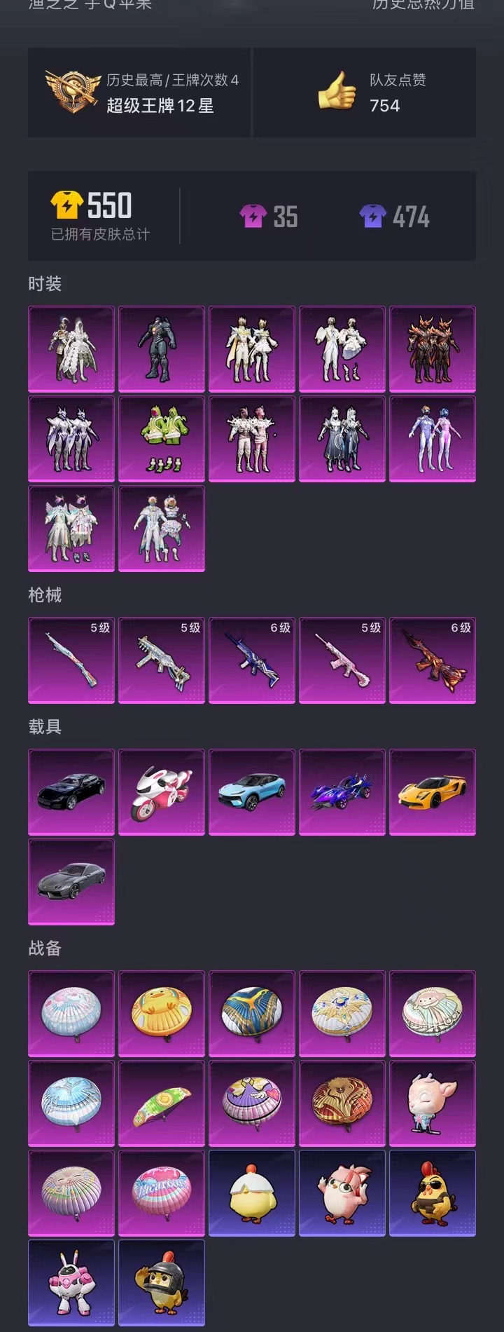 可二次实名【12粉装5特效呛6载具梦幻火箭蜘蛛侠】 苹果q区-57194热力值-4印记-122套装-132呛皮 【6载具】 路特斯el蓝色 路特斯ev黄色 玛莎拉蒂q蓝色 兰博轿车灰色 海龙奔腾 极速兔兔车【1稀有】 奇异狩猎者【12粉装】 山涧鹿灵 梦幻火箭 冰霜白皇 圣光天使 恐龙拽拽 彩虹鹿灵 寒光使者 复仇流浪者 紫电风暴 赤焰黑爵 吟月归客 海渊国主【5特效呛】 m416-风花雪月6