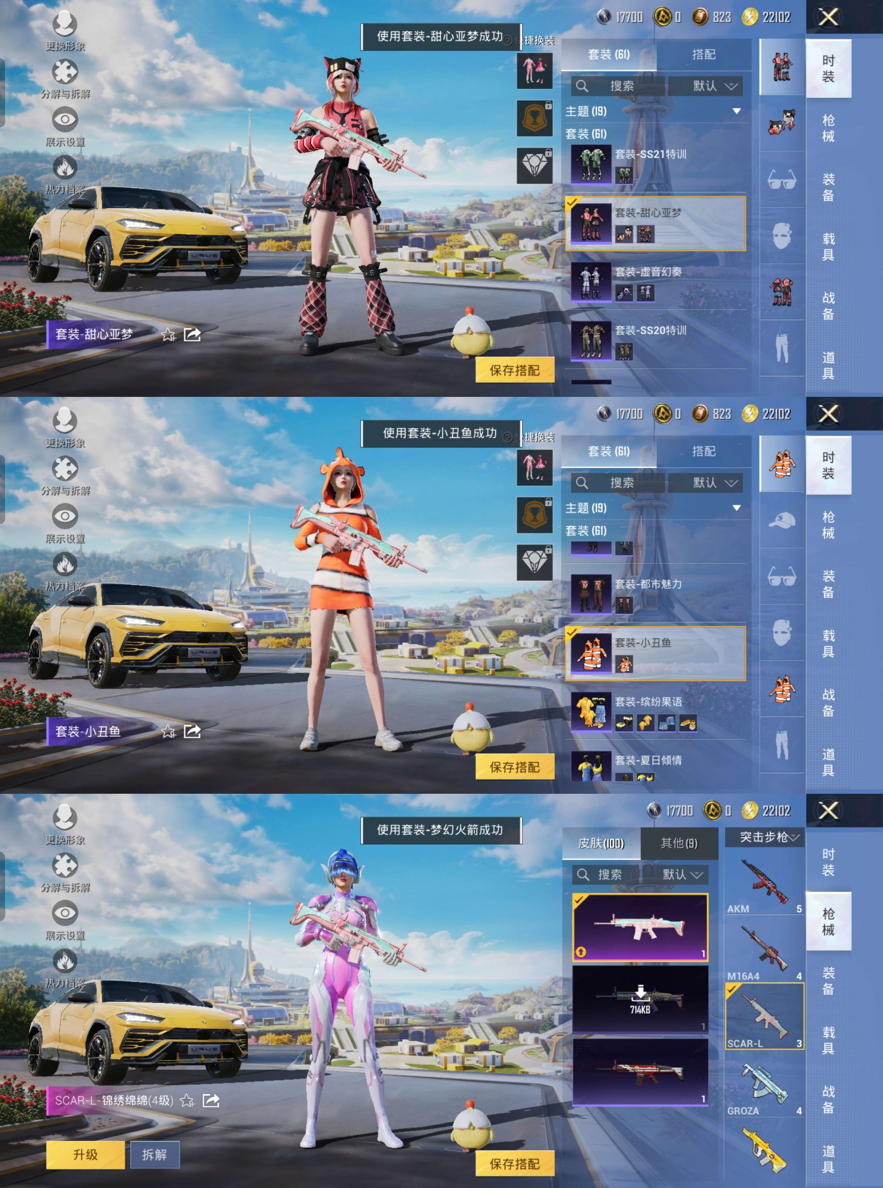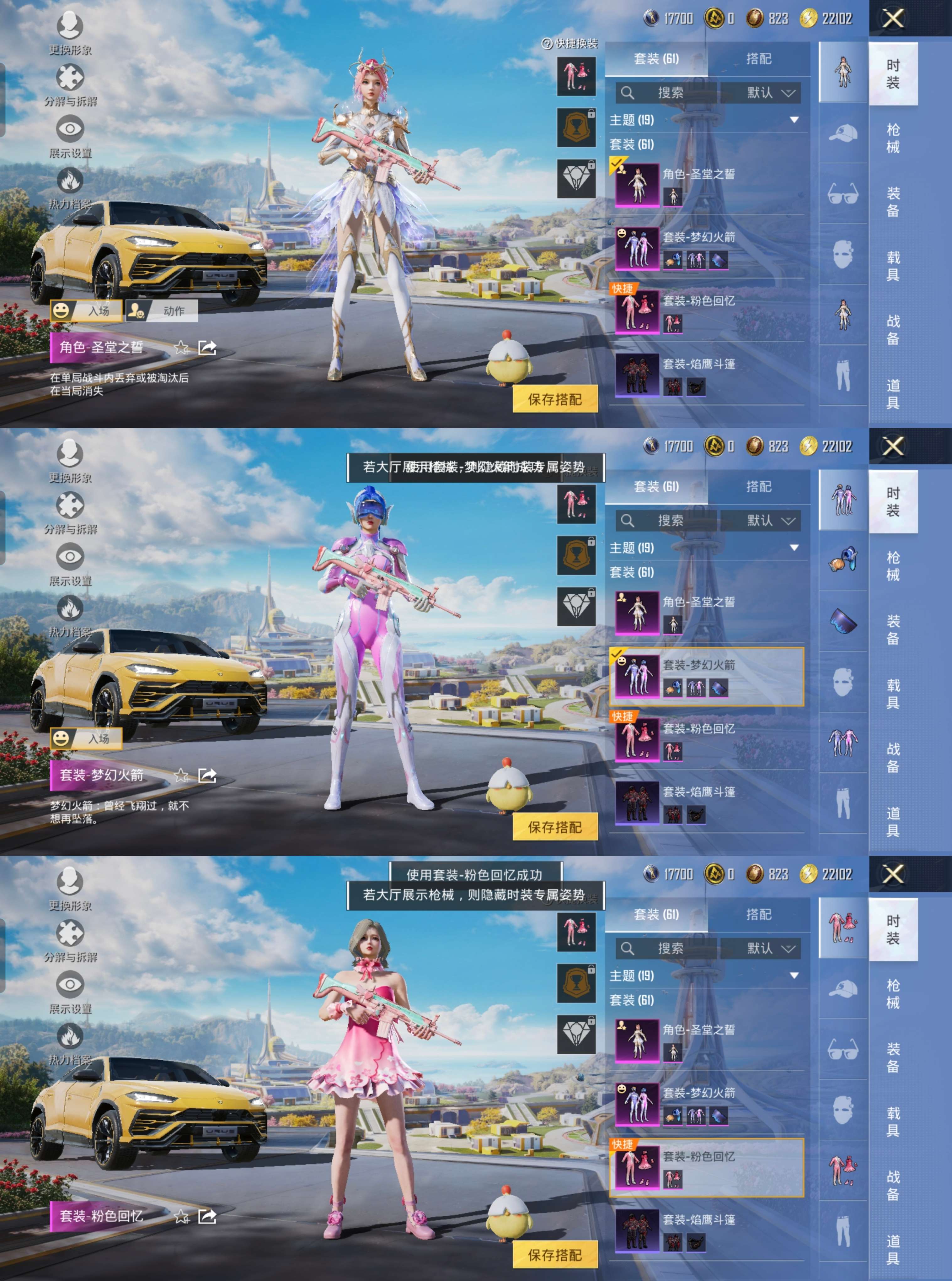 【1载具3粉装2特效呛 梦幻火箭 粉色回忆 小丑鱼 身法号】安卓q-28703热力值 3王牌印记 历史超级王牌1星 61套装 100呛皮 营地id:906938910 【1载具】 兰博suv黄色 【3粉装】 圣堂之誓 梦幻火箭 粉色回忆 【2特效呛】 scar-l-锦绣绵绵 4级 slr-暗夜玫瑰 5级 【2飞行器】 梦幻火箭飞行器 星之彼岸飞行器 【3热门】 akm-