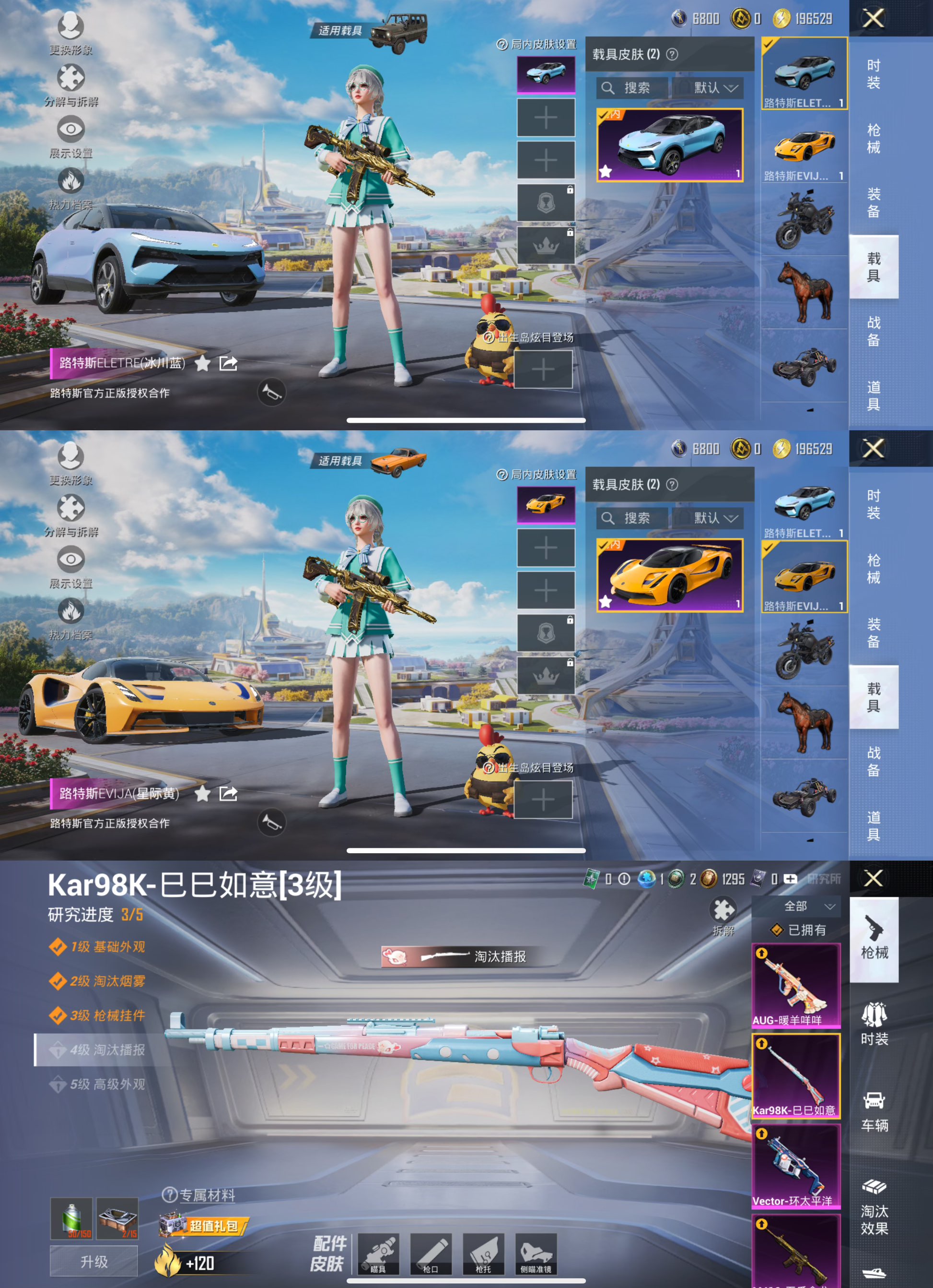 【2载具1粉装4特效呛五爪金龙 5级 】苹果q-2载具1粉装4特效呛2热门50套装61呛皮 22560热力值 2印记 历史超级王牌7星 【2载具】 路特斯el蓝色 路特斯ev黄色 【1粉装】 薄荷物语 【4特效呛】 m416-五爪金龙 5级 kar98k-巳巳如意 3级 aug-暖羊咩咩 5级 vect-环太平洋 4级 【2热门】 雪山精英 破蛋小黄鸡