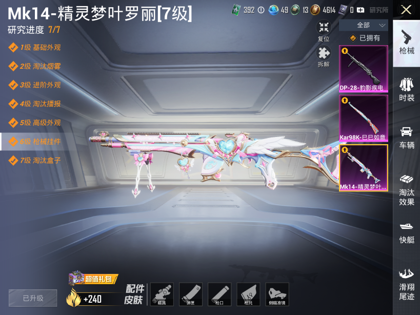 苹果q-1稀有2粉装3特效呛3热门55套装81呛皮 22698热力值 3印记 历史传奇王牌11星 【1稀有】 浪漫天命 【2粉装】 奇迹舞步美琪 仲夏莫吉托 【3特效呛】 kar98k-巳巳如意 5级 dp-28-豹影疾电 5级 mk14-精灵梦叶罗丽 7级 【3热门】 mark.06 深海小丑鱼 m762-奇异狩猎者仲夏莫吉托 奇迹舞步飞行器 炫彩糖果飞行器 角色