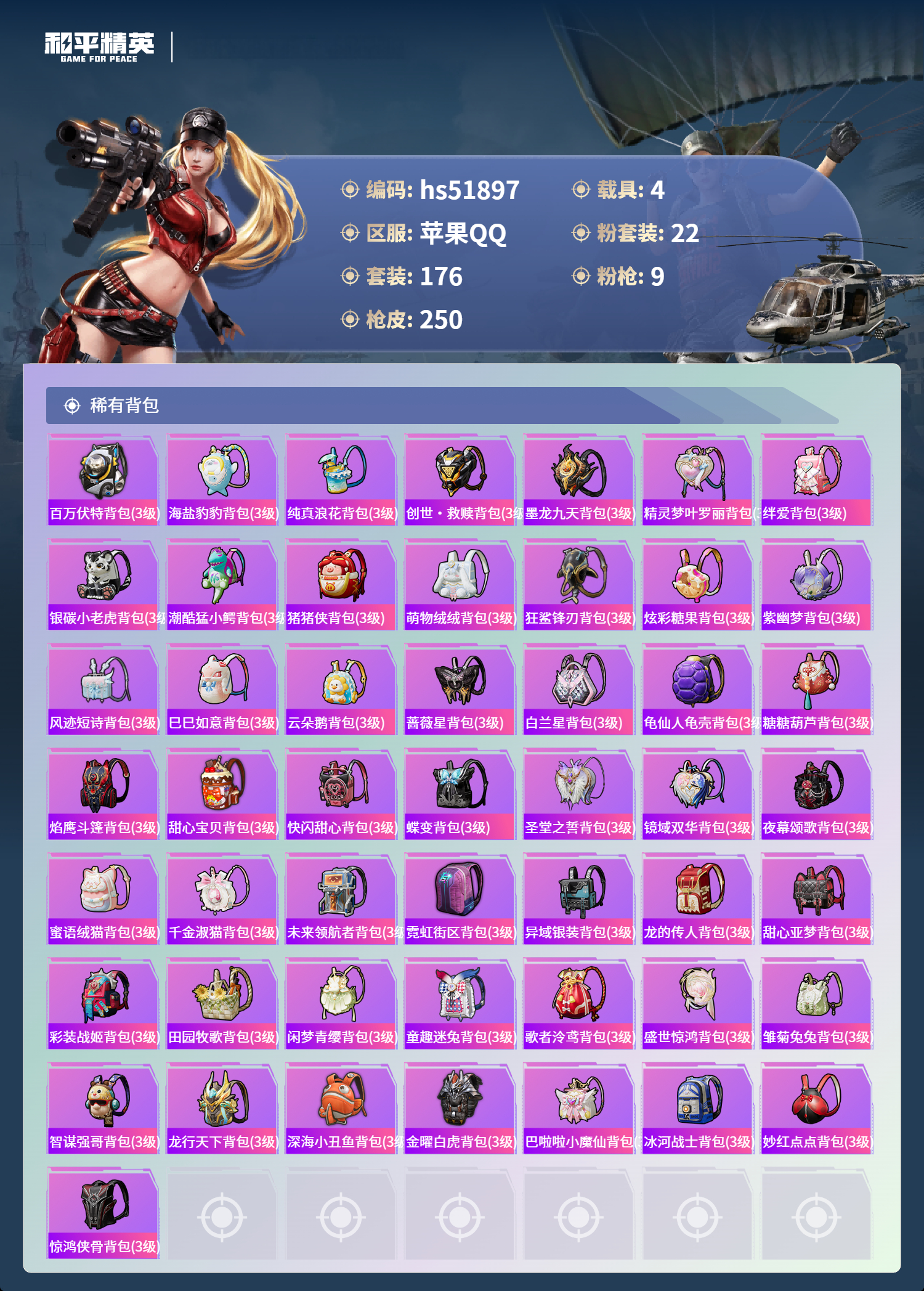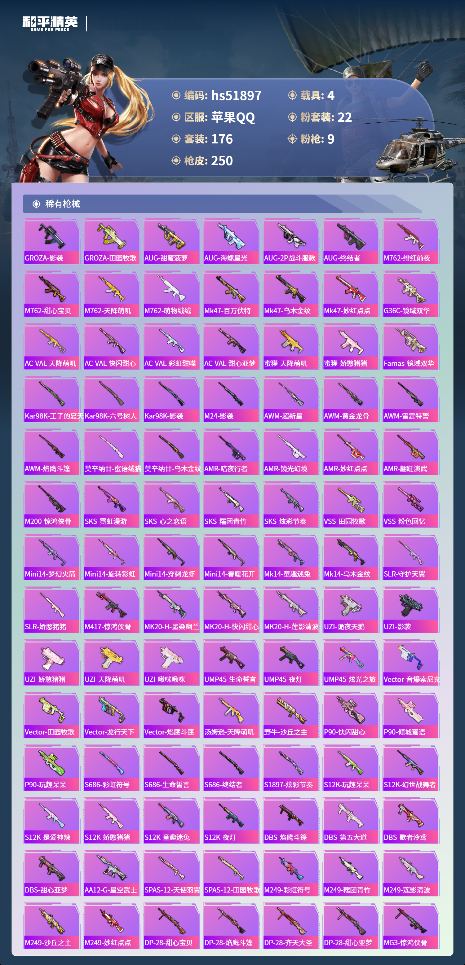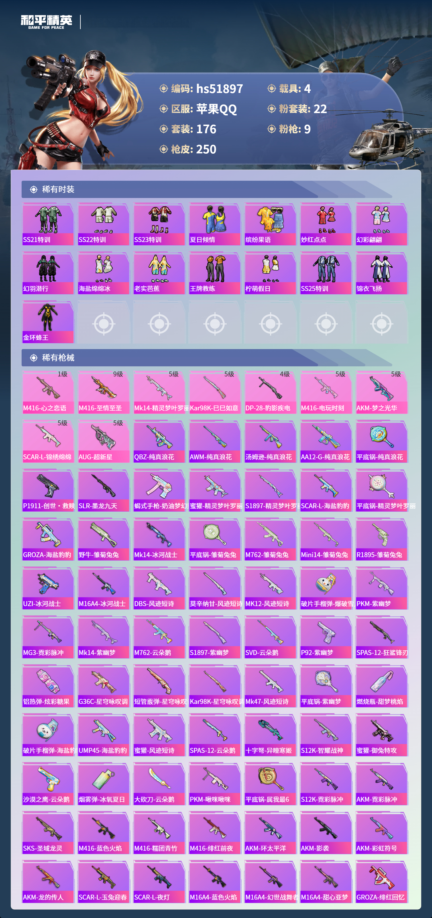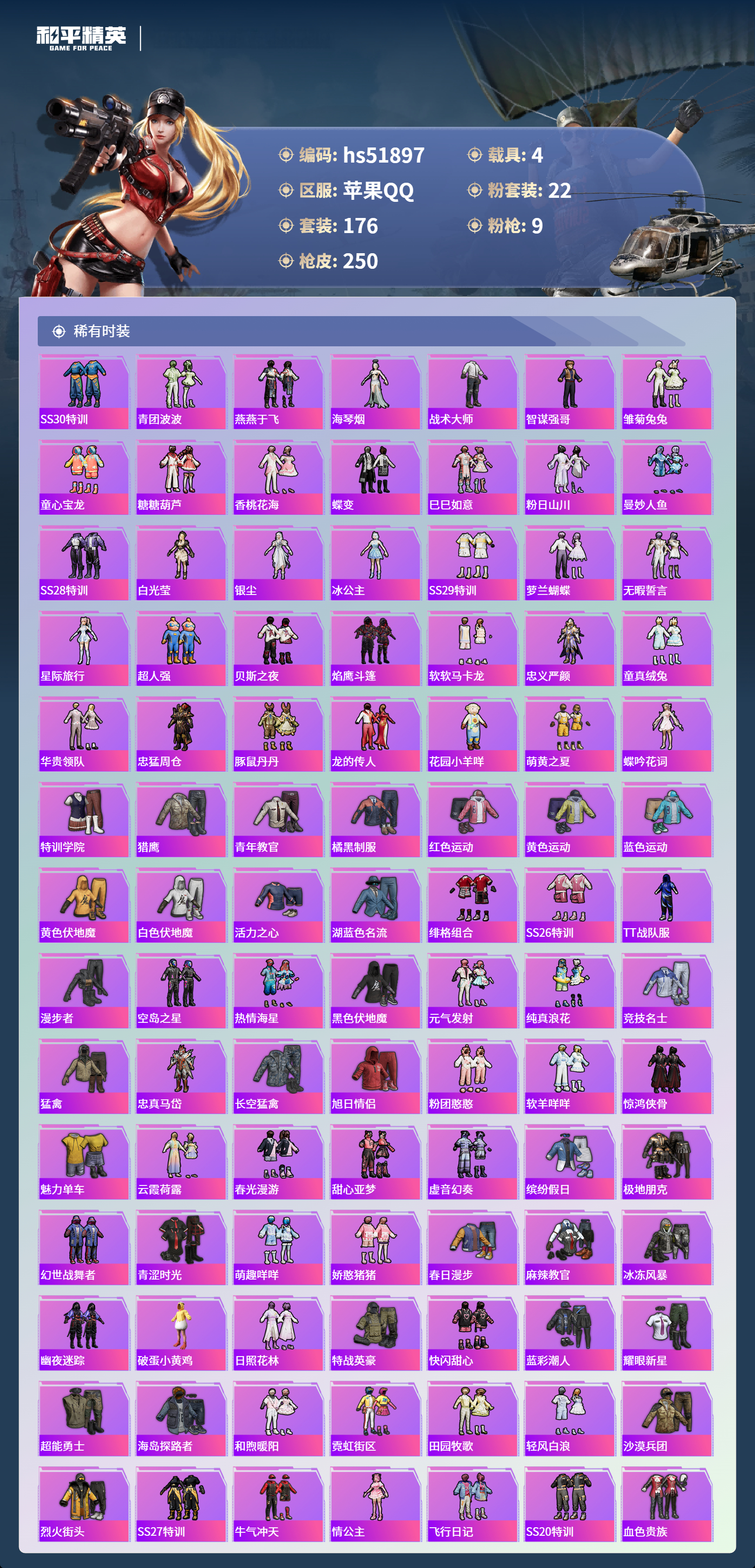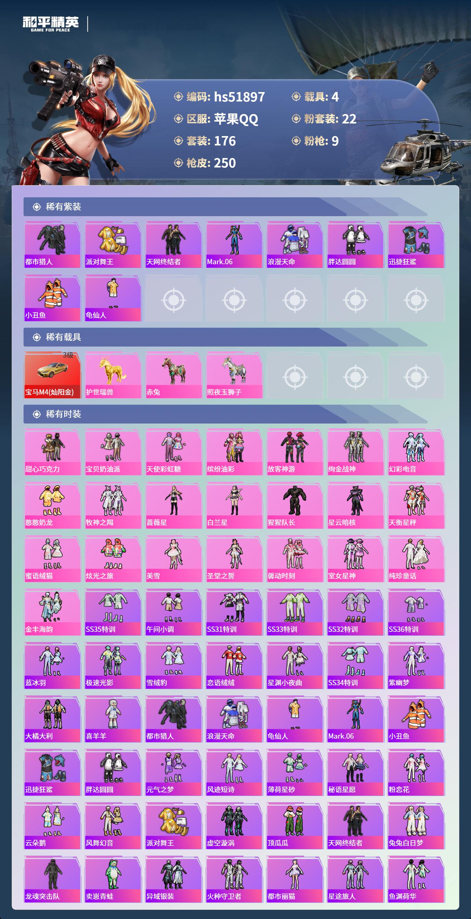 hs51897 苹果手q-8王牌印记-22粉装-9特效呛-4载具-89229热力值-176套装-250呛皮-2卓越印记-1传奇印记【22粉装】套装-宝贝奶油派套装-牧神之羯角色-猩猩队长套装-天衡星秤套装-放客神游套装-天使彩虹糖角色-美雪套装-纯珍童话套装-金丰海韵套装-蜜语绒猫套装-幻彩电音角色-蔷薇星套装-甜心巧克力角色-圣堂之誓套装-室女星神套装-憨憨奶龙