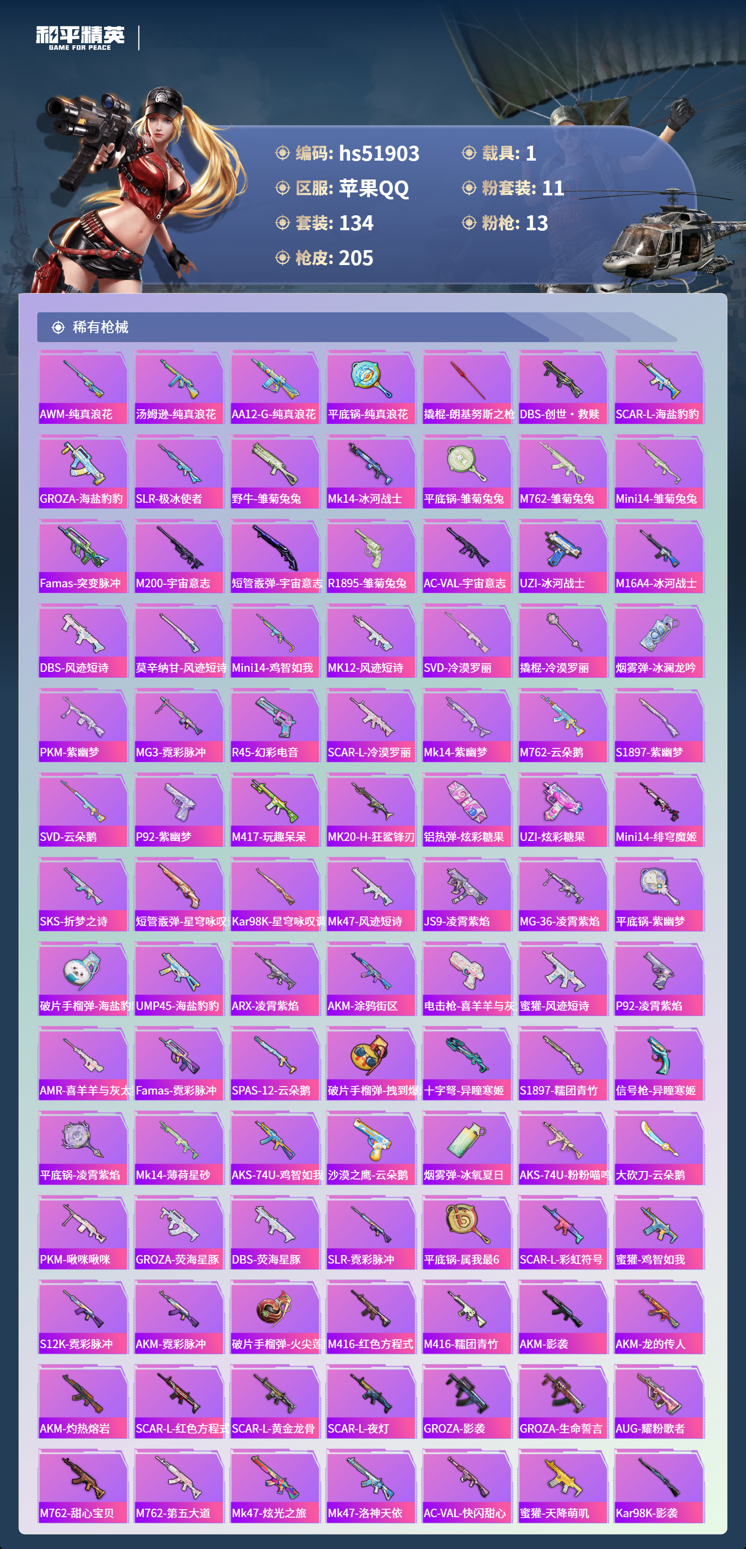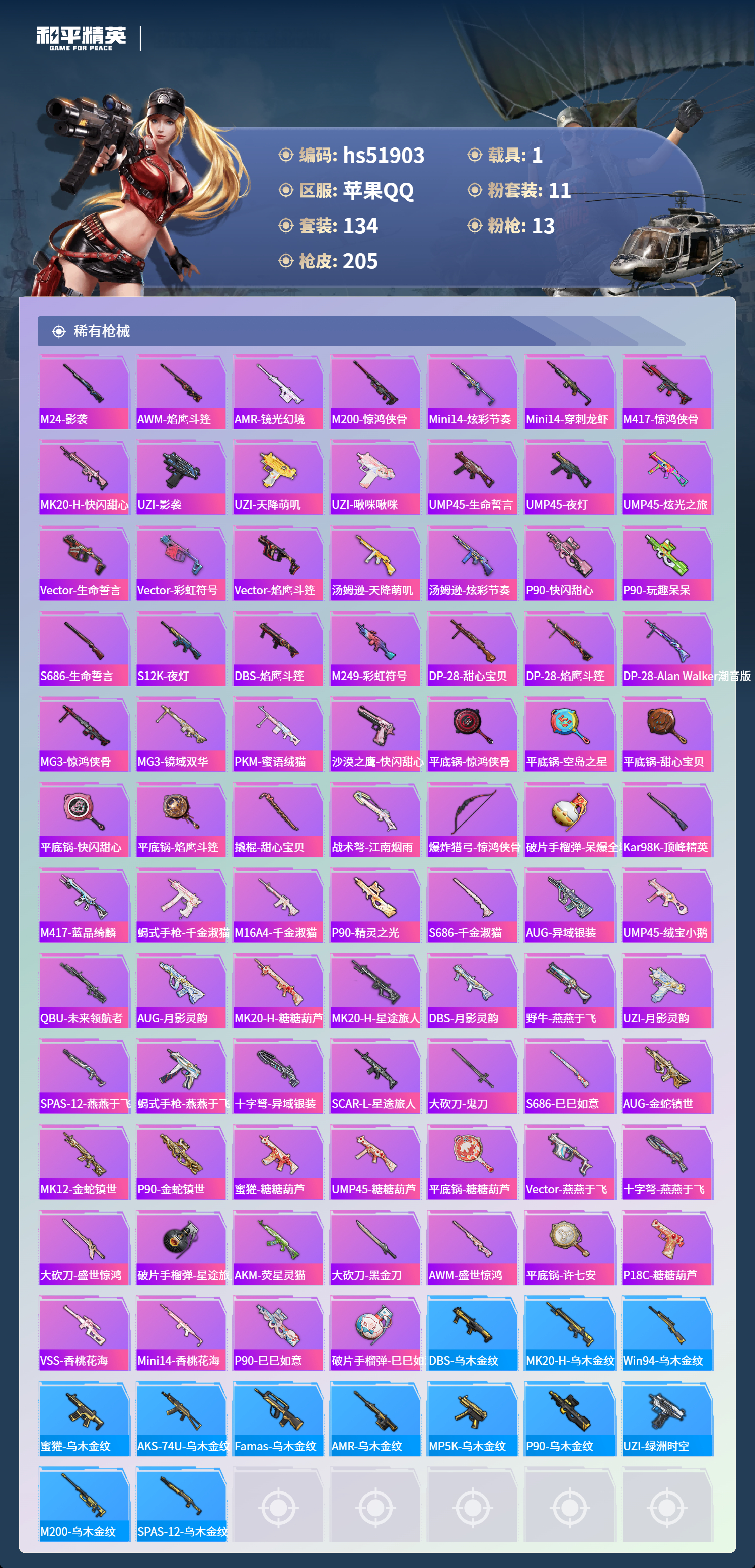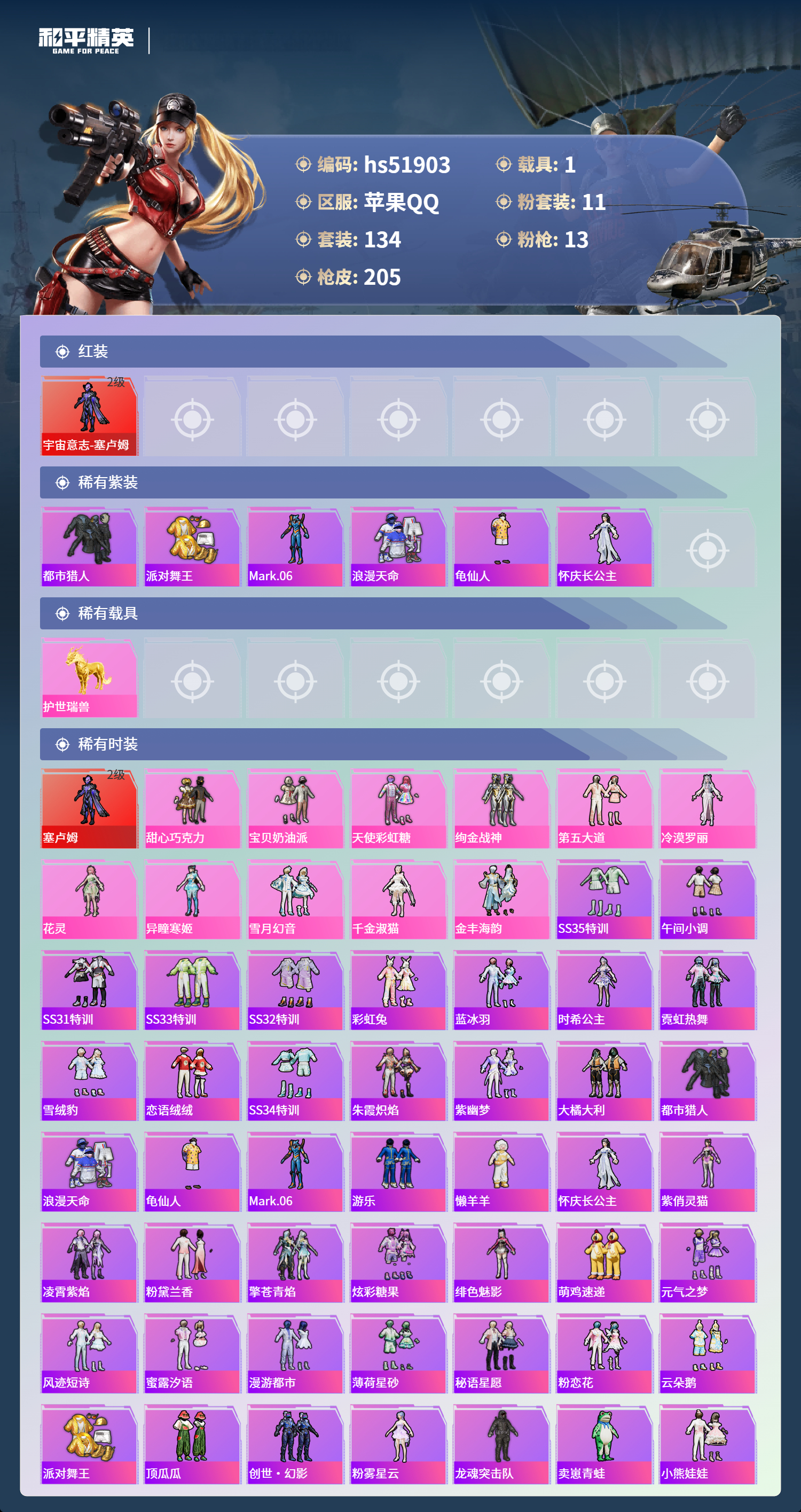 hs51903 苹果手q-9王牌印记-1红装-11粉装-13特效呛-1载具-74956热力值-134套装-205呛皮-4卓越印记-1传奇印记【1红装】宇宙意志-塞卢姆/2级【11粉装】套装-金丰海韵套装-甜心巧克力角色-花灵套装-雪月幻音套装-绚金战神套装-宝贝奶油派角色-千金淑猫套装-第五大道角色-异瞳寒姬角色-冷漠罗丽套装-天使彩虹糖【13特效呛】mk14-盛世惊鸿/