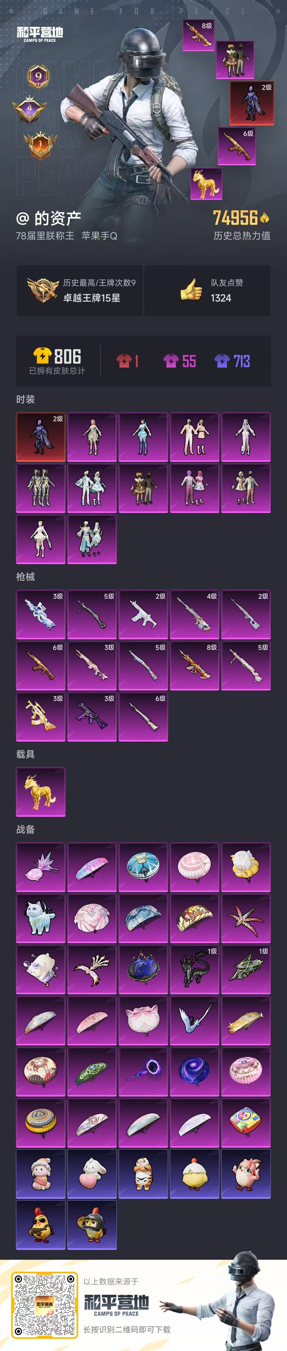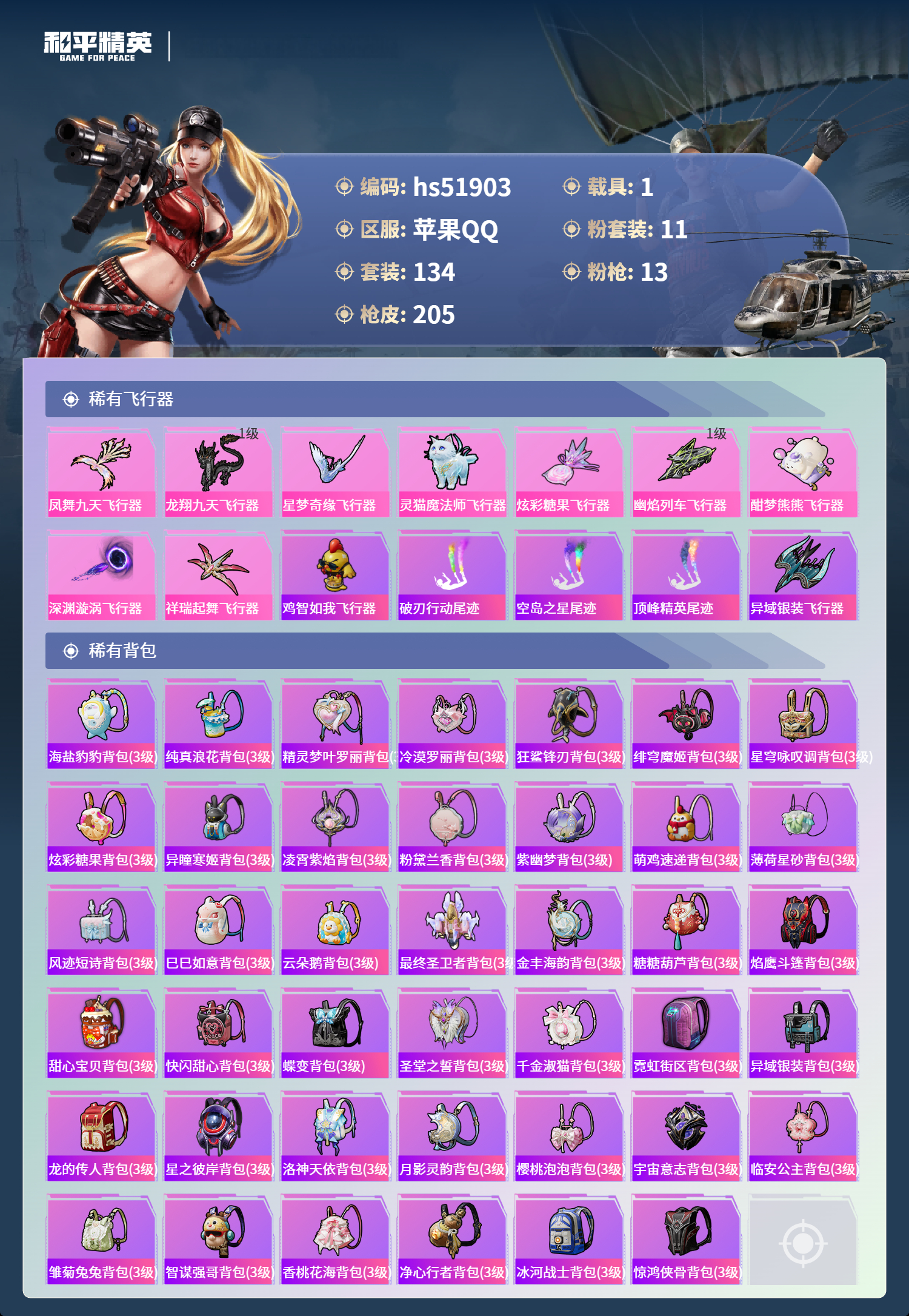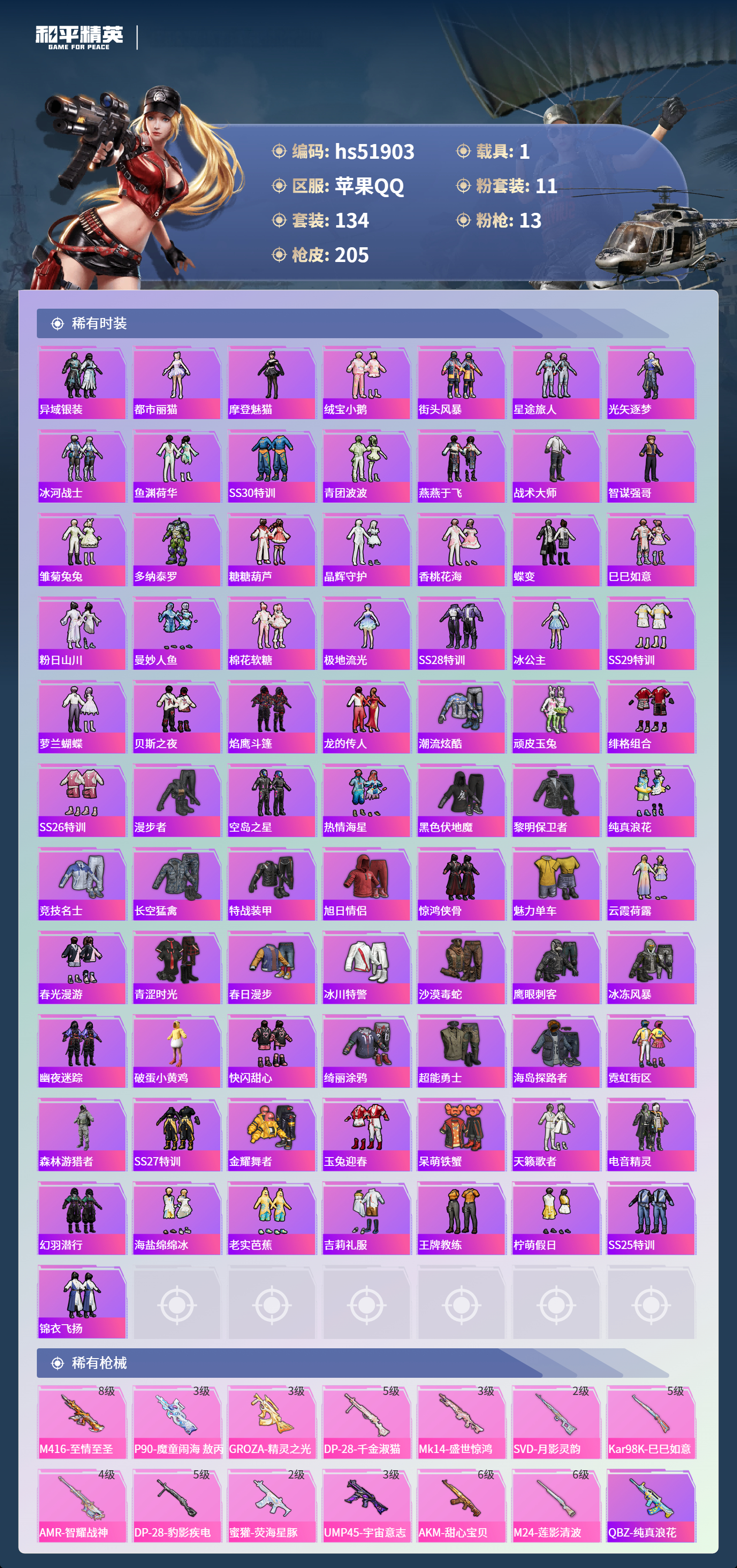 hs51903 苹果手q-9王牌印记-1红装-11粉装-13特效呛-1载具-74956热力值-134套装-205呛皮-4卓越印记-1传奇印记【1红装】宇宙意志-塞卢姆/2级【11粉装】套装-金丰海韵套装-甜心巧克力角色-花灵套装-雪月幻音套装-绚金战神套装-宝贝奶油派角色-千金淑猫套装-第五大道角色-异瞳寒姬角色-冷漠罗丽套装-天使彩虹糖【13特效呛】mk14-盛世惊鸿/