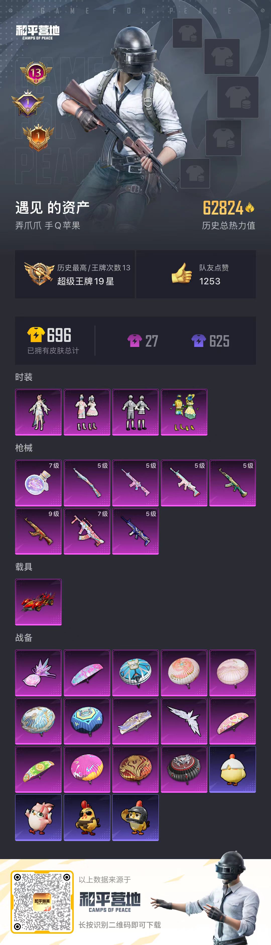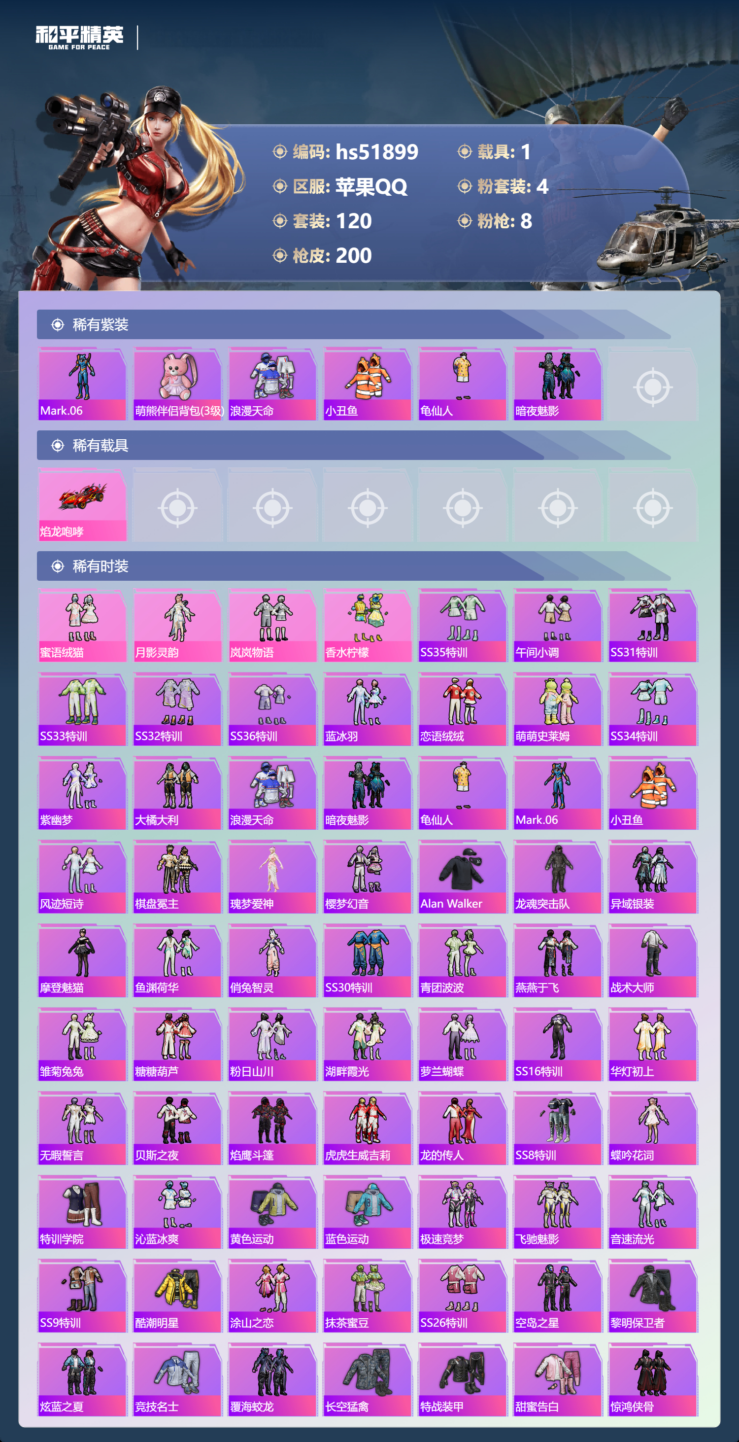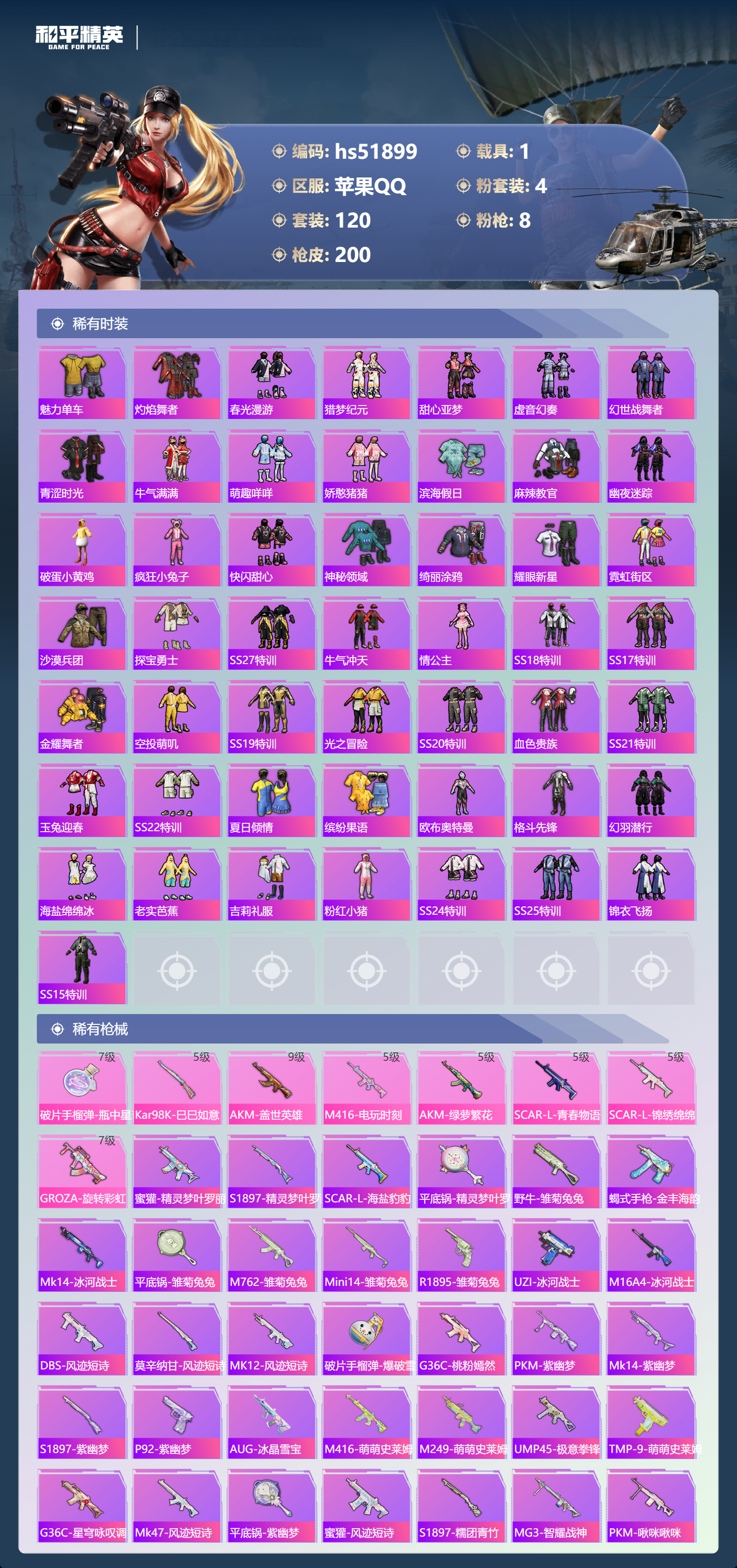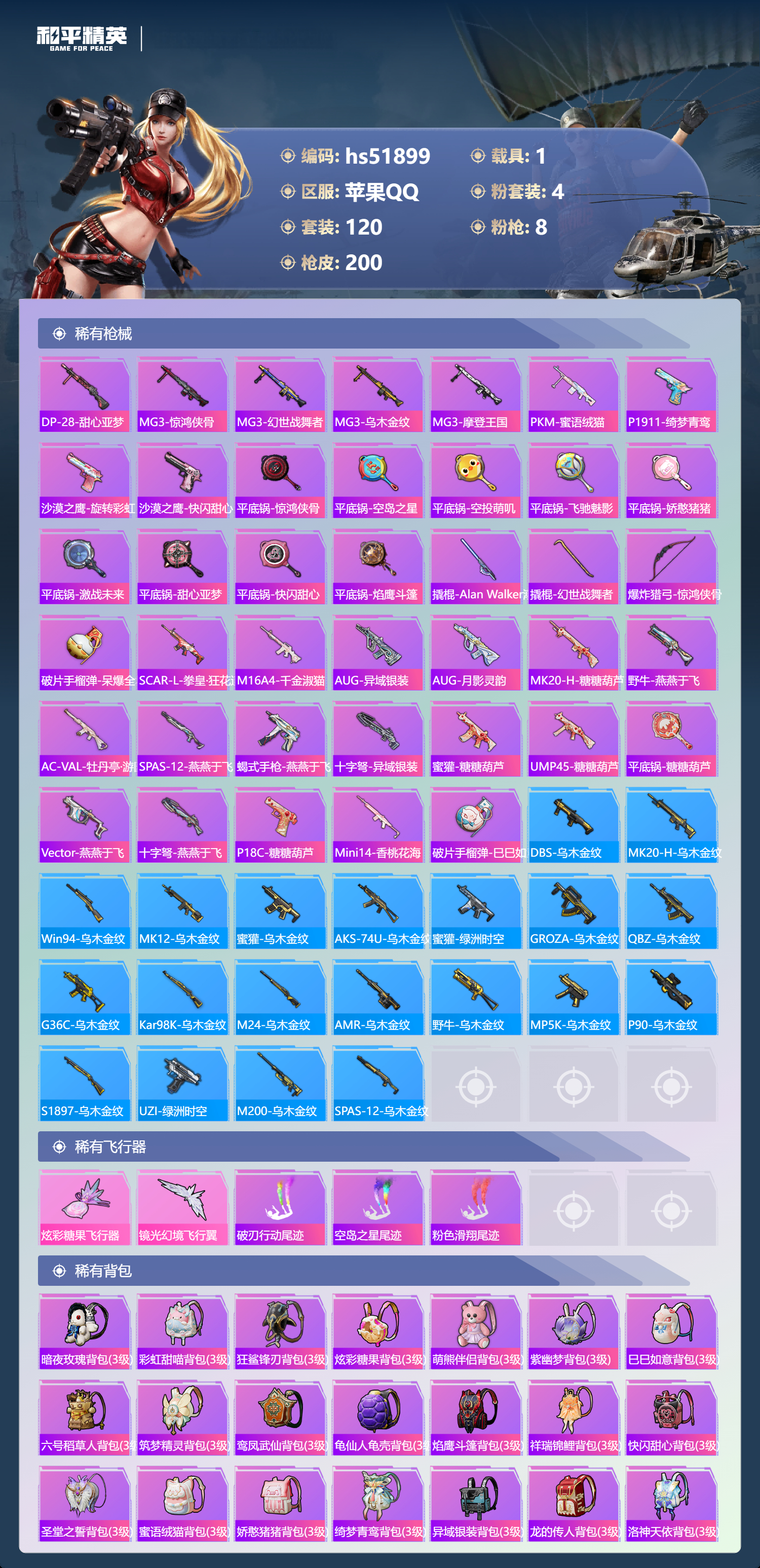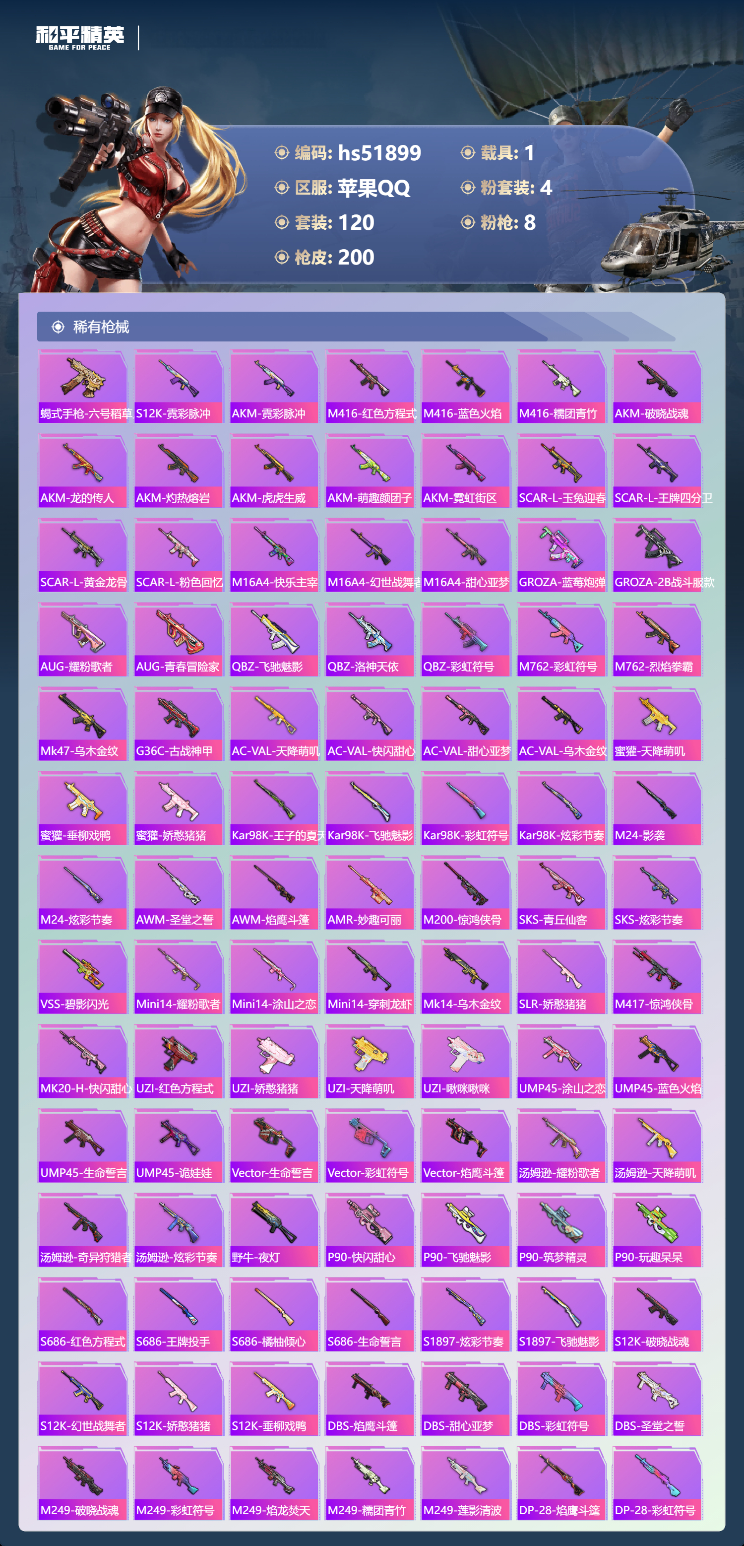 hs51899 苹果手q-13王牌印记-4粉装-8特效呛-1载具-62824热力值-120套装-200呛皮-1卓越印记-1传奇印记【4粉装】角色-月影灵韵套装-蜜语绒猫套装-香水柠檬套装-岚岚物语【8特效呛】scar-l-青春物语/5级破片手留单-瓶中星球/7级scar-l-锦绣绵绵/5级m416-电玩时刻/5级akm-盖世英雄/9级groza-旋转彩虹/7级kar98k-巳