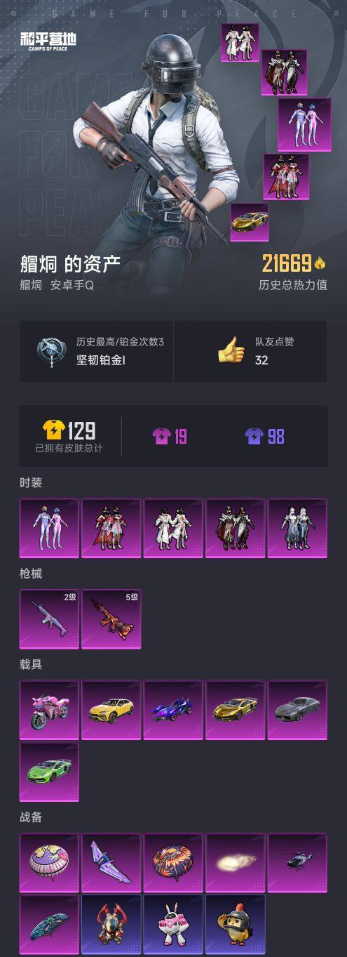 安卓 手q【梦幻火箭 2级梦幻火箭scar-l 5级风花雪月m416】5粉装-2特效呛-6载具-2粉色飞行器-21669热力值-0王牌印记-30套装-22呛皮 【热门品类】:粉装-梦幻火箭,套装-金羽特工 【粉色载具】:兰博基尼aventad svj(翡翠绿),兰博基尼aventad svj(炫光金),兰博基尼estoque(银翼灰),兰博基尼urus(明艳黄),海龙奔腾,双人摩托-梦